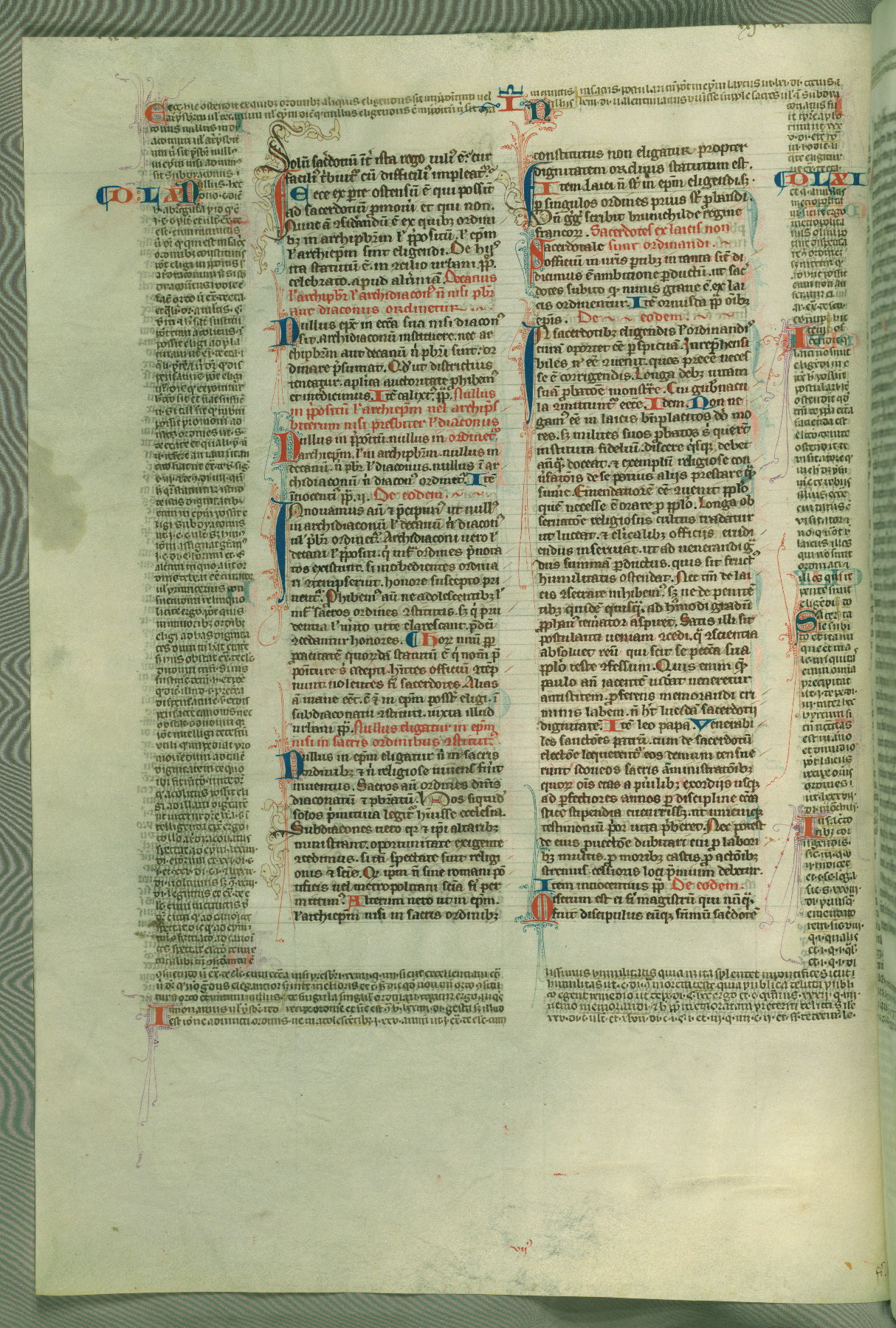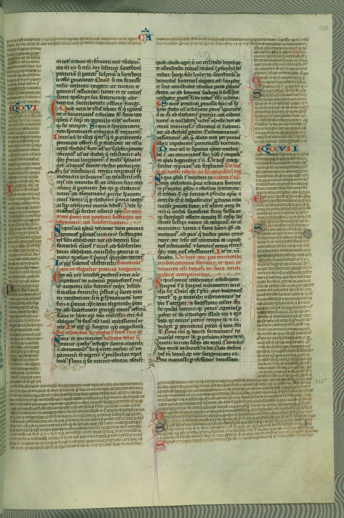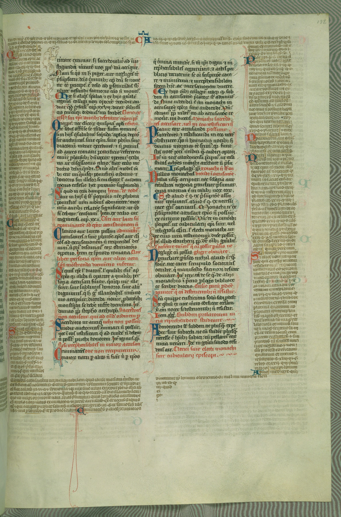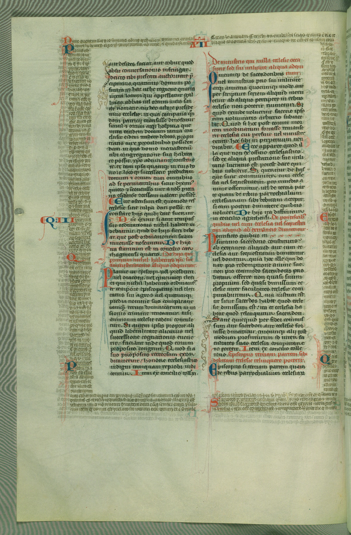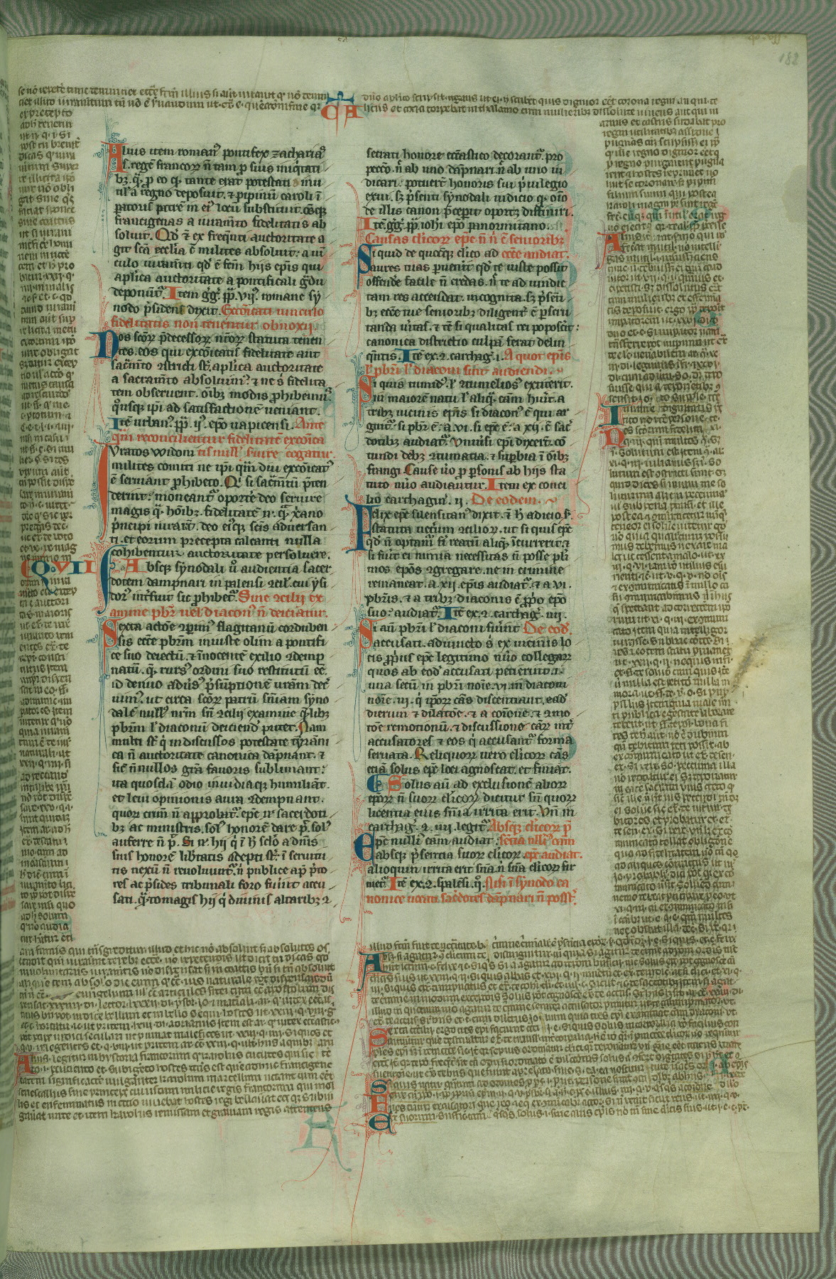 This deluxe version of Gratian's Decretum was created ca. 1280-90, most likely in Hainaut. The lively decoration of the manuscript indicates a marked taste for narrative, and there are thirty-seven historiated initials. The gloss work was completed by Bartholomew of Brescia. At first, Paris would seem to be the most likely place of origin, given that it was the leading center for the study of canon law. However, this particular manuscript exhibits scribal features that suggest its place of origin as being the Cistercian abbey of Cambron in Hainaut. Furthermore, Abbot Baudouin de Bousso, whose tenure at the abbey was from 1283 to 1293, was schooled in theology at the University of Paris, and he would eventually endorse the production of many fine manuscripts while at Cambron. In fact, the catalyst for this endeavor seems to have been the Beaupré Antiphonary (W.759-761), which was was created at Cambron during the 1280s. Stylistic features of W.133 seem to have connections with the Beaupré Antiphonary. For example, Cistercian monks are shown in three extant illuminations throughout three of the antiphonary volumes; these monks are pictured in brown habits similar to the type worn by clerics in W.133. The reliance upon Cistercian precedents for textual and design features associates W.133 with the Cistercian abbey at Cambron. However, more remains to be confirmed by further inspection of the output of the scriptorium at Cambron.
