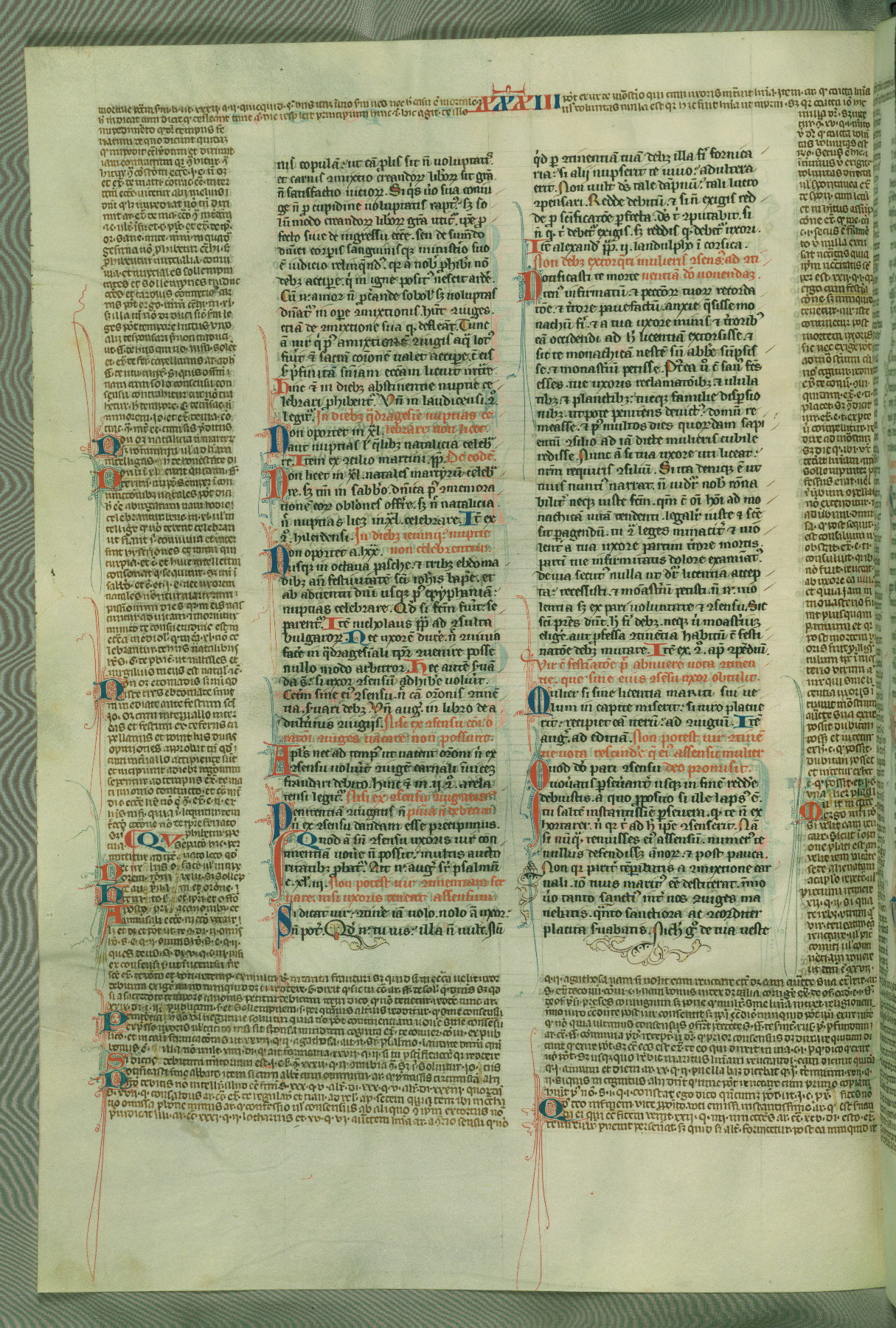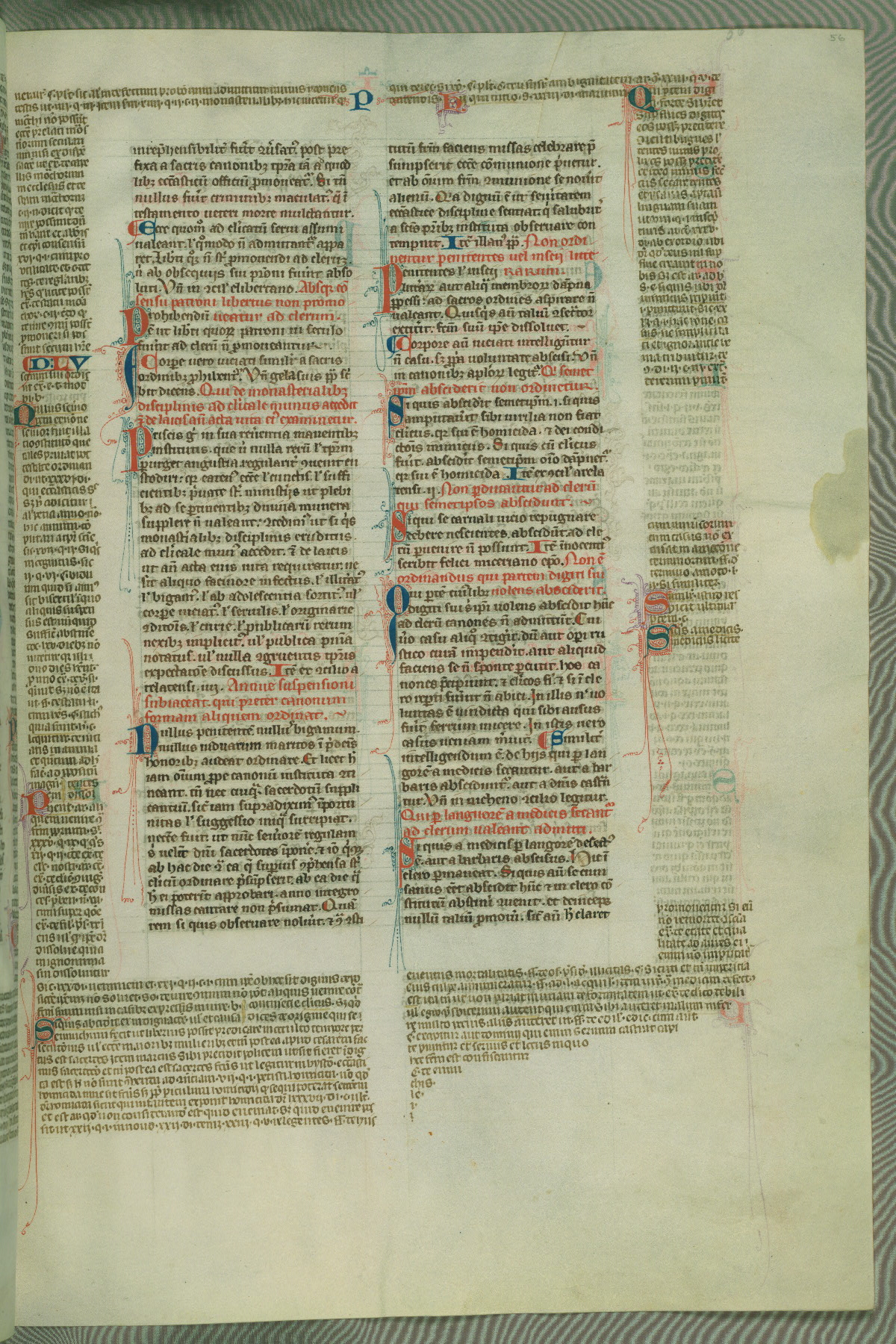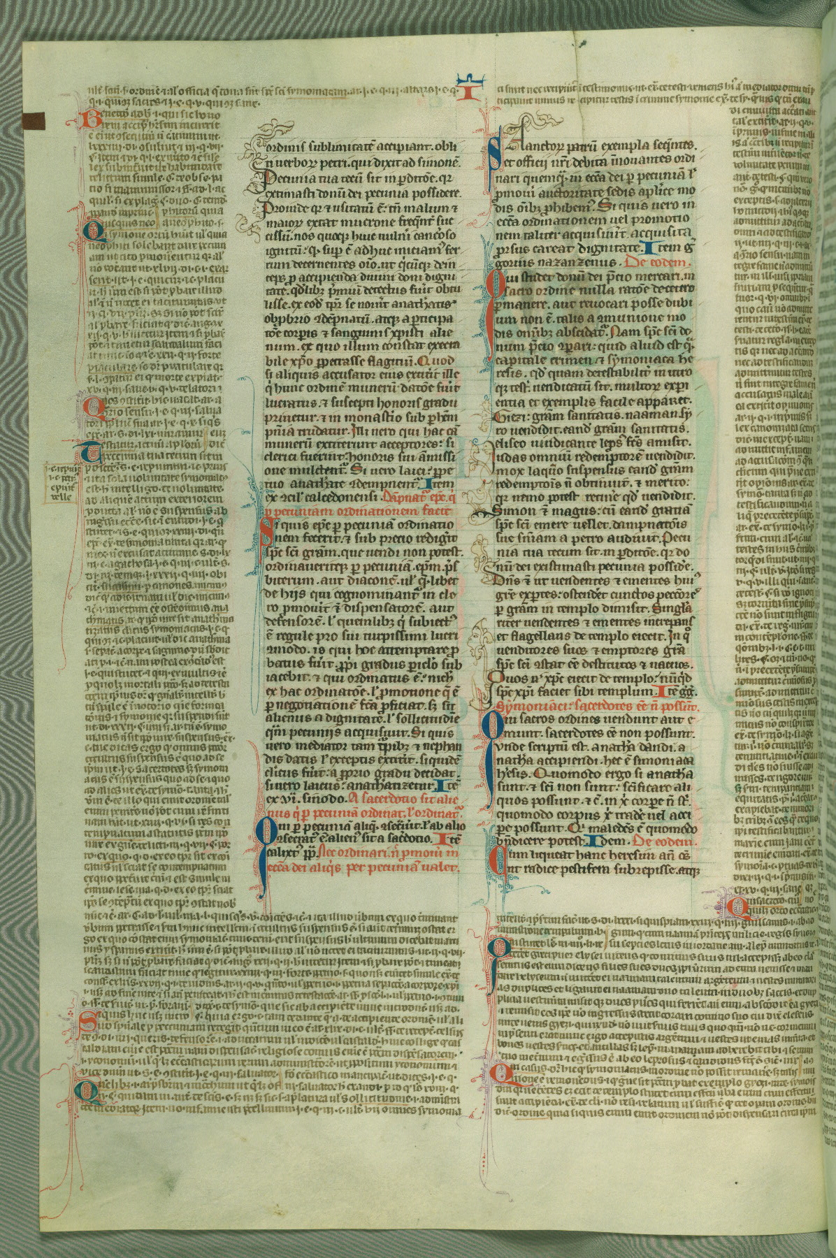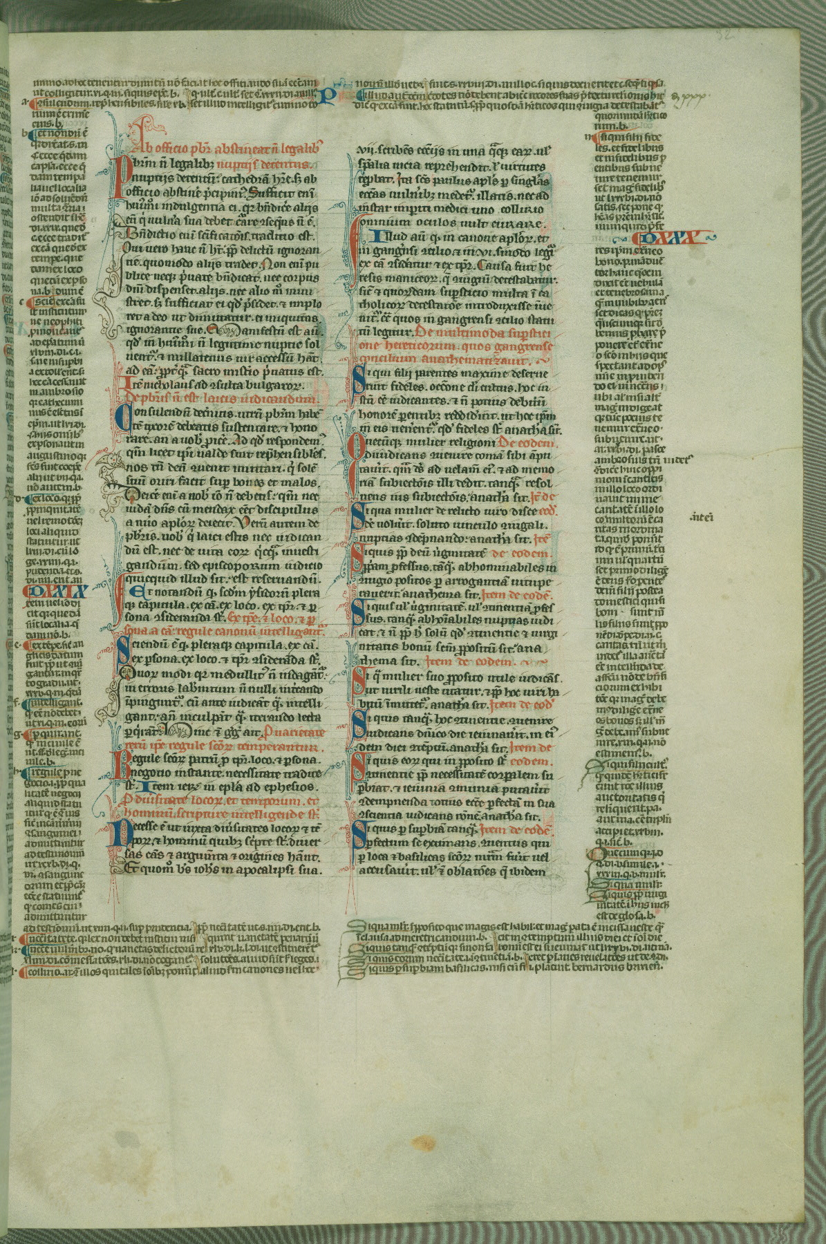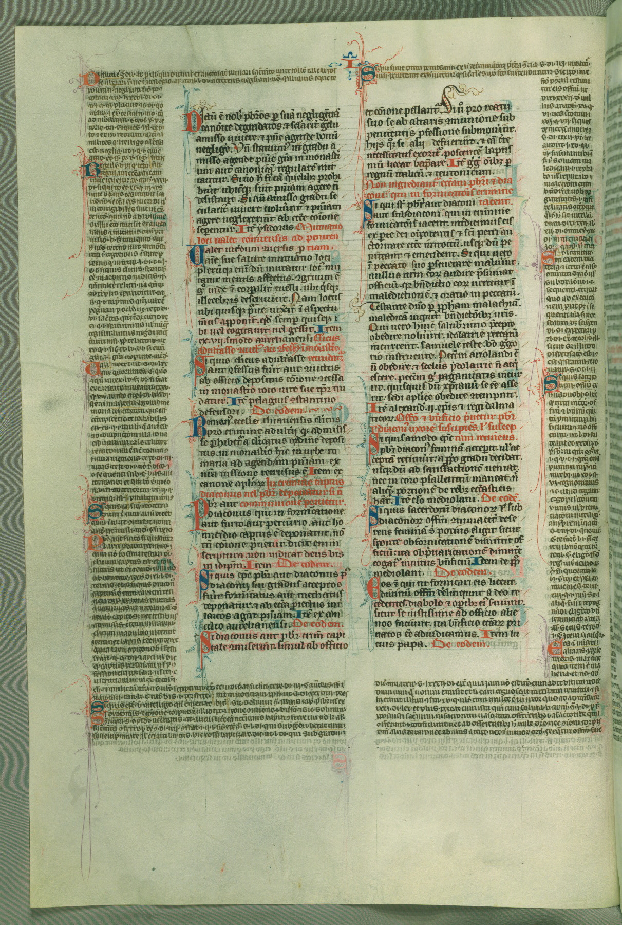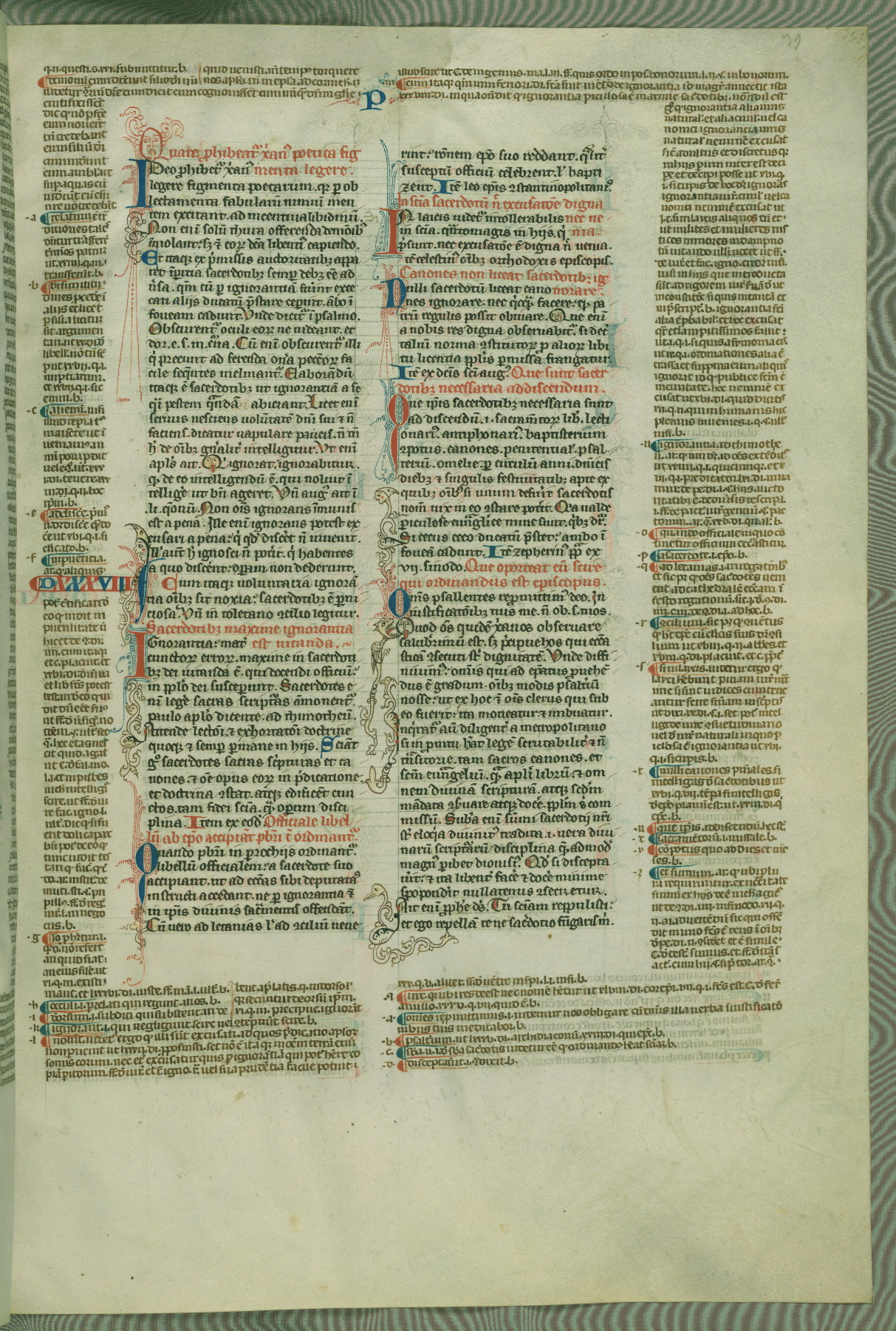 This deluxe version of Gratian's Decretum was created ca. 1280-90, most likely in Hainaut. The lively decoration of the manuscript indicates a marked taste for narrative, and there are thirty-seven historiated initials. The gloss work was completed by Bartholomew of Brescia. At first, Paris would seem to be the most likely place of origin, given that it was the leading center for the study of canon law. However, this particular manuscript exhibits scribal features that suggest its place of origin as being the Cistercian abbey of Cambron in Hainaut. Furthermore, Abbot Baudouin de Bousso, whose tenure at the abbey was from 1283 to 1293, was schooled in theology at the University of Paris, and he would eventually endorse the production of many fine manuscripts while at Cambron. In fact, the catalyst for this endeavor seems to have been the Beaupré Antiphonary (W.759-761), which was was created at Cambron during the 1280s. Stylistic features of W.133 seem to have connections with the Beaupré Antiphonary. For example, Cistercian monks are shown in three extant illuminations throughout three of the antiphonary volumes; these monks are pictured in brown habits similar to the type worn by clerics in W.133. The reliance upon Cistercian precedents for textual and design features associates W.133 with the Cistercian abbey at Cambron. However, more remains to be confirmed by further inspection of the output of the scriptorium at Cambron.