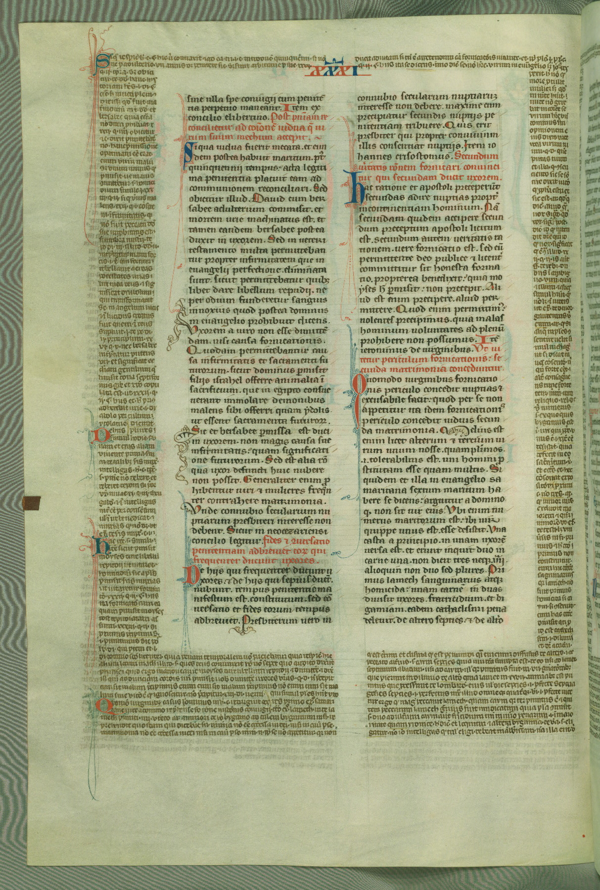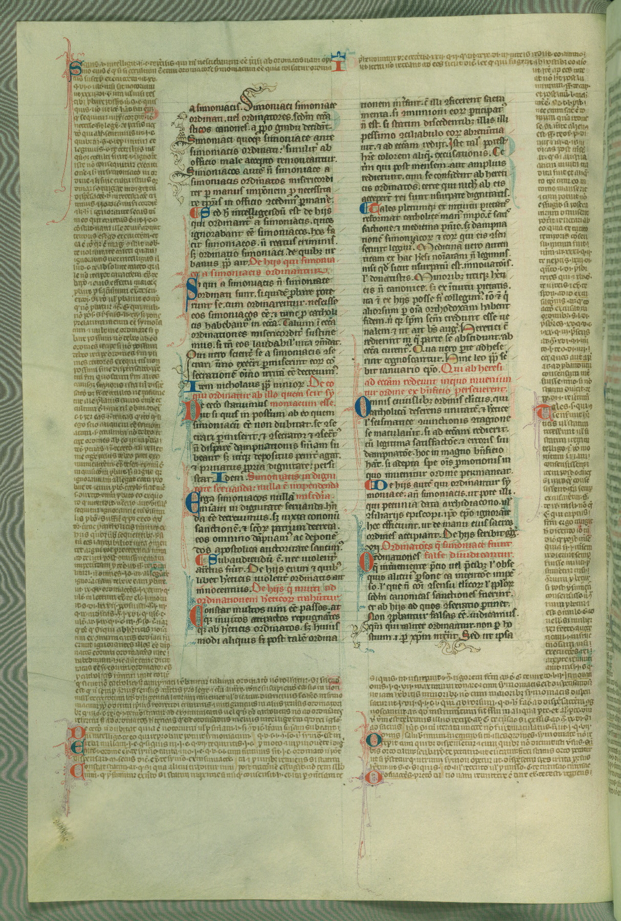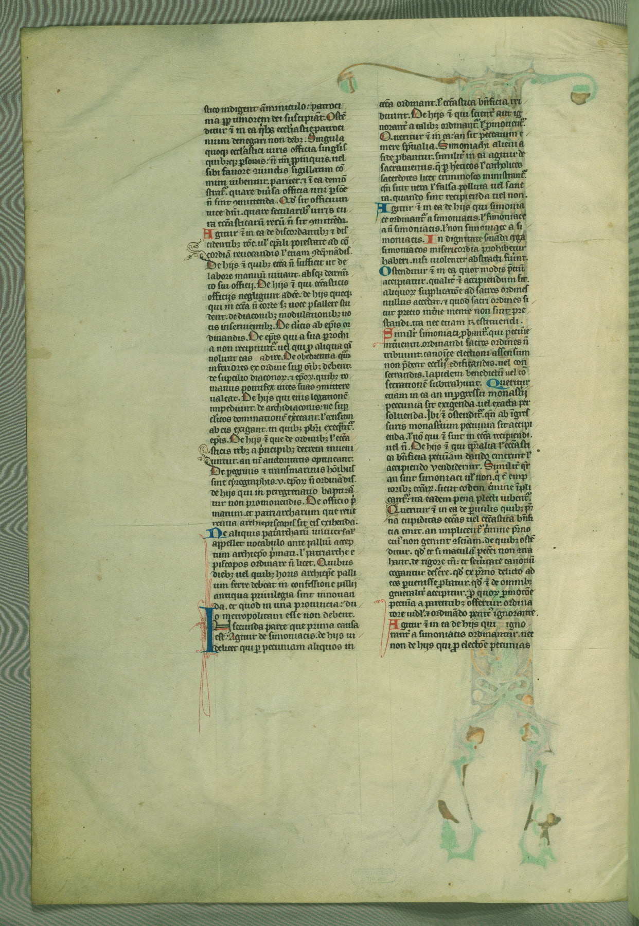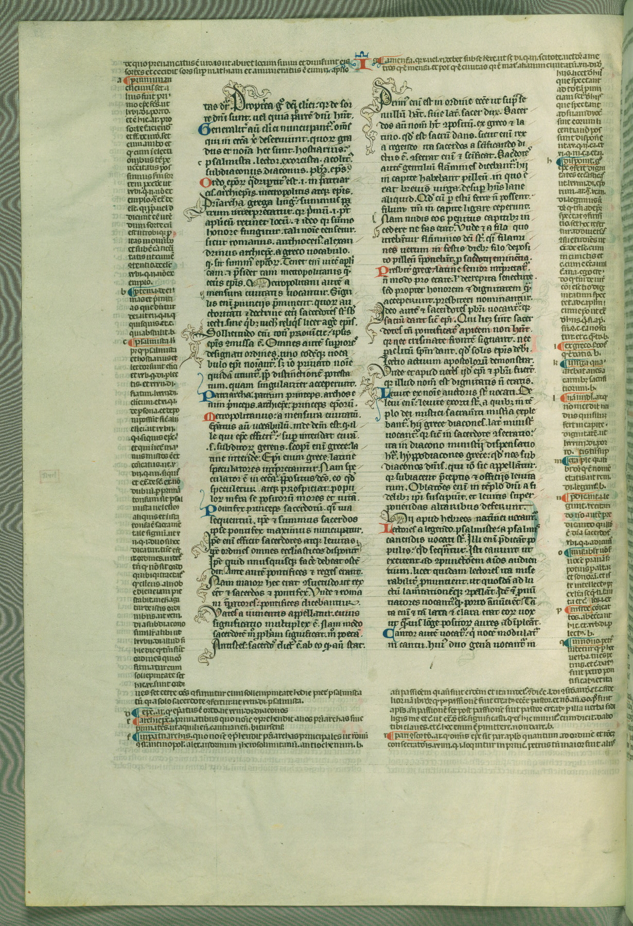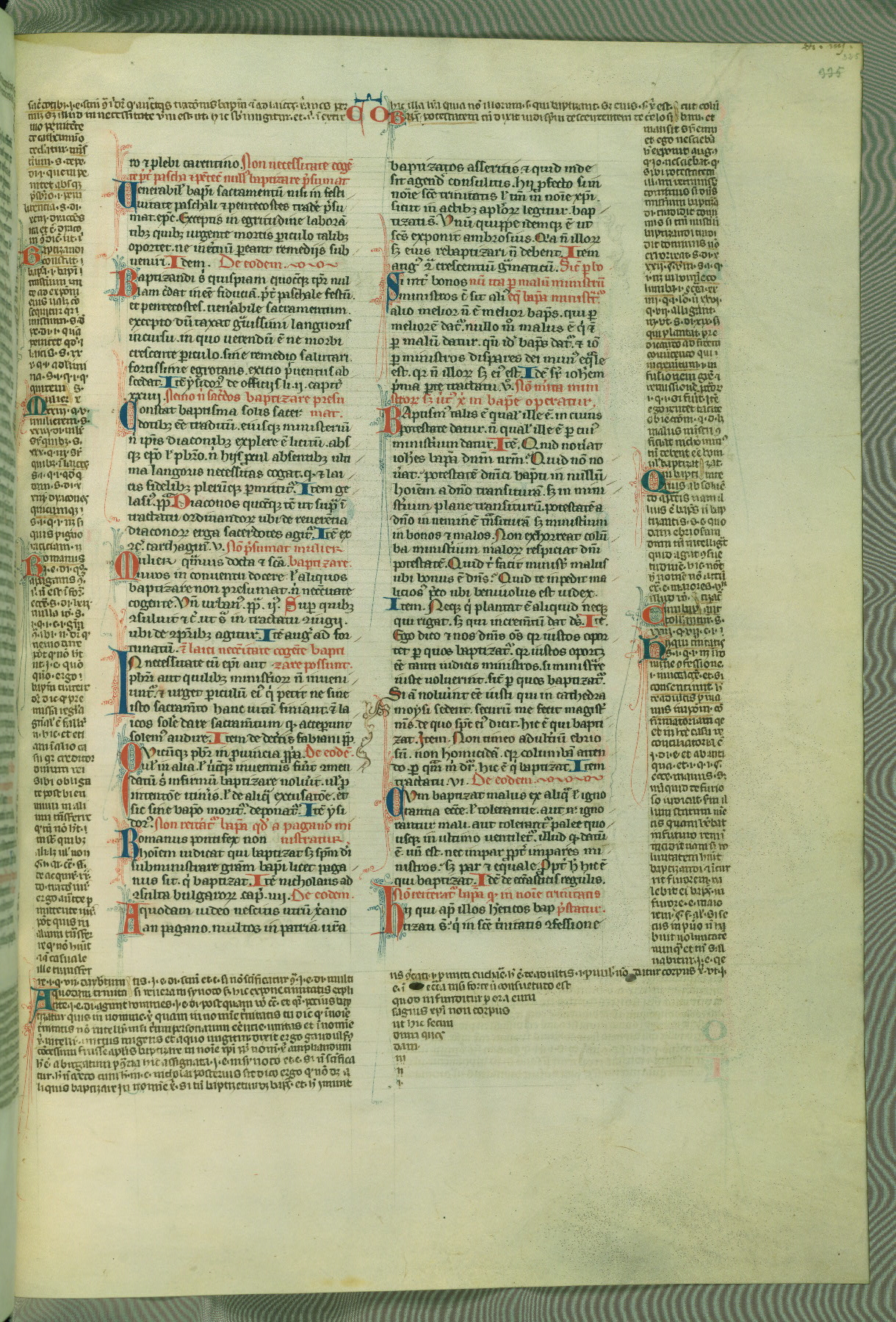 This deluxe version of Gratian's Decretum was created ca. 1280-90, most likely in Hainaut. The lively decoration of the manuscript indicates a marked taste for narrative, and there are thirty-seven historiated initials. The gloss work was completed by Bartholomew of Brescia. At first, Paris would seem to be the most likely place of origin, given that it was the leading center for the study of canon law. However, this particular manuscript exhibits scribal features that suggest its place of origin as being the Cistercian abbey of Cambron in Hainaut. Furthermore, Abbot Baudouin de Bousso, whose tenure at the abbey was from 1283 to 1293, was schooled in theology at the University of Paris, and he would eventually endorse the production of many fine manuscripts while at Cambron. In fact, the catalyst for this endeavor seems to have been the Beaupré Antiphonary (W.759-761), which was was created at Cambron during the 1280s. Stylistic features of W.133 seem to have connections with the Beaupré Antiphonary. For example, Cistercian monks are shown in three extant illuminations throughout three of the antiphonary volumes; these monks are pictured in brown habits similar to the type worn by clerics in W.133. The reliance upon Cistercian precedents for textual and design features associates W.133 with the Cistercian abbey at Cambron. However, more remains to be confirmed by further inspection of the output of the scriptorium at Cambron.