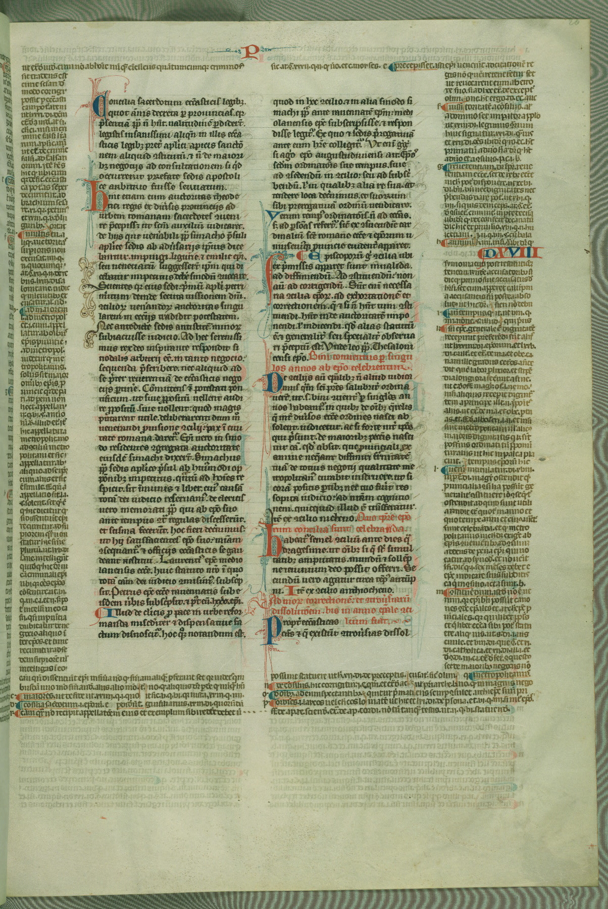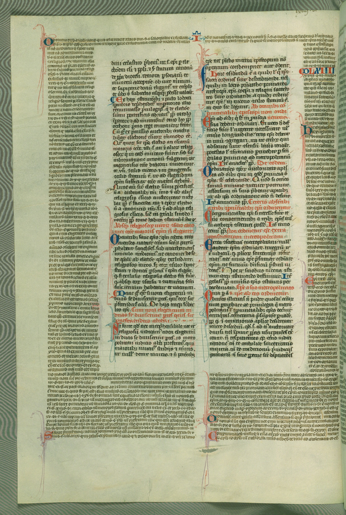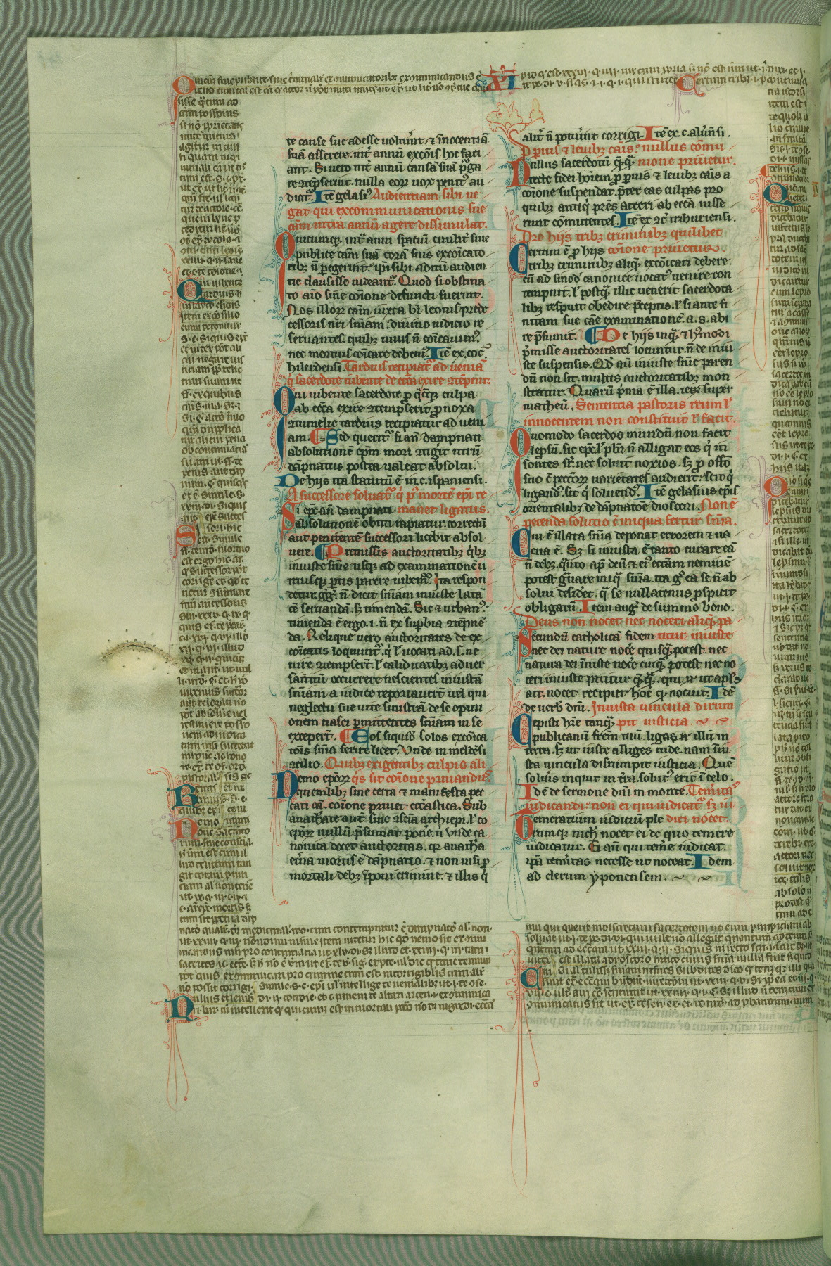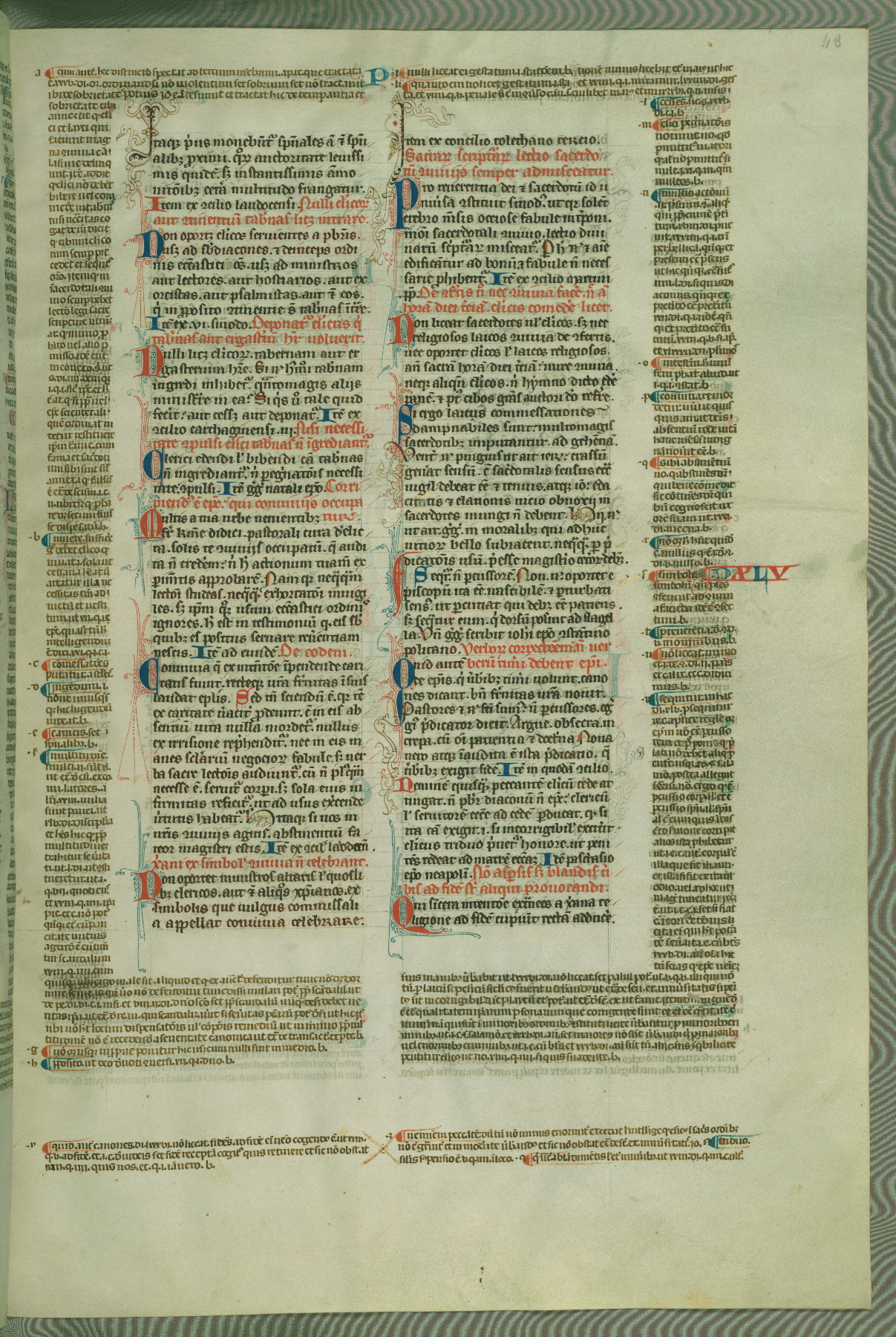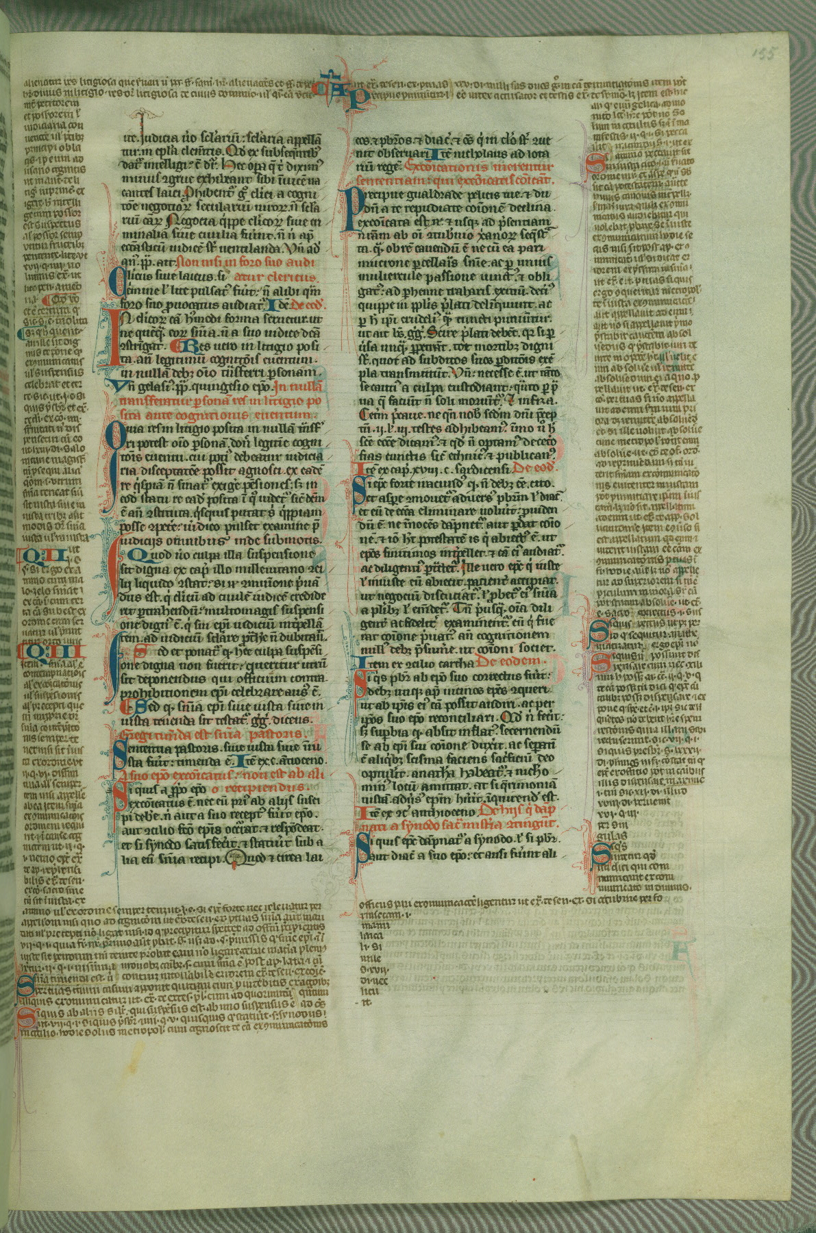 This deluxe version of Gratian's Decretum was created ca. 1280-90, most likely in Hainaut. The lively decoration of the manuscript indicates a marked taste for narrative, and there are thirty-seven historiated initials. The gloss work was completed by Bartholomew of Brescia. At first, Paris would seem to be the most likely place of origin, given that it was the leading center for the study of canon law. However, this particular manuscript exhibits scribal features that suggest its place of origin as being the Cistercian abbey of Cambron in Hainaut. Furthermore, Abbot Baudouin de Bousso, whose tenure at the abbey was from 1283 to 1293, was schooled in theology at the University of Paris, and he would eventually endorse the production of many fine manuscripts while at Cambron. In fact, the catalyst for this endeavor seems to have been the Beaupré Antiphonary (W.759-761), which was was created at Cambron during the 1280s. Stylistic features of W.133 seem to have connections with the Beaupré Antiphonary. For example, Cistercian monks are shown in three extant illuminations throughout three of the antiphonary volumes; these monks are pictured in brown habits similar to the type worn by clerics in W.133. The reliance upon Cistercian precedents for textual and design features associates W.133 with the Cistercian abbey at Cambron. However, more remains to be confirmed by further inspection of the output of the scriptorium at Cambron.