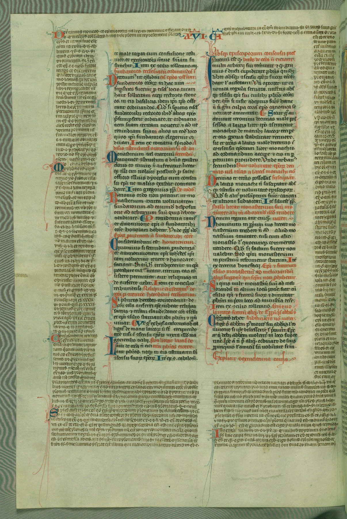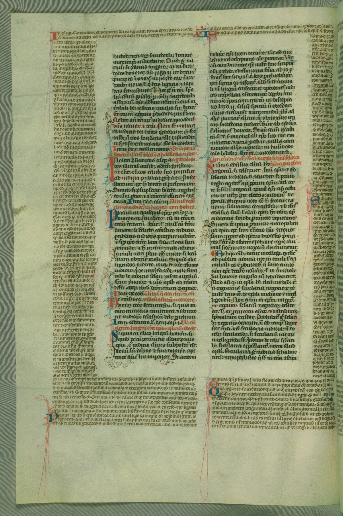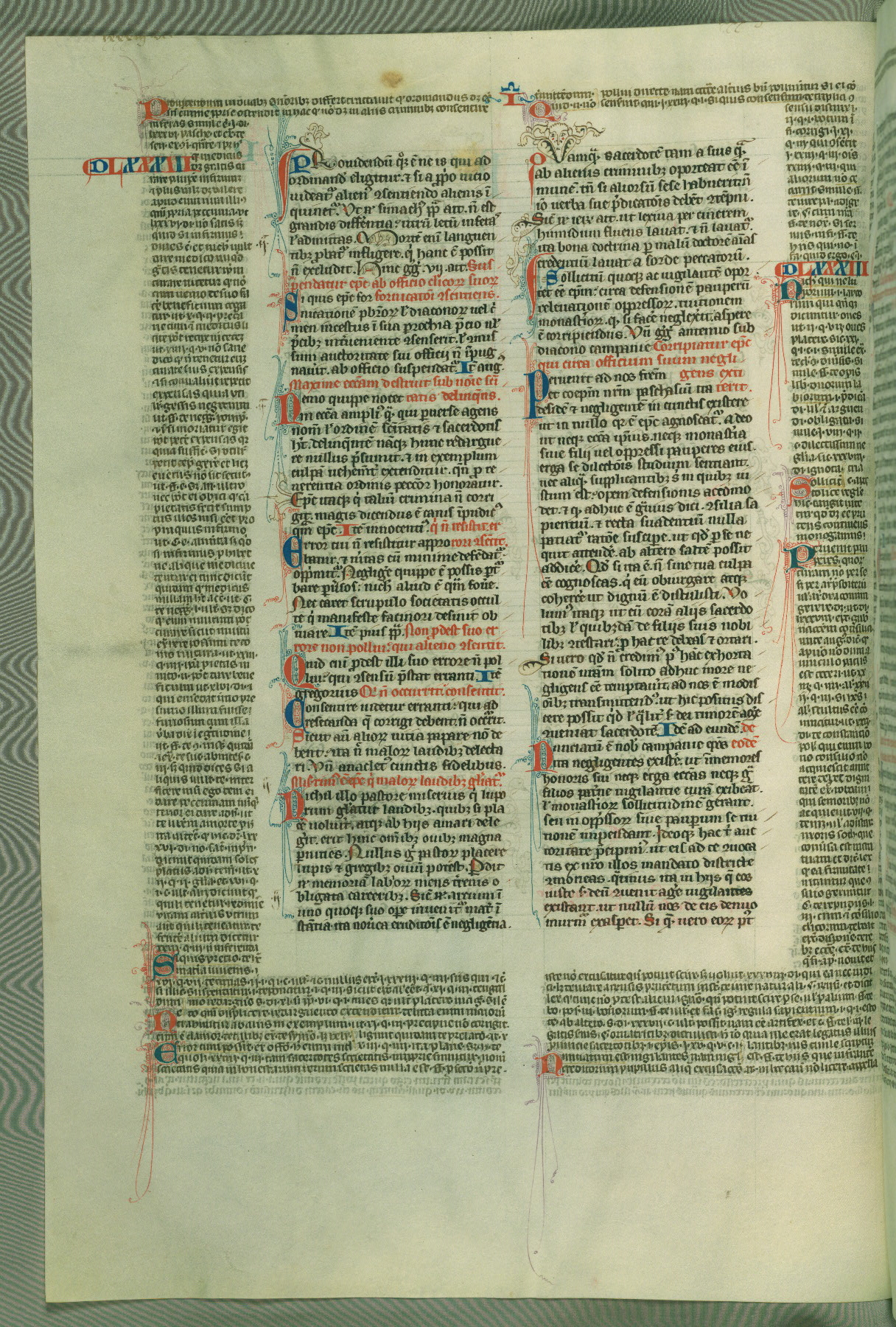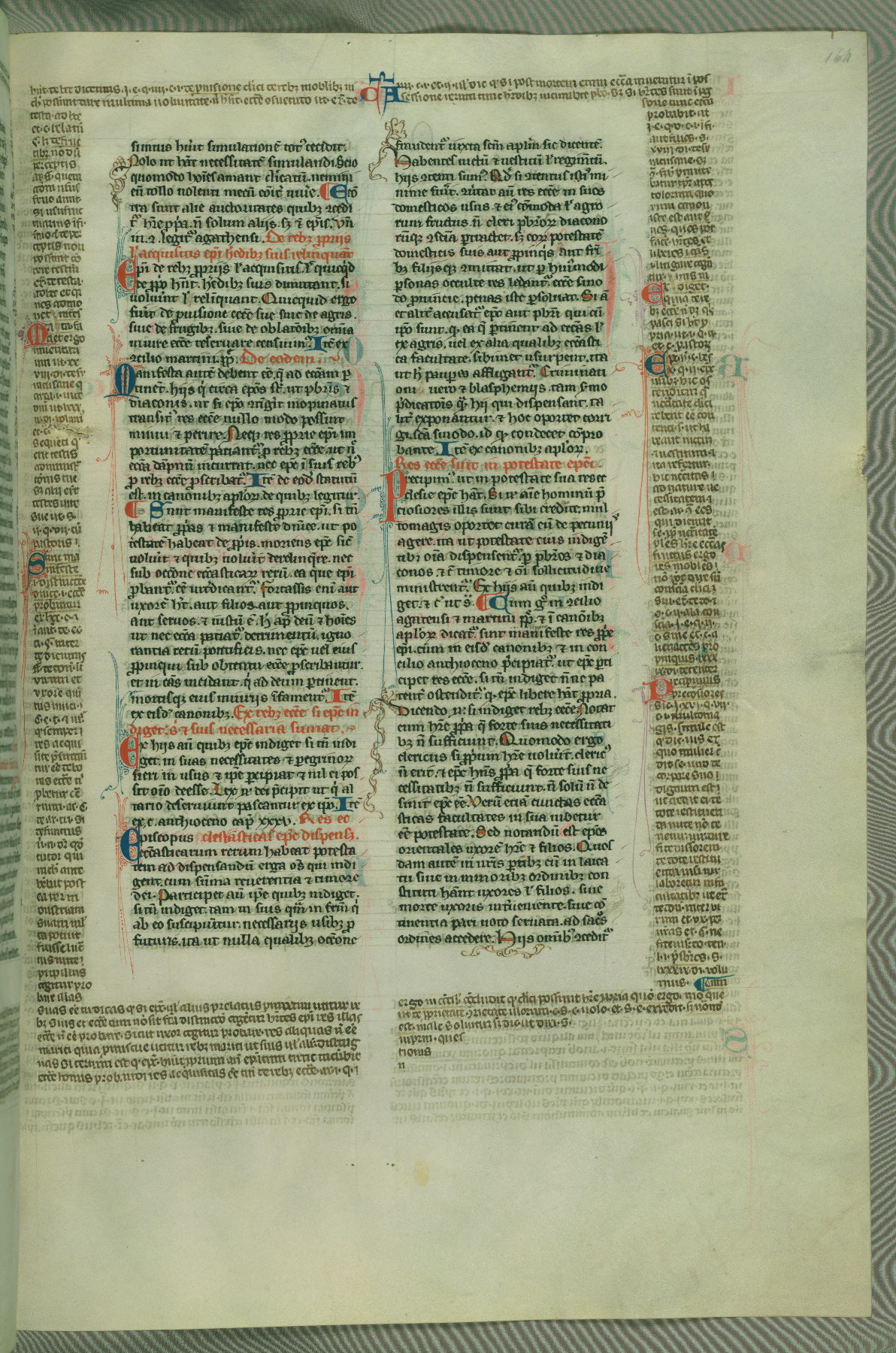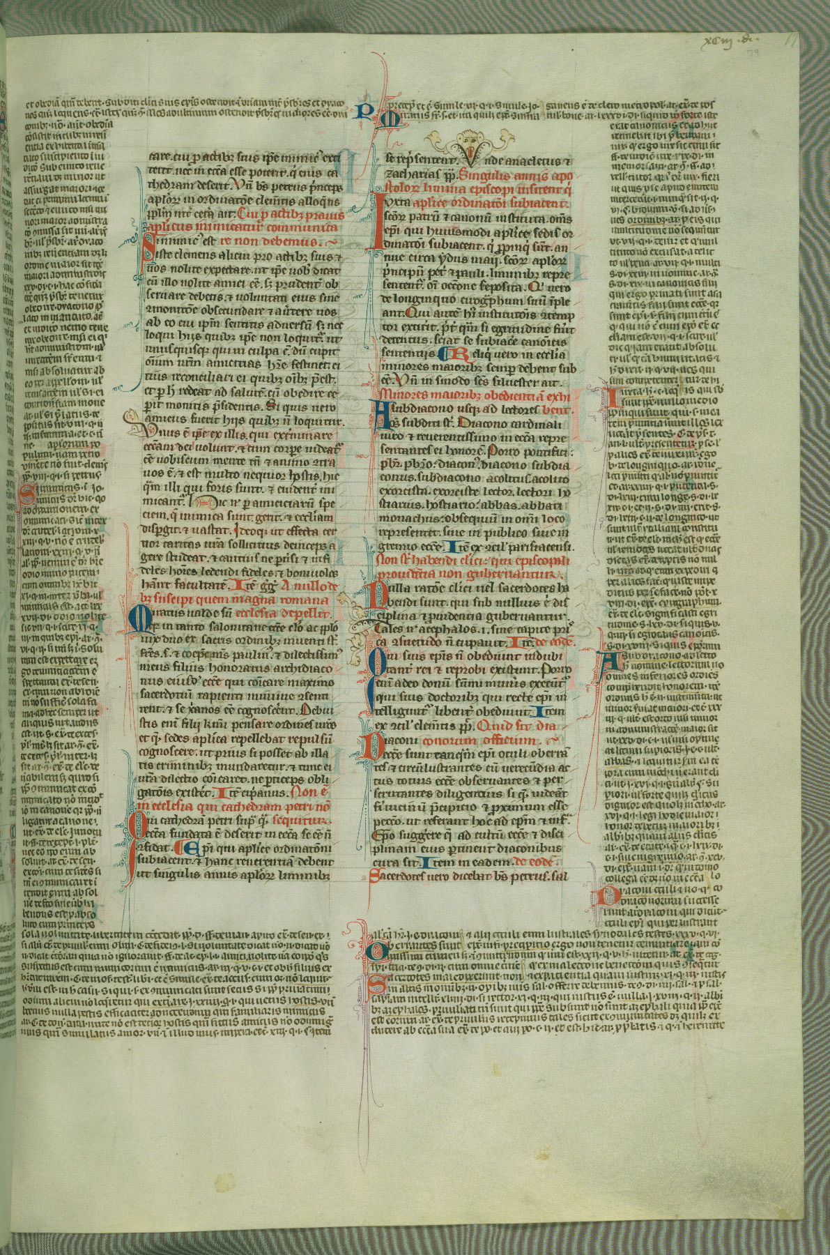 This deluxe version of Gratian's Decretum was created ca. 1280-90, most likely in Hainaut. The lively decoration of the manuscript indicates a marked taste for narrative, and there are thirty-seven historiated initials. The gloss work was completed by Bartholomew of Brescia. At first, Paris would seem to be the most likely place of origin, given that it was the leading center for the study of canon law. However, this particular manuscript exhibits scribal features that suggest its place of origin as being the Cistercian abbey of Cambron in Hainaut. Furthermore, Abbot Baudouin de Bousso, whose tenure at the abbey was from 1283 to 1293, was schooled in theology at the University of Paris, and he would eventually endorse the production of many fine manuscripts while at Cambron. In fact, the catalyst for this endeavor seems to have been the Beaupré Antiphonary (W.759-761), which was was created at Cambron during the 1280s. Stylistic features of W.133 seem to have connections with the Beaupré Antiphonary. For example, Cistercian monks are shown in three extant illuminations throughout three of the antiphonary volumes; these monks are pictured in brown habits similar to the type worn by clerics in W.133. The reliance upon Cistercian precedents for textual and design features associates W.133 with the Cistercian abbey at Cambron. However, more remains to be confirmed by further inspection of the output of the scriptorium at Cambron.