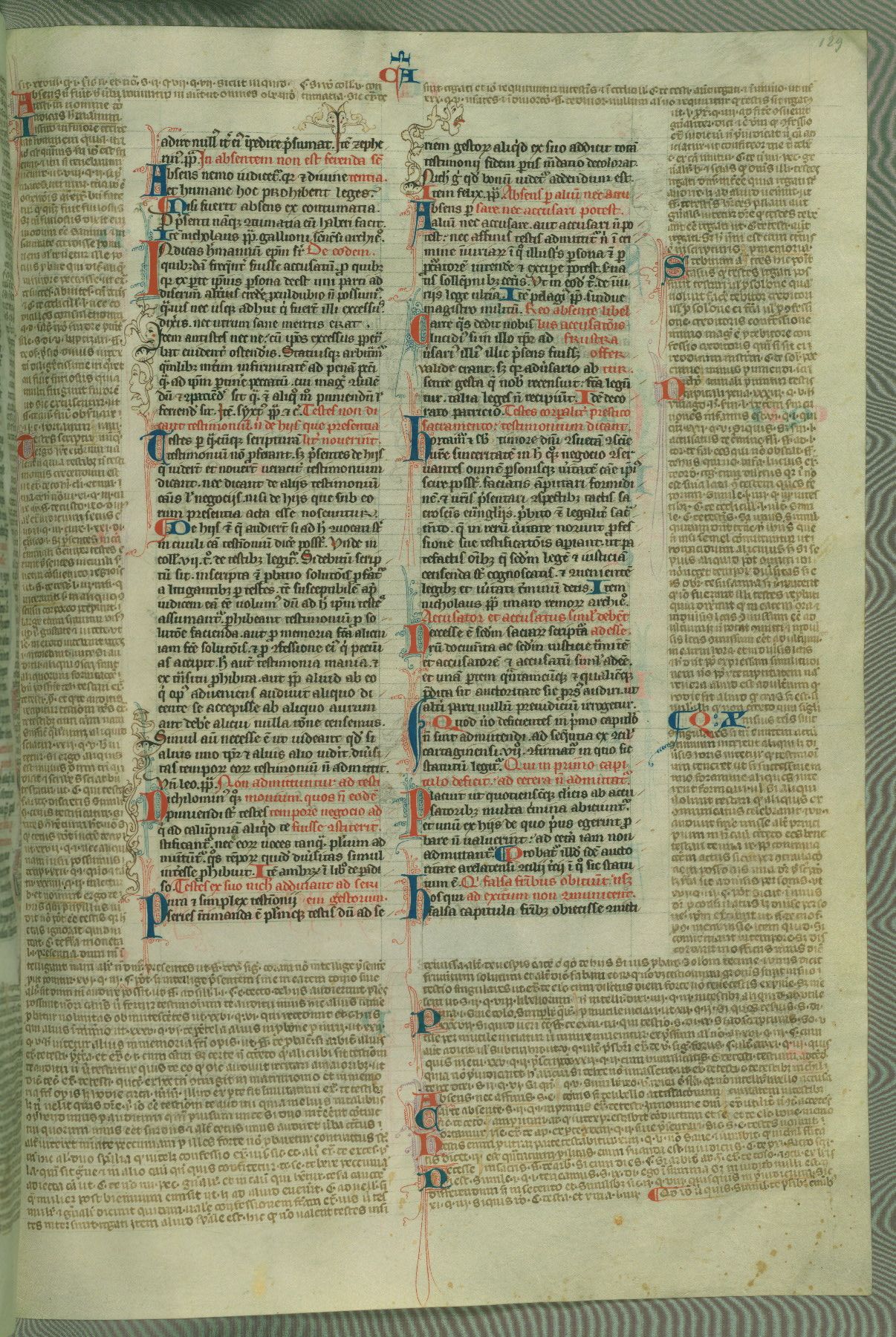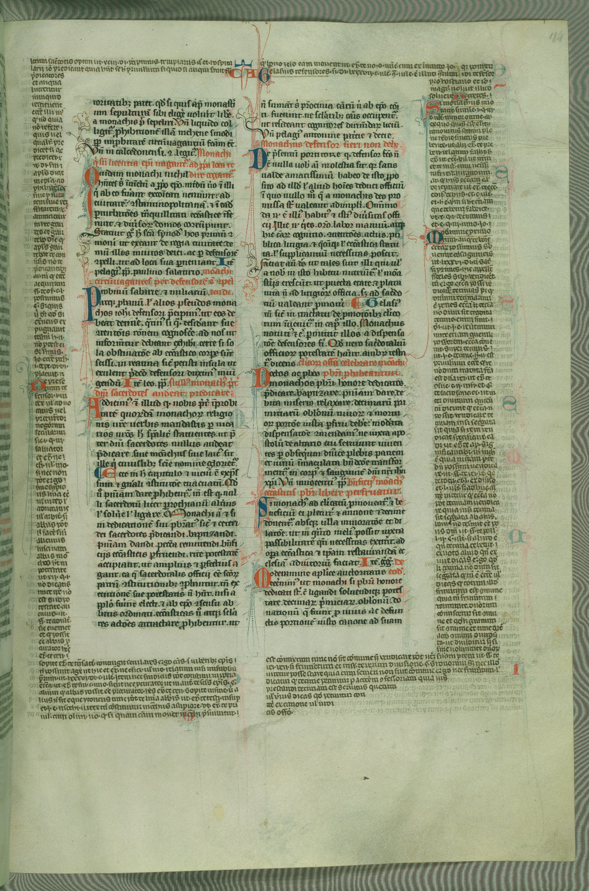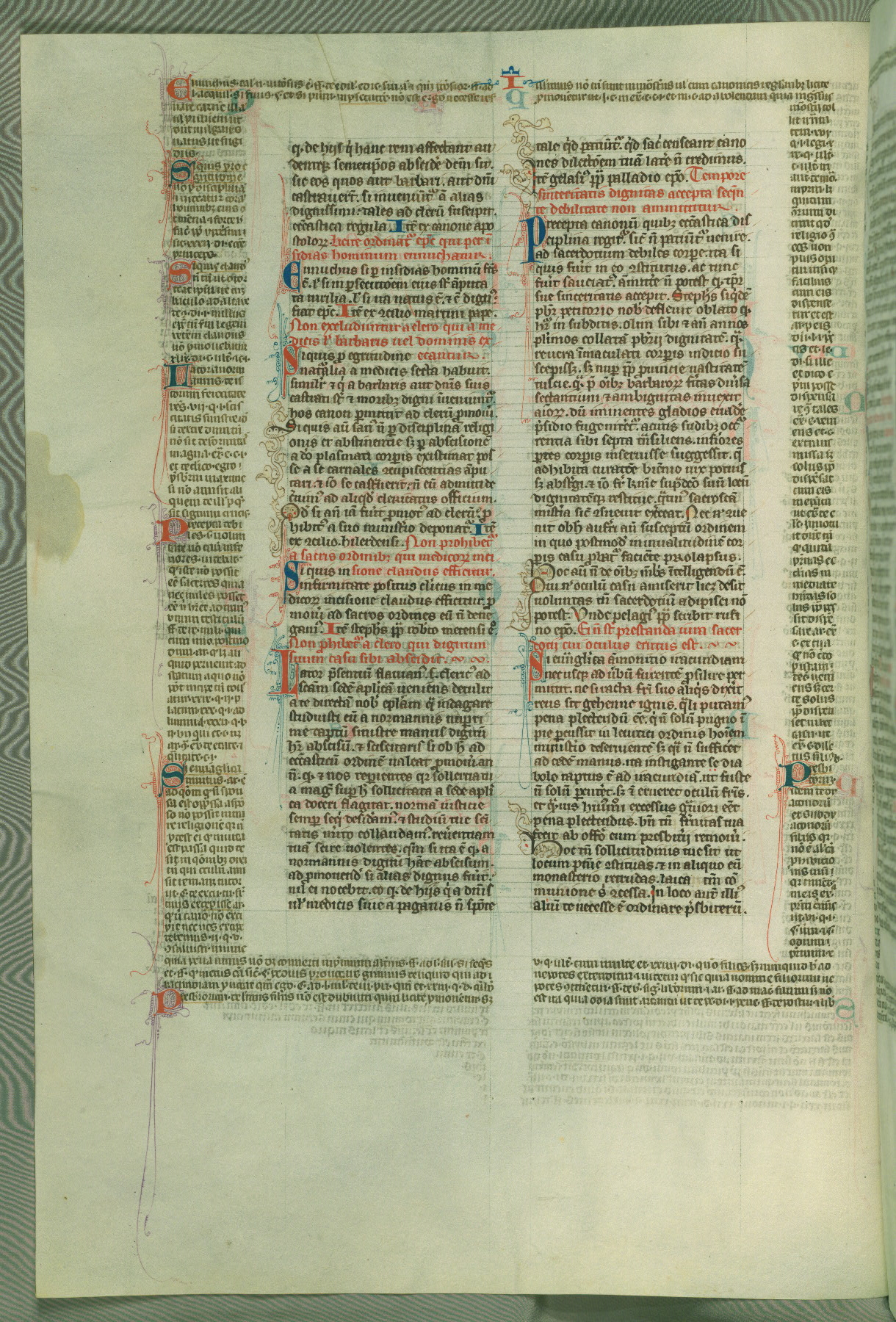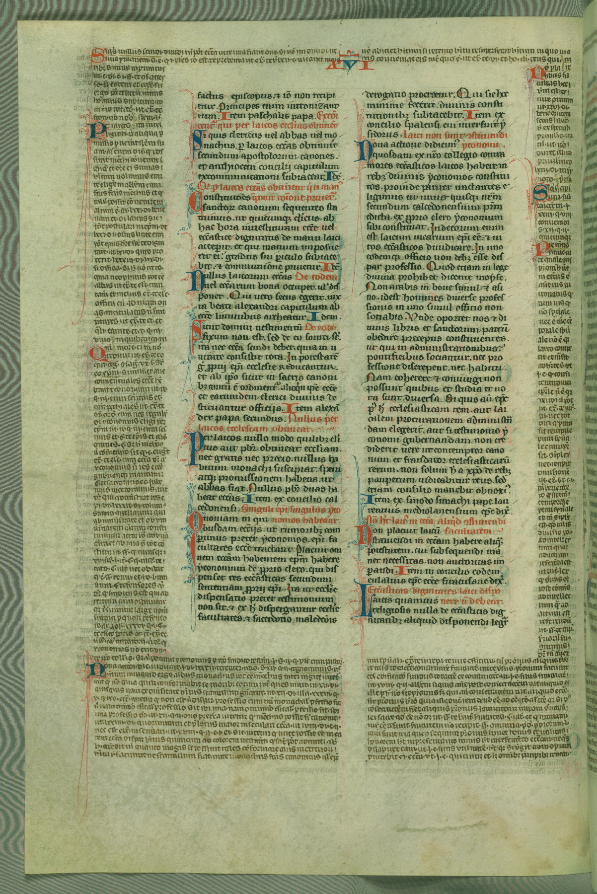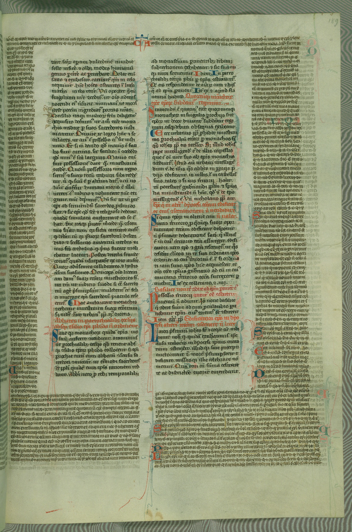 This deluxe version of Gratian's Decretum was created ca. 1280-90, most likely in Hainaut. The lively decoration of the manuscript indicates a marked taste for narrative, and there are thirty-seven historiated initials. The gloss work was completed by Bartholomew of Brescia. At first, Paris would seem to be the most likely place of origin, given that it was the leading center for the study of canon law. However, this particular manuscript exhibits scribal features that suggest its place of origin as being the Cistercian abbey of Cambron in Hainaut. Furthermore, Abbot Baudouin de Bousso, whose tenure at the abbey was from 1283 to 1293, was schooled in theology at the University of Paris, and he would eventually endorse the production of many fine manuscripts while at Cambron. In fact, the catalyst for this endeavor seems to have been the Beaupré Antiphonary (W.759-761), which was was created at Cambron during the 1280s. Stylistic features of W.133 seem to have connections with the Beaupré Antiphonary. For example, Cistercian monks are shown in three extant illuminations throughout three of the antiphonary volumes; these monks are pictured in brown habits similar to the type worn by clerics in W.133. The reliance upon Cistercian precedents for textual and design features associates W.133 with the Cistercian abbey at Cambron. However, more remains to be confirmed by further inspection of the output of the scriptorium at Cambron.