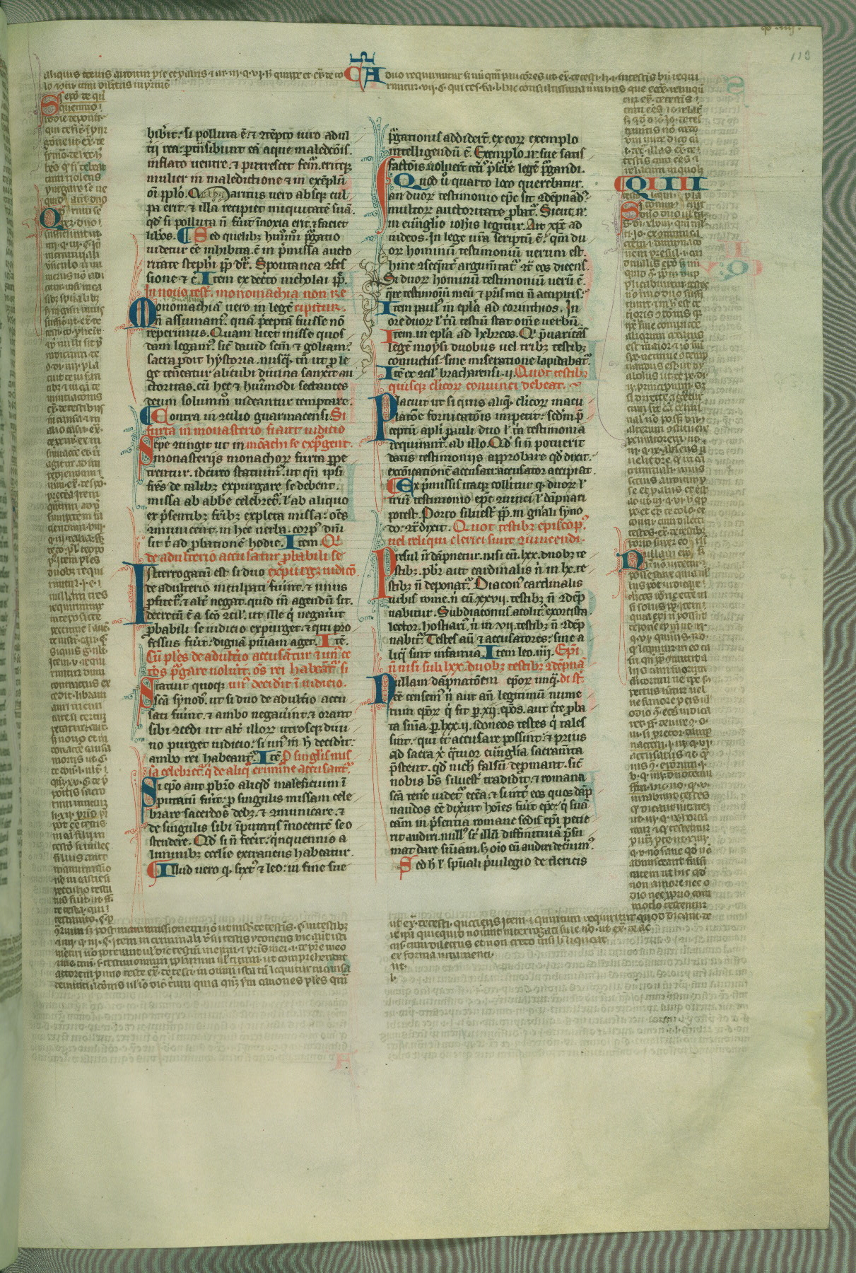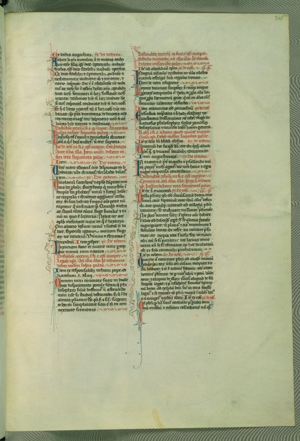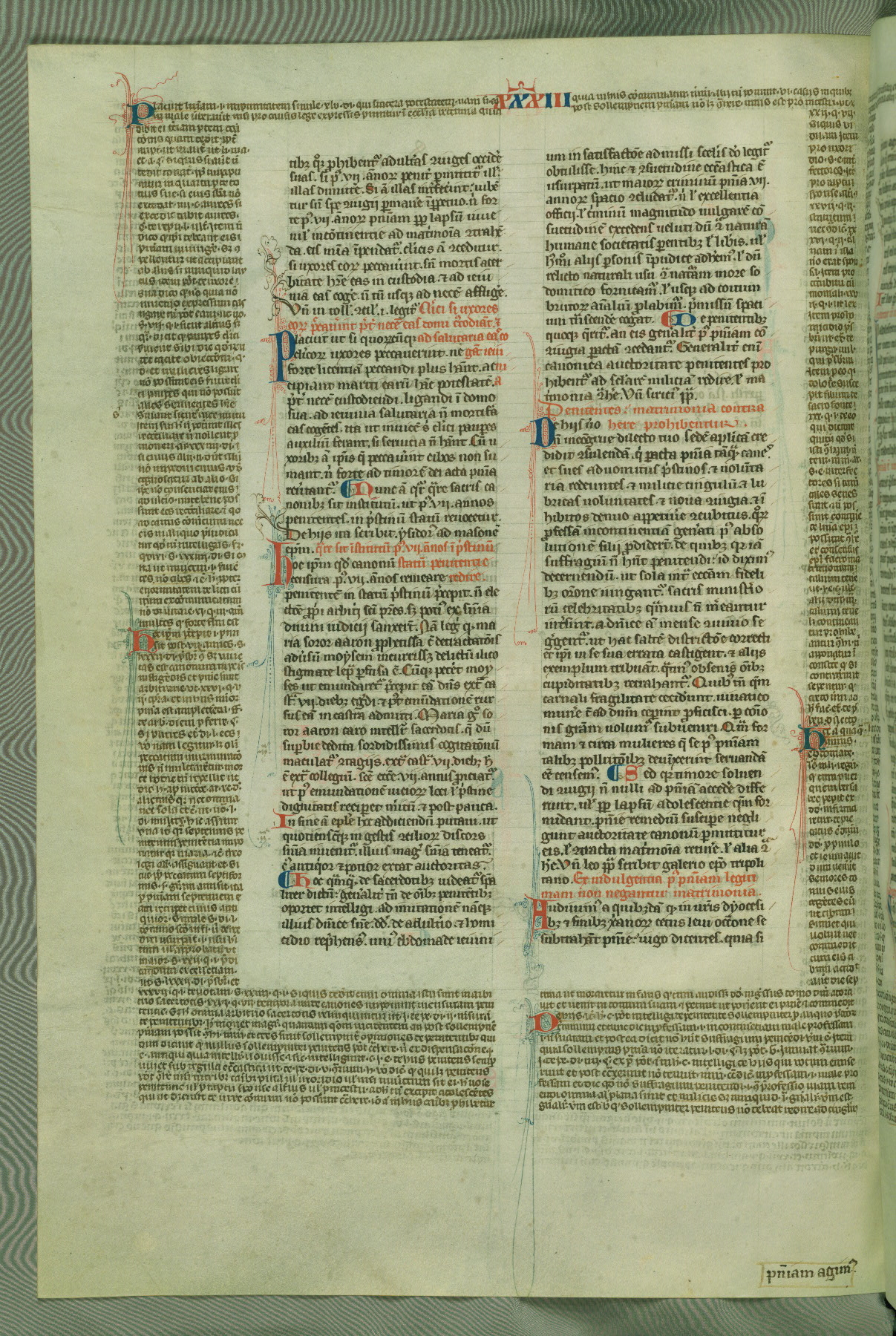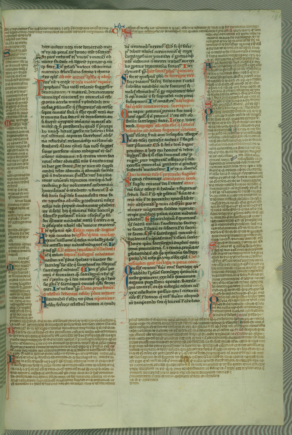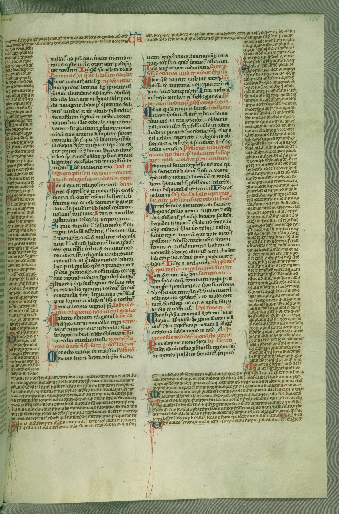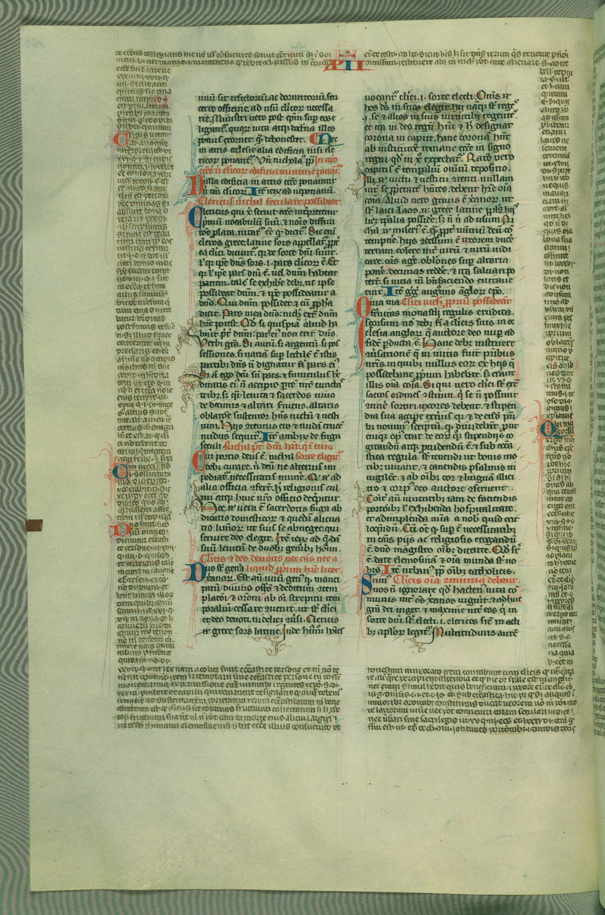 This deluxe version of Gratian's Decretum was created ca. 1280-90, most likely in Hainaut. The lively decoration of the manuscript indicates a marked taste for narrative, and there are thirty-seven historiated initials. The gloss work was completed by Bartholomew of Brescia. At first, Paris would seem to be the most likely place of origin, given that it was the leading center for the study of canon law. However, this particular manuscript exhibits scribal features that suggest its place of origin as being the Cistercian abbey of Cambron in Hainaut. Furthermore, Abbot Baudouin de Bousso, whose tenure at the abbey was from 1283 to 1293, was schooled in theology at the University of Paris, and he would eventually endorse the production of many fine manuscripts while at Cambron. In fact, the catalyst for this endeavor seems to have been the Beaupré Antiphonary (W.759-761), which was was created at Cambron during the 1280s. Stylistic features of W.133 seem to have connections with the Beaupré Antiphonary. For example, Cistercian monks are shown in three extant illuminations throughout three of the antiphonary volumes; these monks are pictured in brown habits similar to the type worn by clerics in W.133. The reliance upon Cistercian precedents for textual and design features associates W.133 with the Cistercian abbey at Cambron. However, more remains to be confirmed by further inspection of the output of the scriptorium at Cambron.