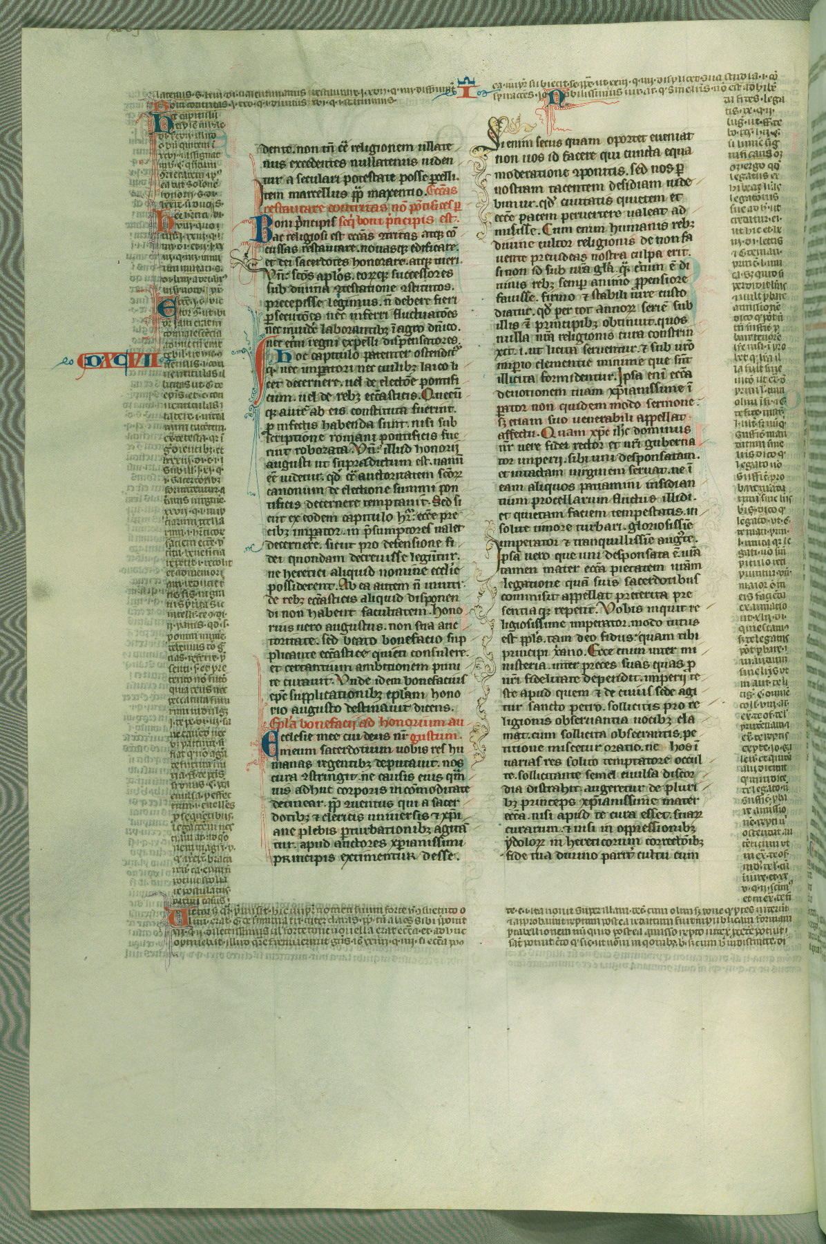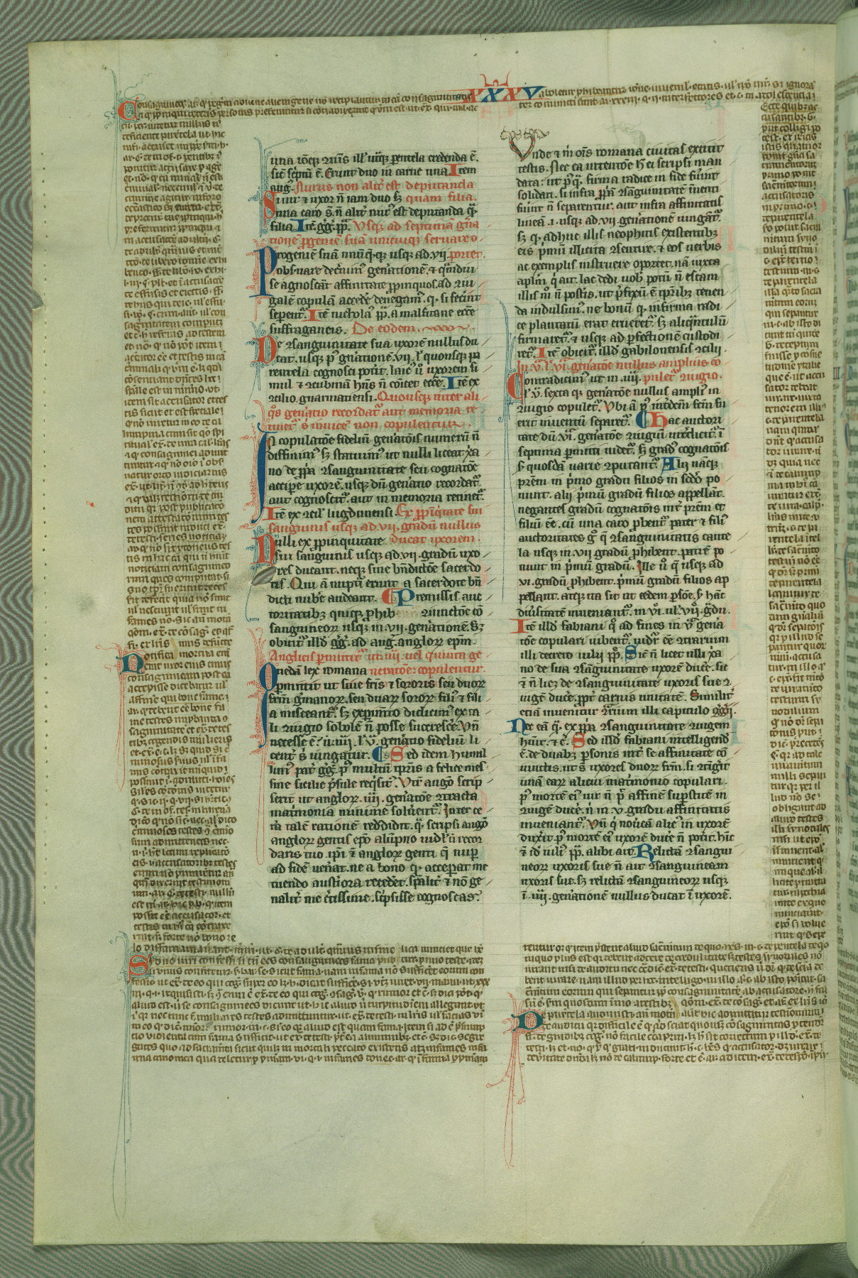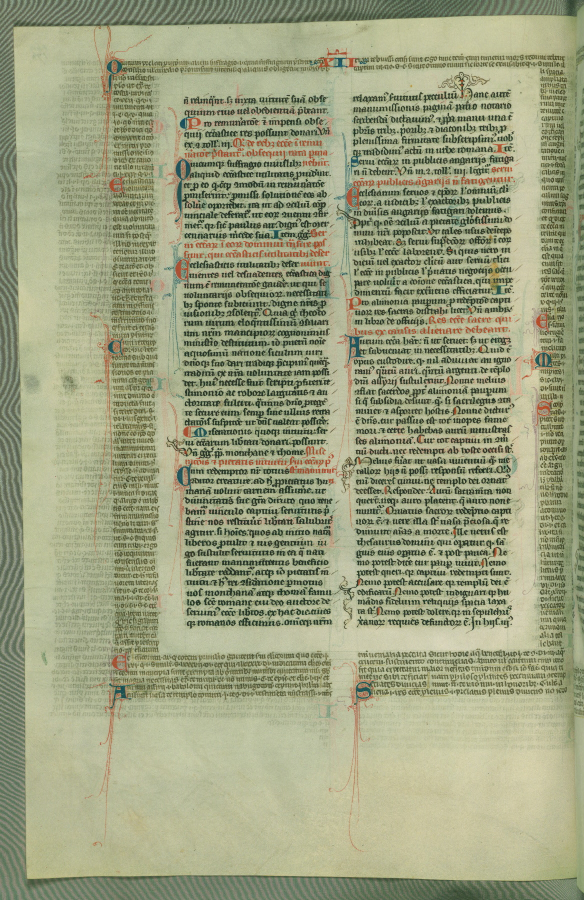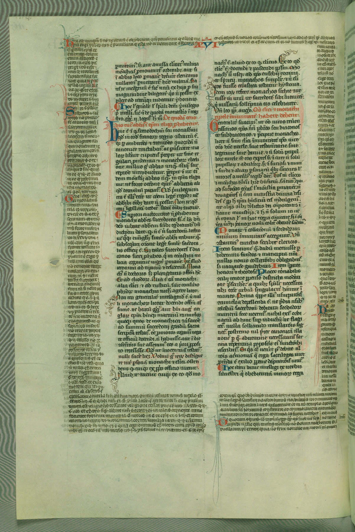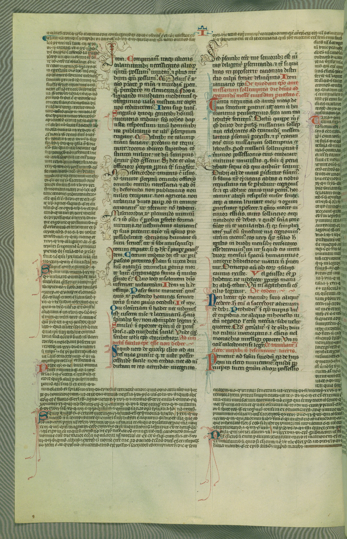 This deluxe version of Gratian's Decretum was created ca. 1280-90, most likely in Hainaut. The lively decoration of the manuscript indicates a marked taste for narrative, and there are thirty-seven historiated initials. The gloss work was completed by Bartholomew of Brescia. At first, Paris would seem to be the most likely place of origin, given that it was the leading center for the study of canon law. However, this particular manuscript exhibits scribal features that suggest its place of origin as being the Cistercian abbey of Cambron in Hainaut. Furthermore, Abbot Baudouin de Bousso, whose tenure at the abbey was from 1283 to 1293, was schooled in theology at the University of Paris, and he would eventually endorse the production of many fine manuscripts while at Cambron. In fact, the catalyst for this endeavor seems to have been the Beaupré Antiphonary (W.759-761), which was was created at Cambron during the 1280s. Stylistic features of W.133 seem to have connections with the Beaupré Antiphonary. For example, Cistercian monks are shown in three extant illuminations throughout three of the antiphonary volumes; these monks are pictured in brown habits similar to the type worn by clerics in W.133. The reliance upon Cistercian precedents for textual and design features associates W.133 with the Cistercian abbey at Cambron. However, more remains to be confirmed by further inspection of the output of the scriptorium at Cambron.