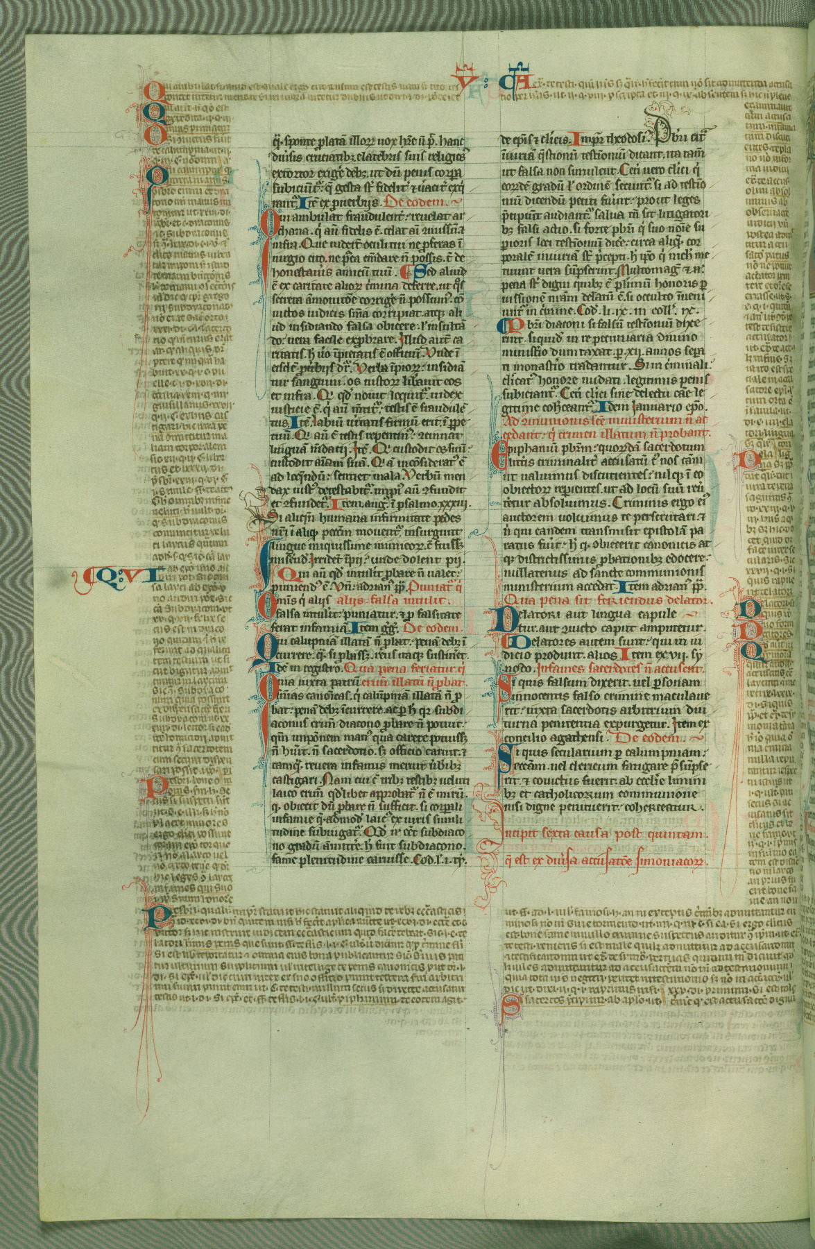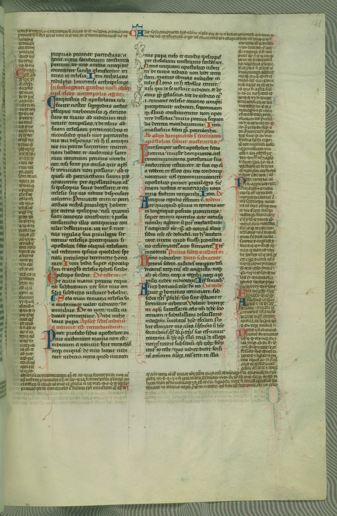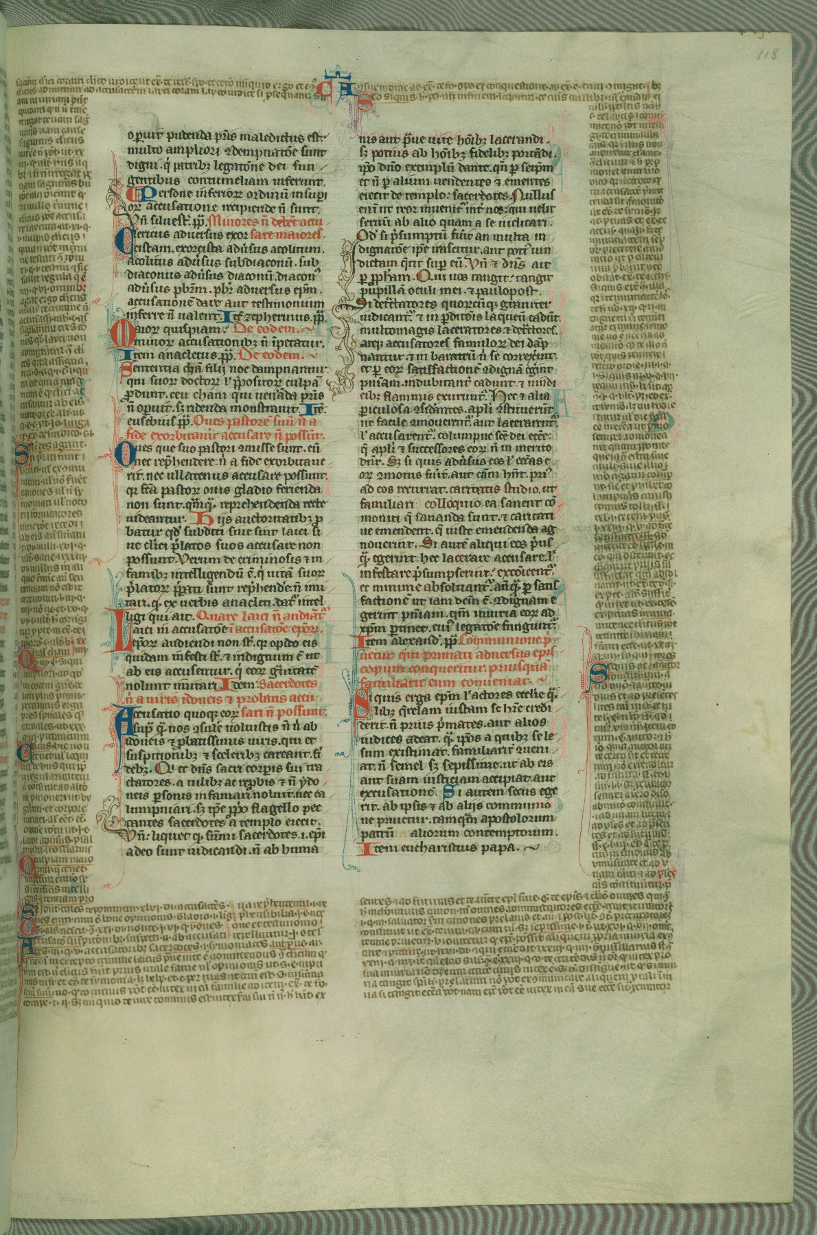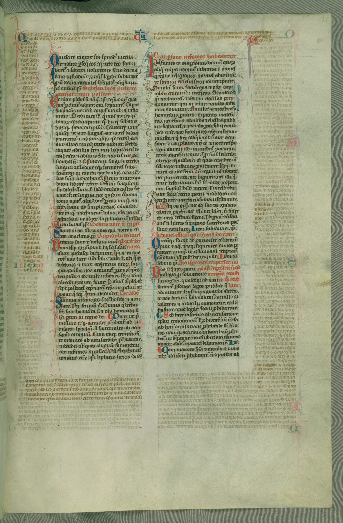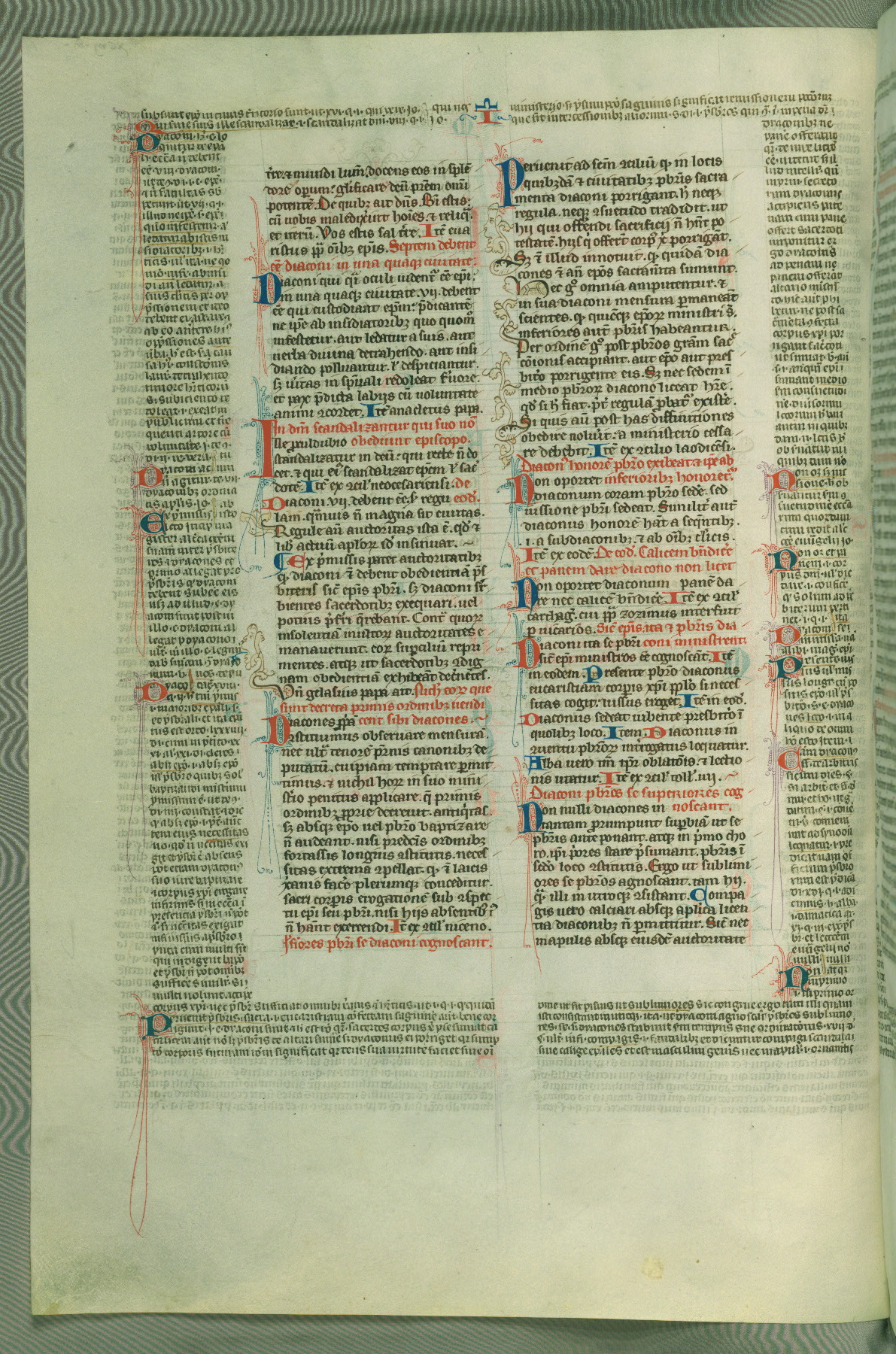 This deluxe version of Gratian's Decretum was created ca. 1280-90, most likely in Hainaut. The lively decoration of the manuscript indicates a marked taste for narrative, and there are thirty-seven historiated initials. The gloss work was completed by Bartholomew of Brescia. At first, Paris would seem to be the most likely place of origin, given that it was the leading center for the study of canon law. However, this particular manuscript exhibits scribal features that suggest its place of origin as being the Cistercian abbey of Cambron in Hainaut. Furthermore, Abbot Baudouin de Bousso, whose tenure at the abbey was from 1283 to 1293, was schooled in theology at the University of Paris, and he would eventually endorse the production of many fine manuscripts while at Cambron. In fact, the catalyst for this endeavor seems to have been the Beaupré Antiphonary (W.759-761), which was was created at Cambron during the 1280s. Stylistic features of W.133 seem to have connections with the Beaupré Antiphonary. For example, Cistercian monks are shown in three extant illuminations throughout three of the antiphonary volumes; these monks are pictured in brown habits similar to the type worn by clerics in W.133. The reliance upon Cistercian precedents for textual and design features associates W.133 with the Cistercian abbey at Cambron. However, more remains to be confirmed by further inspection of the output of the scriptorium at Cambron.