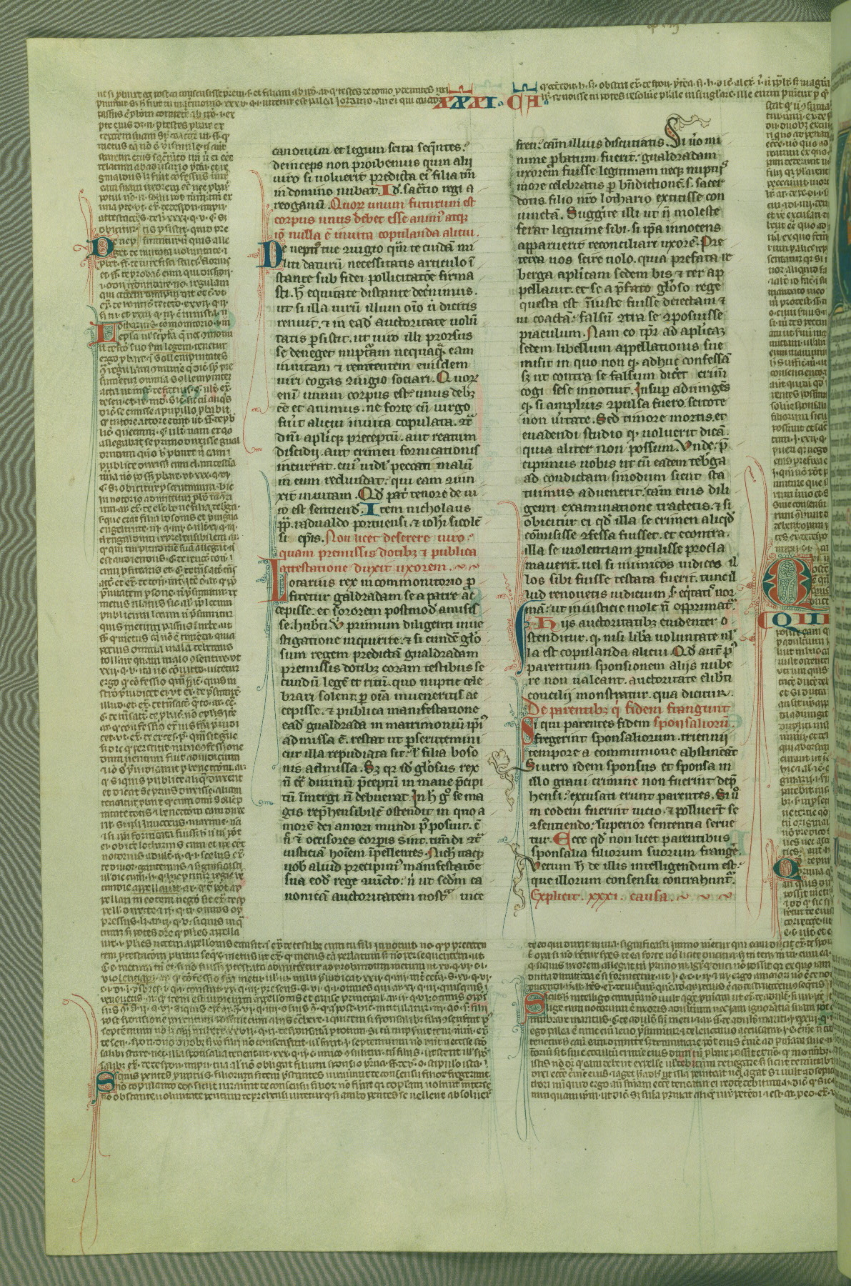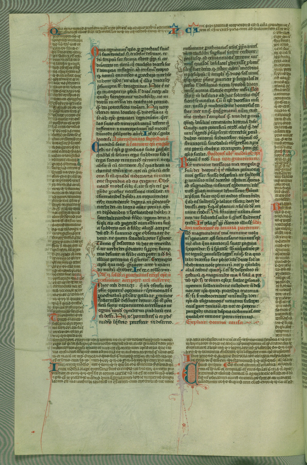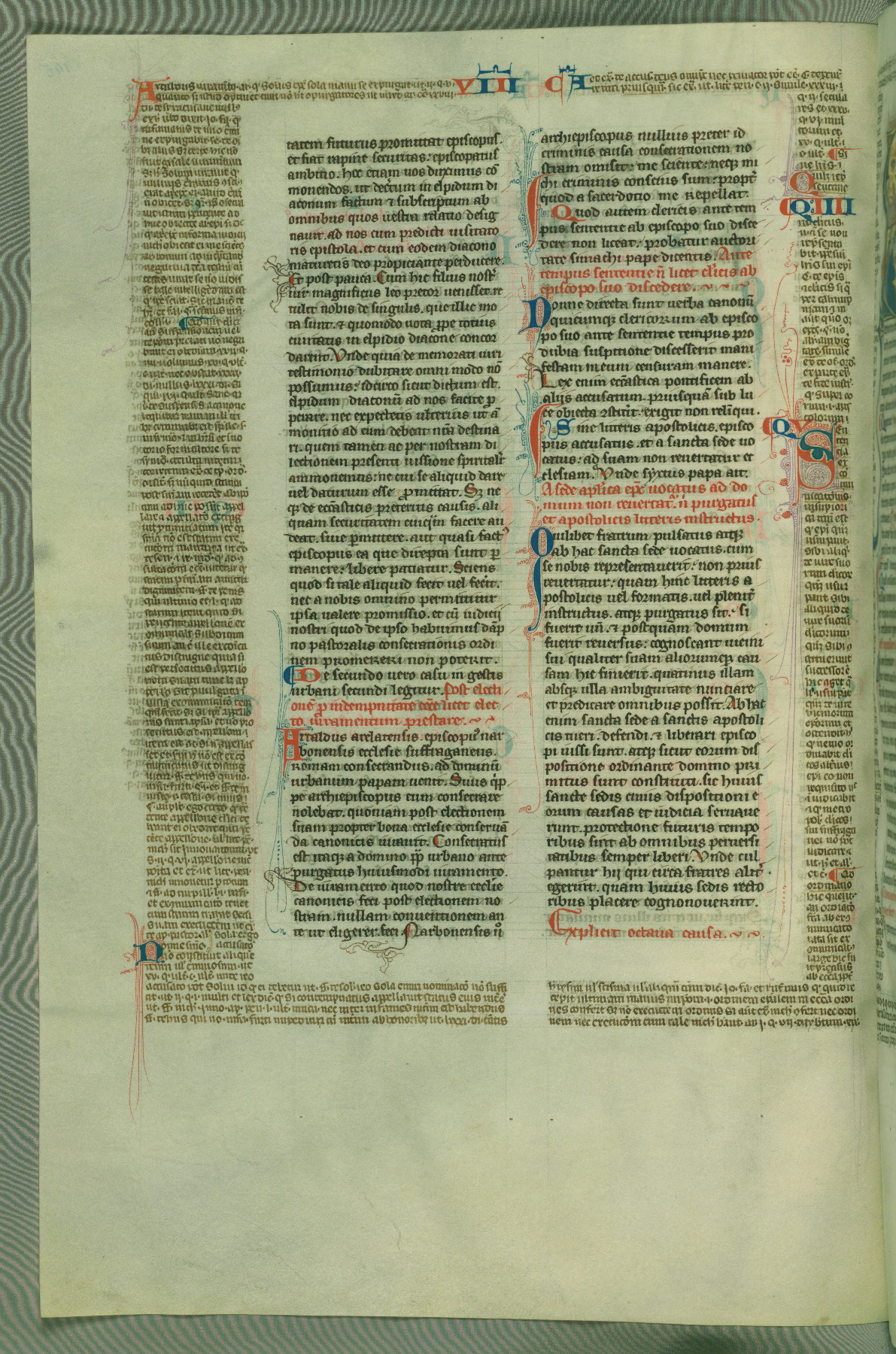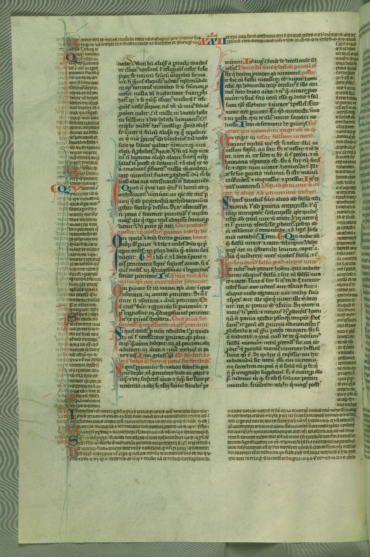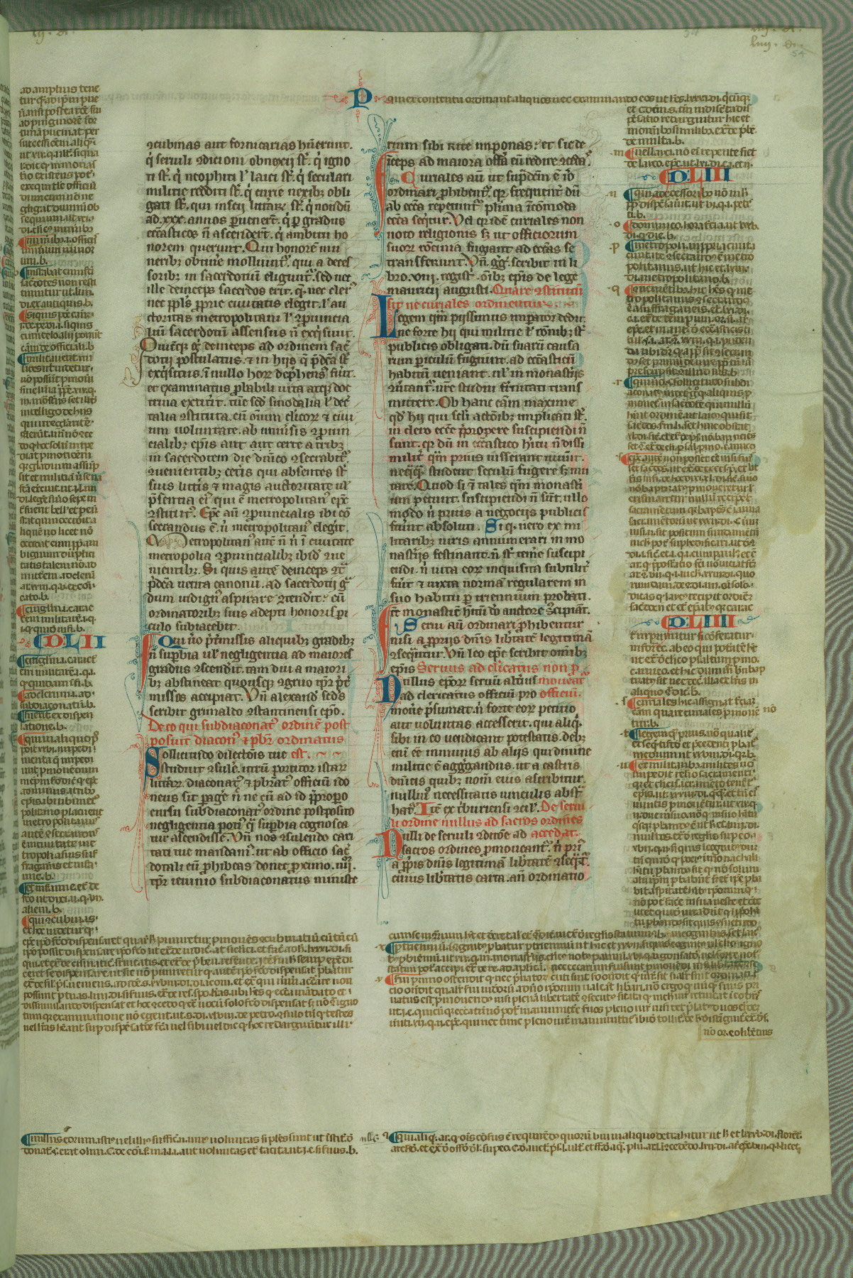 This deluxe version of Gratian's Decretum was created ca. 1280-90, most likely in Hainaut. The lively decoration of the manuscript indicates a marked taste for narrative, and there are thirty-seven historiated initials. The gloss work was completed by Bartholomew of Brescia. At first, Paris would seem to be the most likely place of origin, given that it was the leading center for the study of canon law. However, this particular manuscript exhibits scribal features that suggest its place of origin as being the Cistercian abbey of Cambron in Hainaut. Furthermore, Abbot Baudouin de Bousso, whose tenure at the abbey was from 1283 to 1293, was schooled in theology at the University of Paris, and he would eventually endorse the production of many fine manuscripts while at Cambron. In fact, the catalyst for this endeavor seems to have been the Beaupré Antiphonary (W.759-761), which was was created at Cambron during the 1280s. Stylistic features of W.133 seem to have connections with the Beaupré Antiphonary. For example, Cistercian monks are shown in three extant illuminations throughout three of the antiphonary volumes; these monks are pictured in brown habits similar to the type worn by clerics in W.133. The reliance upon Cistercian precedents for textual and design features associates W.133 with the Cistercian abbey at Cambron. However, more remains to be confirmed by further inspection of the output of the scriptorium at Cambron.
