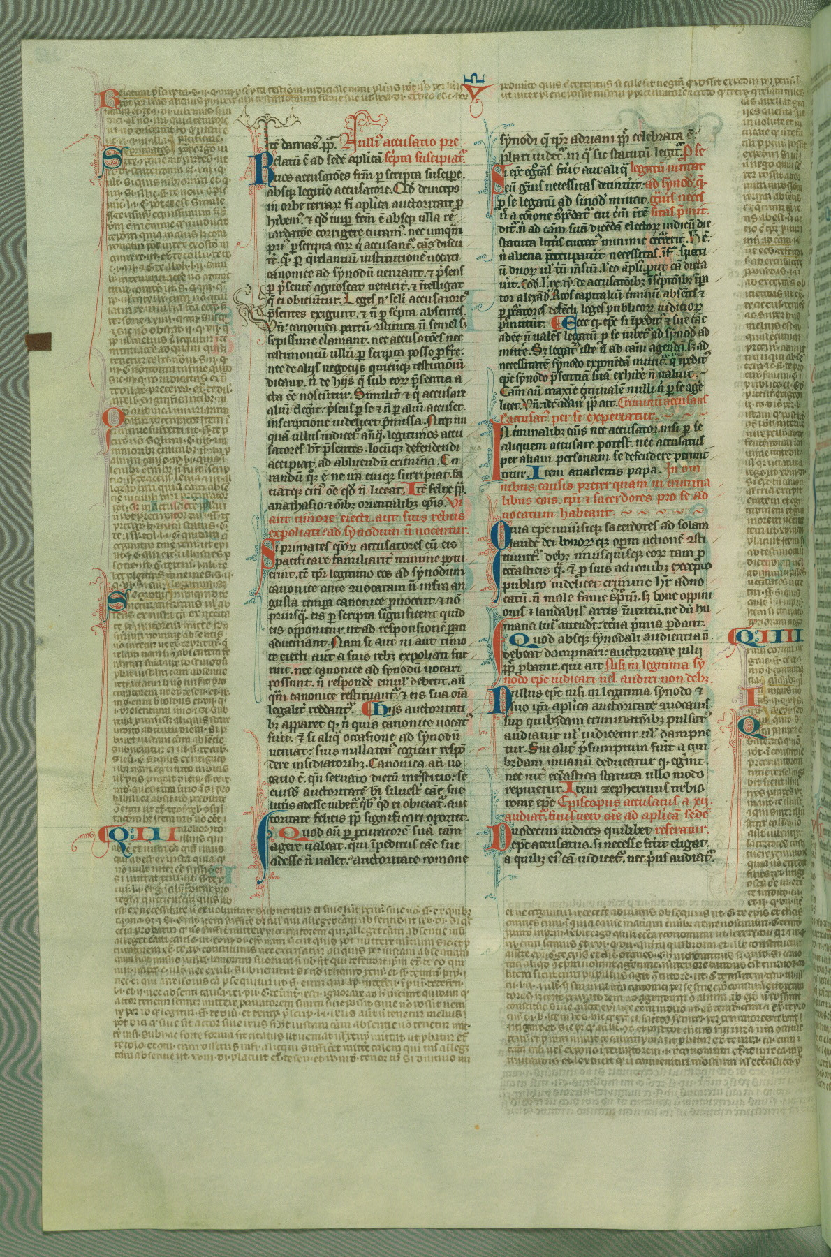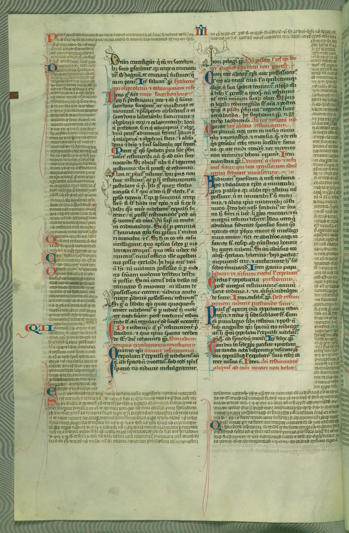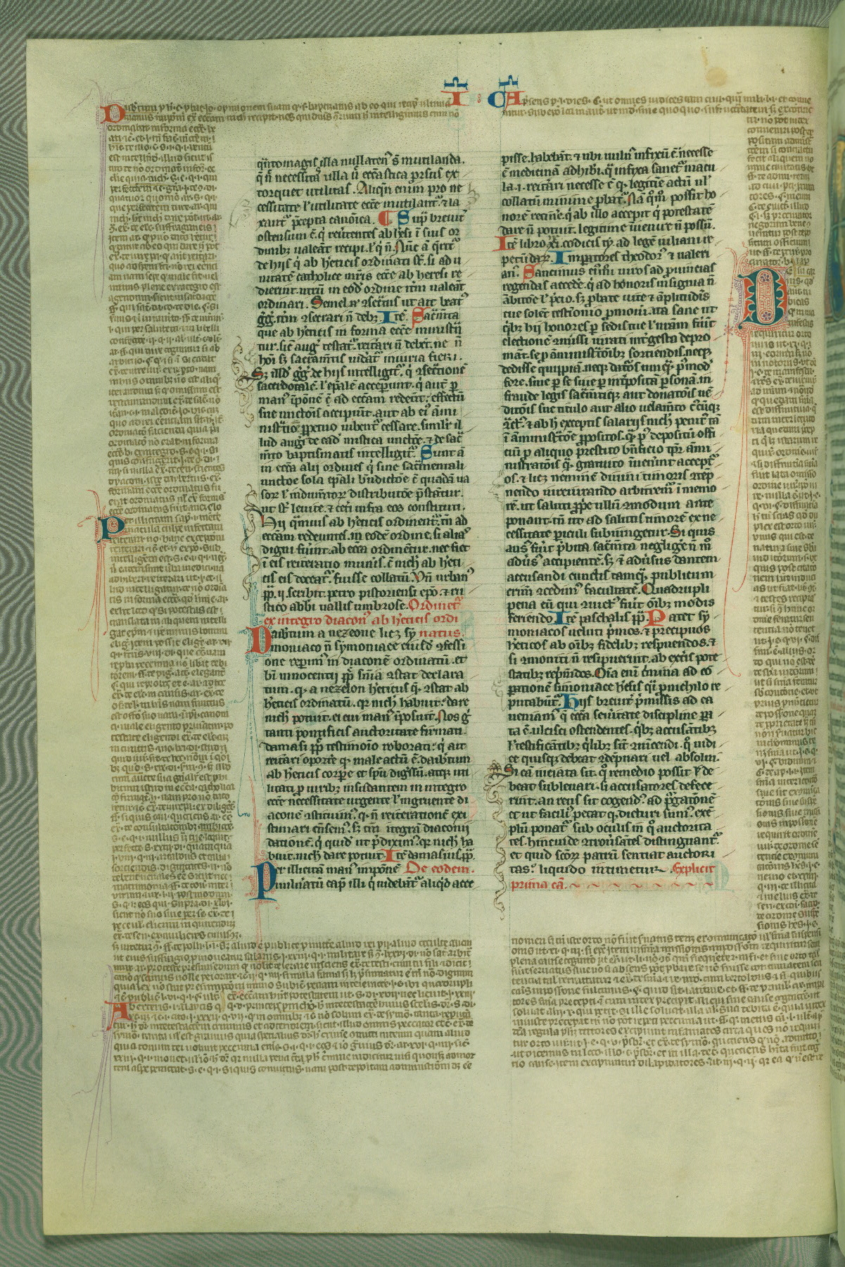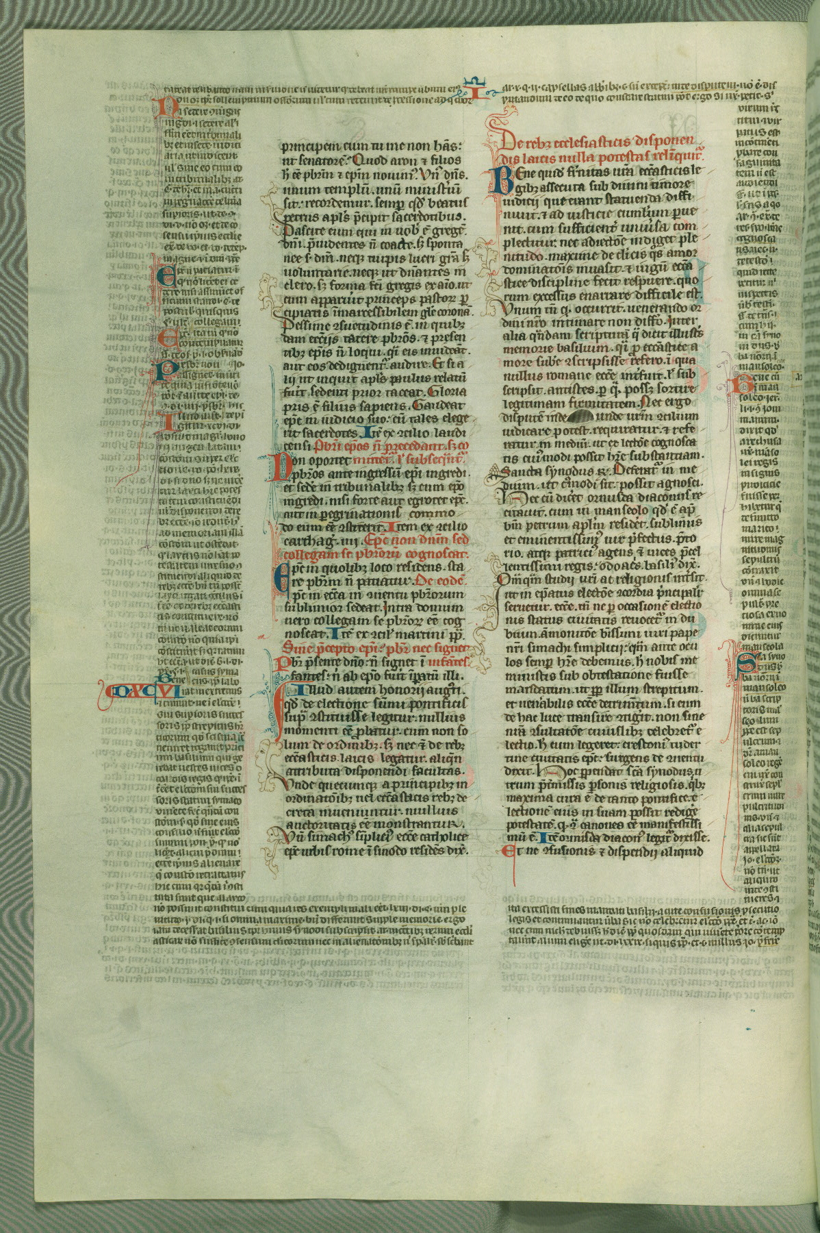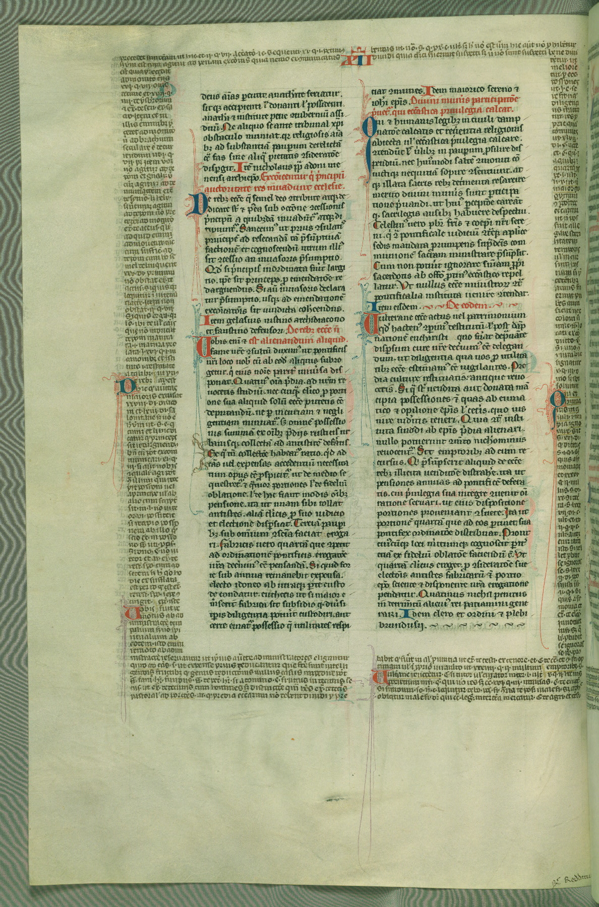 This deluxe version of Gratian's Decretum was created ca. 1280-90, most likely in Hainaut. The lively decoration of the manuscript indicates a marked taste for narrative, and there are thirty-seven historiated initials. The gloss work was completed by Bartholomew of Brescia. At first, Paris would seem to be the most likely place of origin, given that it was the leading center for the study of canon law. However, this particular manuscript exhibits scribal features that suggest its place of origin as being the Cistercian abbey of Cambron in Hainaut. Furthermore, Abbot Baudouin de Bousso, whose tenure at the abbey was from 1283 to 1293, was schooled in theology at the University of Paris, and he would eventually endorse the production of many fine manuscripts while at Cambron. In fact, the catalyst for this endeavor seems to have been the Beaupré Antiphonary (W.759-761), which was was created at Cambron during the 1280s. Stylistic features of W.133 seem to have connections with the Beaupré Antiphonary. For example, Cistercian monks are shown in three extant illuminations throughout three of the antiphonary volumes; these monks are pictured in brown habits similar to the type worn by clerics in W.133. The reliance upon Cistercian precedents for textual and design features associates W.133 with the Cistercian abbey at Cambron. However, more remains to be confirmed by further inspection of the output of the scriptorium at Cambron.