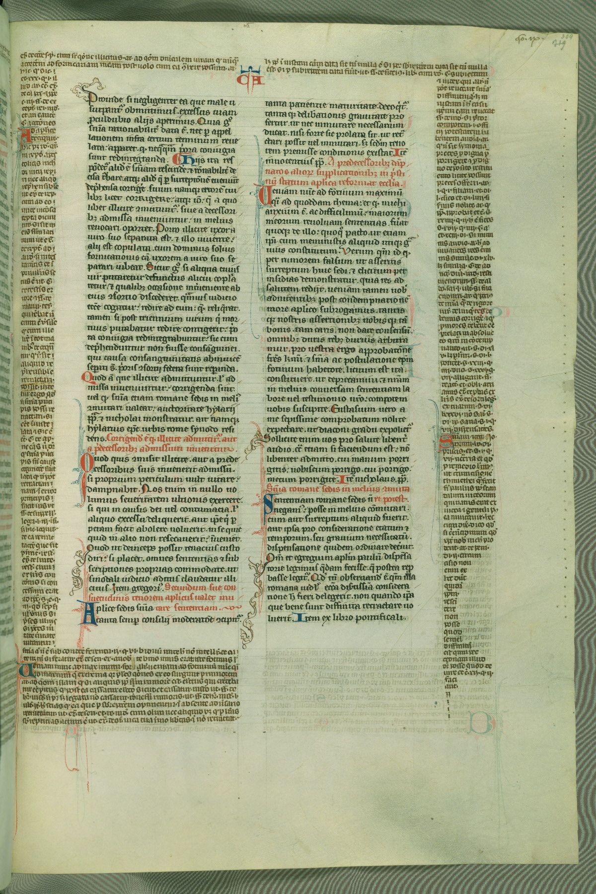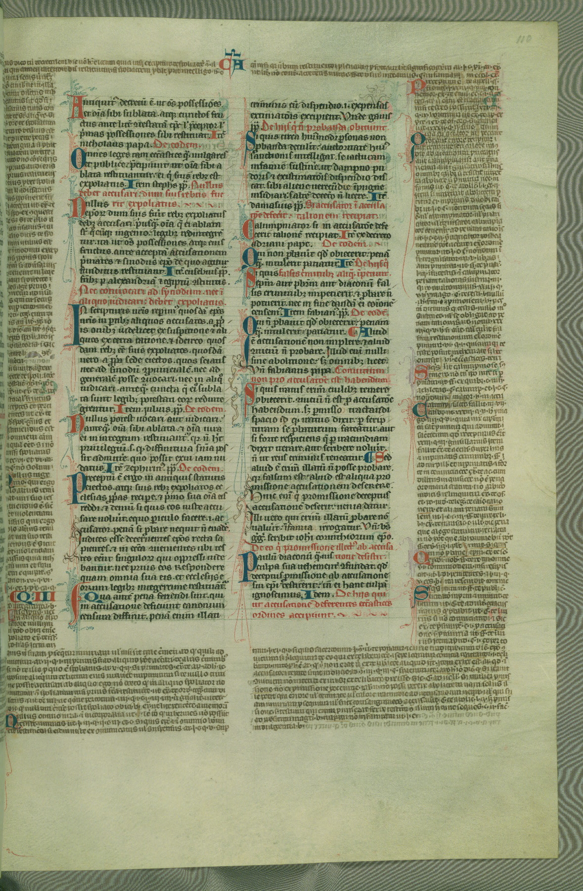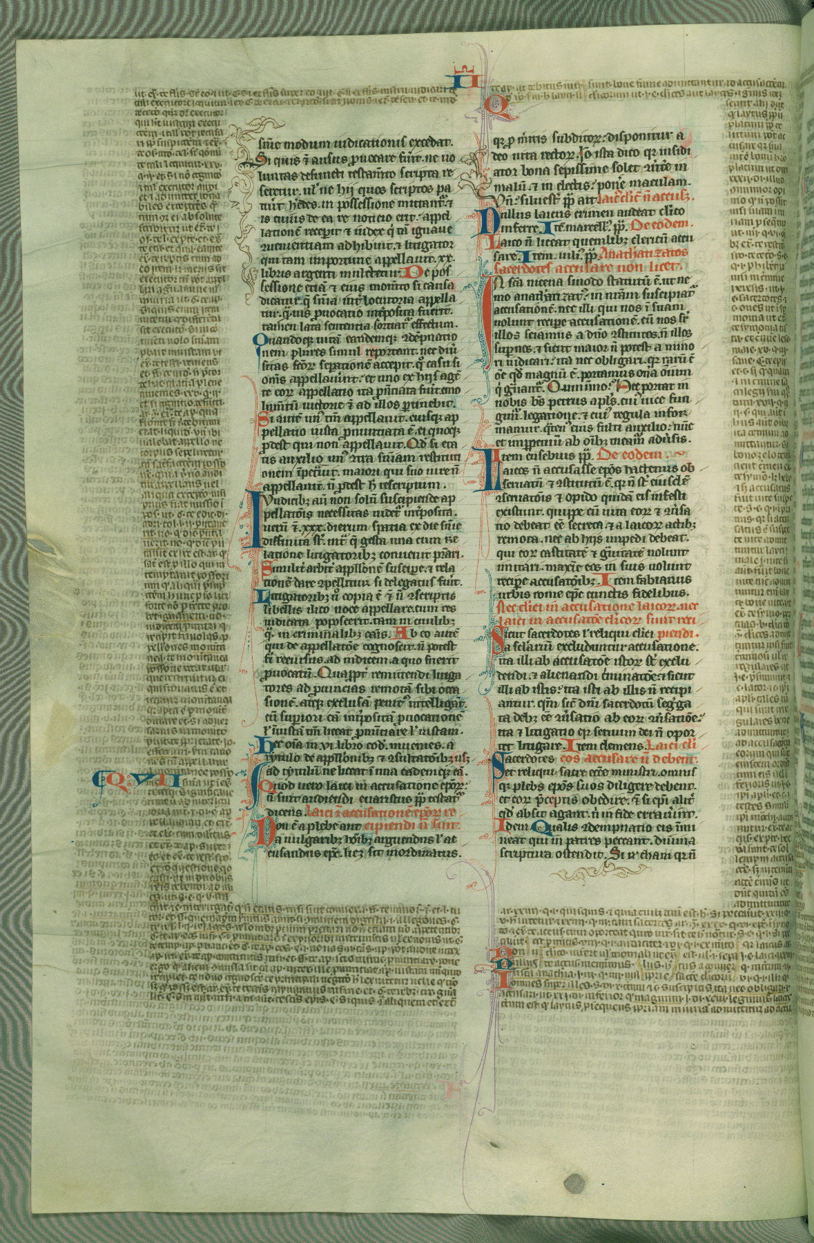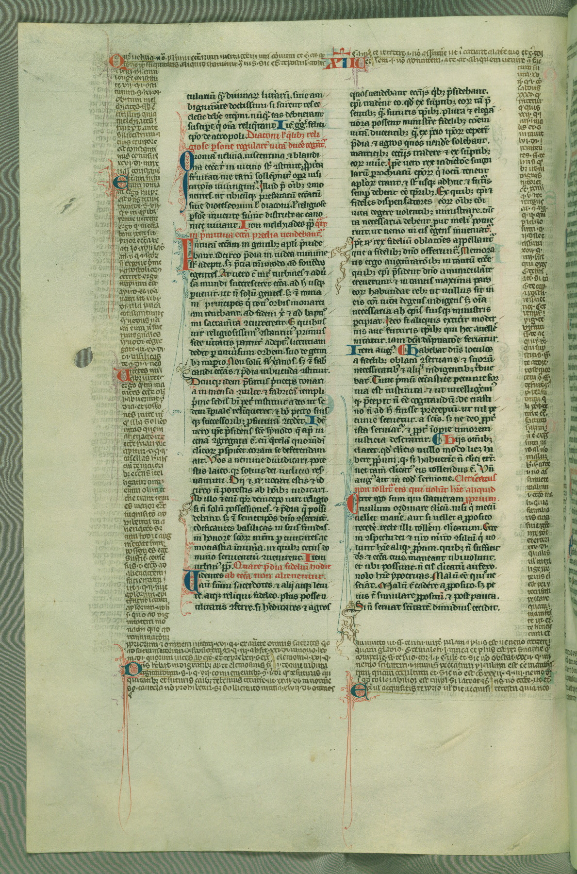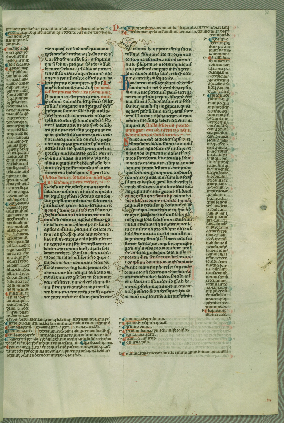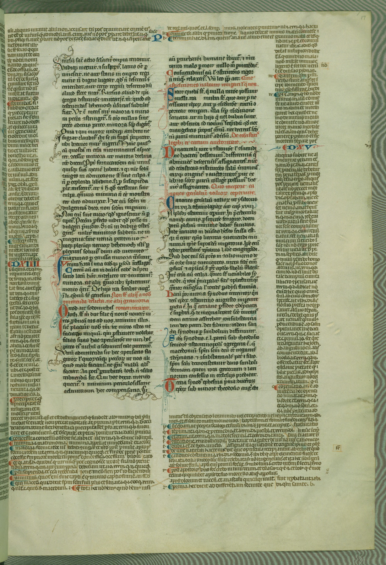 This deluxe version of Gratian's Decretum was created ca. 1280-90, most likely in Hainaut. The lively decoration of the manuscript indicates a marked taste for narrative, and there are thirty-seven historiated initials. The gloss work was completed by Bartholomew of Brescia. At first, Paris would seem to be the most likely place of origin, given that it was the leading center for the study of canon law. However, this particular manuscript exhibits scribal features that suggest its place of origin as being the Cistercian abbey of Cambron in Hainaut. Furthermore, Abbot Baudouin de Bousso, whose tenure at the abbey was from 1283 to 1293, was schooled in theology at the University of Paris, and he would eventually endorse the production of many fine manuscripts while at Cambron. In fact, the catalyst for this endeavor seems to have been the Beaupré Antiphonary (W.759-761), which was was created at Cambron during the 1280s. Stylistic features of W.133 seem to have connections with the Beaupré Antiphonary. For example, Cistercian monks are shown in three extant illuminations throughout three of the antiphonary volumes; these monks are pictured in brown habits similar to the type worn by clerics in W.133. The reliance upon Cistercian precedents for textual and design features associates W.133 with the Cistercian abbey at Cambron. However, more remains to be confirmed by further inspection of the output of the scriptorium at Cambron.