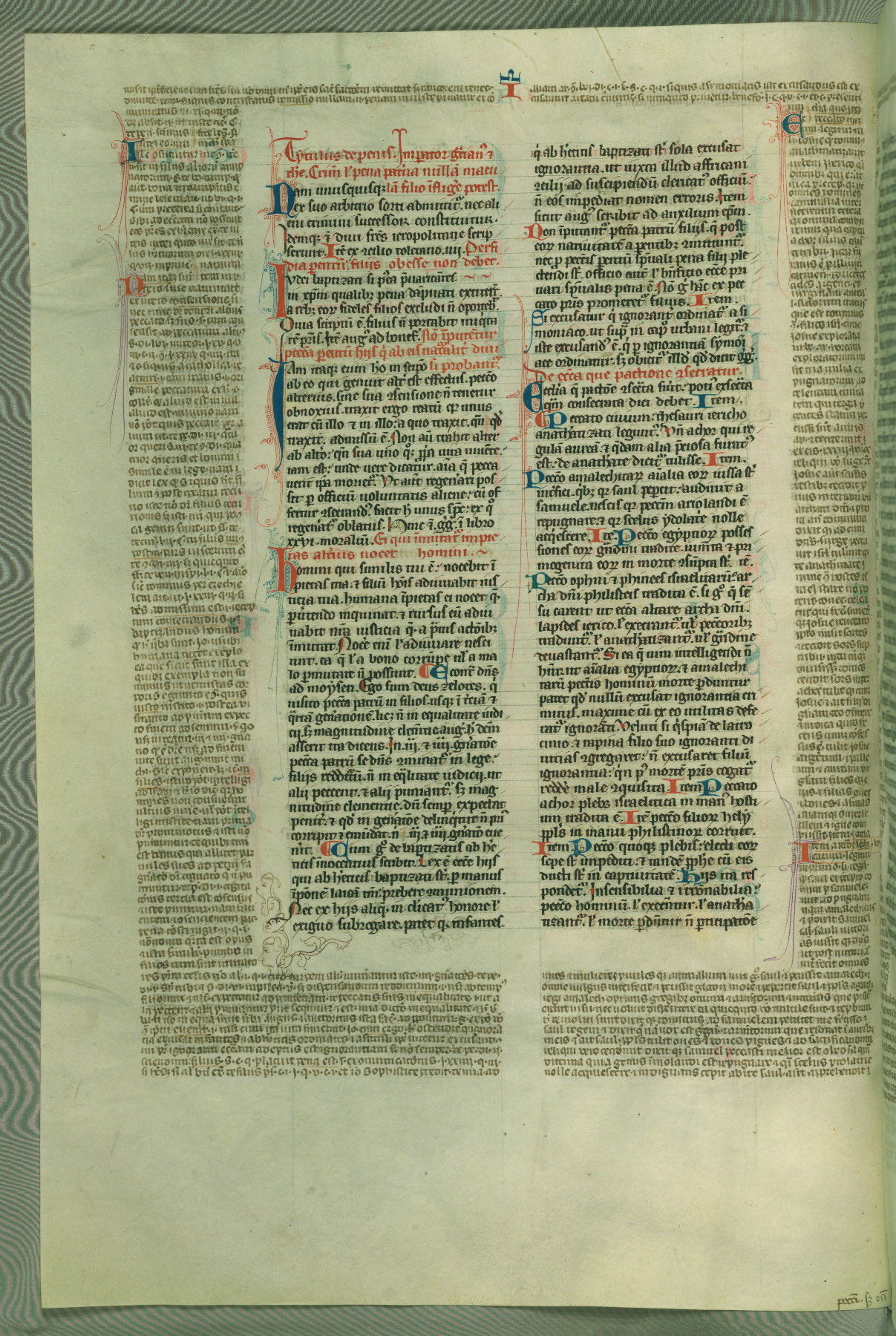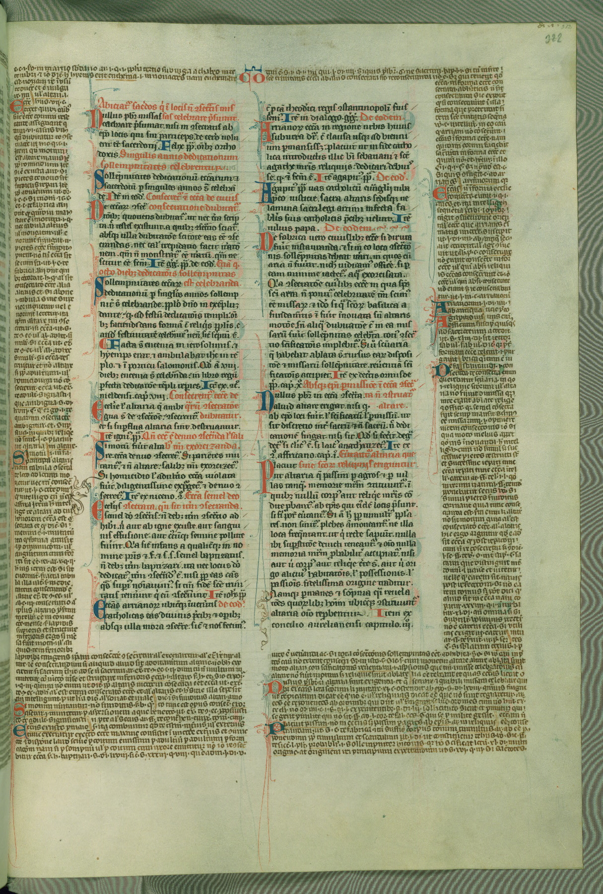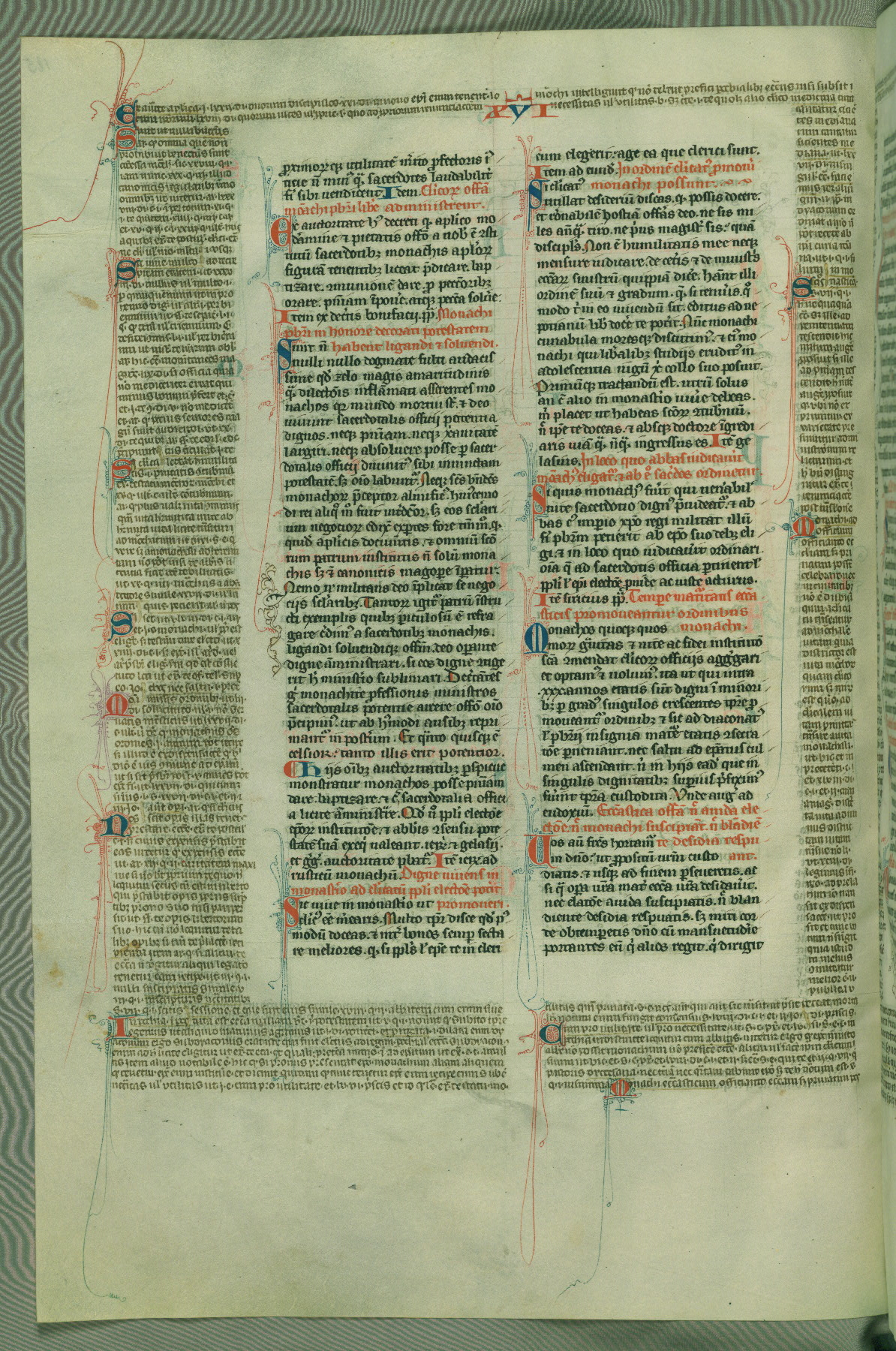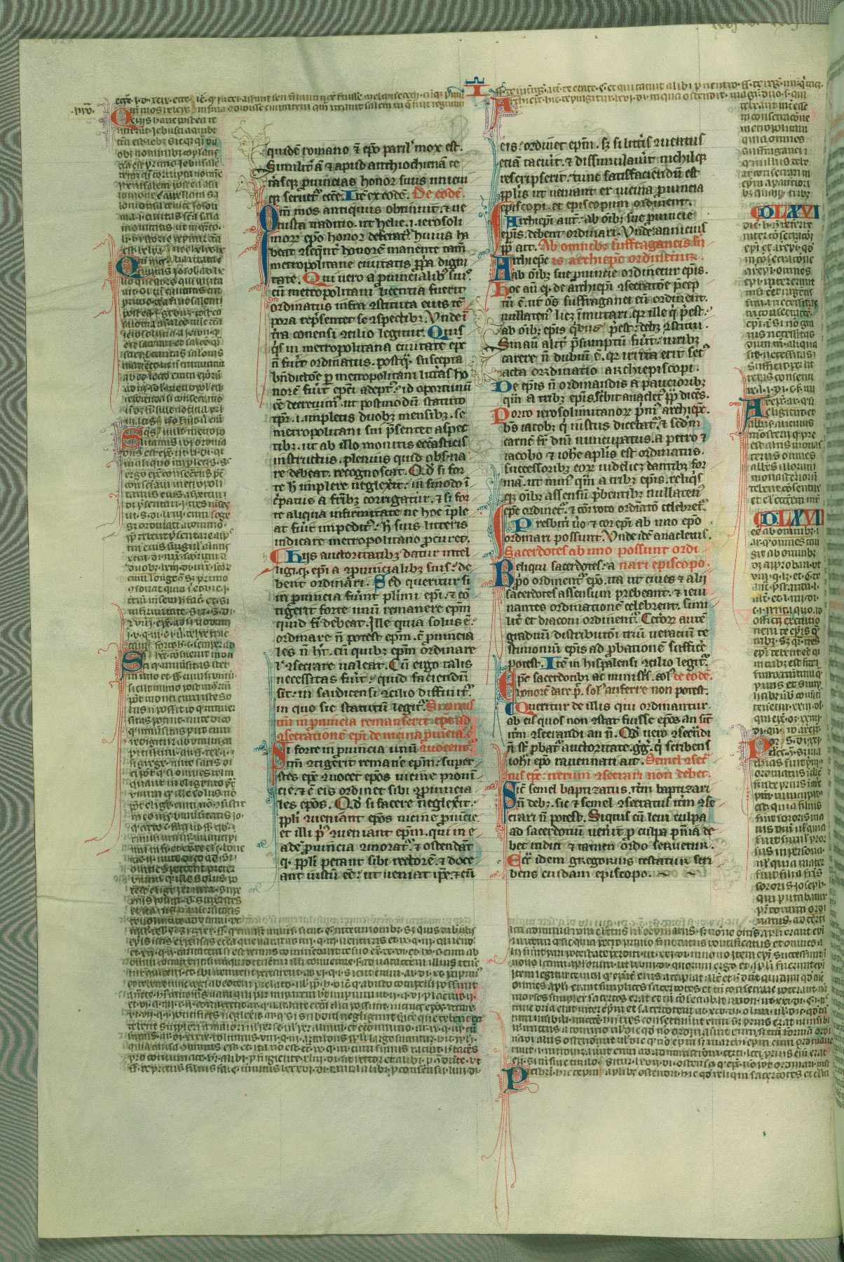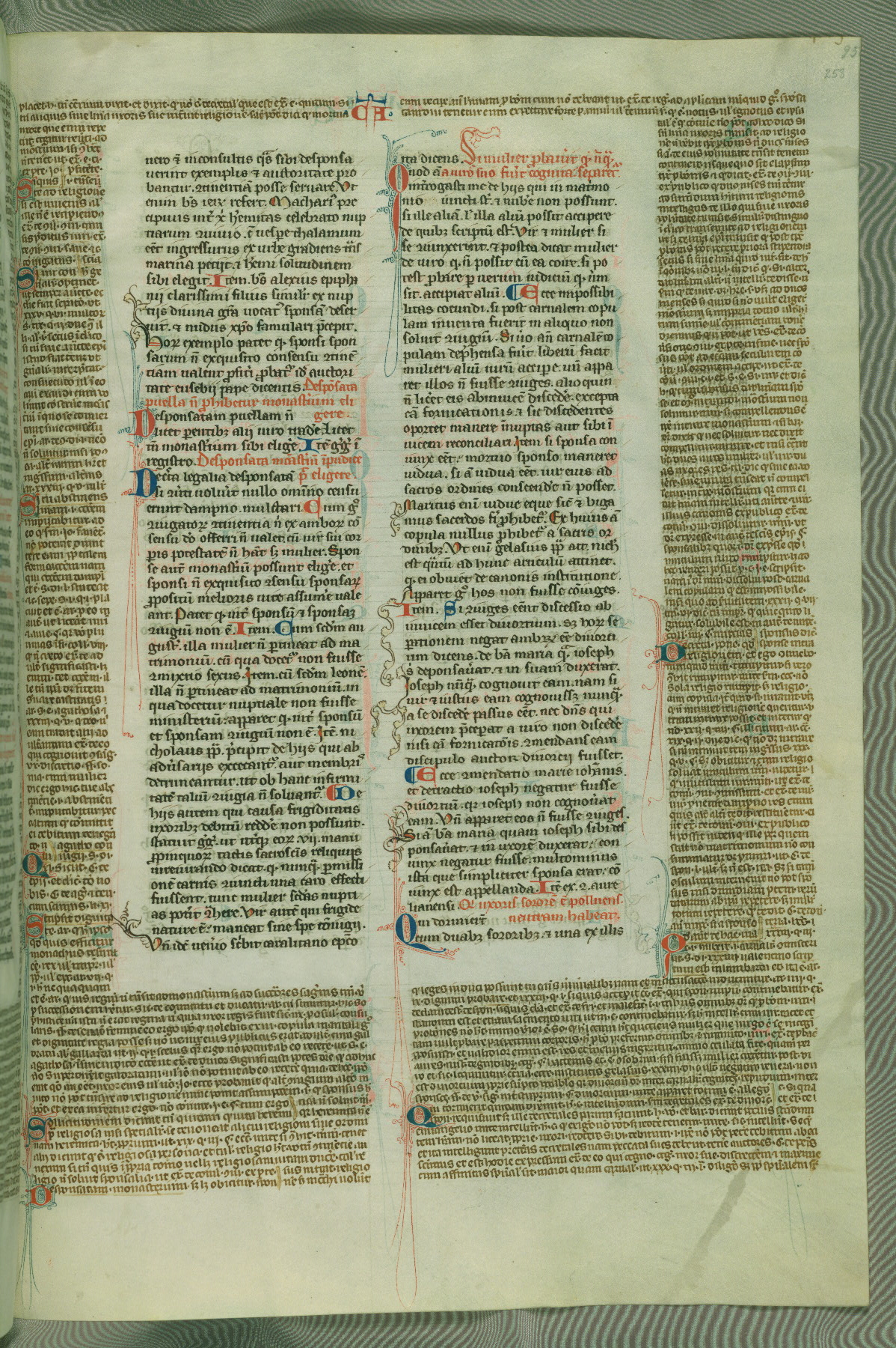 This deluxe version of Gratian's Decretum was created ca. 1280-90, most likely in Hainaut. The lively decoration of the manuscript indicates a marked taste for narrative, and there are thirty-seven historiated initials. The gloss work was completed by Bartholomew of Brescia. At first, Paris would seem to be the most likely place of origin, given that it was the leading center for the study of canon law. However, this particular manuscript exhibits scribal features that suggest its place of origin as being the Cistercian abbey of Cambron in Hainaut. Furthermore, Abbot Baudouin de Bousso, whose tenure at the abbey was from 1283 to 1293, was schooled in theology at the University of Paris, and he would eventually endorse the production of many fine manuscripts while at Cambron. In fact, the catalyst for this endeavor seems to have been the Beaupré Antiphonary (W.759-761), which was was created at Cambron during the 1280s. Stylistic features of W.133 seem to have connections with the Beaupré Antiphonary. For example, Cistercian monks are shown in three extant illuminations throughout three of the antiphonary volumes; these monks are pictured in brown habits similar to the type worn by clerics in W.133. The reliance upon Cistercian precedents for textual and design features associates W.133 with the Cistercian abbey at Cambron. However, more remains to be confirmed by further inspection of the output of the scriptorium at Cambron.
