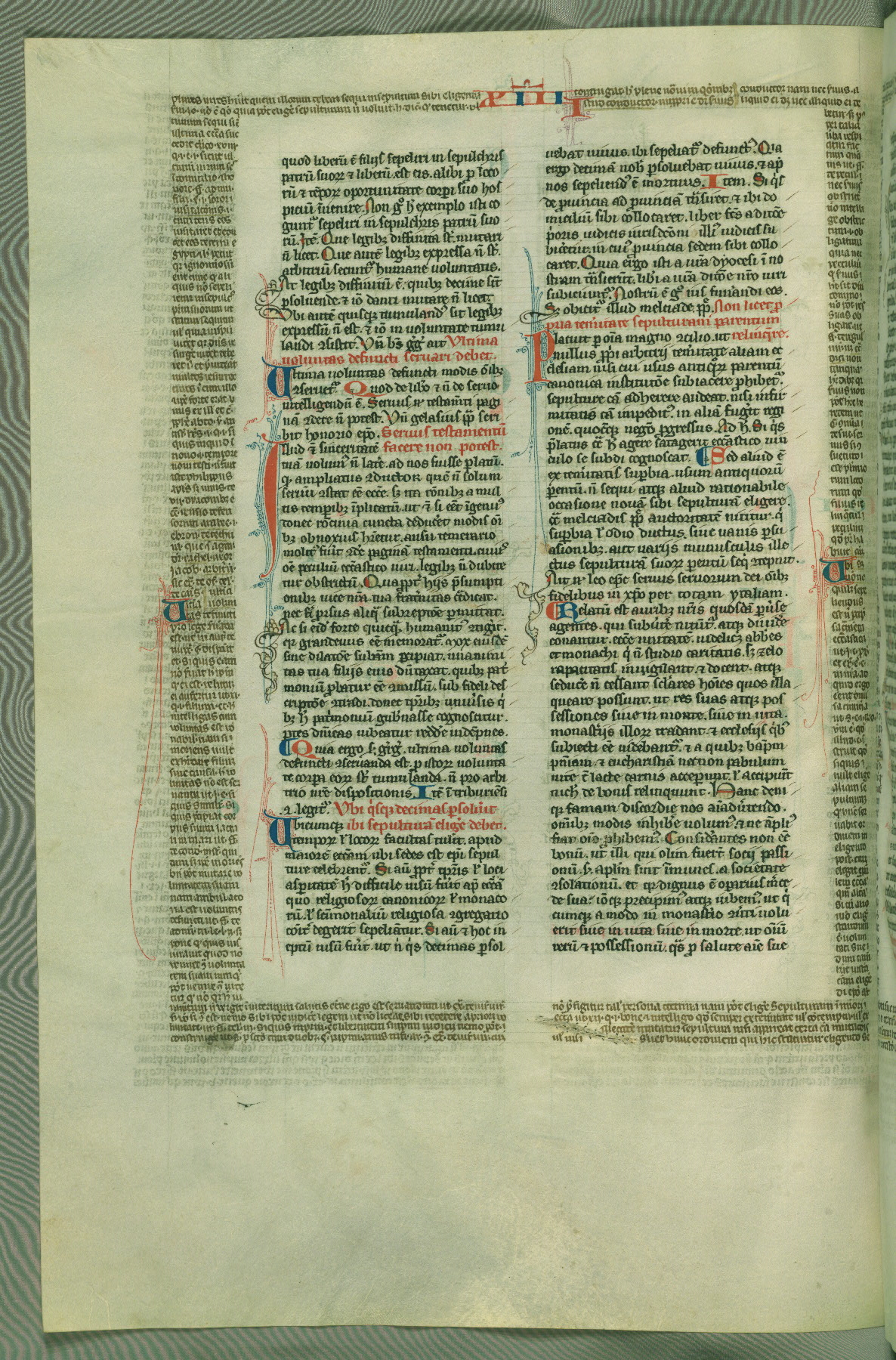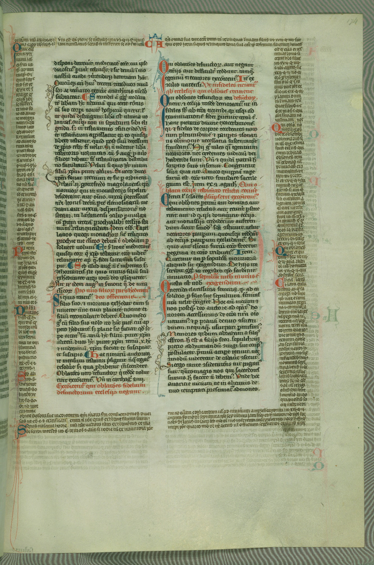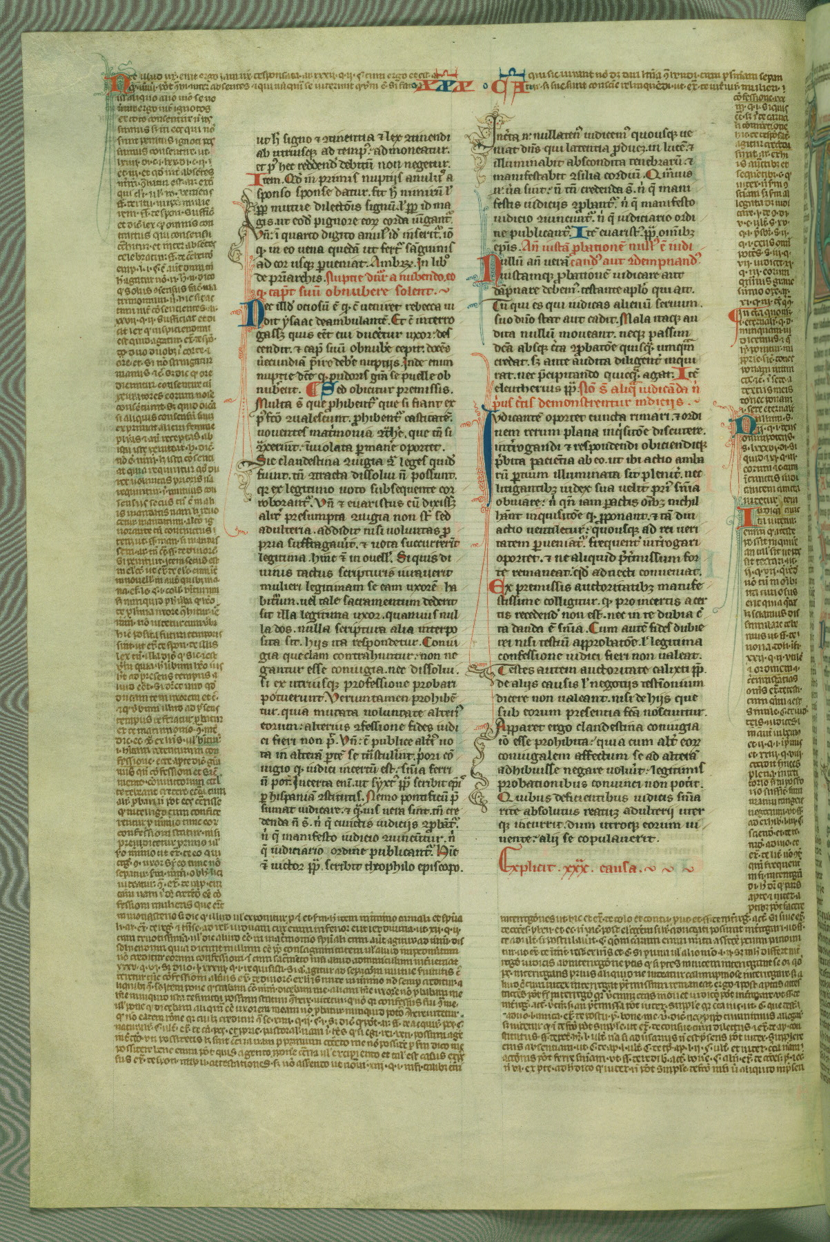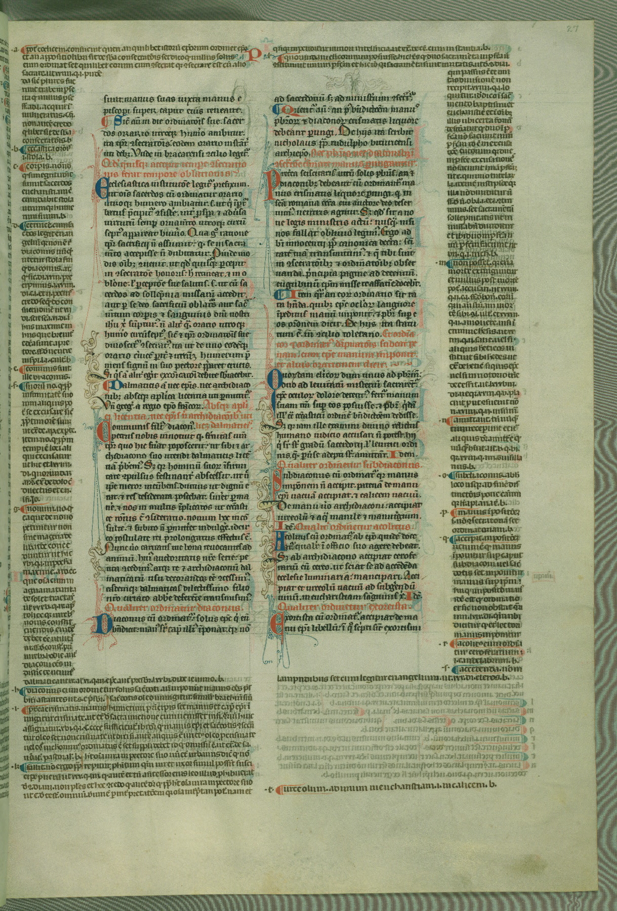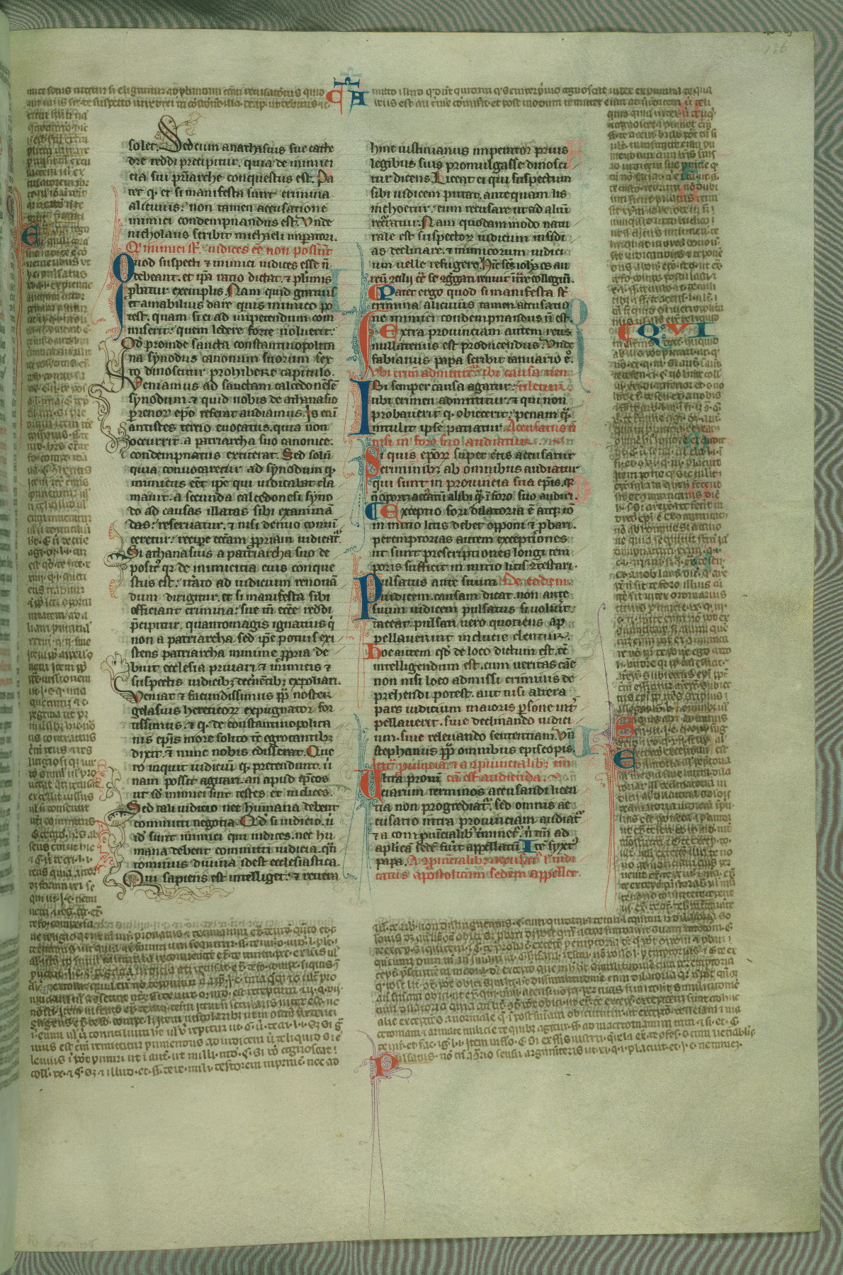 This deluxe version of Gratian's Decretum was created ca. 1280-90, most likely in Hainaut. The lively decoration of the manuscript indicates a marked taste for narrative, and there are thirty-seven historiated initials. The gloss work was completed by Bartholomew of Brescia. At first, Paris would seem to be the most likely place of origin, given that it was the leading center for the study of canon law. However, this particular manuscript exhibits scribal features that suggest its place of origin as being the Cistercian abbey of Cambron in Hainaut. Furthermore, Abbot Baudouin de Bousso, whose tenure at the abbey was from 1283 to 1293, was schooled in theology at the University of Paris, and he would eventually endorse the production of many fine manuscripts while at Cambron. In fact, the catalyst for this endeavor seems to have been the Beaupré Antiphonary (W.759-761), which was was created at Cambron during the 1280s. Stylistic features of W.133 seem to have connections with the Beaupré Antiphonary. For example, Cistercian monks are shown in three extant illuminations throughout three of the antiphonary volumes; these monks are pictured in brown habits similar to the type worn by clerics in W.133. The reliance upon Cistercian precedents for textual and design features associates W.133 with the Cistercian abbey at Cambron. However, more remains to be confirmed by further inspection of the output of the scriptorium at Cambron.
