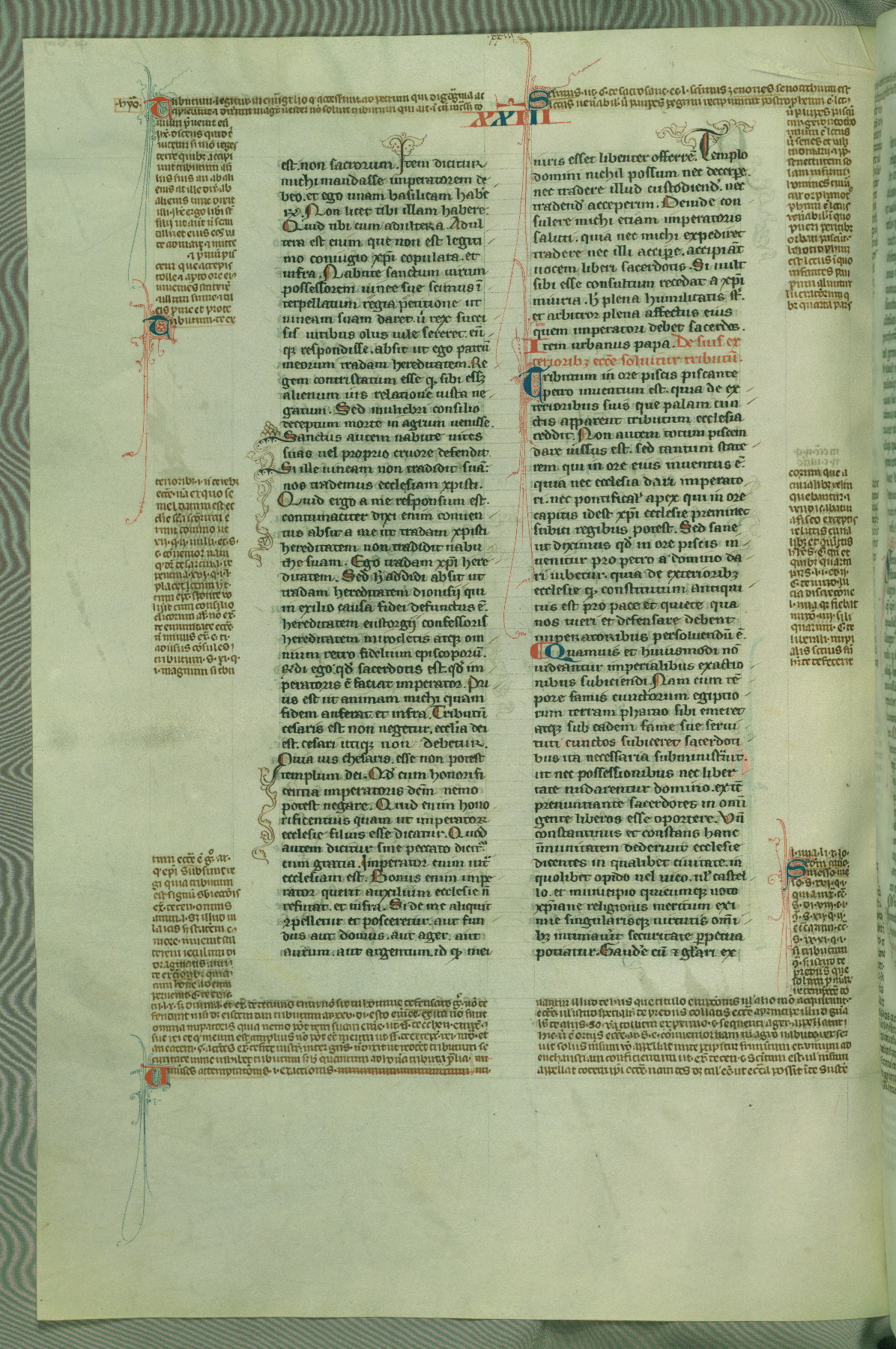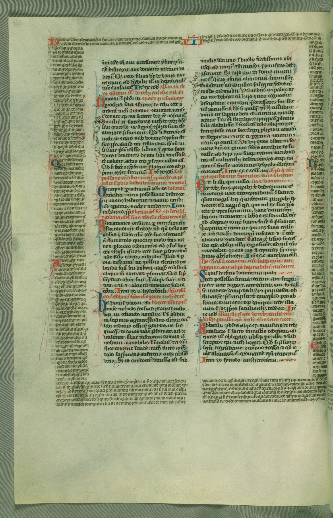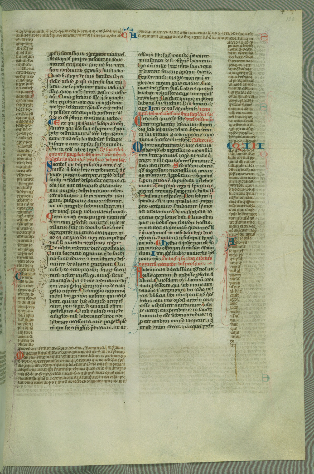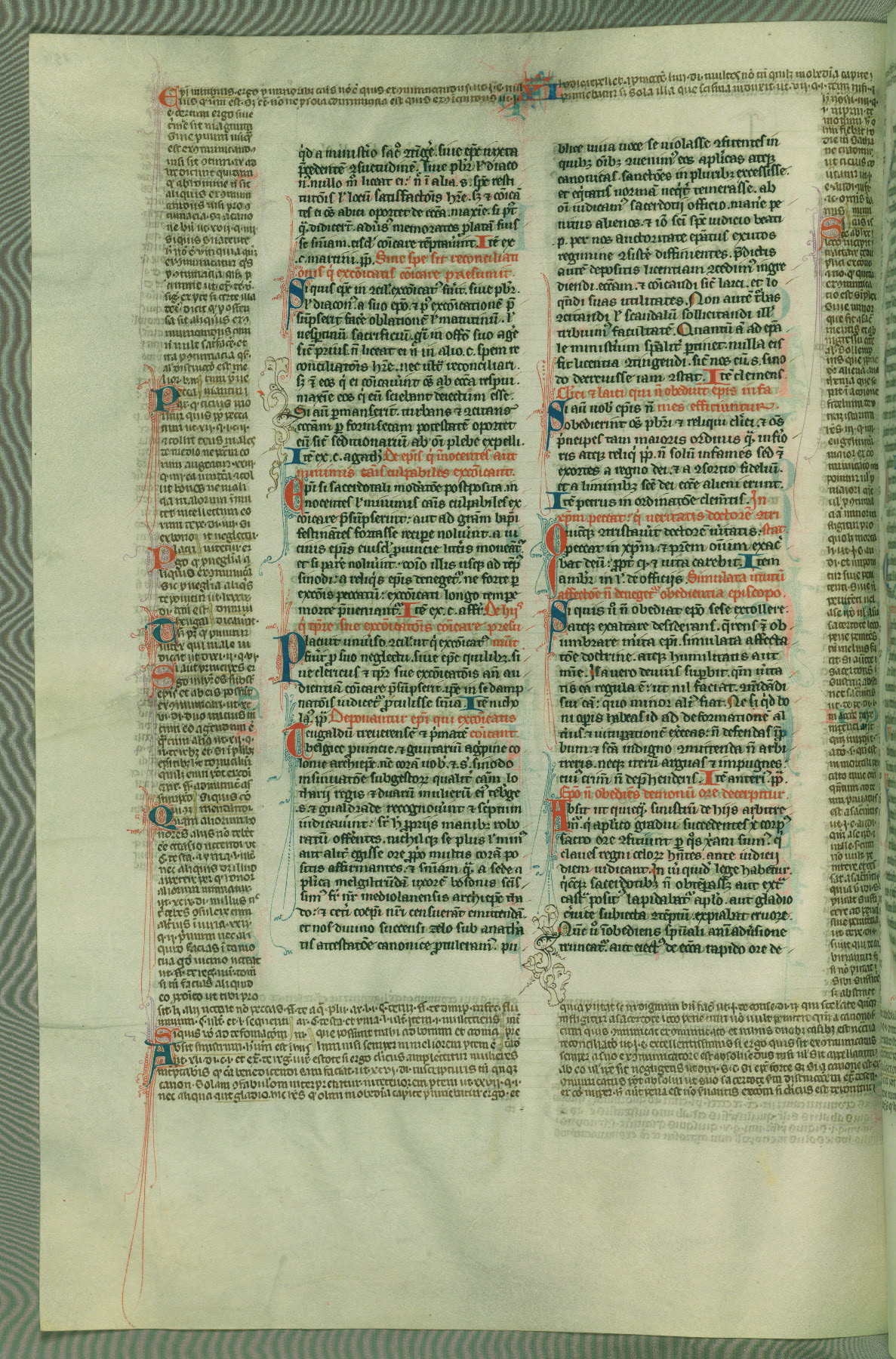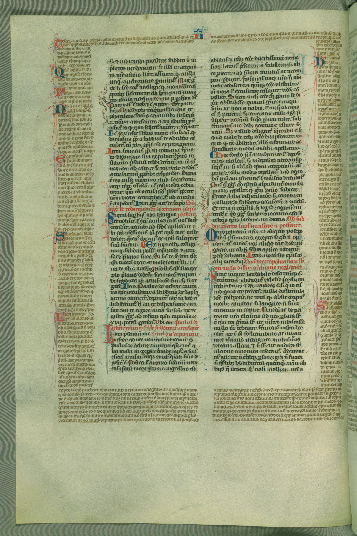 This deluxe version of Gratian's Decretum was created ca. 1280-90, most likely in Hainaut. The lively decoration of the manuscript indicates a marked taste for narrative, and there are thirty-seven historiated initials. The gloss work was completed by Bartholomew of Brescia. At first, Paris would seem to be the most likely place of origin, given that it was the leading center for the study of canon law. However, this particular manuscript exhibits scribal features that suggest its place of origin as being the Cistercian abbey of Cambron in Hainaut. Furthermore, Abbot Baudouin de Bousso, whose tenure at the abbey was from 1283 to 1293, was schooled in theology at the University of Paris, and he would eventually endorse the production of many fine manuscripts while at Cambron. In fact, the catalyst for this endeavor seems to have been the Beaupré Antiphonary (W.759-761), which was was created at Cambron during the 1280s. Stylistic features of W.133 seem to have connections with the Beaupré Antiphonary. For example, Cistercian monks are shown in three extant illuminations throughout three of the antiphonary volumes; these monks are pictured in brown habits similar to the type worn by clerics in W.133. The reliance upon Cistercian precedents for textual and design features associates W.133 with the Cistercian abbey at Cambron. However, more remains to be confirmed by further inspection of the output of the scriptorium at Cambron.