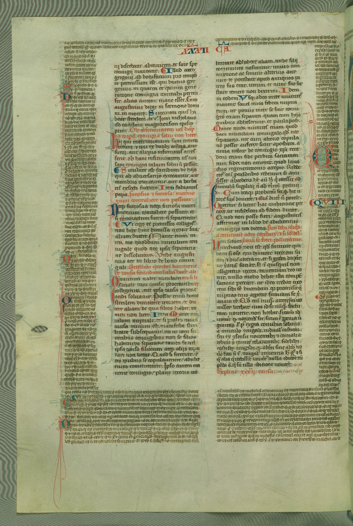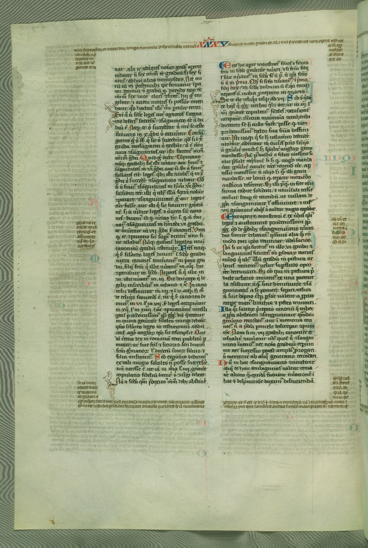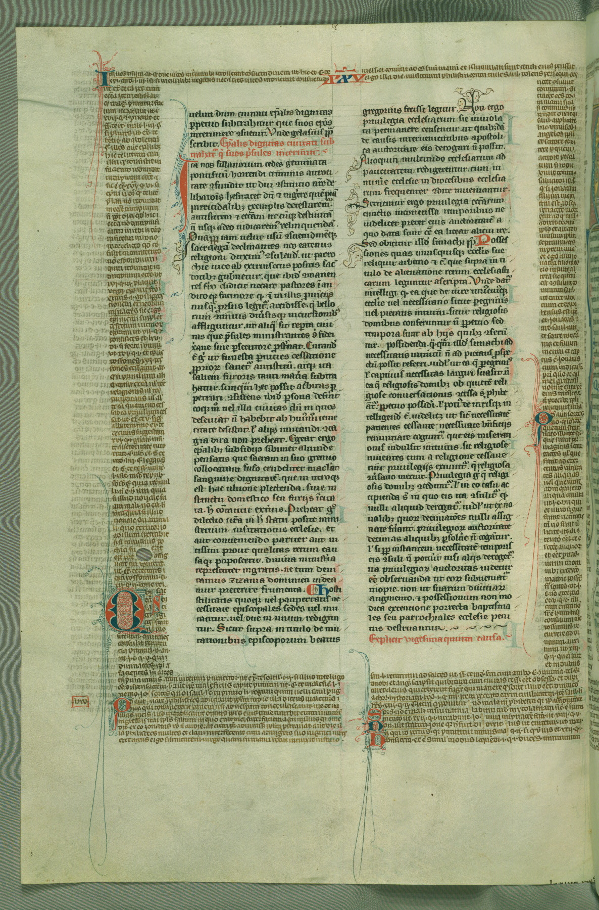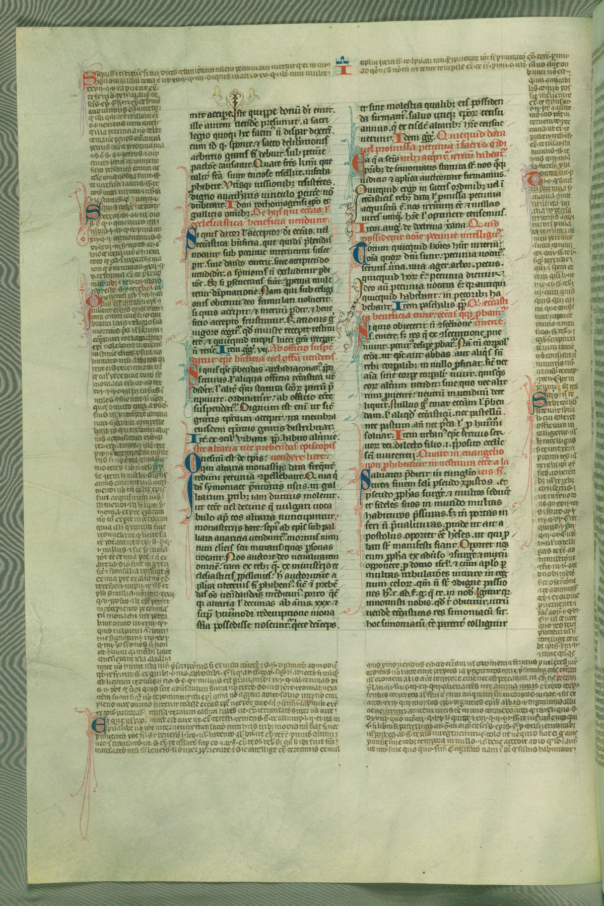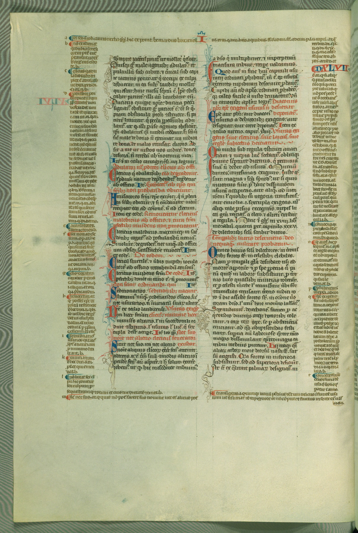 This deluxe version of Gratian's Decretum was created ca. 1280-90, most likely in Hainaut. The lively decoration of the manuscript indicates a marked taste for narrative, and there are thirty-seven historiated initials. The gloss work was completed by Bartholomew of Brescia. At first, Paris would seem to be the most likely place of origin, given that it was the leading center for the study of canon law. However, this particular manuscript exhibits scribal features that suggest its place of origin as being the Cistercian abbey of Cambron in Hainaut. Furthermore, Abbot Baudouin de Bousso, whose tenure at the abbey was from 1283 to 1293, was schooled in theology at the University of Paris, and he would eventually endorse the production of many fine manuscripts while at Cambron. In fact, the catalyst for this endeavor seems to have been the Beaupré Antiphonary (W.759-761), which was was created at Cambron during the 1280s. Stylistic features of W.133 seem to have connections with the Beaupré Antiphonary. For example, Cistercian monks are shown in three extant illuminations throughout three of the antiphonary volumes; these monks are pictured in brown habits similar to the type worn by clerics in W.133. The reliance upon Cistercian precedents for textual and design features associates W.133 with the Cistercian abbey at Cambron. However, more remains to be confirmed by further inspection of the output of the scriptorium at Cambron.