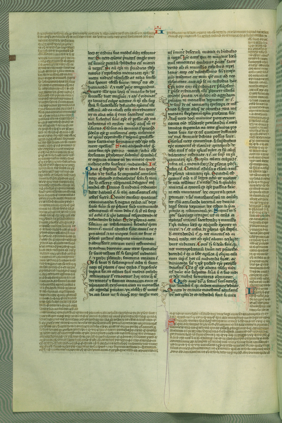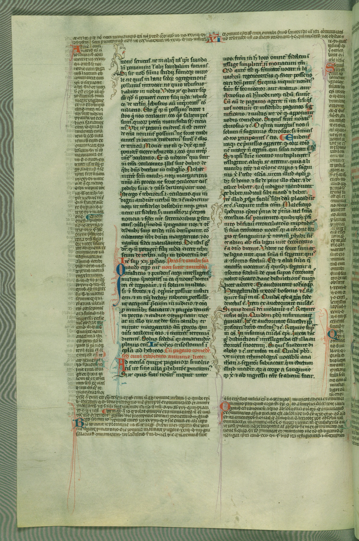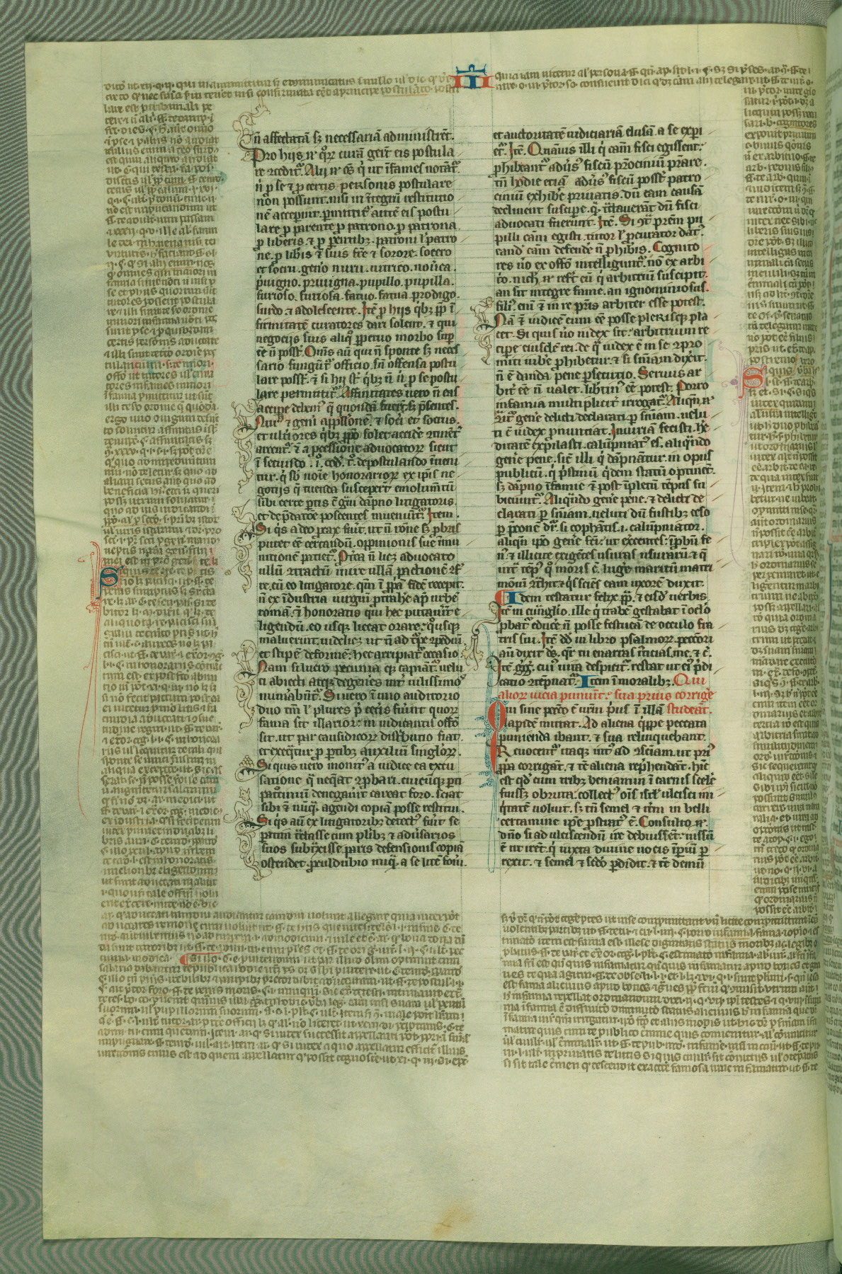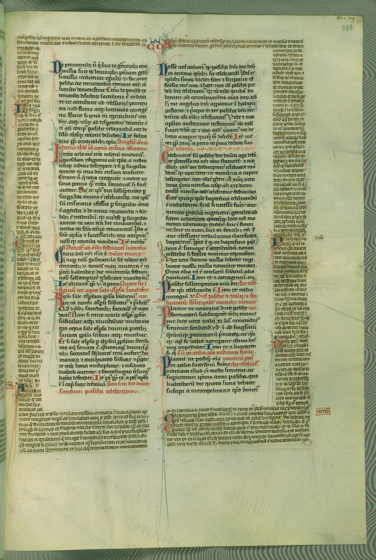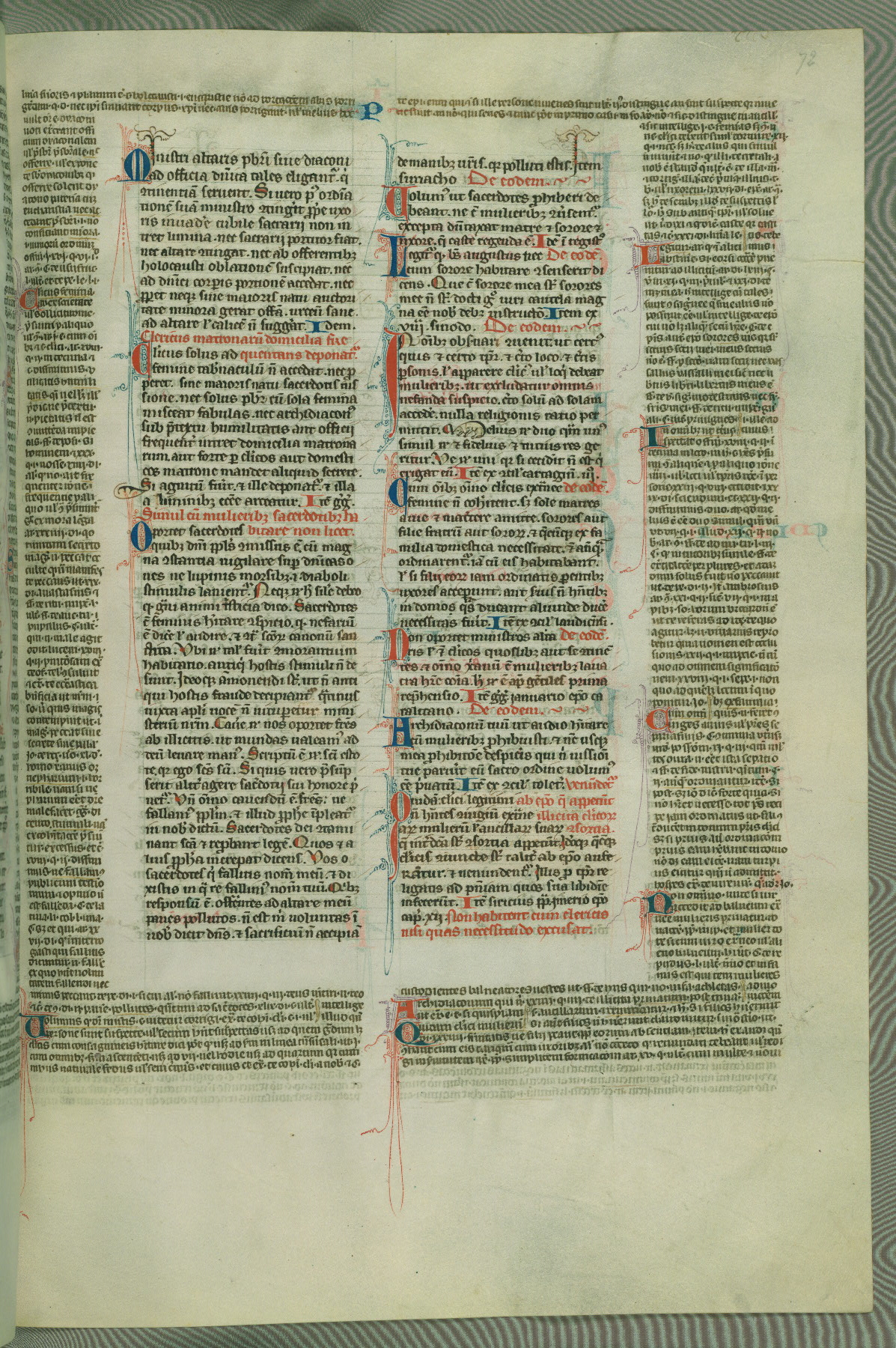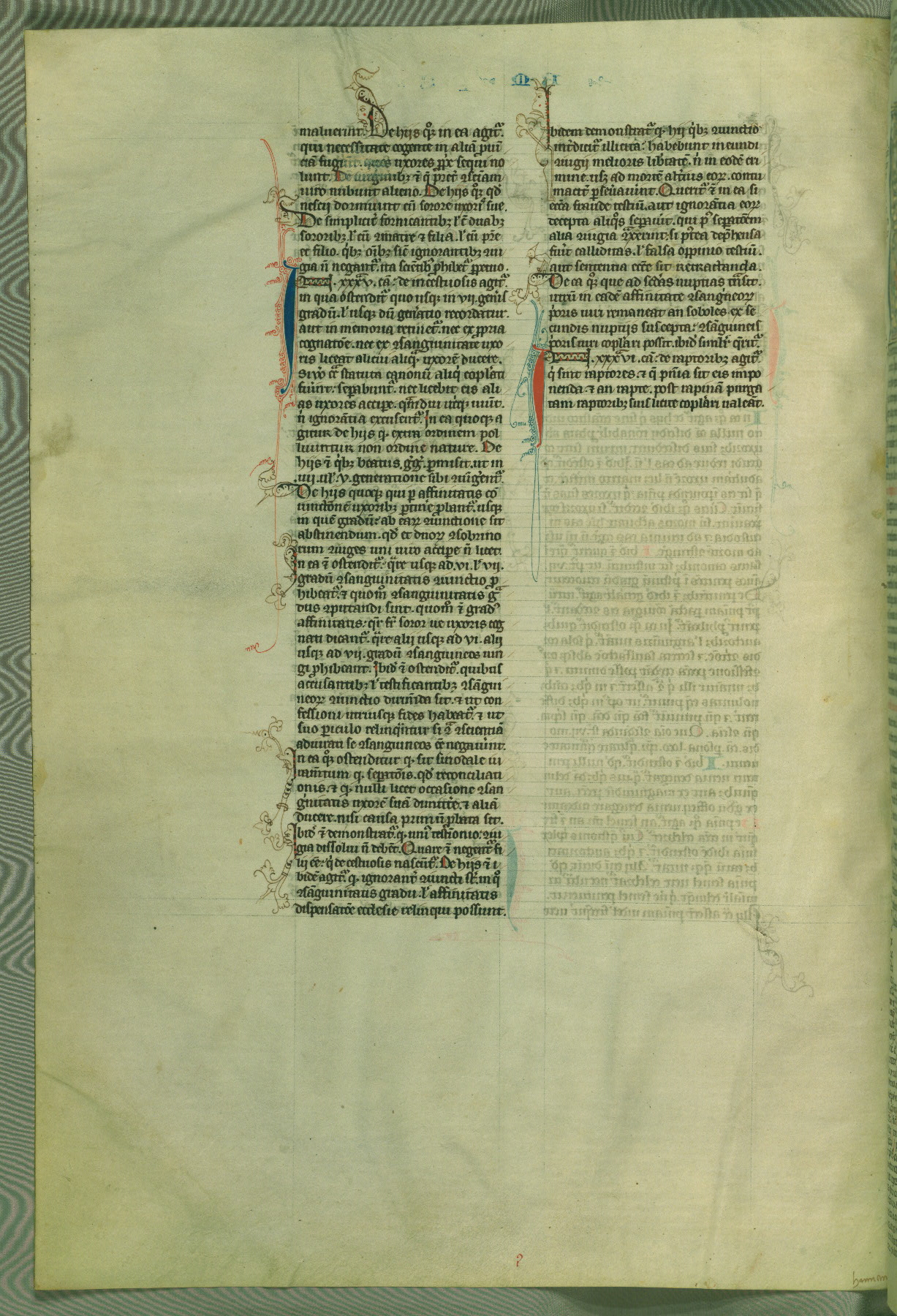 This deluxe version of Gratian's Decretum was created ca. 1280-90, most likely in Hainaut. The lively decoration of the manuscript indicates a marked taste for narrative, and there are thirty-seven historiated initials. The gloss work was completed by Bartholomew of Brescia. At first, Paris would seem to be the most likely place of origin, given that it was the leading center for the study of canon law. However, this particular manuscript exhibits scribal features that suggest its place of origin as being the Cistercian abbey of Cambron in Hainaut. Furthermore, Abbot Baudouin de Bousso, whose tenure at the abbey was from 1283 to 1293, was schooled in theology at the University of Paris, and he would eventually endorse the production of many fine manuscripts while at Cambron. In fact, the catalyst for this endeavor seems to have been the Beaupré Antiphonary (W.759-761), which was was created at Cambron during the 1280s. Stylistic features of W.133 seem to have connections with the Beaupré Antiphonary. For example, Cistercian monks are shown in three extant illuminations throughout three of the antiphonary volumes; these monks are pictured in brown habits similar to the type worn by clerics in W.133. The reliance upon Cistercian precedents for textual and design features associates W.133 with the Cistercian abbey at Cambron. However, more remains to be confirmed by further inspection of the output of the scriptorium at Cambron.