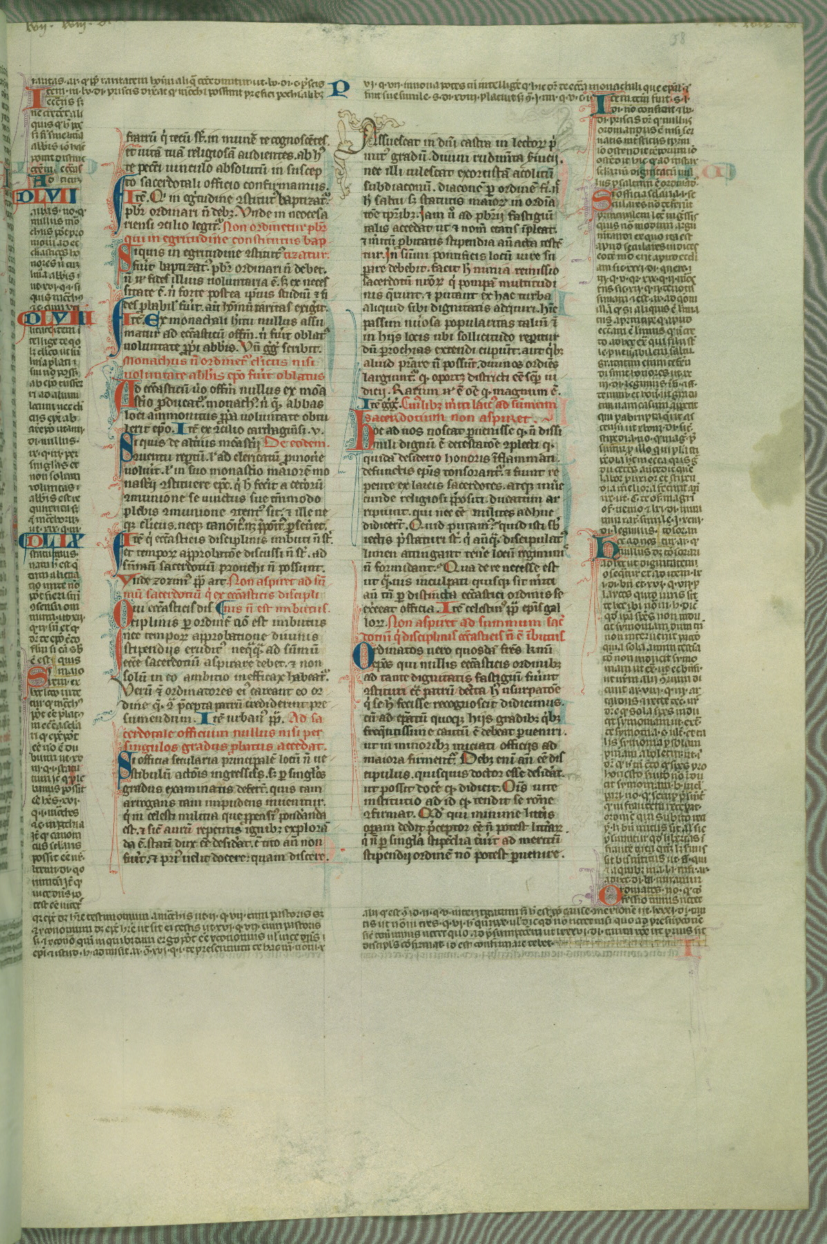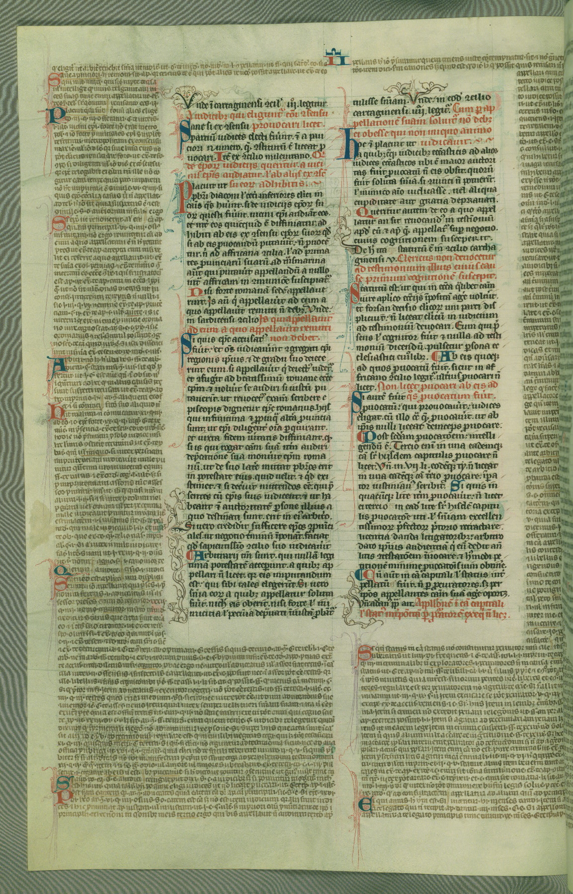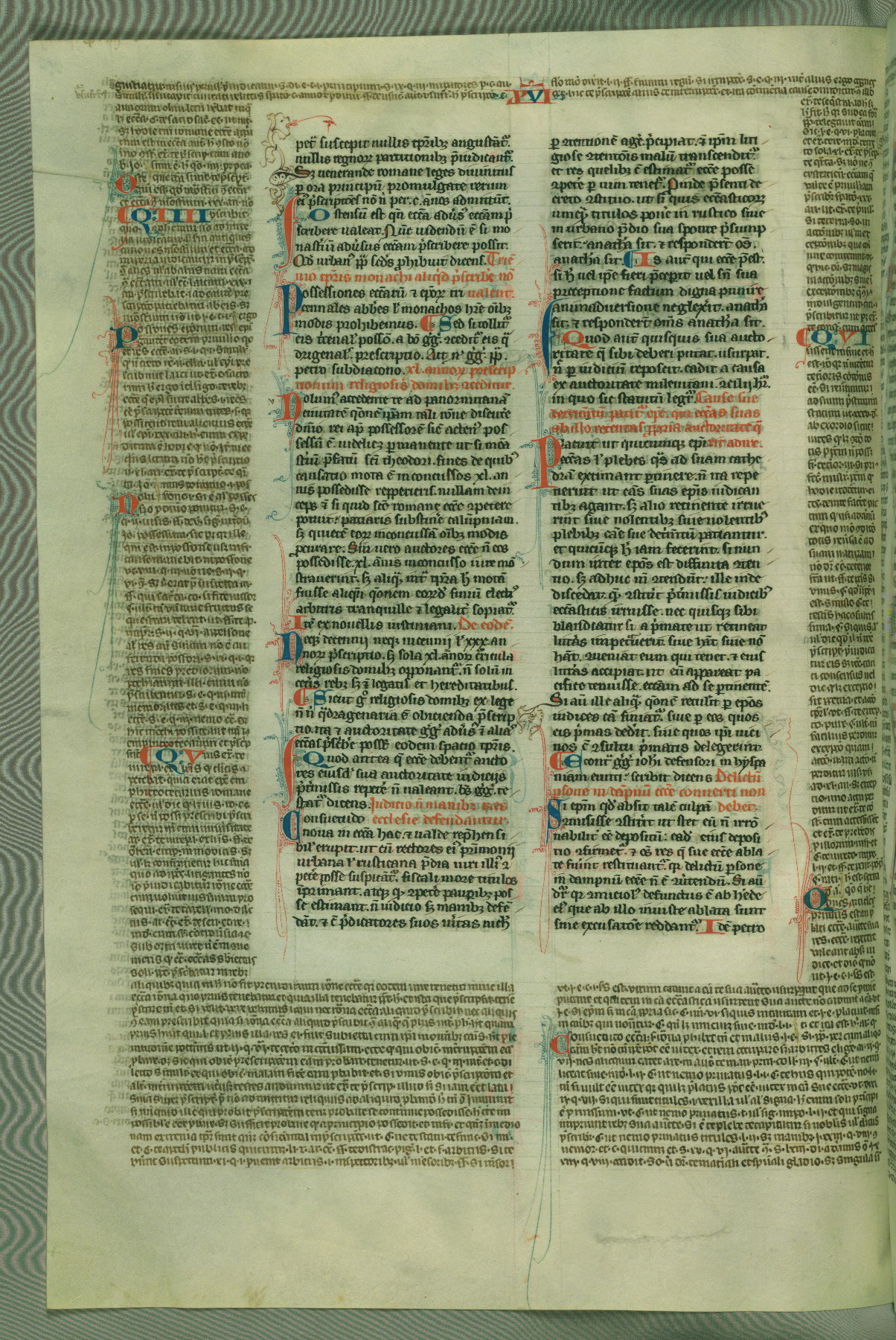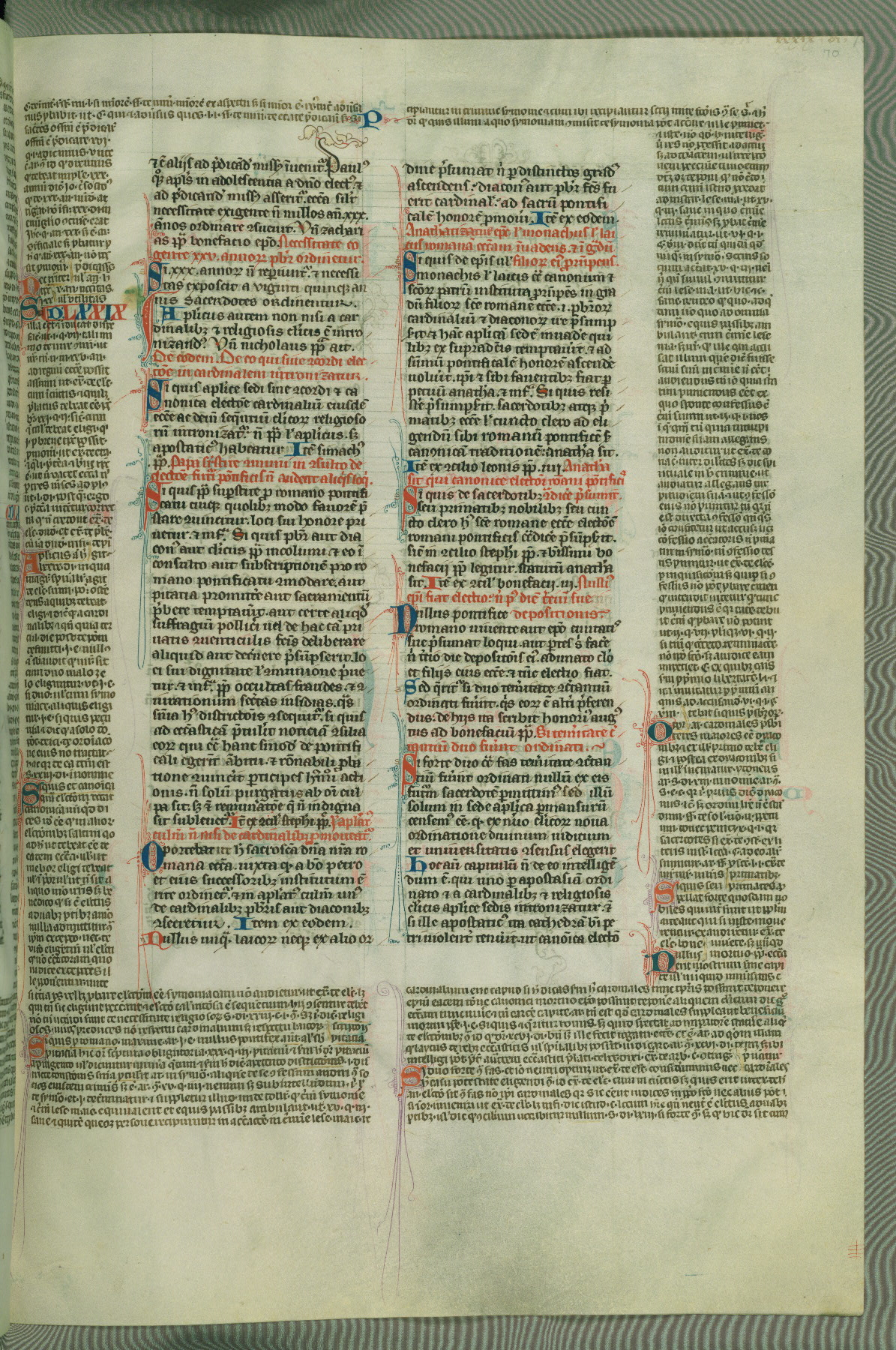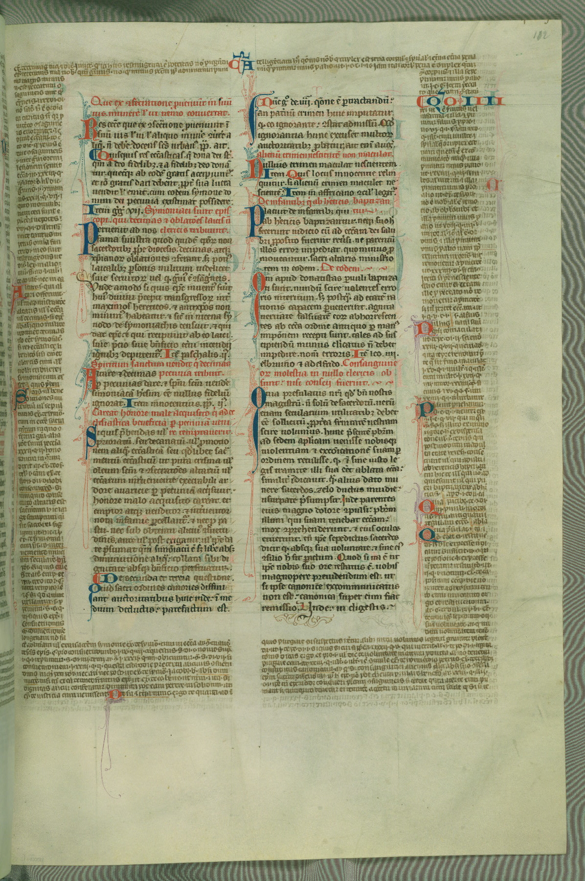 This deluxe version of Gratian's Decretum was created ca. 1280-90, most likely in Hainaut. The lively decoration of the manuscript indicates a marked taste for narrative, and there are thirty-seven historiated initials. The gloss work was completed by Bartholomew of Brescia. At first, Paris would seem to be the most likely place of origin, given that it was the leading center for the study of canon law. However, this particular manuscript exhibits scribal features that suggest its place of origin as being the Cistercian abbey of Cambron in Hainaut. Furthermore, Abbot Baudouin de Bousso, whose tenure at the abbey was from 1283 to 1293, was schooled in theology at the University of Paris, and he would eventually endorse the production of many fine manuscripts while at Cambron. In fact, the catalyst for this endeavor seems to have been the Beaupré Antiphonary (W.759-761), which was was created at Cambron during the 1280s. Stylistic features of W.133 seem to have connections with the Beaupré Antiphonary. For example, Cistercian monks are shown in three extant illuminations throughout three of the antiphonary volumes; these monks are pictured in brown habits similar to the type worn by clerics in W.133. The reliance upon Cistercian precedents for textual and design features associates W.133 with the Cistercian abbey at Cambron. However, more remains to be confirmed by further inspection of the output of the scriptorium at Cambron.