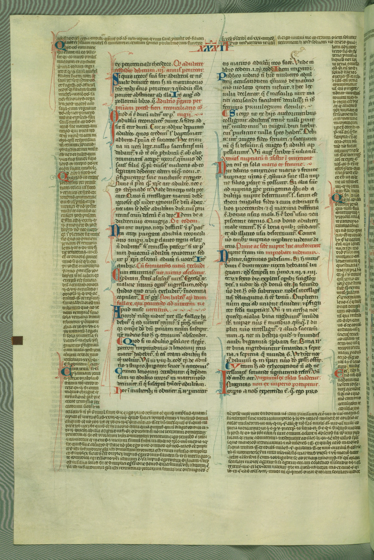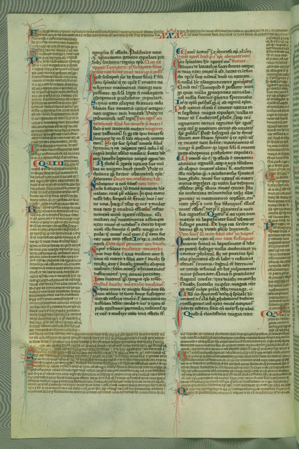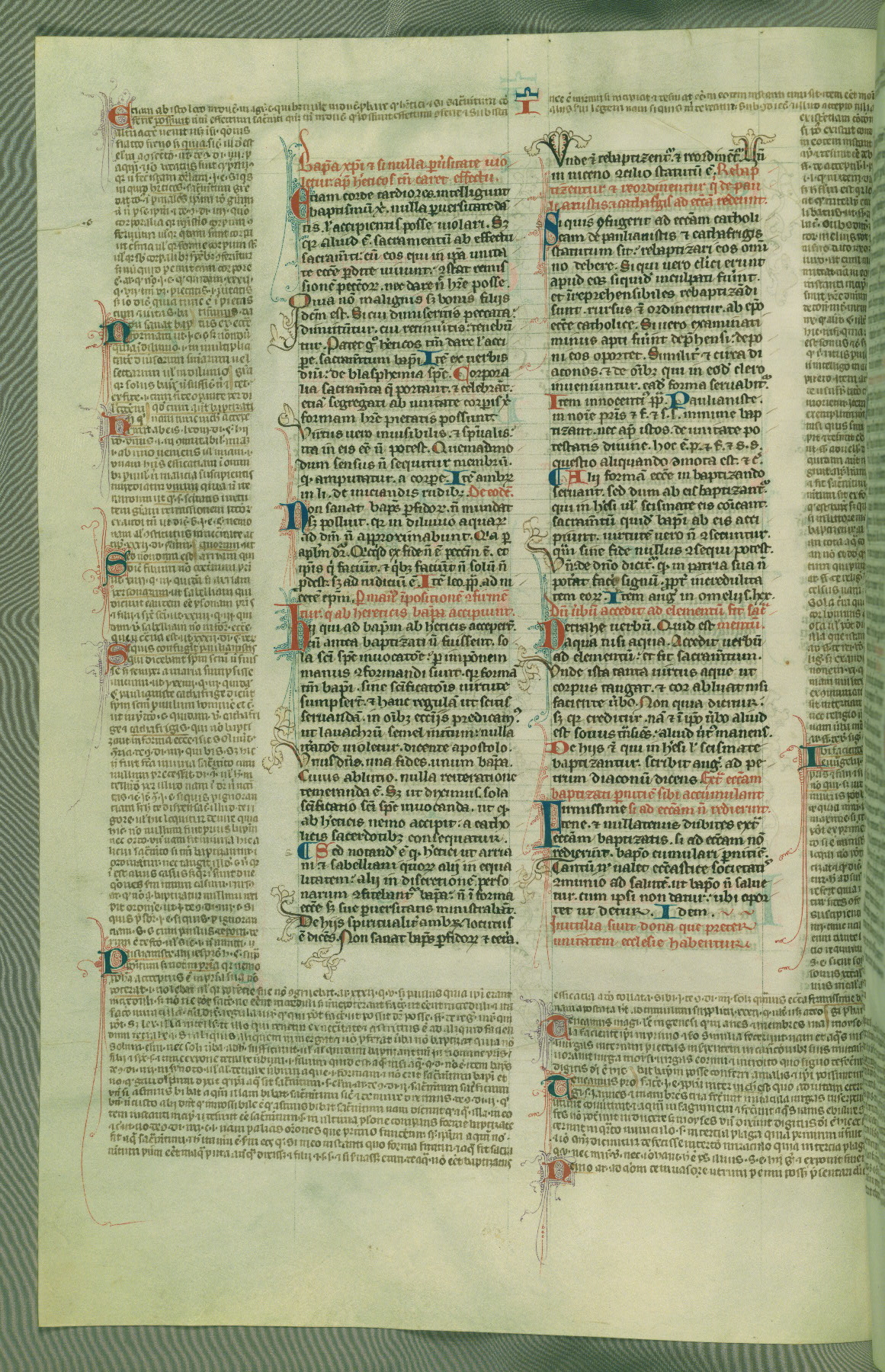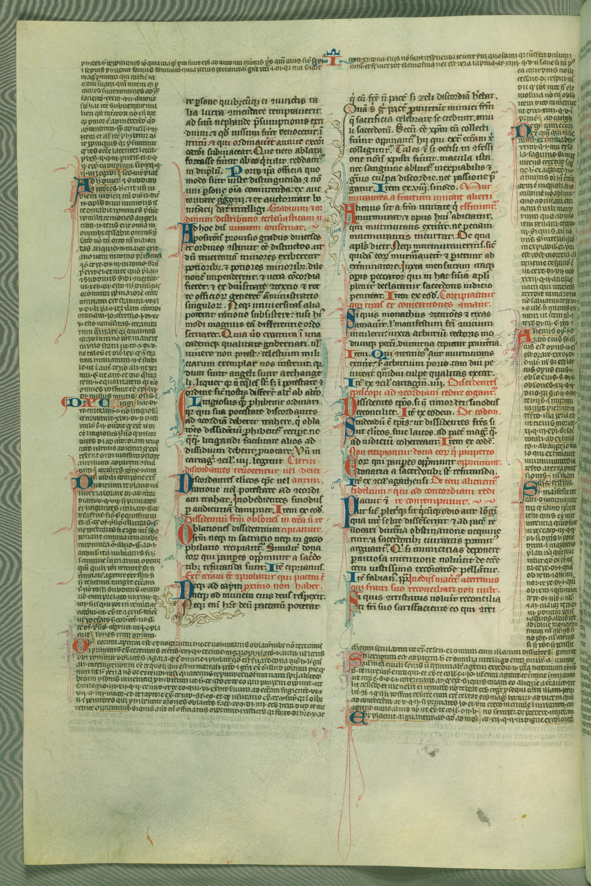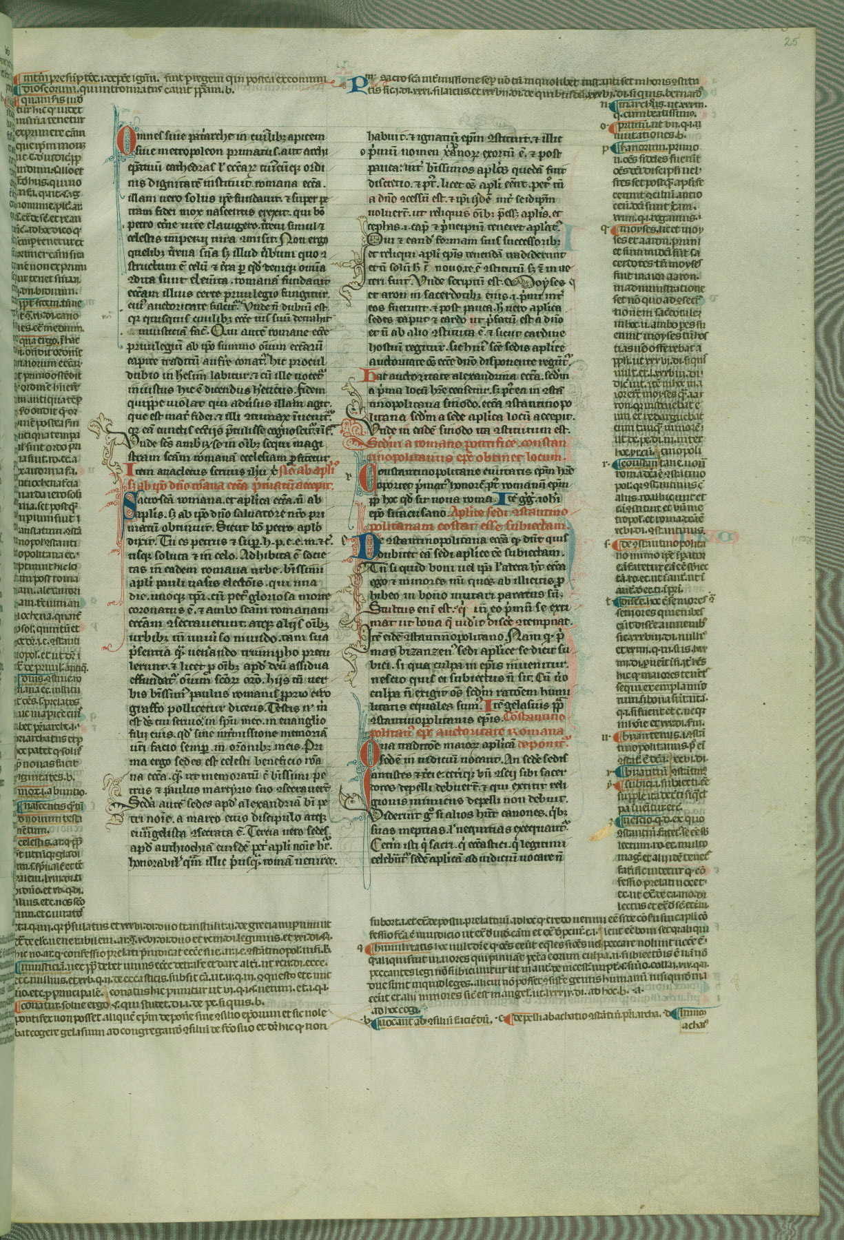 This deluxe version of Gratian's Decretum was created ca. 1280-90, most likely in Hainaut. The lively decoration of the manuscript indicates a marked taste for narrative, and there are thirty-seven historiated initials. The gloss work was completed by Bartholomew of Brescia. At first, Paris would seem to be the most likely place of origin, given that it was the leading center for the study of canon law. However, this particular manuscript exhibits scribal features that suggest its place of origin as being the Cistercian abbey of Cambron in Hainaut. Furthermore, Abbot Baudouin de Bousso, whose tenure at the abbey was from 1283 to 1293, was schooled in theology at the University of Paris, and he would eventually endorse the production of many fine manuscripts while at Cambron. In fact, the catalyst for this endeavor seems to have been the Beaupré Antiphonary (W.759-761), which was was created at Cambron during the 1280s. Stylistic features of W.133 seem to have connections with the Beaupré Antiphonary. For example, Cistercian monks are shown in three extant illuminations throughout three of the antiphonary volumes; these monks are pictured in brown habits similar to the type worn by clerics in W.133. The reliance upon Cistercian precedents for textual and design features associates W.133 with the Cistercian abbey at Cambron. However, more remains to be confirmed by further inspection of the output of the scriptorium at Cambron.