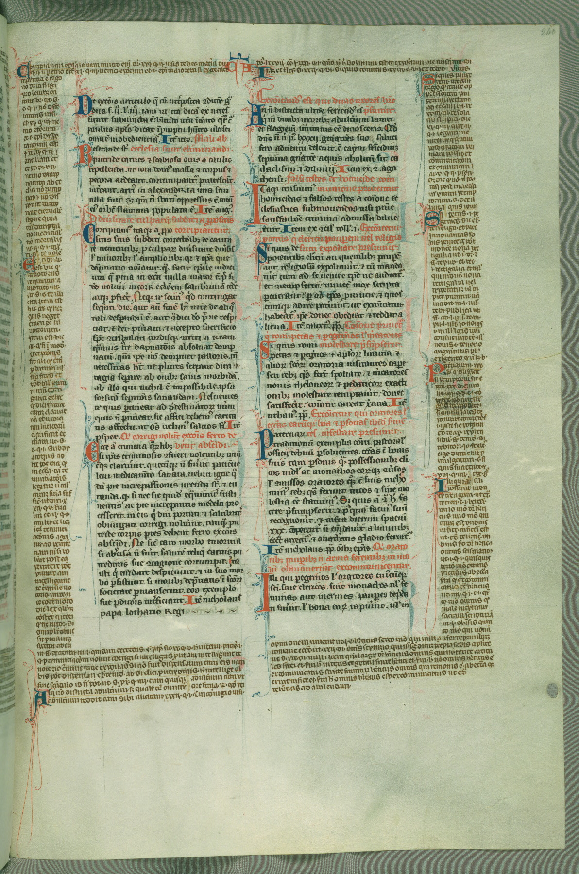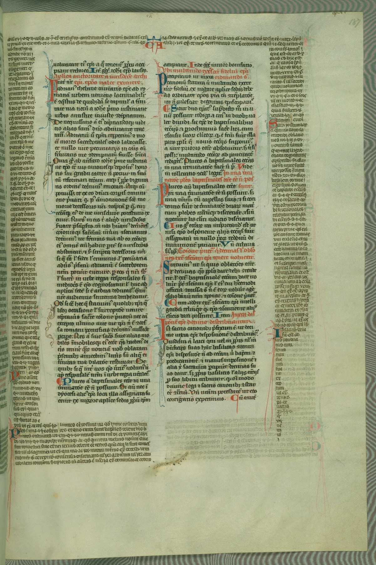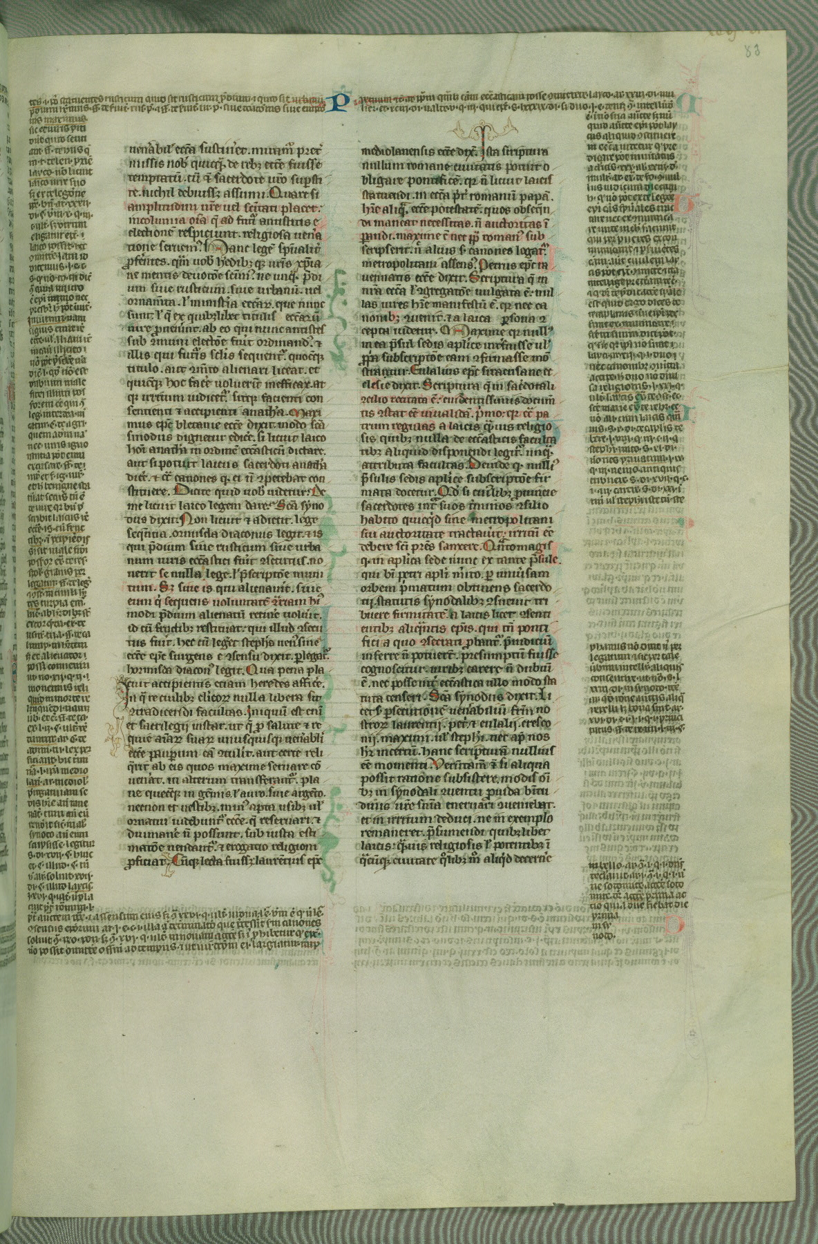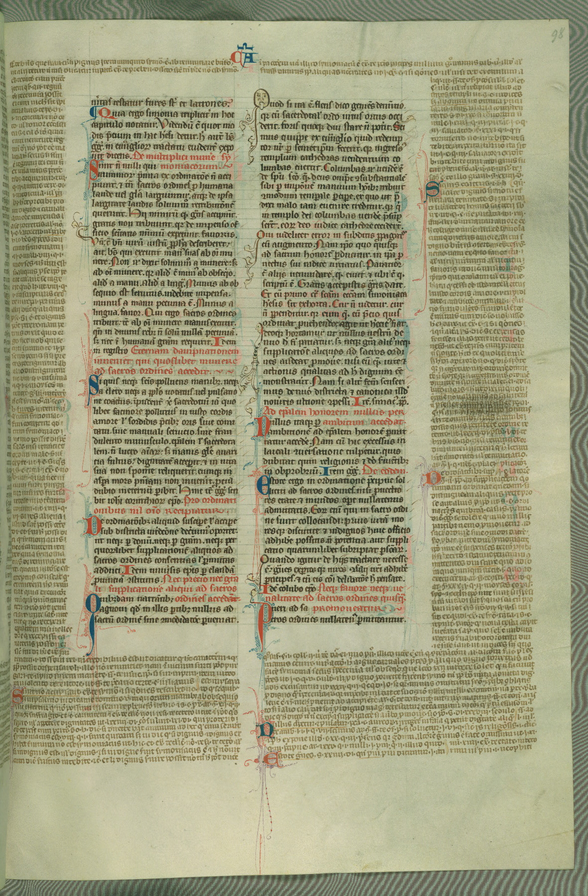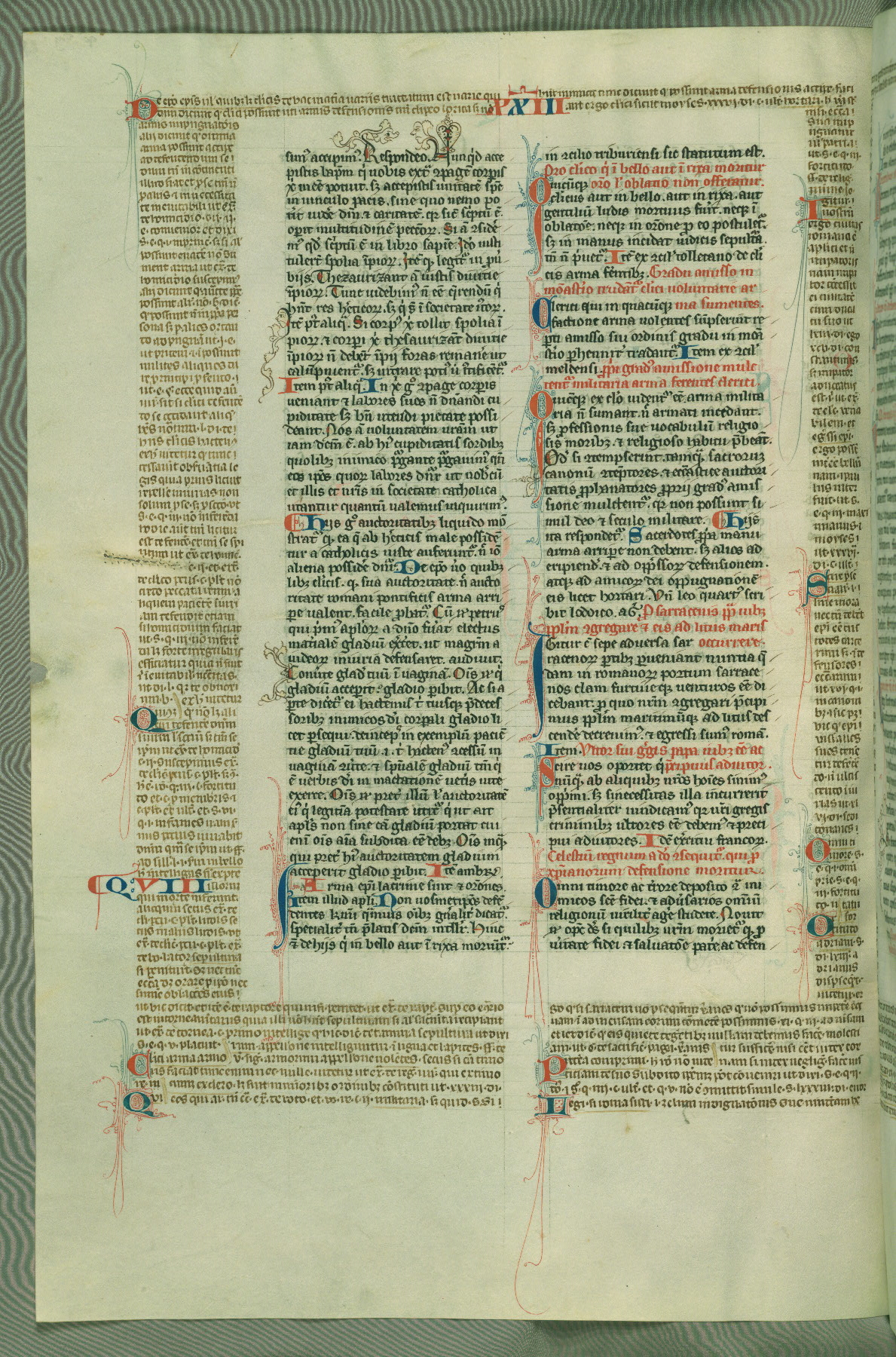 This deluxe version of Gratian's Decretum was created ca. 1280-90, most likely in Hainaut. The lively decoration of the manuscript indicates a marked taste for narrative, and there are thirty-seven historiated initials. The gloss work was completed by Bartholomew of Brescia. At first, Paris would seem to be the most likely place of origin, given that it was the leading center for the study of canon law. However, this particular manuscript exhibits scribal features that suggest its place of origin as being the Cistercian abbey of Cambron in Hainaut. Furthermore, Abbot Baudouin de Bousso, whose tenure at the abbey was from 1283 to 1293, was schooled in theology at the University of Paris, and he would eventually endorse the production of many fine manuscripts while at Cambron. In fact, the catalyst for this endeavor seems to have been the Beaupré Antiphonary (W.759-761), which was was created at Cambron during the 1280s. Stylistic features of W.133 seem to have connections with the Beaupré Antiphonary. For example, Cistercian monks are shown in three extant illuminations throughout three of the antiphonary volumes; these monks are pictured in brown habits similar to the type worn by clerics in W.133. The reliance upon Cistercian precedents for textual and design features associates W.133 with the Cistercian abbey at Cambron. However, more remains to be confirmed by further inspection of the output of the scriptorium at Cambron.