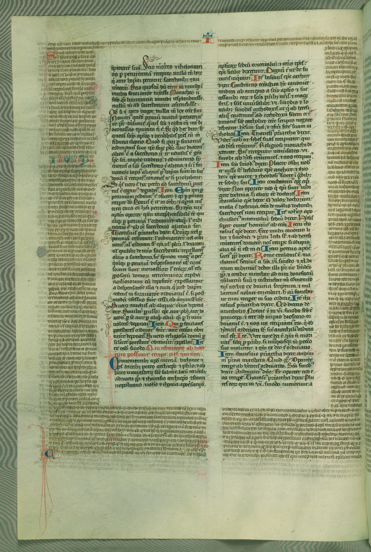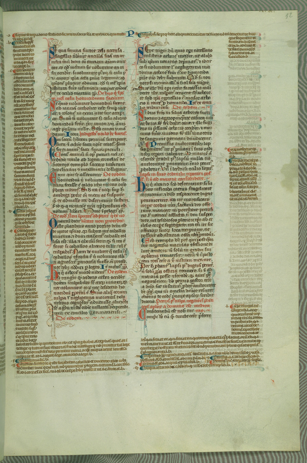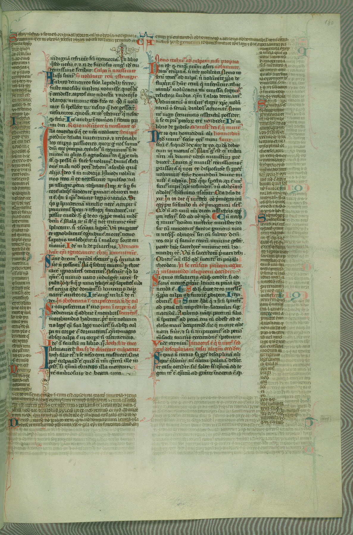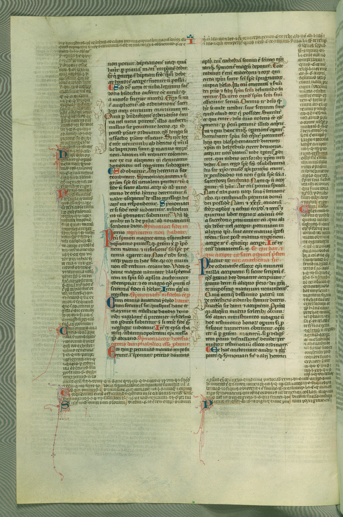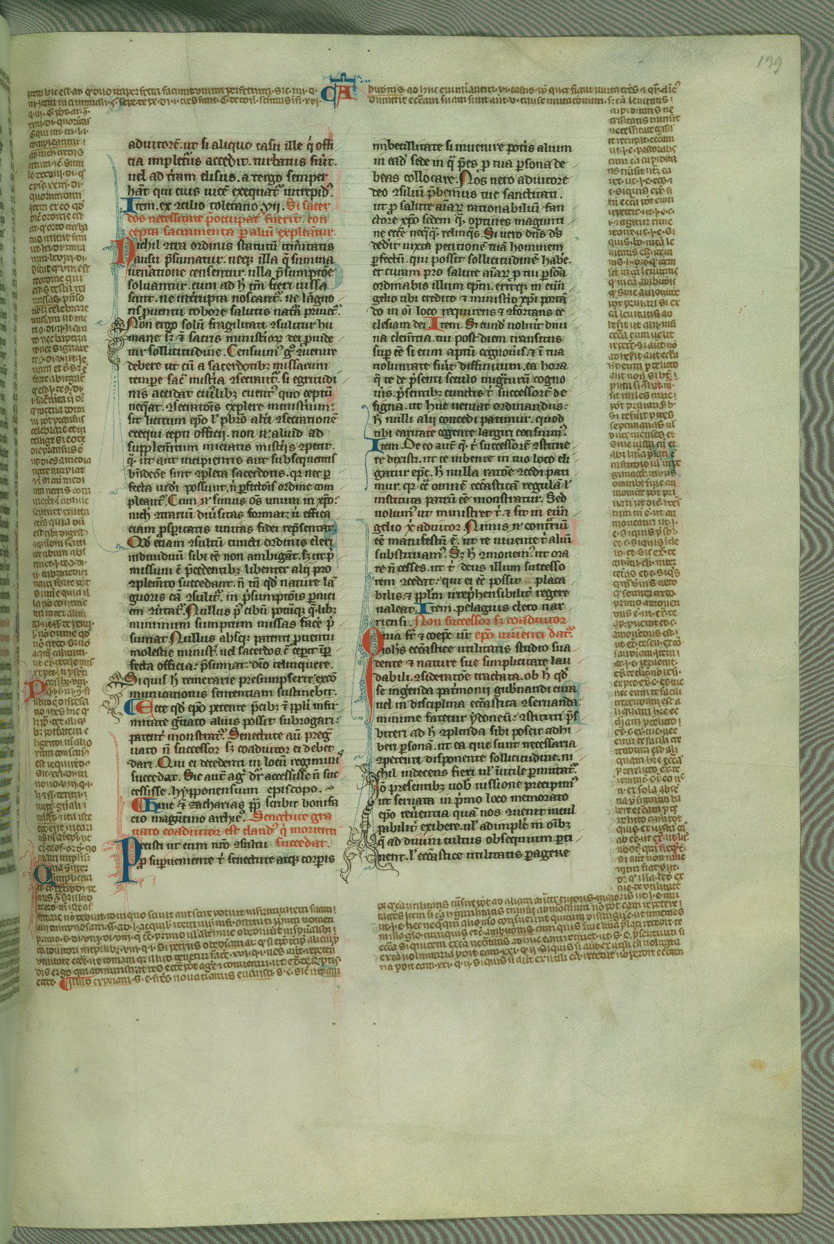 This deluxe version of Gratian's Decretum was created ca. 1280-90, most likely in Hainaut. The lively decoration of the manuscript indicates a marked taste for narrative, and there are thirty-seven historiated initials. The gloss work was completed by Bartholomew of Brescia. At first, Paris would seem to be the most likely place of origin, given that it was the leading center for the study of canon law. However, this particular manuscript exhibits scribal features that suggest its place of origin as being the Cistercian abbey of Cambron in Hainaut. Furthermore, Abbot Baudouin de Bousso, whose tenure at the abbey was from 1283 to 1293, was schooled in theology at the University of Paris, and he would eventually endorse the production of many fine manuscripts while at Cambron. In fact, the catalyst for this endeavor seems to have been the Beaupré Antiphonary (W.759-761), which was was created at Cambron during the 1280s. Stylistic features of W.133 seem to have connections with the Beaupré Antiphonary. For example, Cistercian monks are shown in three extant illuminations throughout three of the antiphonary volumes; these monks are pictured in brown habits similar to the type worn by clerics in W.133. The reliance upon Cistercian precedents for textual and design features associates W.133 with the Cistercian abbey at Cambron. However, more remains to be confirmed by further inspection of the output of the scriptorium at Cambron.