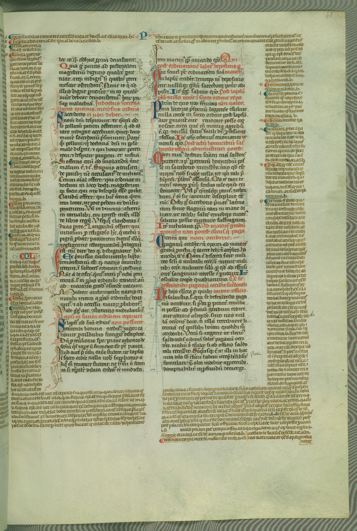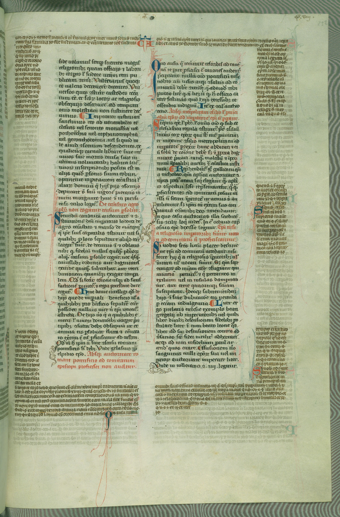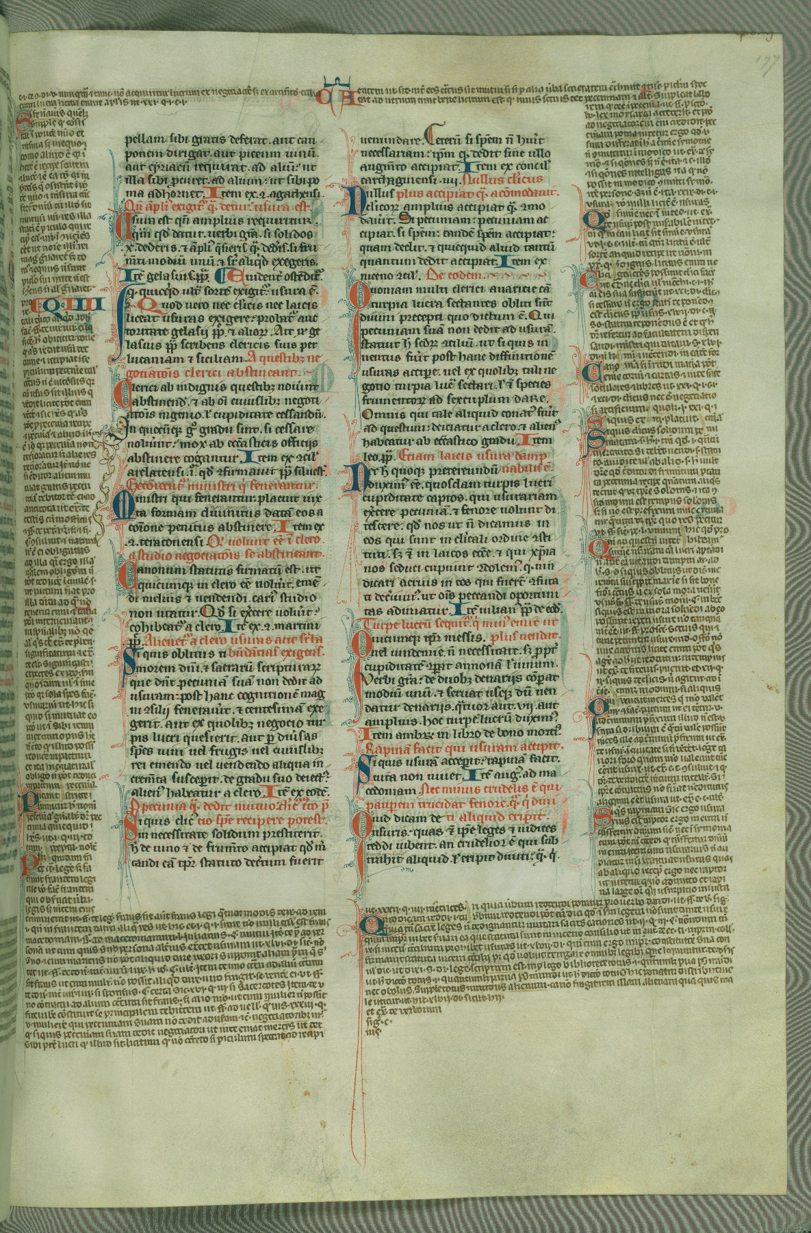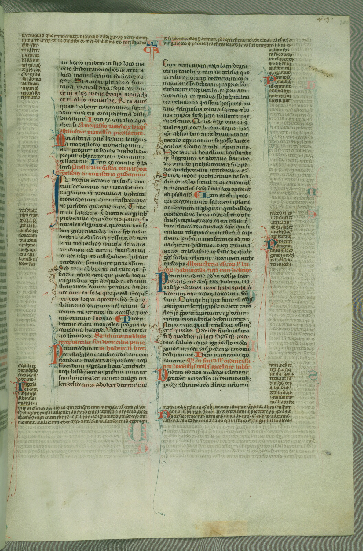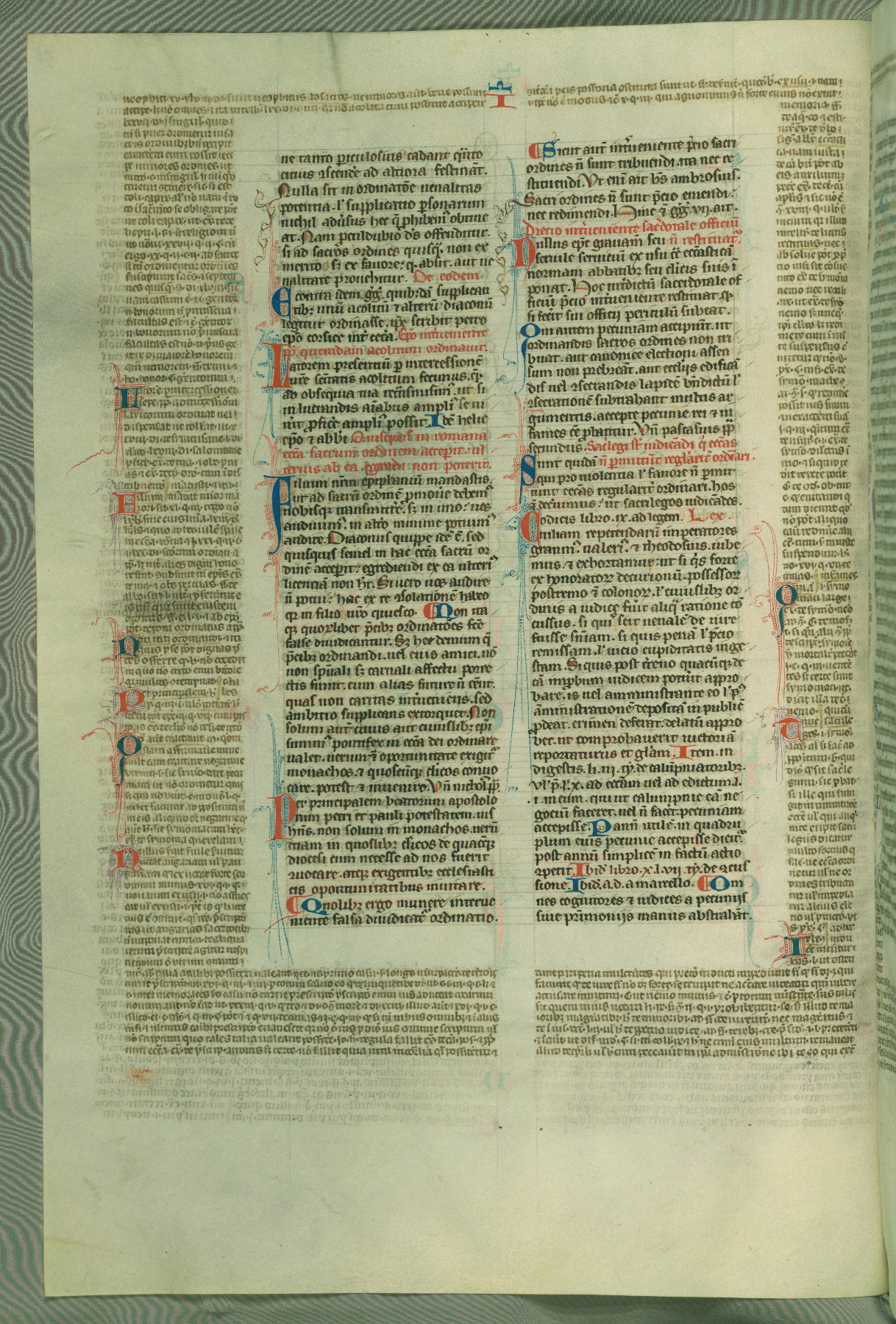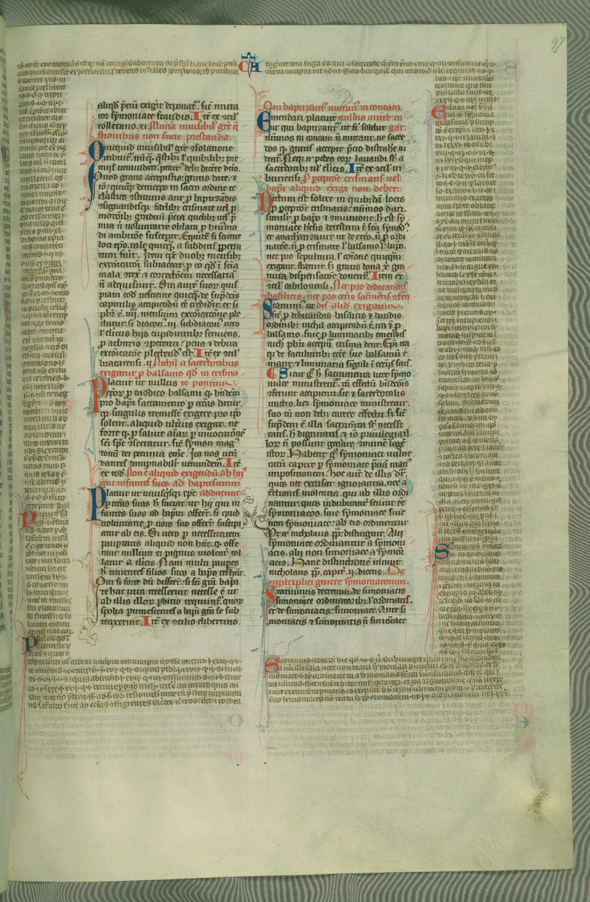 This deluxe version of Gratian's Decretum was created ca. 1280-90, most likely in Hainaut. The lively decoration of the manuscript indicates a marked taste for narrative, and there are thirty-seven historiated initials. The gloss work was completed by Bartholomew of Brescia. At first, Paris would seem to be the most likely place of origin, given that it was the leading center for the study of canon law. However, this particular manuscript exhibits scribal features that suggest its place of origin as being the Cistercian abbey of Cambron in Hainaut. Furthermore, Abbot Baudouin de Bousso, whose tenure at the abbey was from 1283 to 1293, was schooled in theology at the University of Paris, and he would eventually endorse the production of many fine manuscripts while at Cambron. In fact, the catalyst for this endeavor seems to have been the Beaupré Antiphonary (W.759-761), which was was created at Cambron during the 1280s. Stylistic features of W.133 seem to have connections with the Beaupré Antiphonary. For example, Cistercian monks are shown in three extant illuminations throughout three of the antiphonary volumes; these monks are pictured in brown habits similar to the type worn by clerics in W.133. The reliance upon Cistercian precedents for textual and design features associates W.133 with the Cistercian abbey at Cambron. However, more remains to be confirmed by further inspection of the output of the scriptorium at Cambron.