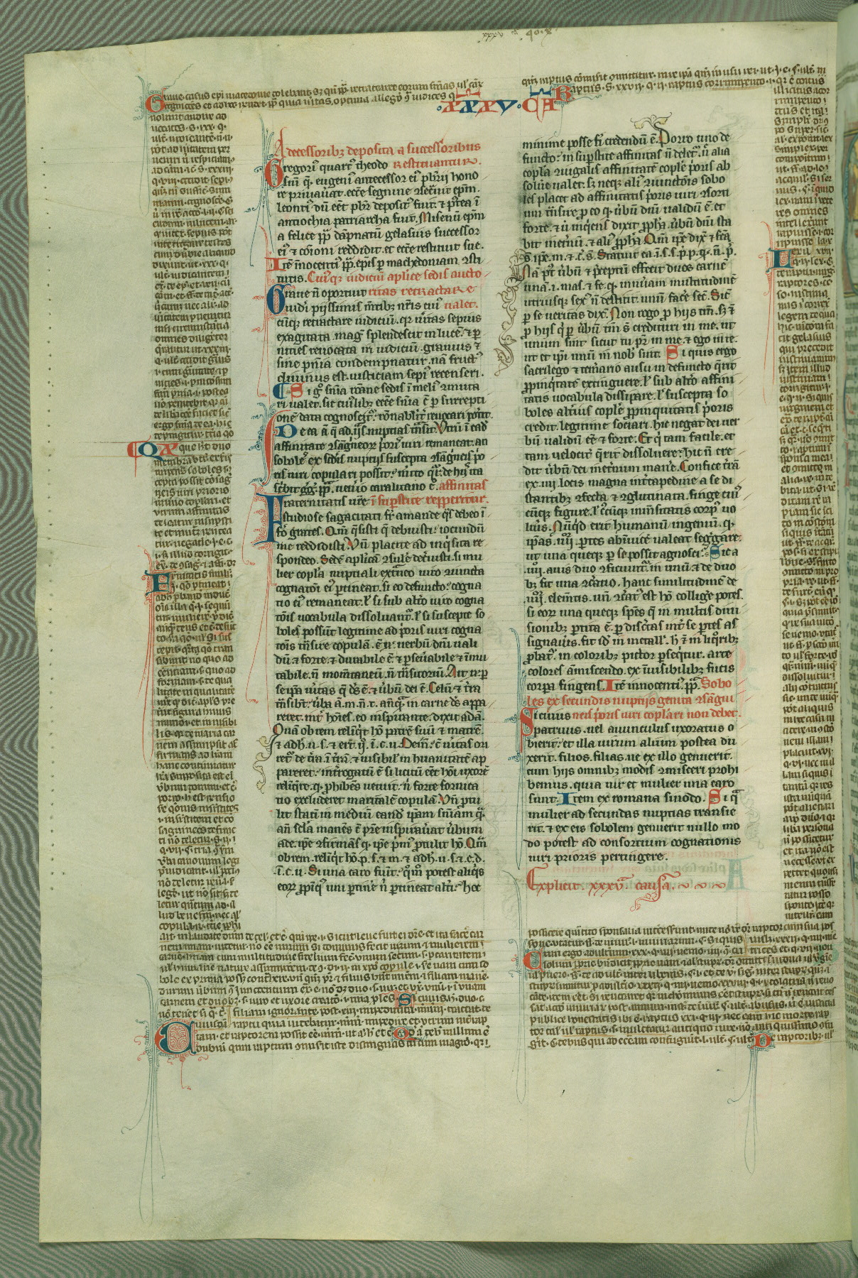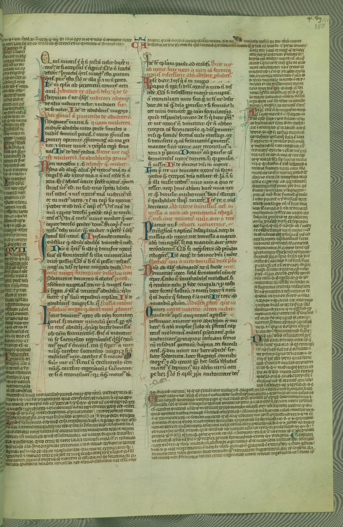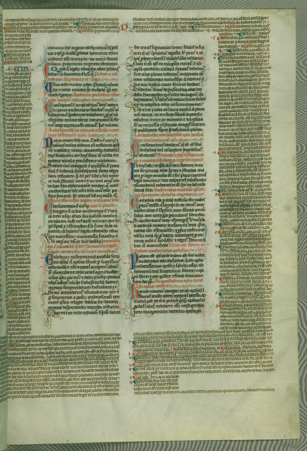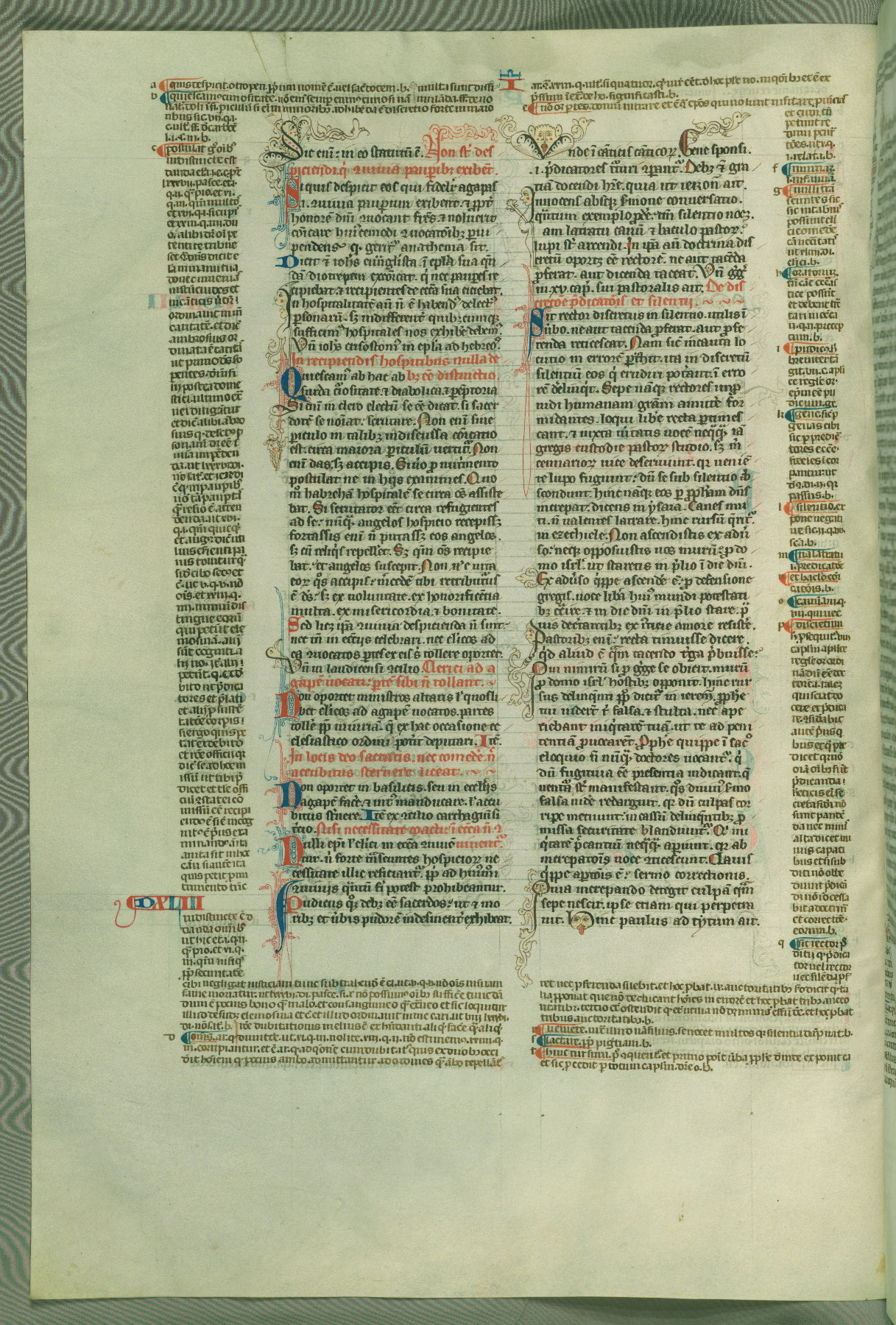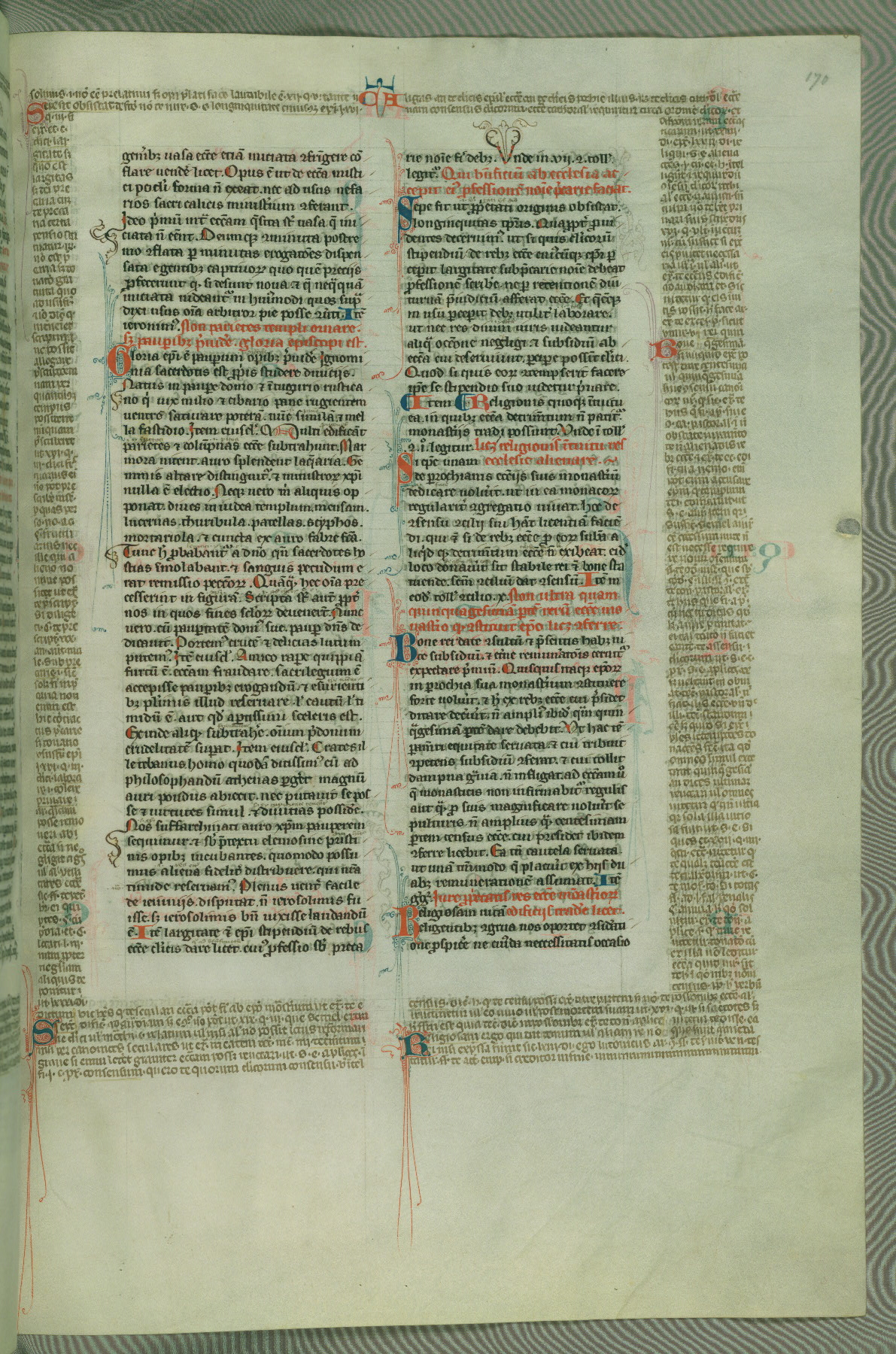 This deluxe version of Gratian's Decretum was created ca. 1280-90, most likely in Hainaut. The lively decoration of the manuscript indicates a marked taste for narrative, and there are thirty-seven historiated initials. The gloss work was completed by Bartholomew of Brescia. At first, Paris would seem to be the most likely place of origin, given that it was the leading center for the study of canon law. However, this particular manuscript exhibits scribal features that suggest its place of origin as being the Cistercian abbey of Cambron in Hainaut. Furthermore, Abbot Baudouin de Bousso, whose tenure at the abbey was from 1283 to 1293, was schooled in theology at the University of Paris, and he would eventually endorse the production of many fine manuscripts while at Cambron. In fact, the catalyst for this endeavor seems to have been the Beaupré Antiphonary (W.759-761), which was was created at Cambron during the 1280s. Stylistic features of W.133 seem to have connections with the Beaupré Antiphonary. For example, Cistercian monks are shown in three extant illuminations throughout three of the antiphonary volumes; these monks are pictured in brown habits similar to the type worn by clerics in W.133. The reliance upon Cistercian precedents for textual and design features associates W.133 with the Cistercian abbey at Cambron. However, more remains to be confirmed by further inspection of the output of the scriptorium at Cambron.