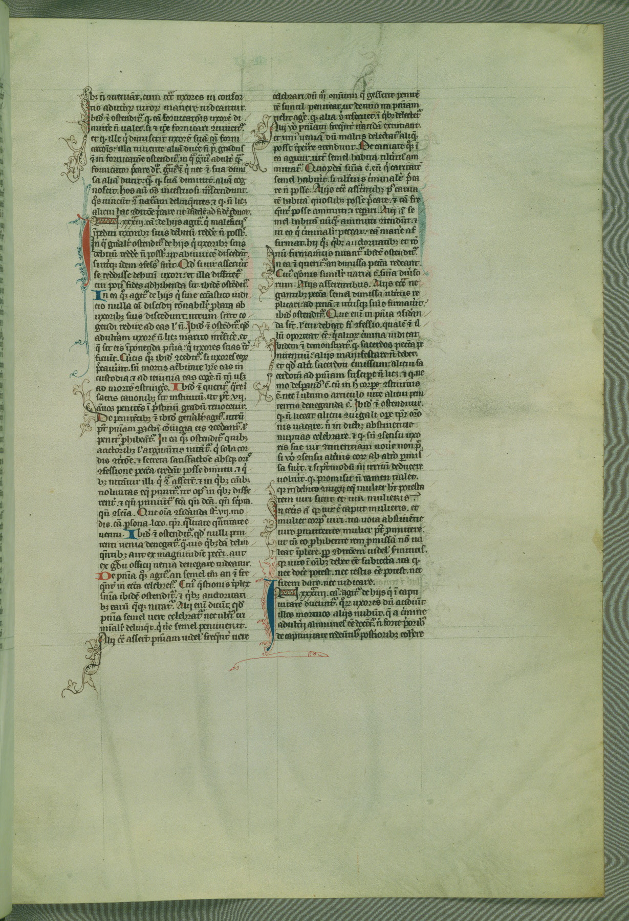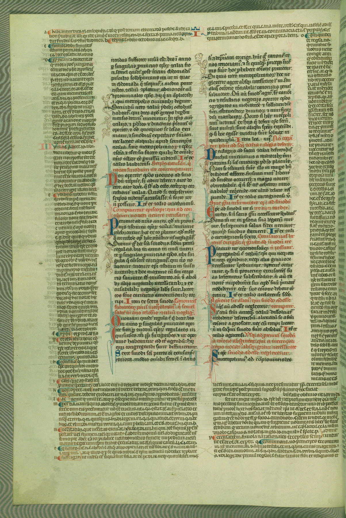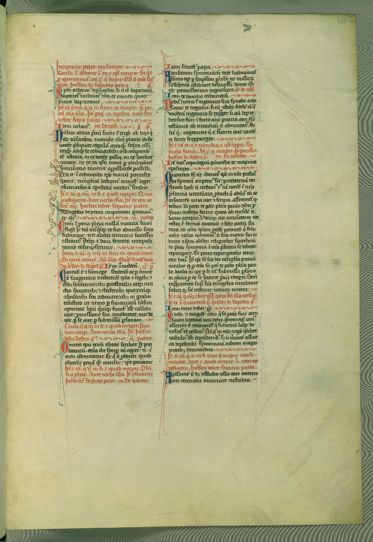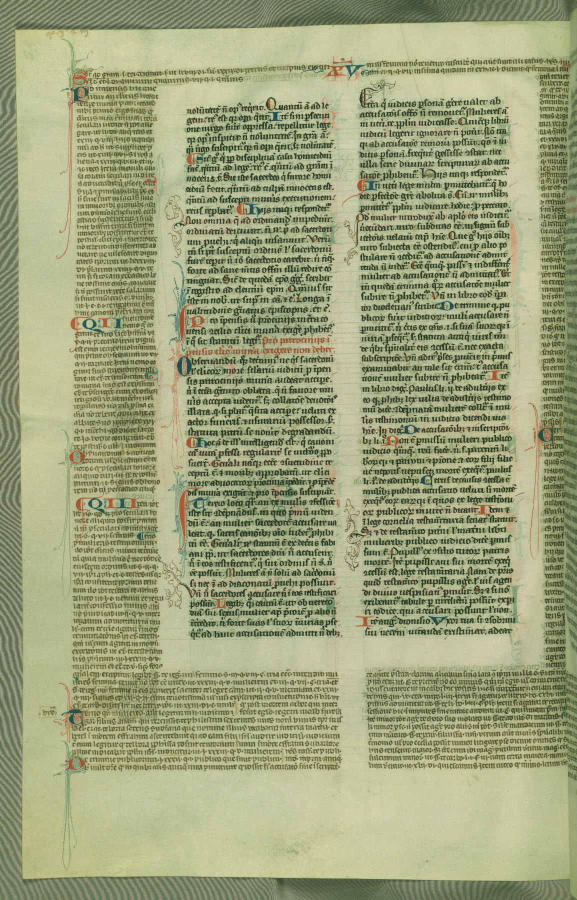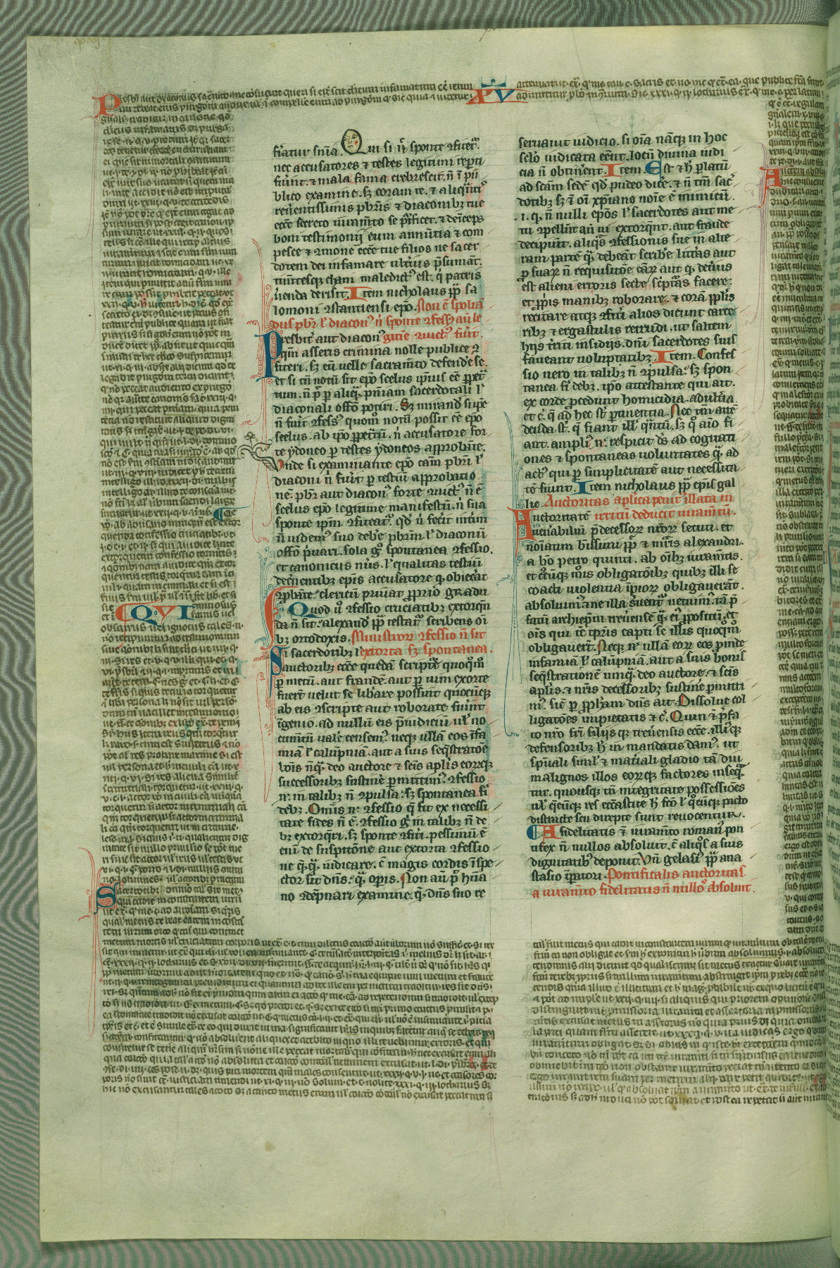 This deluxe version of Gratian's Decretum was created ca. 1280-90, most likely in Hainaut. The lively decoration of the manuscript indicates a marked taste for narrative, and there are thirty-seven historiated initials. The gloss work was completed by Bartholomew of Brescia. At first, Paris would seem to be the most likely place of origin, given that it was the leading center for the study of canon law. However, this particular manuscript exhibits scribal features that suggest its place of origin as being the Cistercian abbey of Cambron in Hainaut. Furthermore, Abbot Baudouin de Bousso, whose tenure at the abbey was from 1283 to 1293, was schooled in theology at the University of Paris, and he would eventually endorse the production of many fine manuscripts while at Cambron. In fact, the catalyst for this endeavor seems to have been the Beaupré Antiphonary (W.759-761), which was was created at Cambron during the 1280s. Stylistic features of W.133 seem to have connections with the Beaupré Antiphonary. For example, Cistercian monks are shown in three extant illuminations throughout three of the antiphonary volumes; these monks are pictured in brown habits similar to the type worn by clerics in W.133. The reliance upon Cistercian precedents for textual and design features associates W.133 with the Cistercian abbey at Cambron. However, more remains to be confirmed by further inspection of the output of the scriptorium at Cambron.