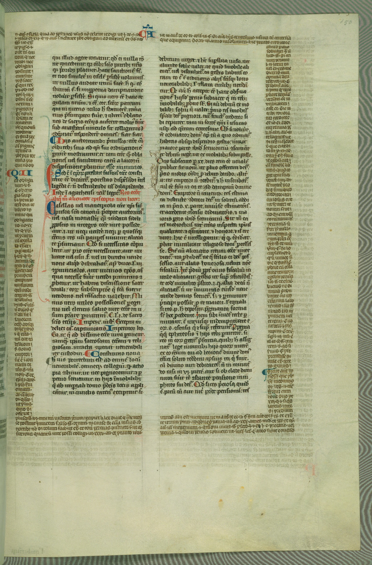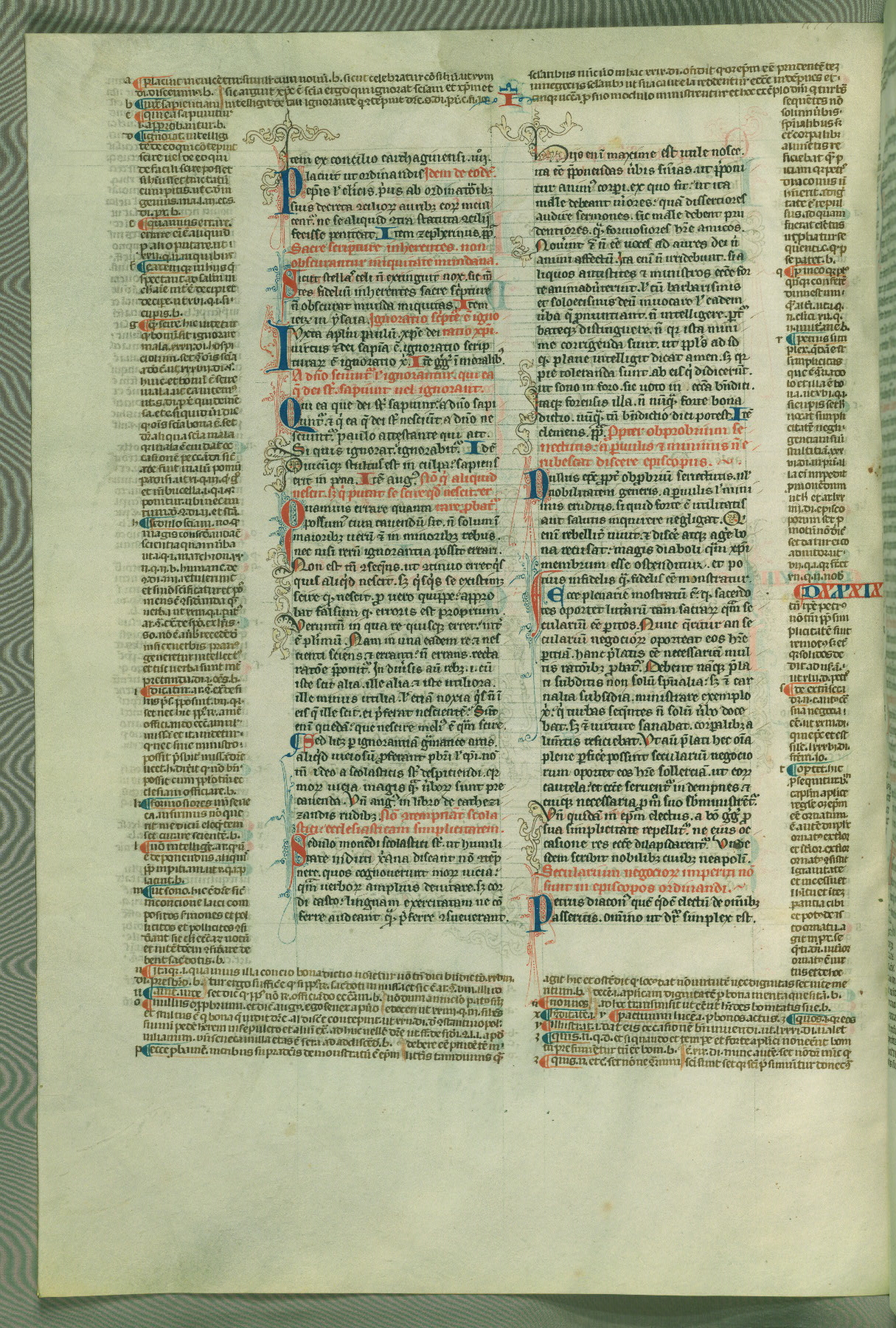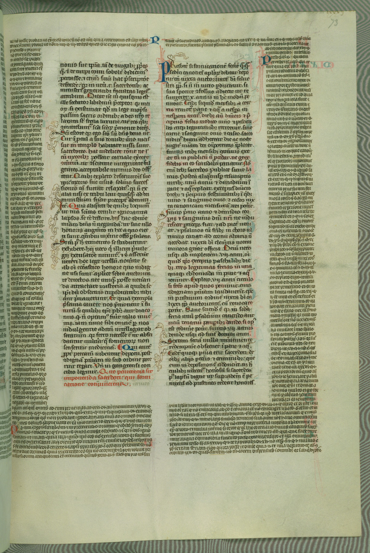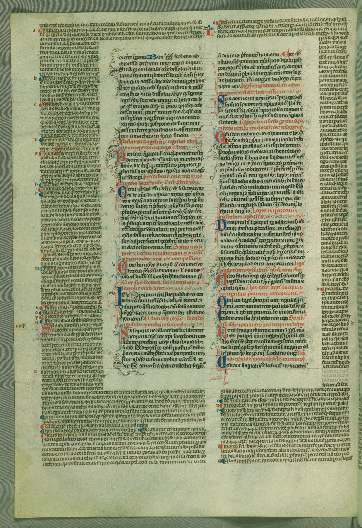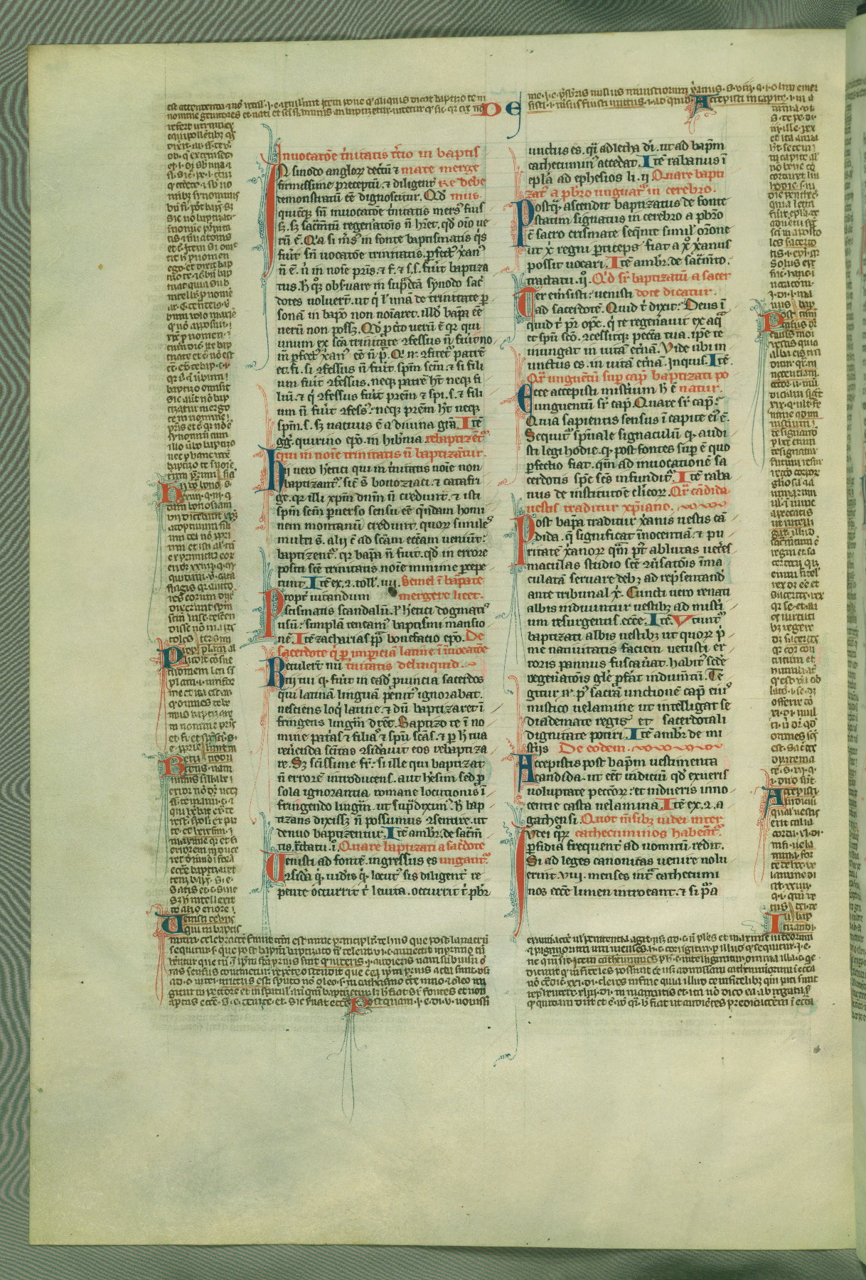 This deluxe version of Gratian's Decretum was created ca. 1280-90, most likely in Hainaut. The lively decoration of the manuscript indicates a marked taste for narrative, and there are thirty-seven historiated initials. The gloss work was completed by Bartholomew of Brescia. At first, Paris would seem to be the most likely place of origin, given that it was the leading center for the study of canon law. However, this particular manuscript exhibits scribal features that suggest its place of origin as being the Cistercian abbey of Cambron in Hainaut. Furthermore, Abbot Baudouin de Bousso, whose tenure at the abbey was from 1283 to 1293, was schooled in theology at the University of Paris, and he would eventually endorse the production of many fine manuscripts while at Cambron. In fact, the catalyst for this endeavor seems to have been the Beaupré Antiphonary (W.759-761), which was was created at Cambron during the 1280s. Stylistic features of W.133 seem to have connections with the Beaupré Antiphonary. For example, Cistercian monks are shown in three extant illuminations throughout three of the antiphonary volumes; these monks are pictured in brown habits similar to the type worn by clerics in W.133. The reliance upon Cistercian precedents for textual and design features associates W.133 with the Cistercian abbey at Cambron. However, more remains to be confirmed by further inspection of the output of the scriptorium at Cambron.