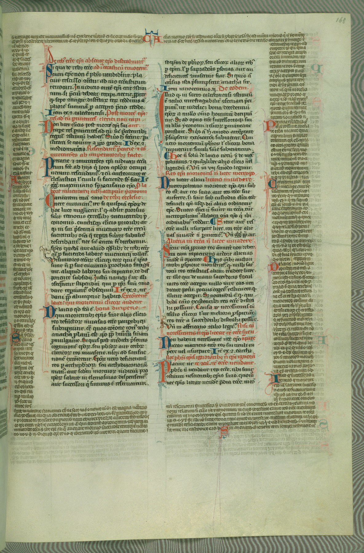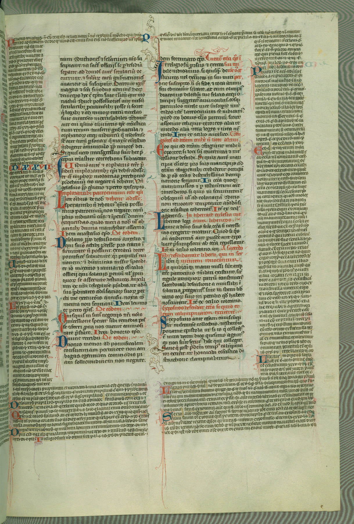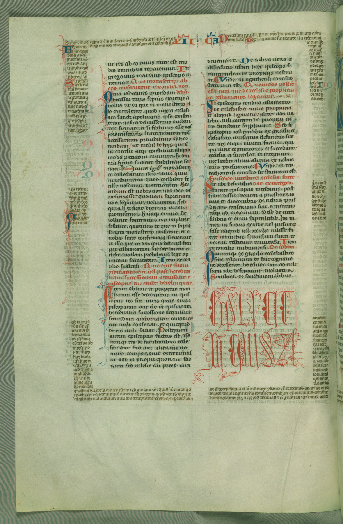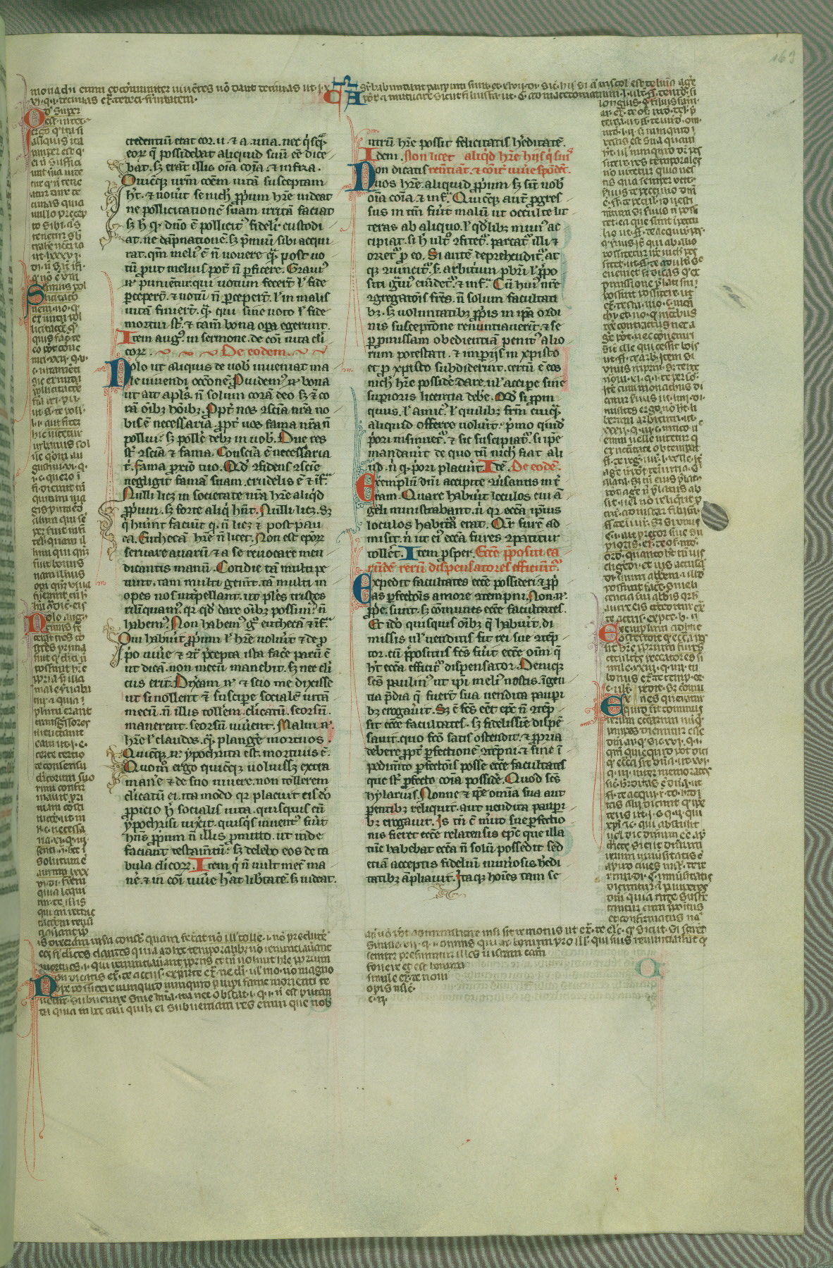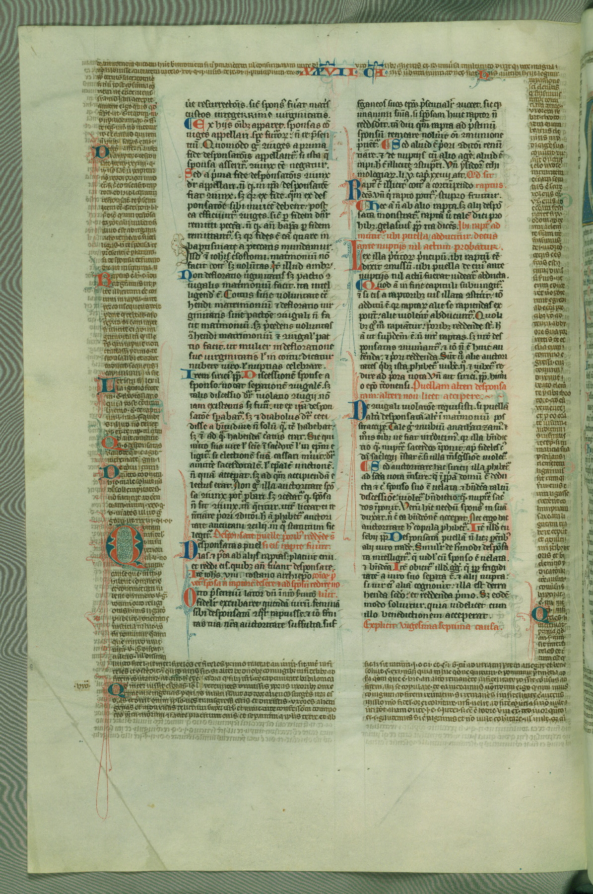 This deluxe version of Gratian's Decretum was created ca. 1280-90, most likely in Hainaut. The lively decoration of the manuscript indicates a marked taste for narrative, and there are thirty-seven historiated initials. The gloss work was completed by Bartholomew of Brescia. At first, Paris would seem to be the most likely place of origin, given that it was the leading center for the study of canon law. However, this particular manuscript exhibits scribal features that suggest its place of origin as being the Cistercian abbey of Cambron in Hainaut. Furthermore, Abbot Baudouin de Bousso, whose tenure at the abbey was from 1283 to 1293, was schooled in theology at the University of Paris, and he would eventually endorse the production of many fine manuscripts while at Cambron. In fact, the catalyst for this endeavor seems to have been the Beaupré Antiphonary (W.759-761), which was was created at Cambron during the 1280s. Stylistic features of W.133 seem to have connections with the Beaupré Antiphonary. For example, Cistercian monks are shown in three extant illuminations throughout three of the antiphonary volumes; these monks are pictured in brown habits similar to the type worn by clerics in W.133. The reliance upon Cistercian precedents for textual and design features associates W.133 with the Cistercian abbey at Cambron. However, more remains to be confirmed by further inspection of the output of the scriptorium at Cambron.