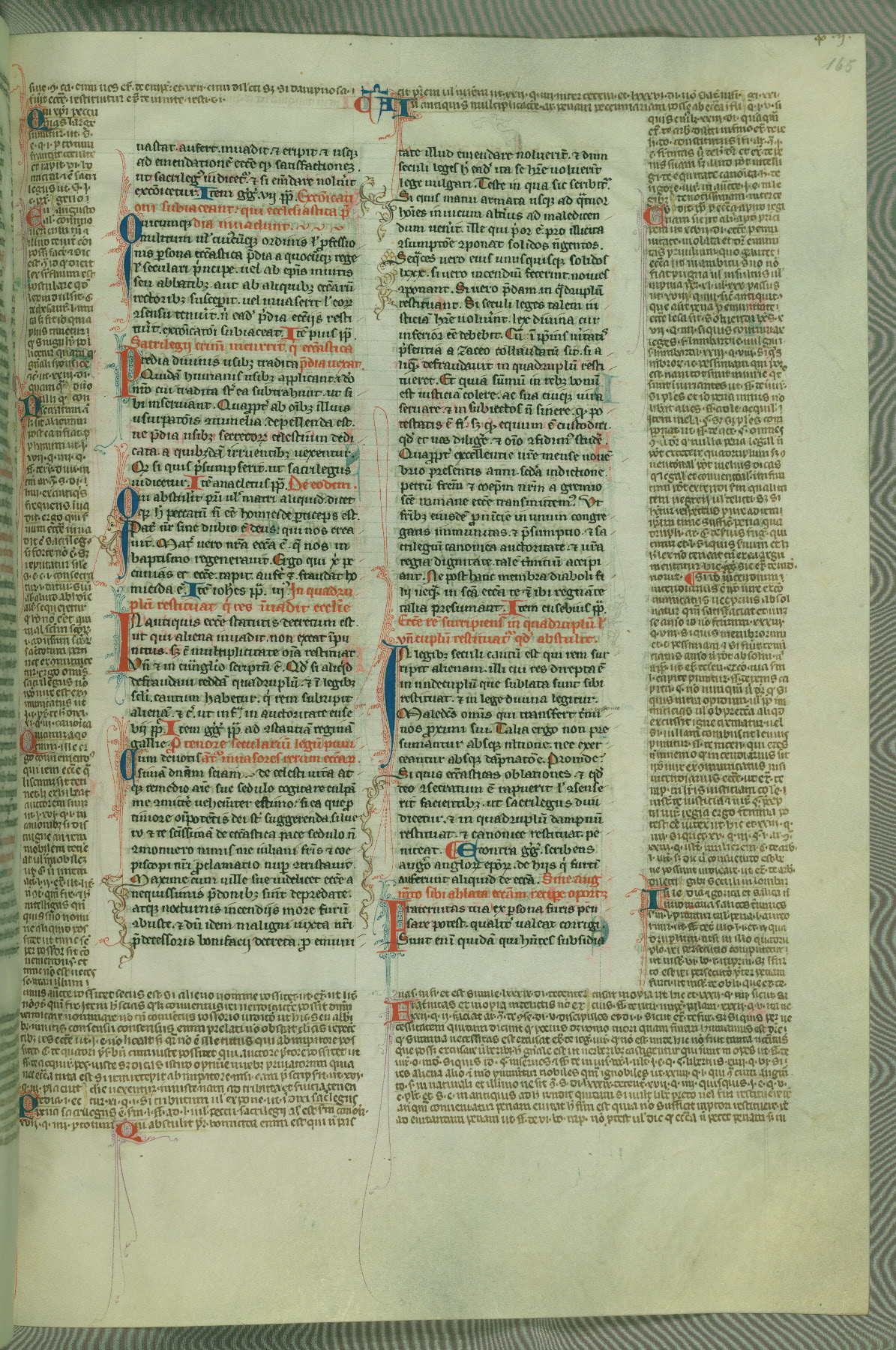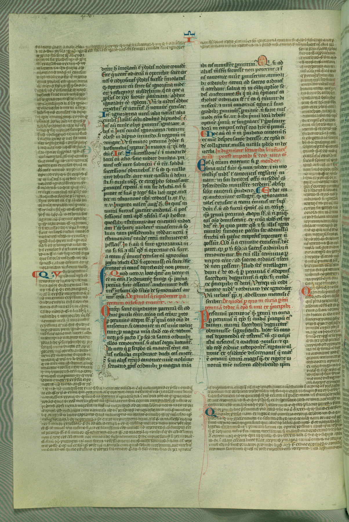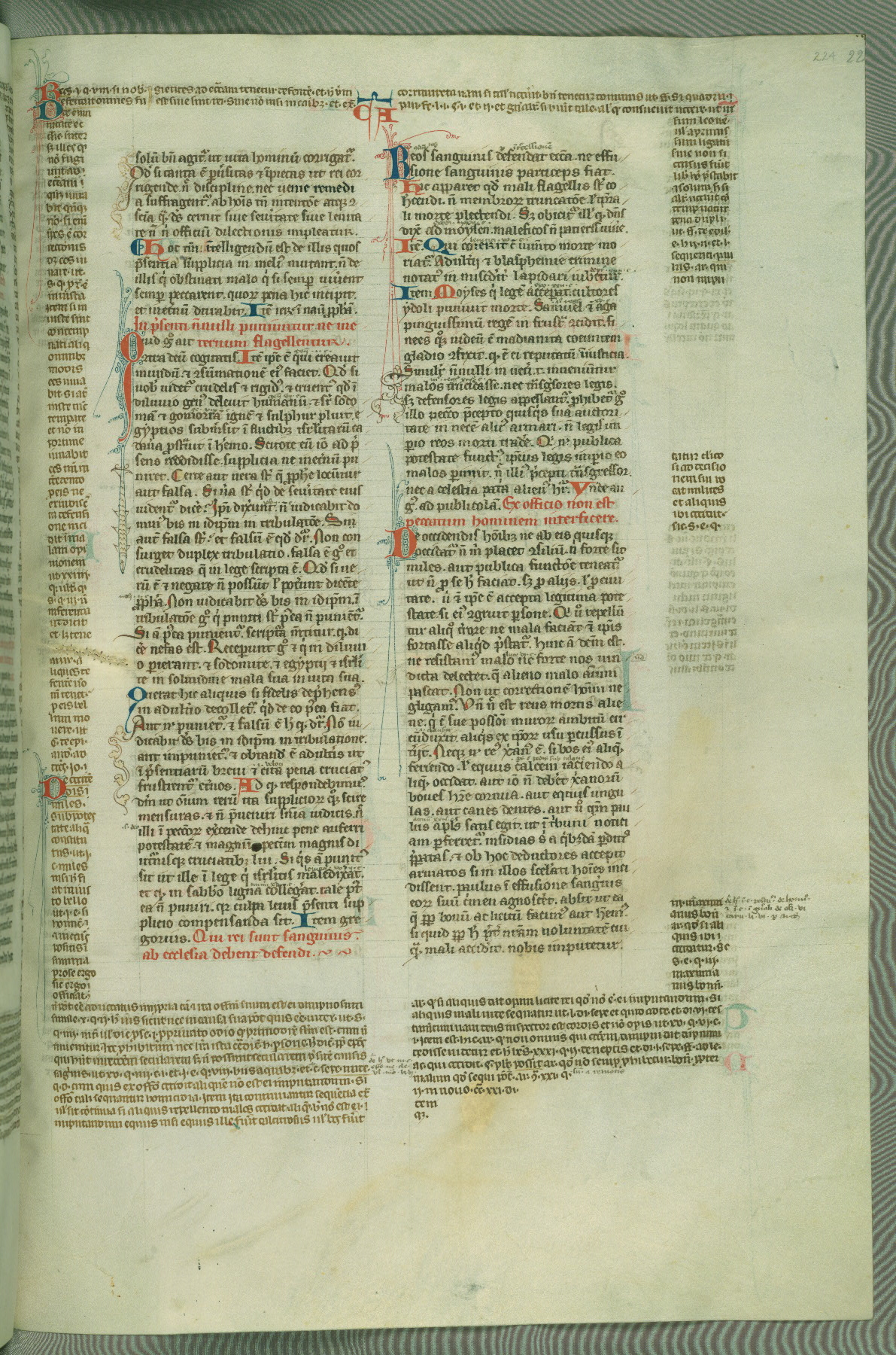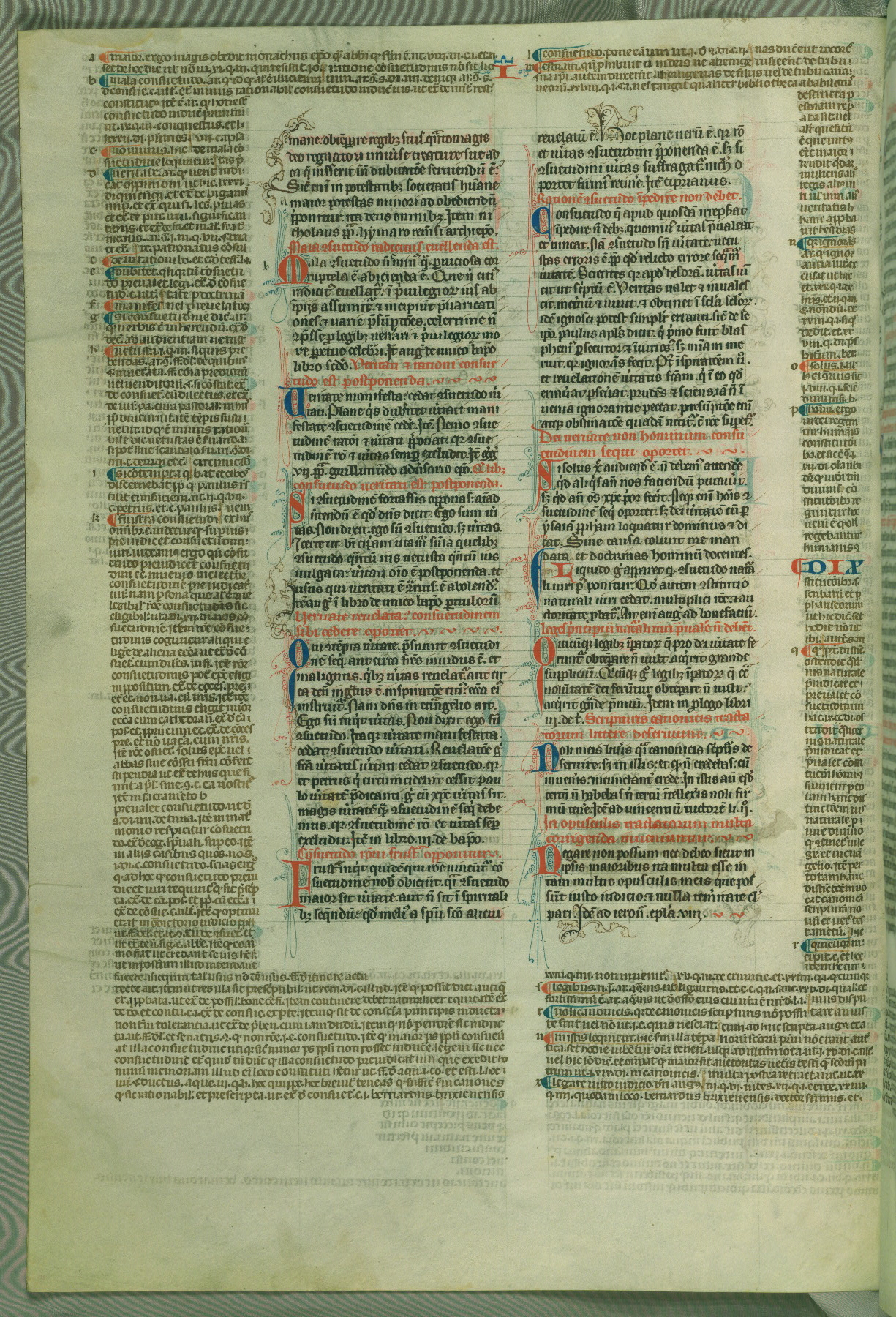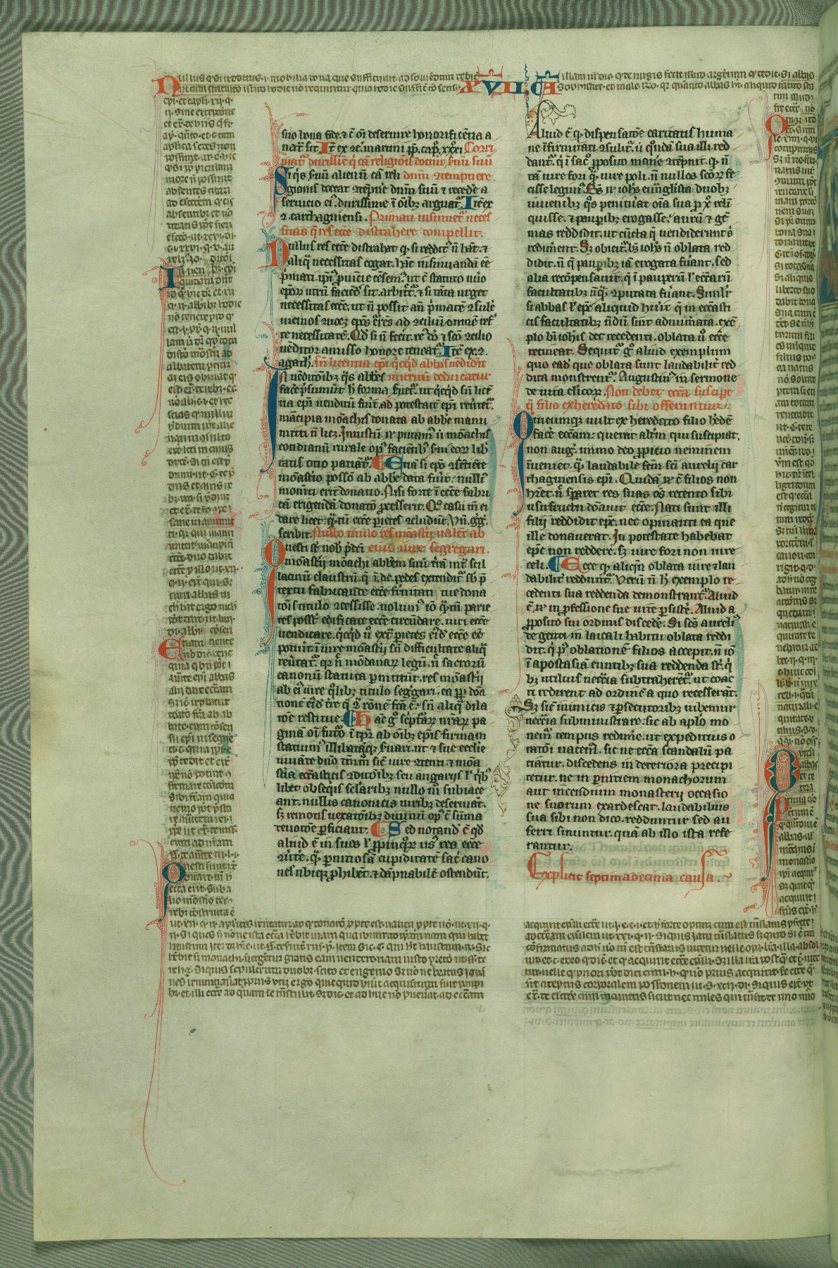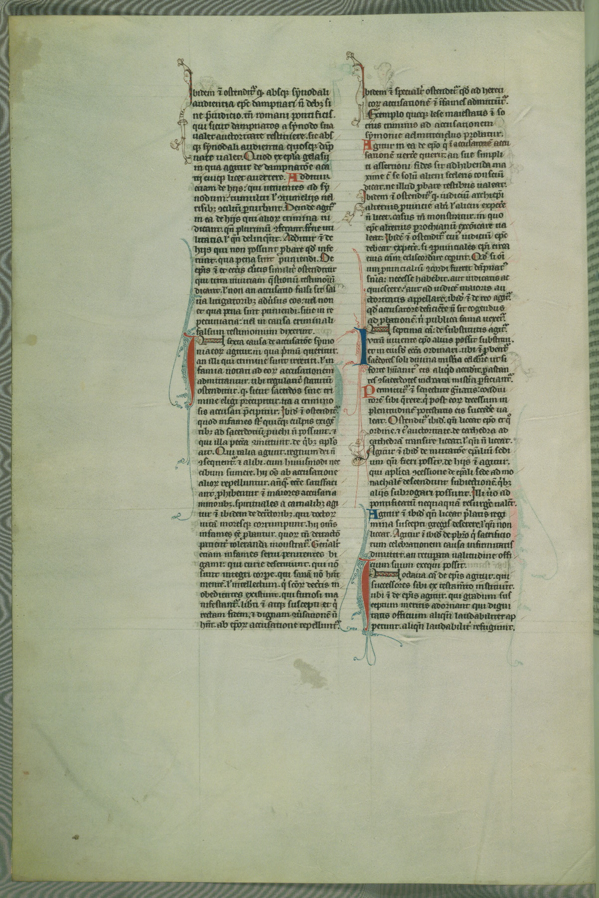 This deluxe version of Gratian's Decretum was created ca. 1280-90, most likely in Hainaut. The lively decoration of the manuscript indicates a marked taste for narrative, and there are thirty-seven historiated initials. The gloss work was completed by Bartholomew of Brescia. At first, Paris would seem to be the most likely place of origin, given that it was the leading center for the study of canon law. However, this particular manuscript exhibits scribal features that suggest its place of origin as being the Cistercian abbey of Cambron in Hainaut. Furthermore, Abbot Baudouin de Bousso, whose tenure at the abbey was from 1283 to 1293, was schooled in theology at the University of Paris, and he would eventually endorse the production of many fine manuscripts while at Cambron. In fact, the catalyst for this endeavor seems to have been the Beaupré Antiphonary (W.759-761), which was was created at Cambron during the 1280s. Stylistic features of W.133 seem to have connections with the Beaupré Antiphonary. For example, Cistercian monks are shown in three extant illuminations throughout three of the antiphonary volumes; these monks are pictured in brown habits similar to the type worn by clerics in W.133. The reliance upon Cistercian precedents for textual and design features associates W.133 with the Cistercian abbey at Cambron. However, more remains to be confirmed by further inspection of the output of the scriptorium at Cambron.