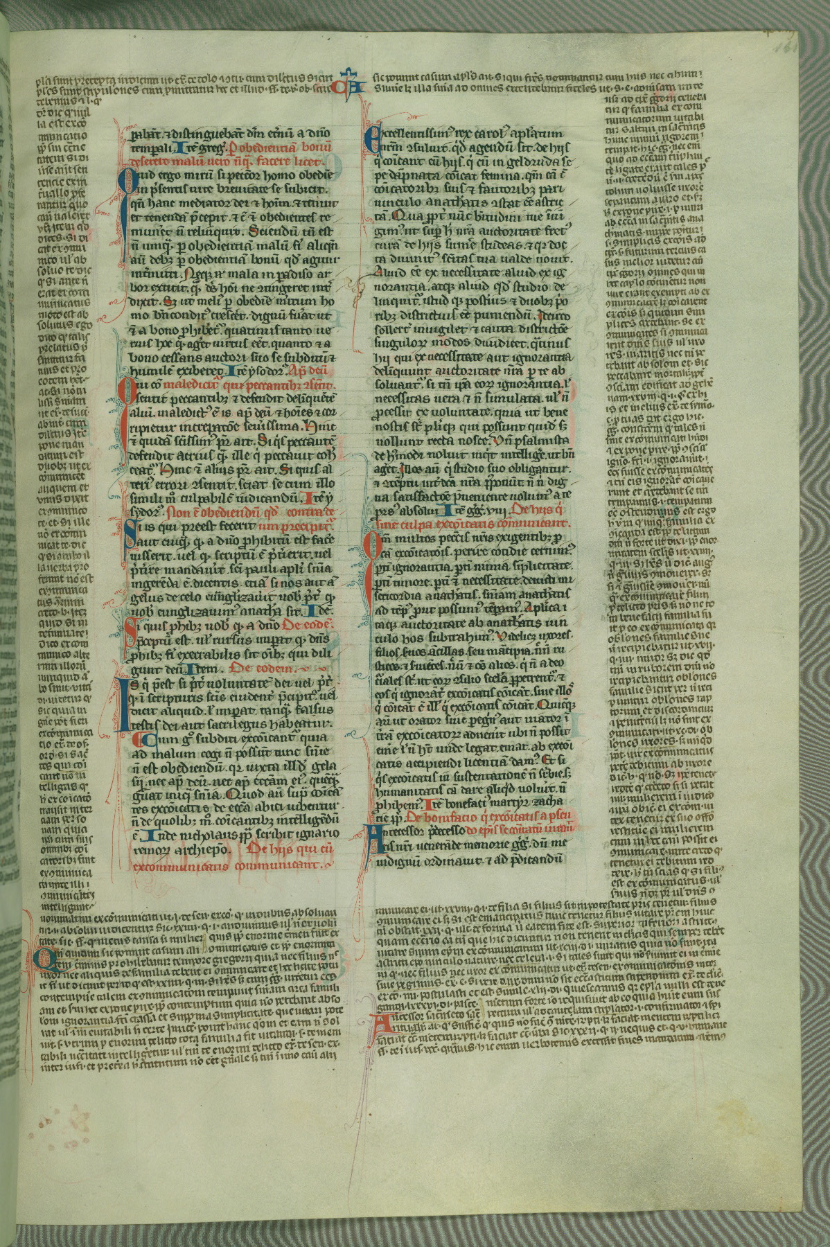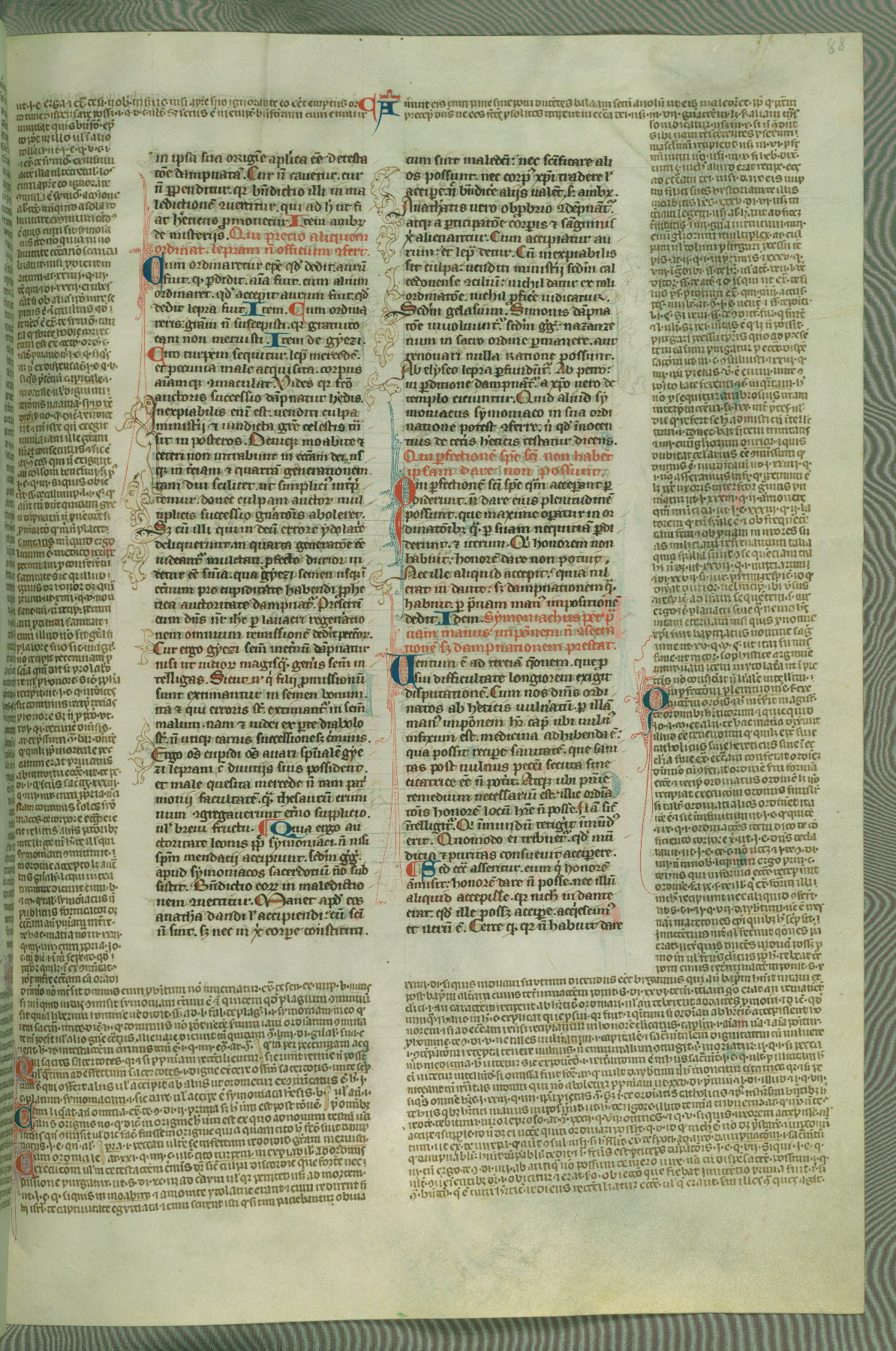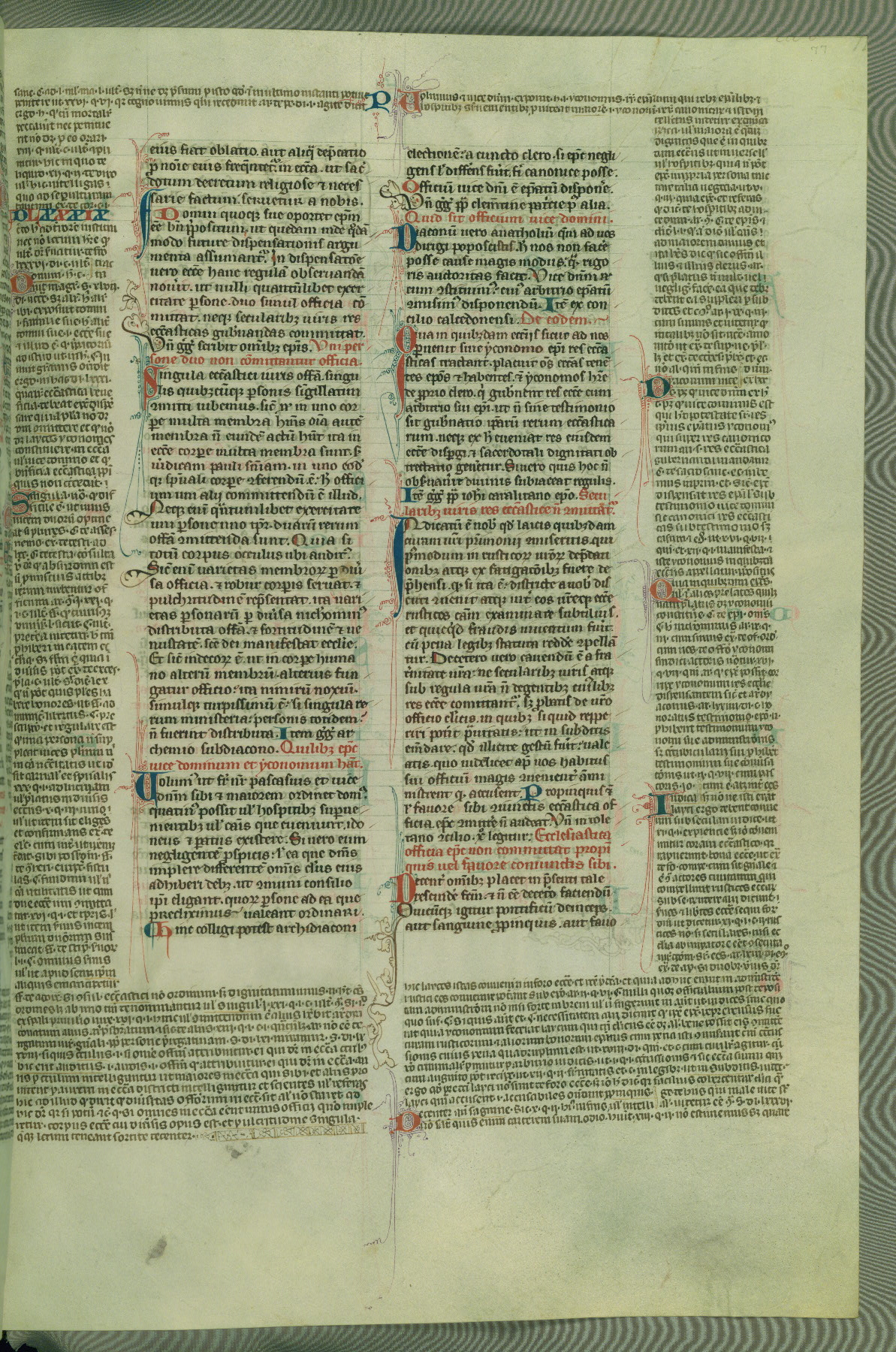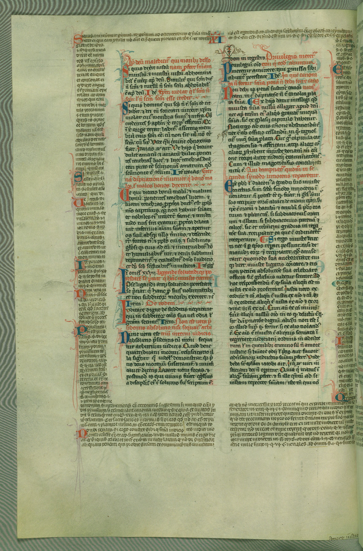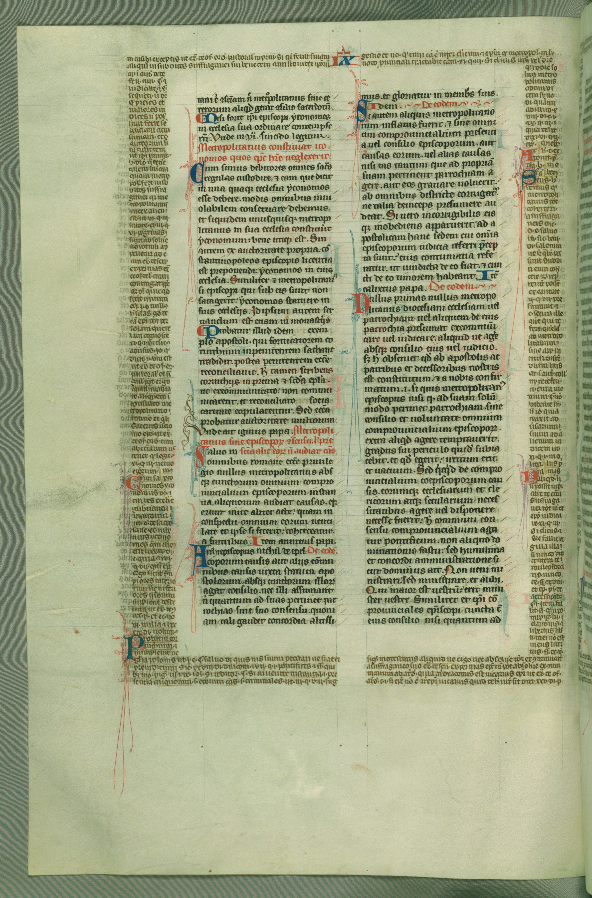 This deluxe version of Gratian's Decretum was created ca. 1280-90, most likely in Hainaut. The lively decoration of the manuscript indicates a marked taste for narrative, and there are thirty-seven historiated initials. The gloss work was completed by Bartholomew of Brescia. At first, Paris would seem to be the most likely place of origin, given that it was the leading center for the study of canon law. However, this particular manuscript exhibits scribal features that suggest its place of origin as being the Cistercian abbey of Cambron in Hainaut. Furthermore, Abbot Baudouin de Bousso, whose tenure at the abbey was from 1283 to 1293, was schooled in theology at the University of Paris, and he would eventually endorse the production of many fine manuscripts while at Cambron. In fact, the catalyst for this endeavor seems to have been the Beaupré Antiphonary (W.759-761), which was was created at Cambron during the 1280s. Stylistic features of W.133 seem to have connections with the Beaupré Antiphonary. For example, Cistercian monks are shown in three extant illuminations throughout three of the antiphonary volumes; these monks are pictured in brown habits similar to the type worn by clerics in W.133. The reliance upon Cistercian precedents for textual and design features associates W.133 with the Cistercian abbey at Cambron. However, more remains to be confirmed by further inspection of the output of the scriptorium at Cambron.