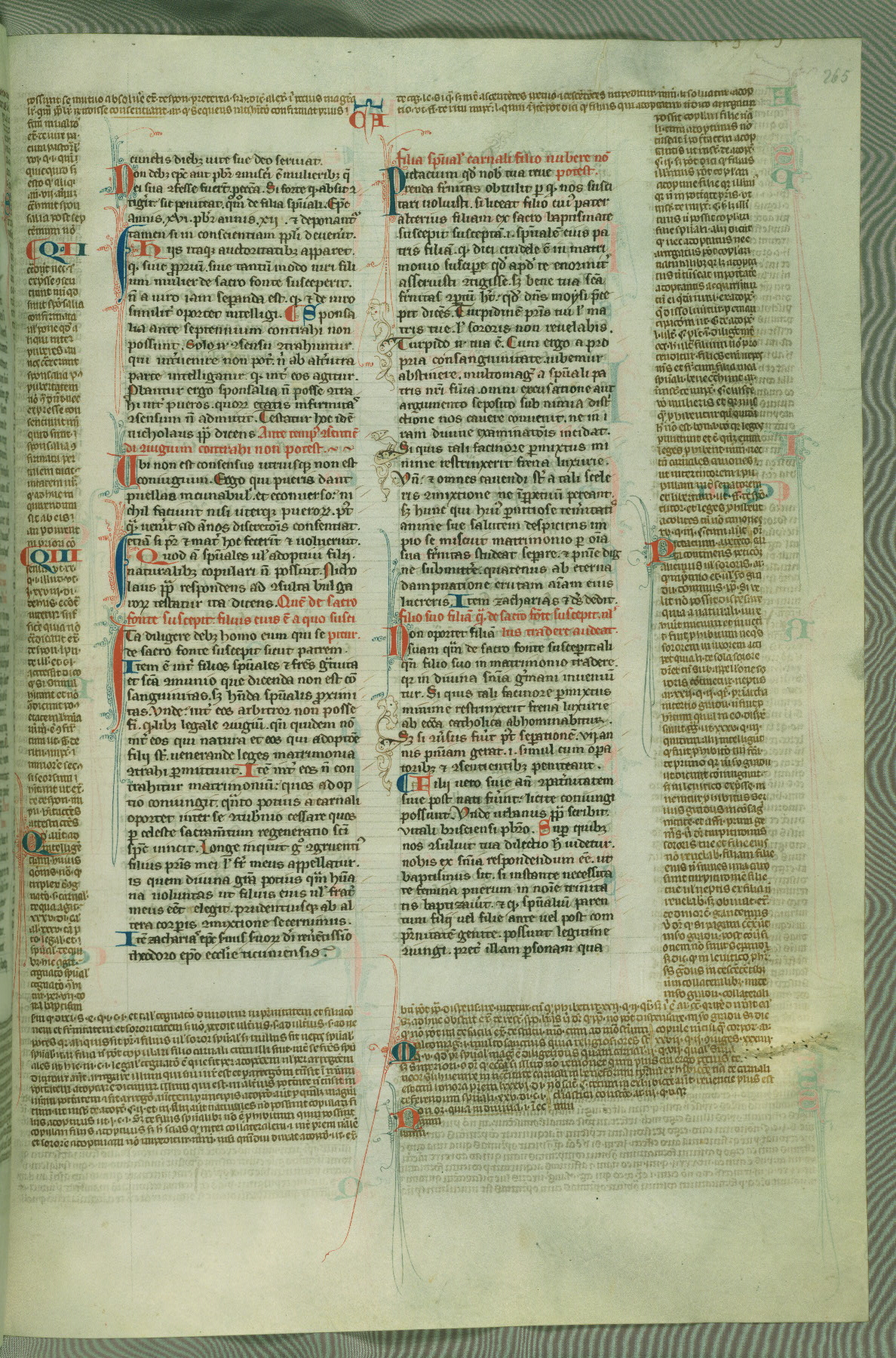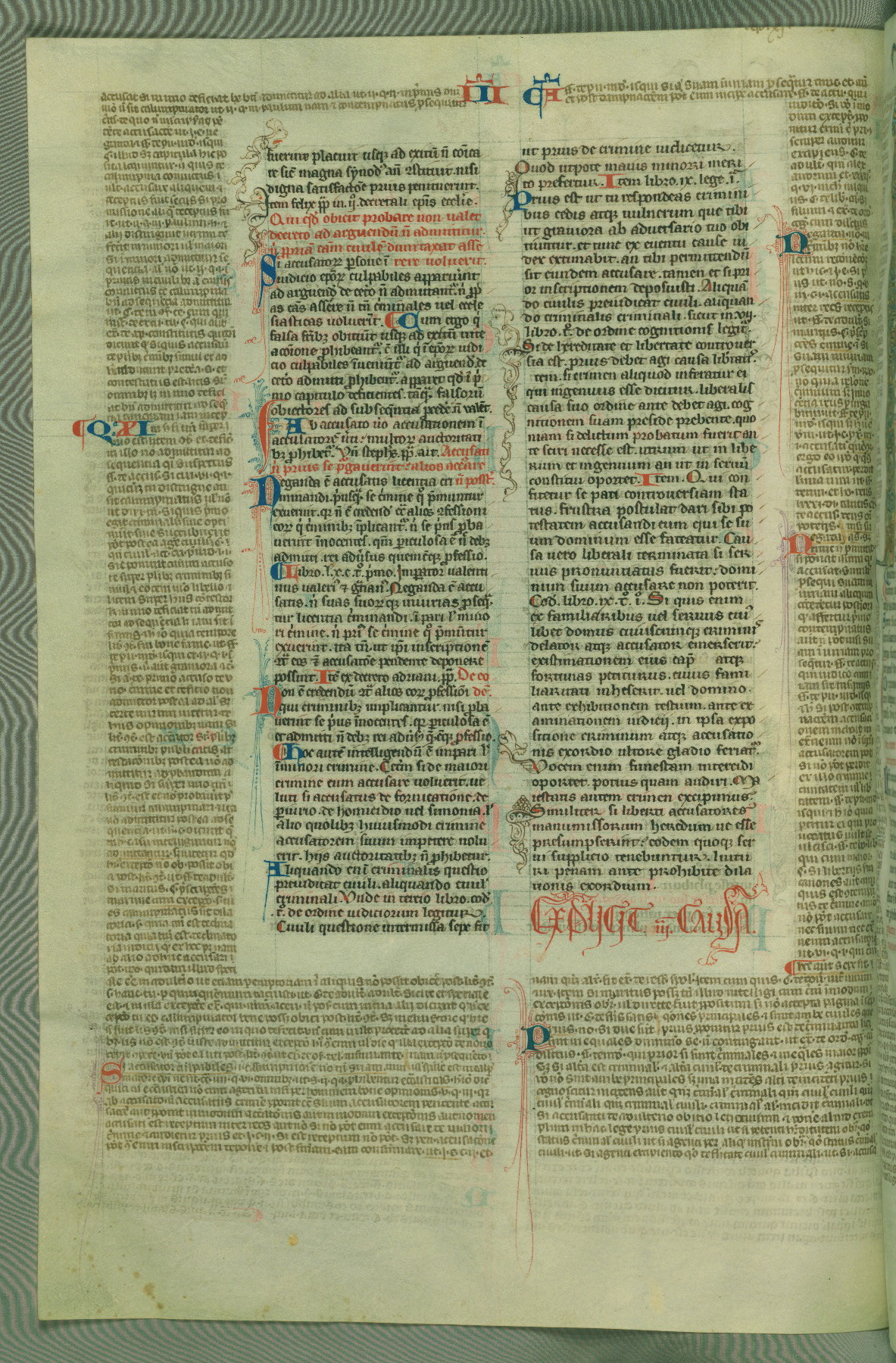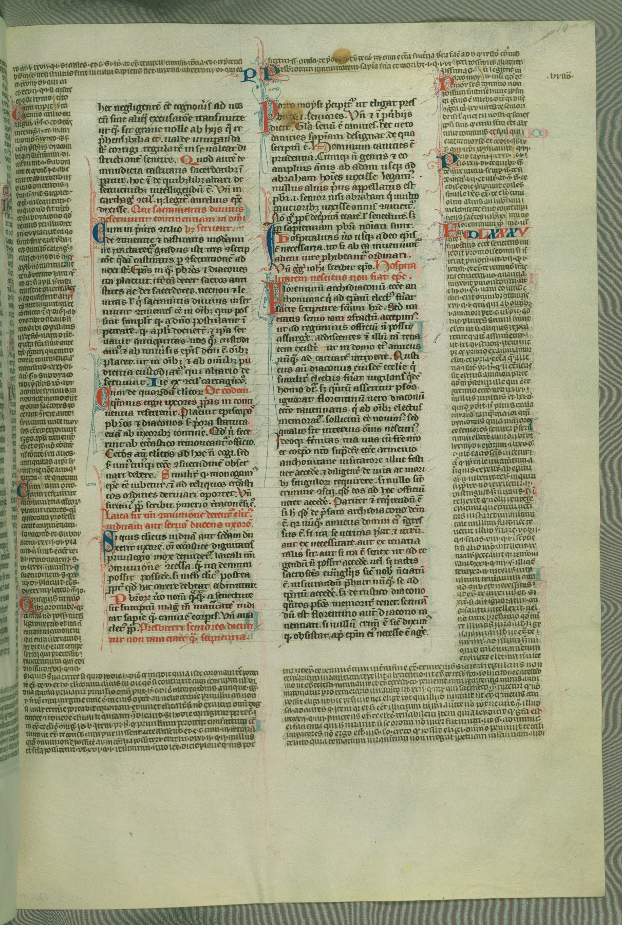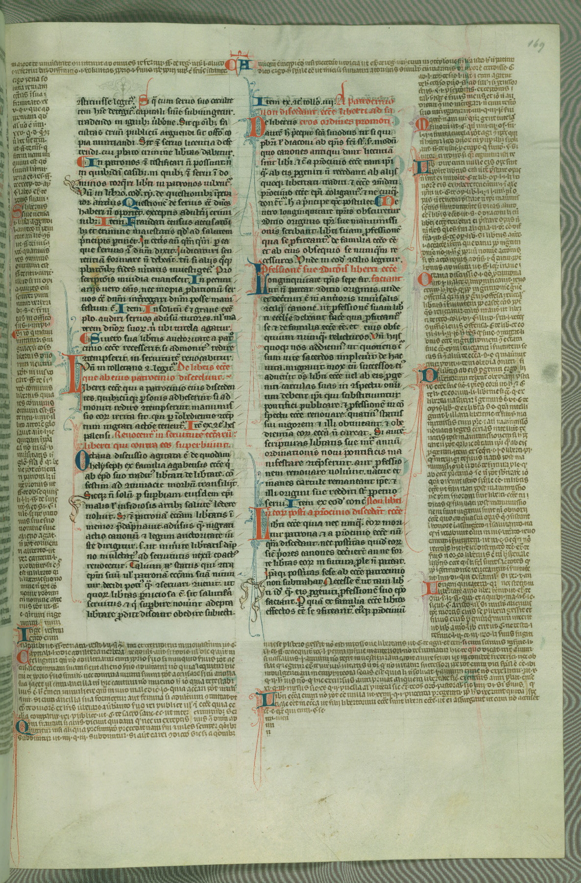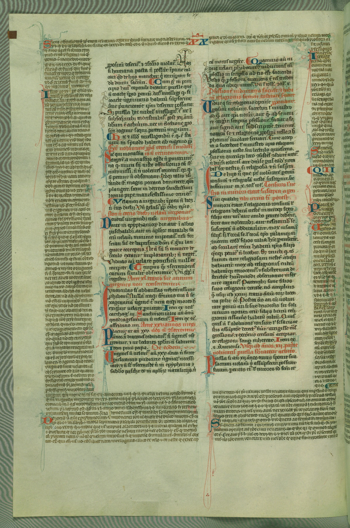 This deluxe version of Gratian's Decretum was created ca. 1280-90, most likely in Hainaut. The lively decoration of the manuscript indicates a marked taste for narrative, and there are thirty-seven historiated initials. The gloss work was completed by Bartholomew of Brescia. At first, Paris would seem to be the most likely place of origin, given that it was the leading center for the study of canon law. However, this particular manuscript exhibits scribal features that suggest its place of origin as being the Cistercian abbey of Cambron in Hainaut. Furthermore, Abbot Baudouin de Bousso, whose tenure at the abbey was from 1283 to 1293, was schooled in theology at the University of Paris, and he would eventually endorse the production of many fine manuscripts while at Cambron. In fact, the catalyst for this endeavor seems to have been the Beaupré Antiphonary (W.759-761), which was was created at Cambron during the 1280s. Stylistic features of W.133 seem to have connections with the Beaupré Antiphonary. For example, Cistercian monks are shown in three extant illuminations throughout three of the antiphonary volumes; these monks are pictured in brown habits similar to the type worn by clerics in W.133. The reliance upon Cistercian precedents for textual and design features associates W.133 with the Cistercian abbey at Cambron. However, more remains to be confirmed by further inspection of the output of the scriptorium at Cambron.