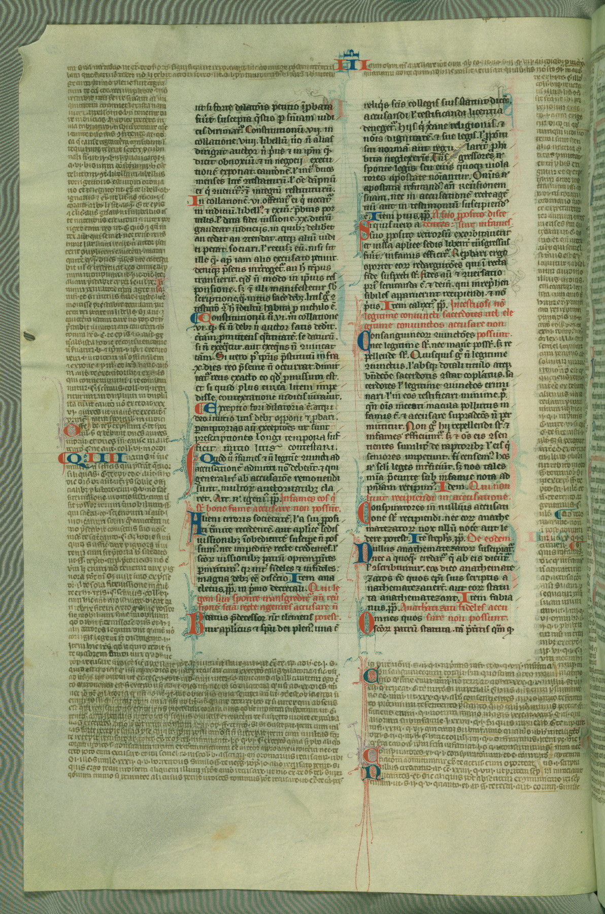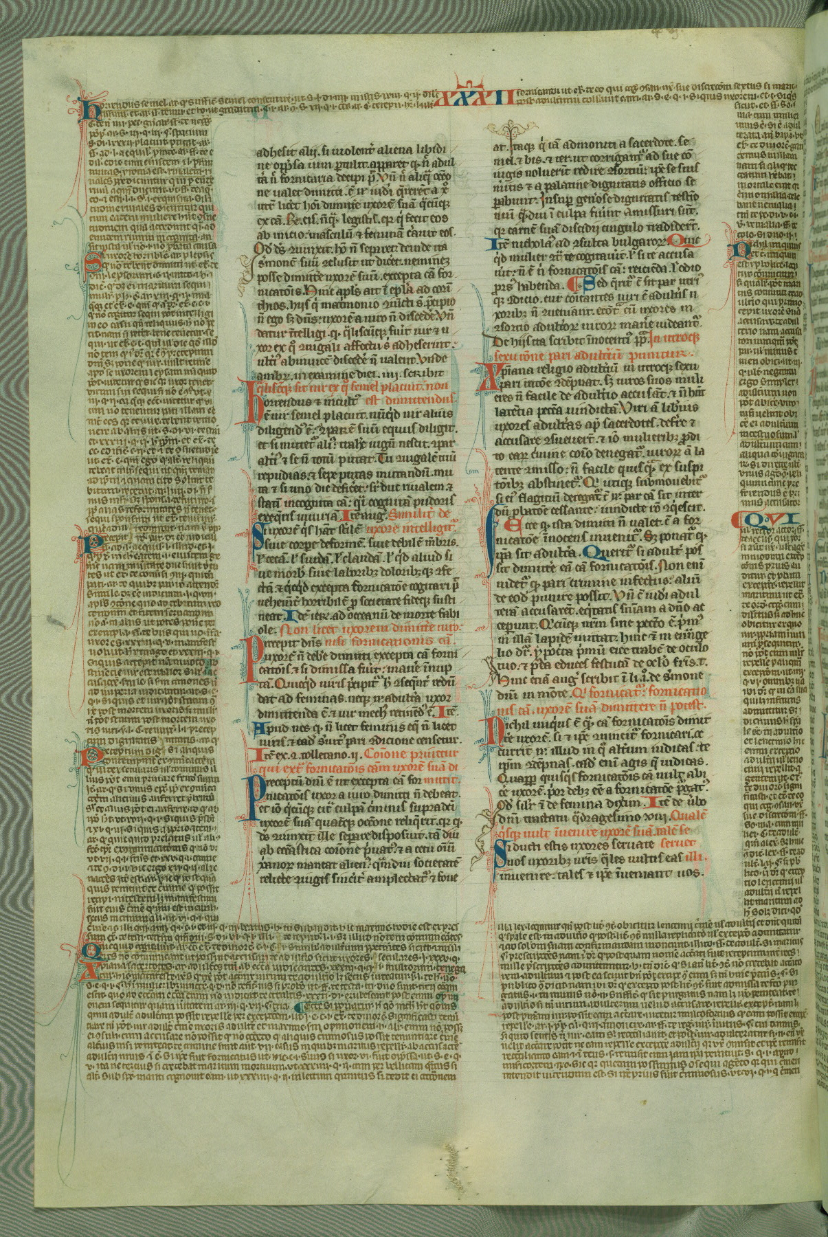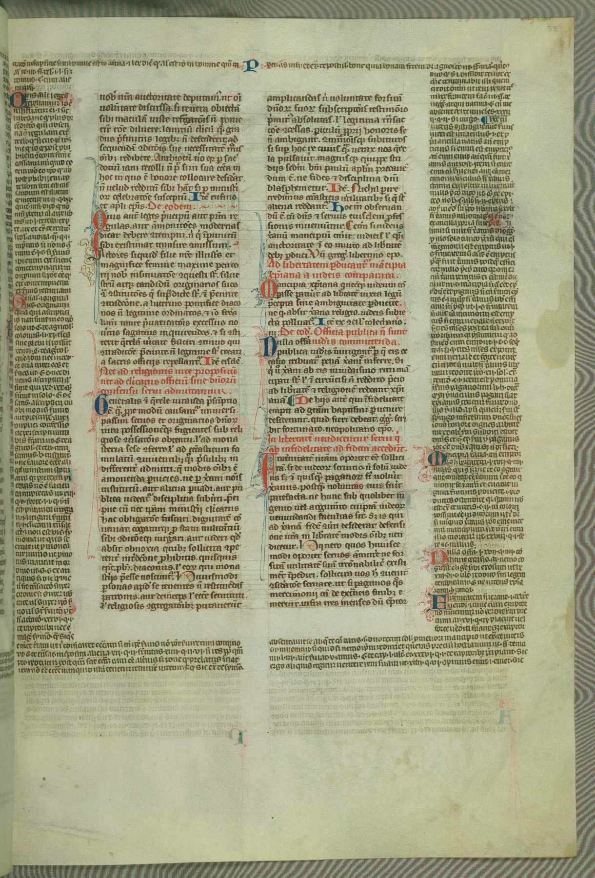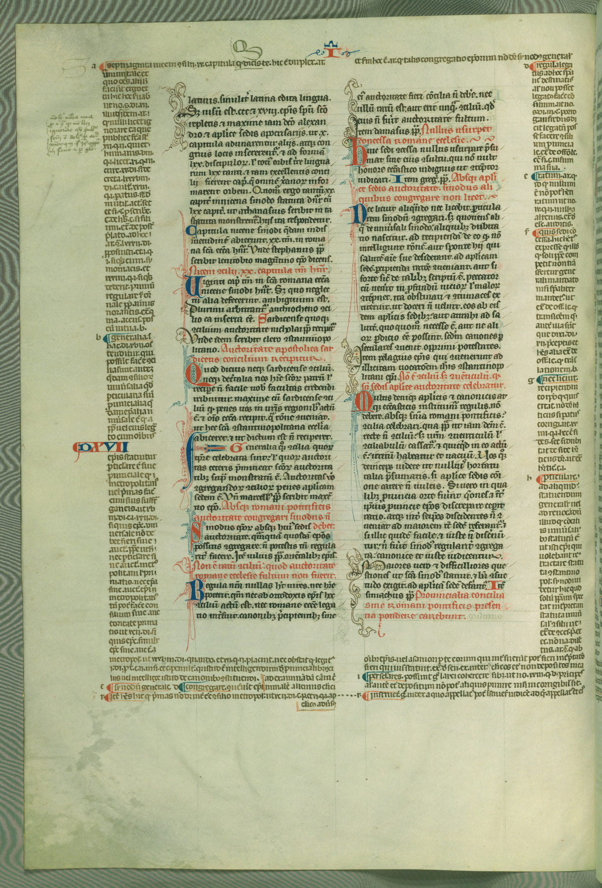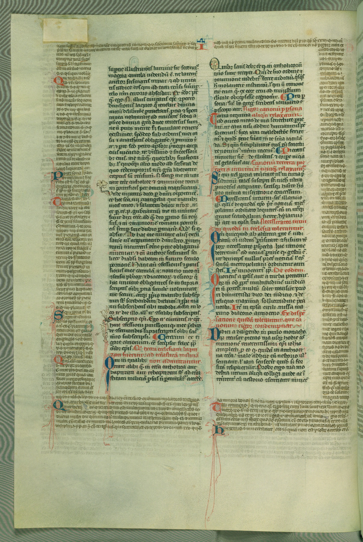 This deluxe version of Gratian's Decretum was created ca. 1280-90, most likely in Hainaut. The lively decoration of the manuscript indicates a marked taste for narrative, and there are thirty-seven historiated initials. The gloss work was completed by Bartholomew of Brescia. At first, Paris would seem to be the most likely place of origin, given that it was the leading center for the study of canon law. However, this particular manuscript exhibits scribal features that suggest its place of origin as being the Cistercian abbey of Cambron in Hainaut. Furthermore, Abbot Baudouin de Bousso, whose tenure at the abbey was from 1283 to 1293, was schooled in theology at the University of Paris, and he would eventually endorse the production of many fine manuscripts while at Cambron. In fact, the catalyst for this endeavor seems to have been the Beaupré Antiphonary (W.759-761), which was was created at Cambron during the 1280s. Stylistic features of W.133 seem to have connections with the Beaupré Antiphonary. For example, Cistercian monks are shown in three extant illuminations throughout three of the antiphonary volumes; these monks are pictured in brown habits similar to the type worn by clerics in W.133. The reliance upon Cistercian precedents for textual and design features associates W.133 with the Cistercian abbey at Cambron. However, more remains to be confirmed by further inspection of the output of the scriptorium at Cambron.