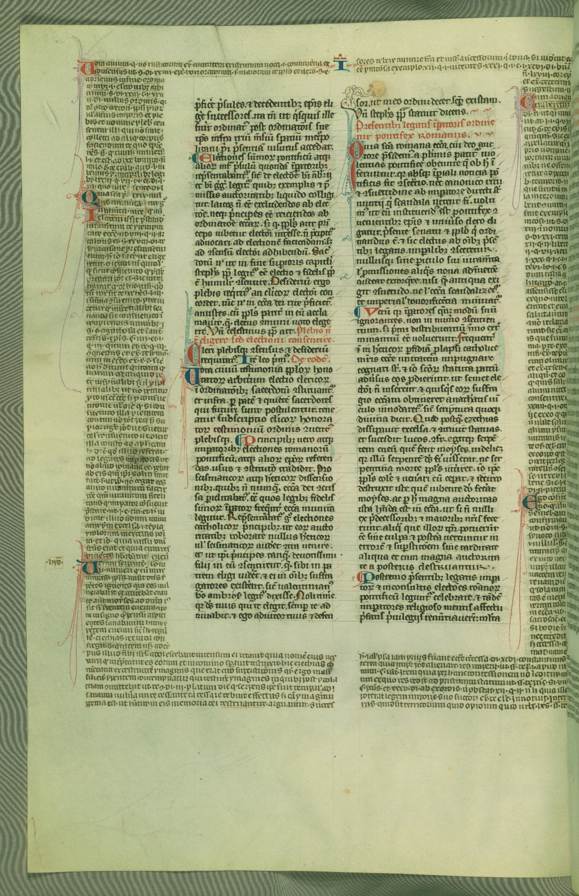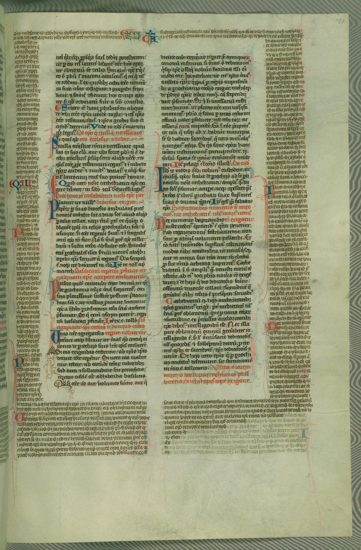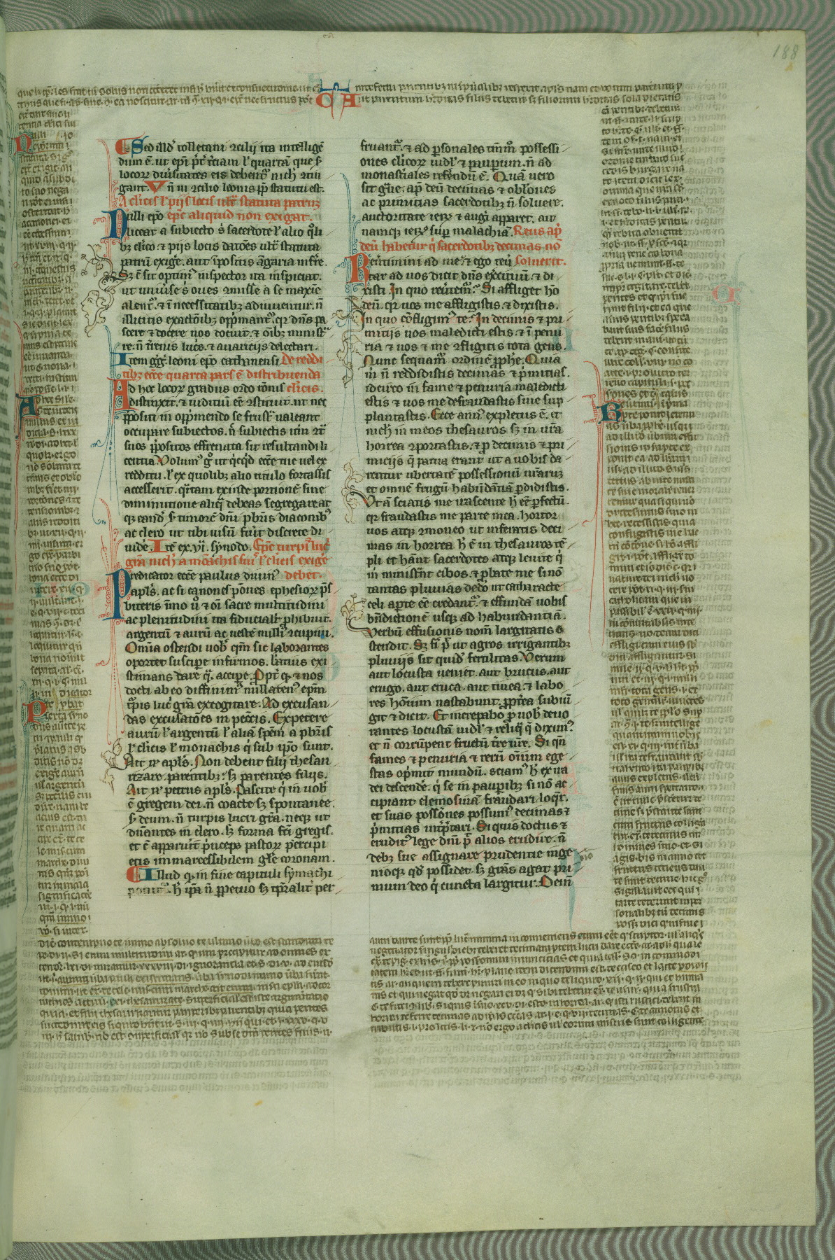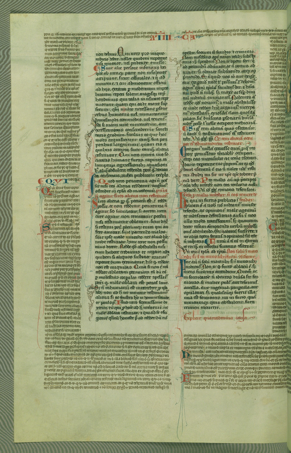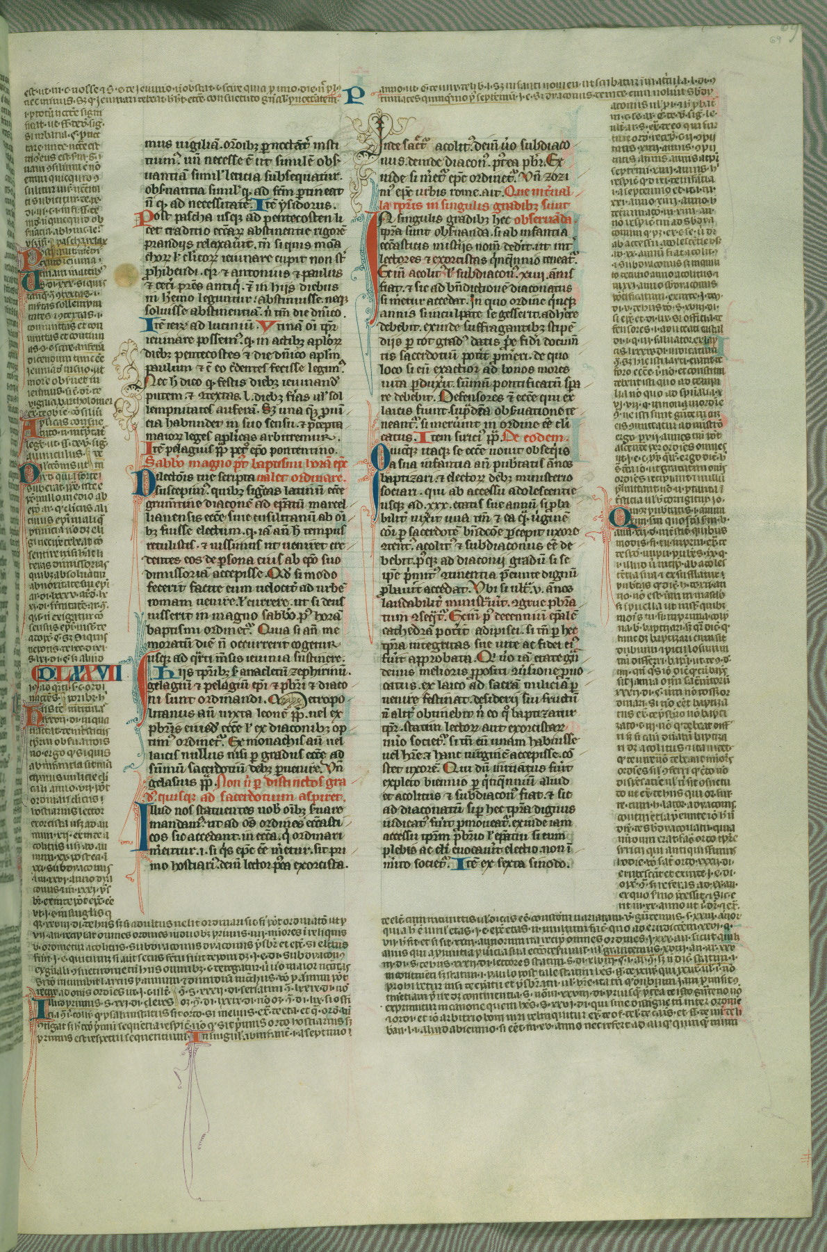 This deluxe version of Gratian's Decretum was created ca. 1280-90, most likely in Hainaut. The lively decoration of the manuscript indicates a marked taste for narrative, and there are thirty-seven historiated initials. The gloss work was completed by Bartholomew of Brescia. At first, Paris would seem to be the most likely place of origin, given that it was the leading center for the study of canon law. However, this particular manuscript exhibits scribal features that suggest its place of origin as being the Cistercian abbey of Cambron in Hainaut. Furthermore, Abbot Baudouin de Bousso, whose tenure at the abbey was from 1283 to 1293, was schooled in theology at the University of Paris, and he would eventually endorse the production of many fine manuscripts while at Cambron. In fact, the catalyst for this endeavor seems to have been the Beaupré Antiphonary (W.759-761), which was was created at Cambron during the 1280s. Stylistic features of W.133 seem to have connections with the Beaupré Antiphonary. For example, Cistercian monks are shown in three extant illuminations throughout three of the antiphonary volumes; these monks are pictured in brown habits similar to the type worn by clerics in W.133. The reliance upon Cistercian precedents for textual and design features associates W.133 with the Cistercian abbey at Cambron. However, more remains to be confirmed by further inspection of the output of the scriptorium at Cambron.
