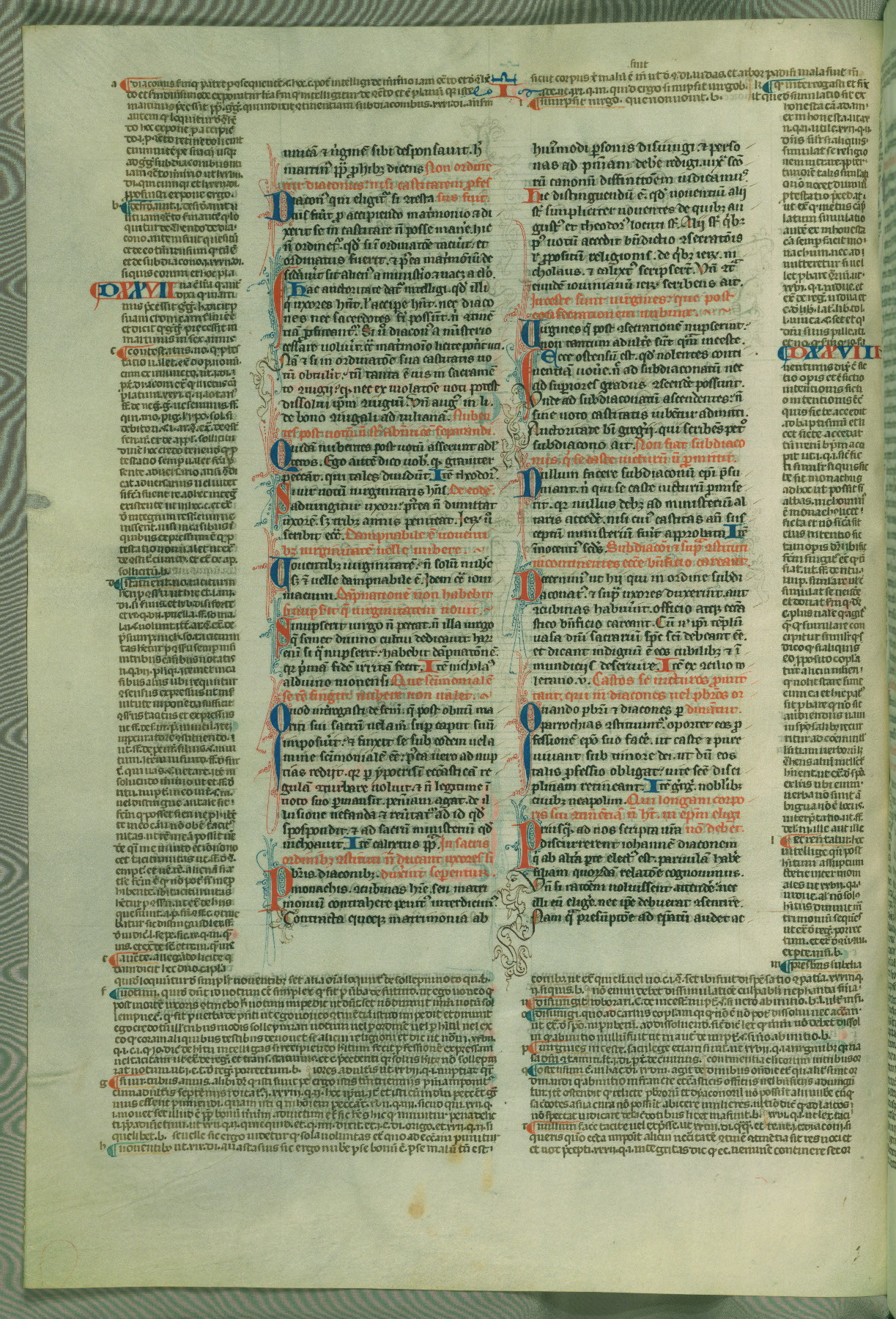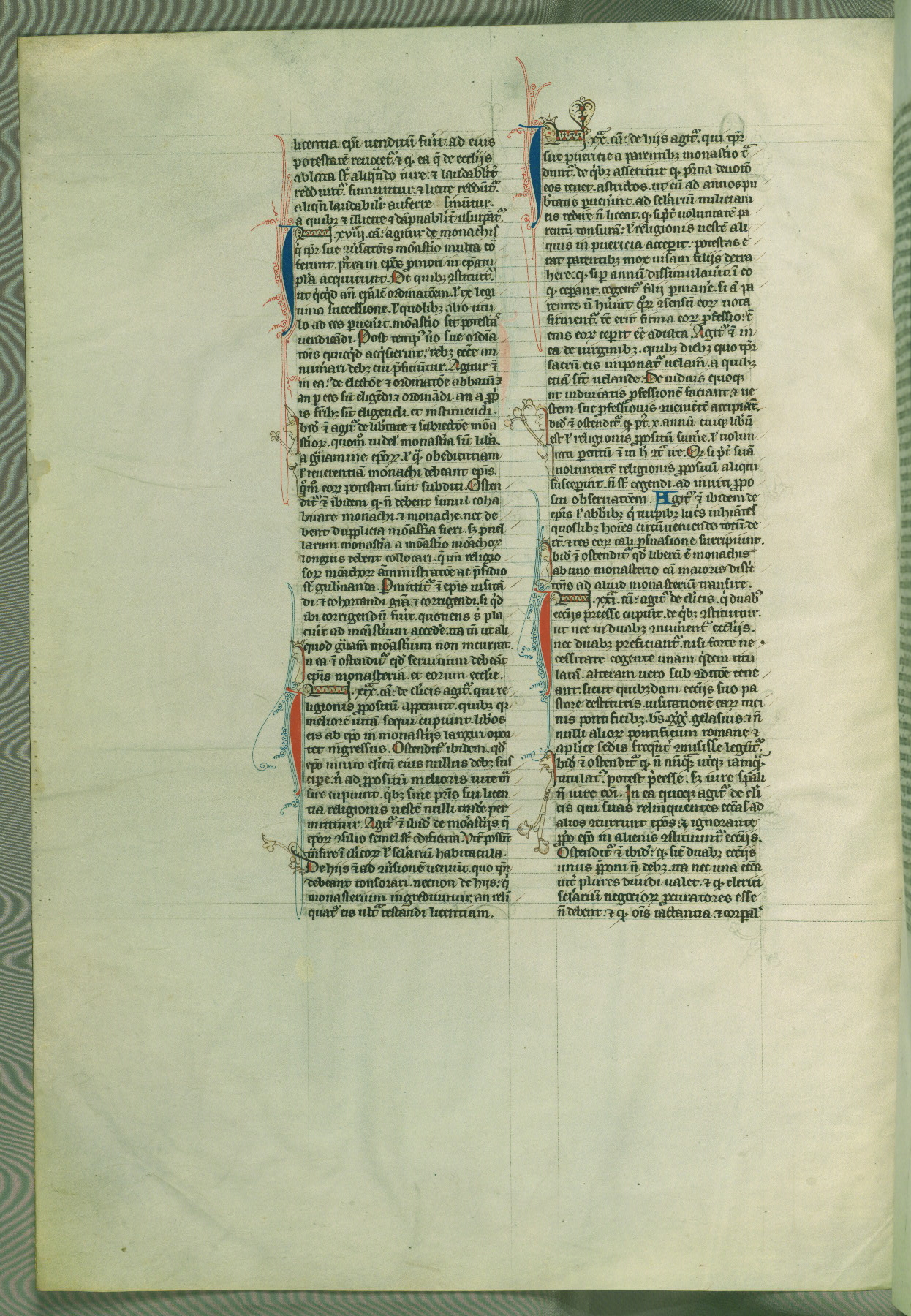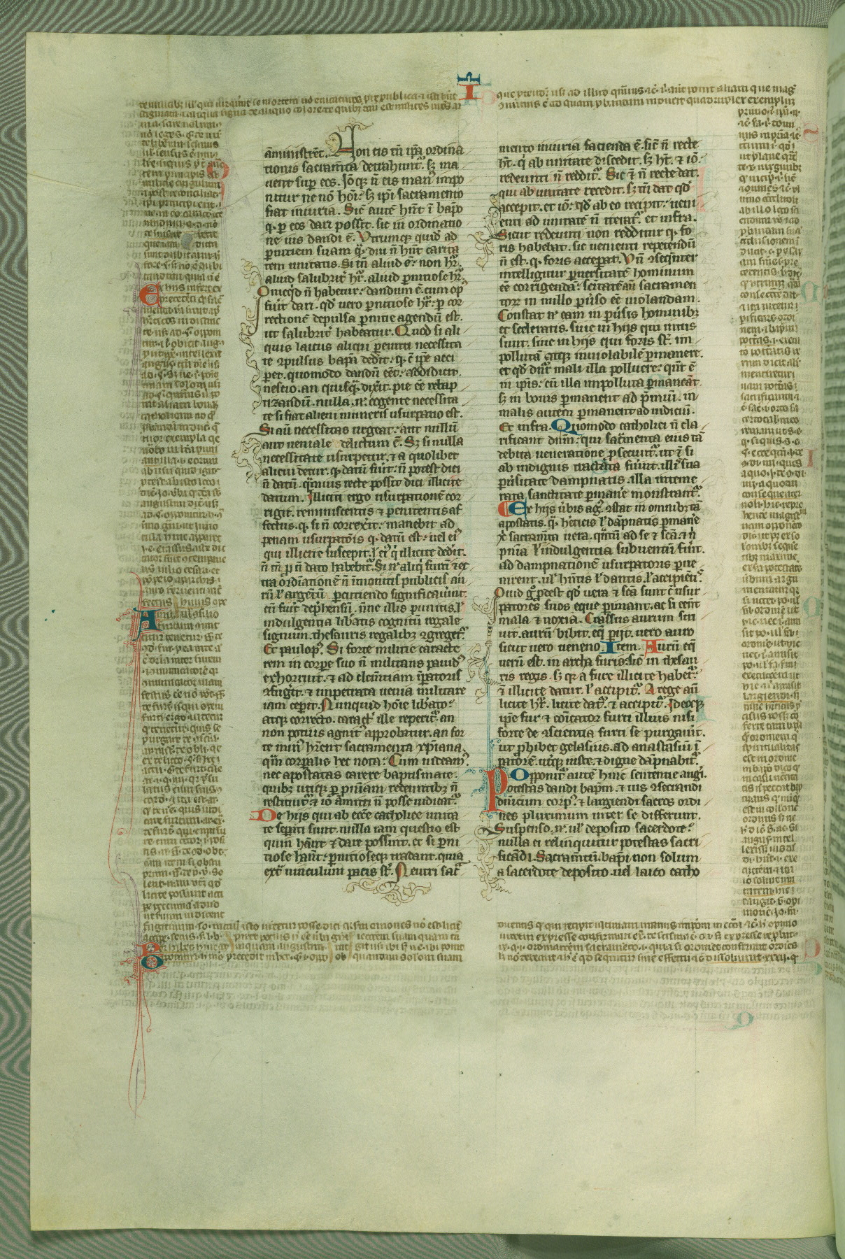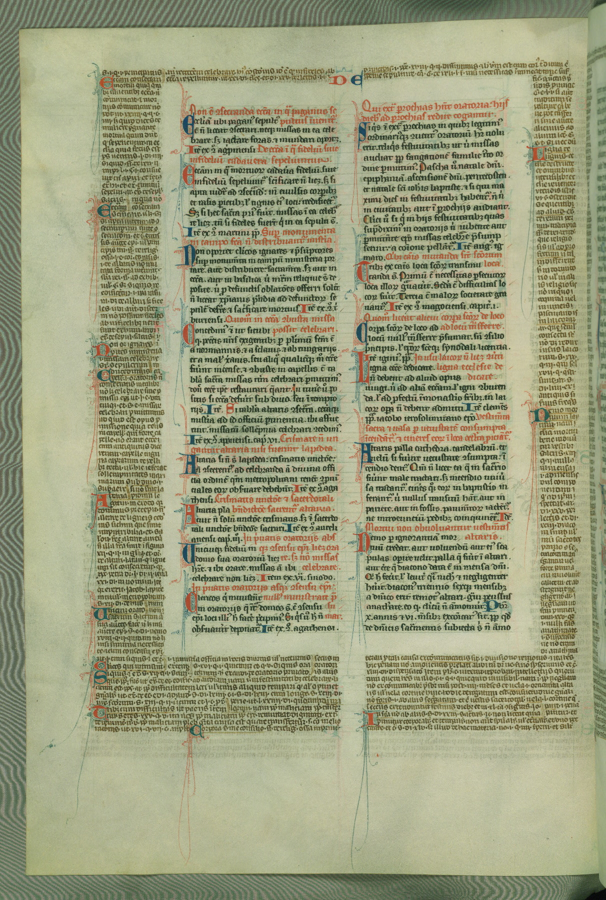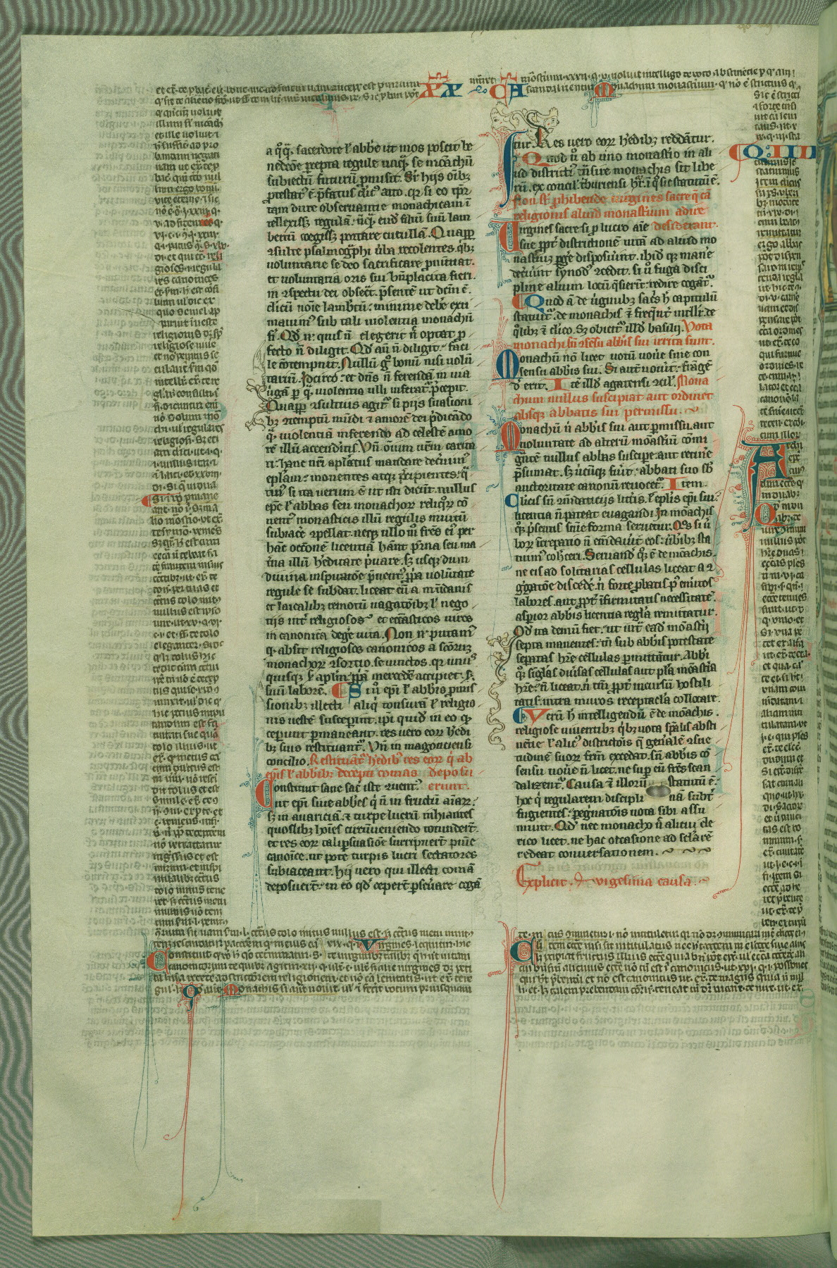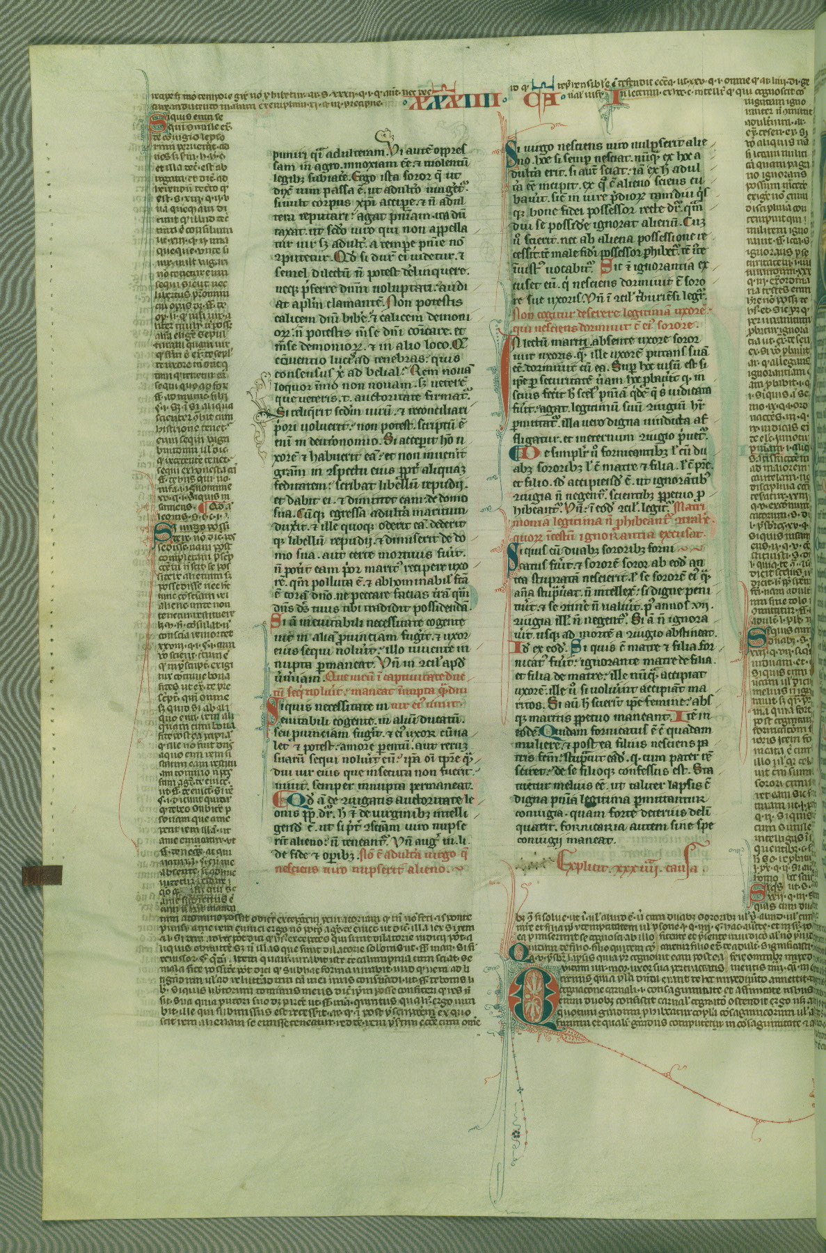 This deluxe version of Gratian's Decretum was created ca. 1280-90, most likely in Hainaut. The lively decoration of the manuscript indicates a marked taste for narrative, and there are thirty-seven historiated initials. The gloss work was completed by Bartholomew of Brescia. At first, Paris would seem to be the most likely place of origin, given that it was the leading center for the study of canon law. However, this particular manuscript exhibits scribal features that suggest its place of origin as being the Cistercian abbey of Cambron in Hainaut. Furthermore, Abbot Baudouin de Bousso, whose tenure at the abbey was from 1283 to 1293, was schooled in theology at the University of Paris, and he would eventually endorse the production of many fine manuscripts while at Cambron. In fact, the catalyst for this endeavor seems to have been the Beaupré Antiphonary (W.759-761), which was was created at Cambron during the 1280s. Stylistic features of W.133 seem to have connections with the Beaupré Antiphonary. For example, Cistercian monks are shown in three extant illuminations throughout three of the antiphonary volumes; these monks are pictured in brown habits similar to the type worn by clerics in W.133. The reliance upon Cistercian precedents for textual and design features associates W.133 with the Cistercian abbey at Cambron. However, more remains to be confirmed by further inspection of the output of the scriptorium at Cambron.
