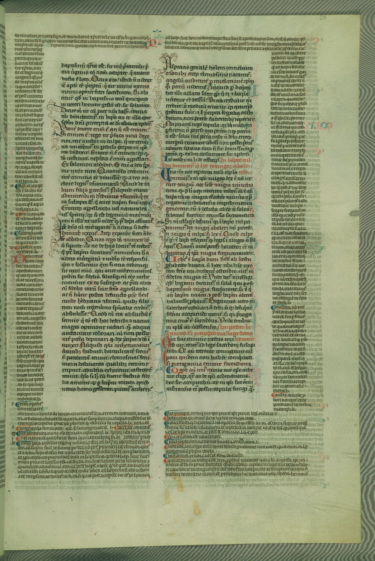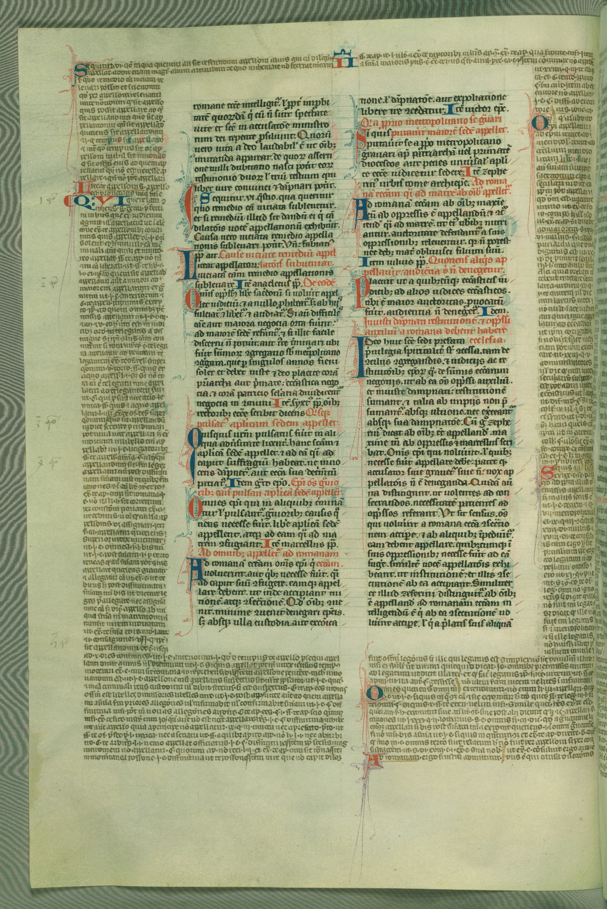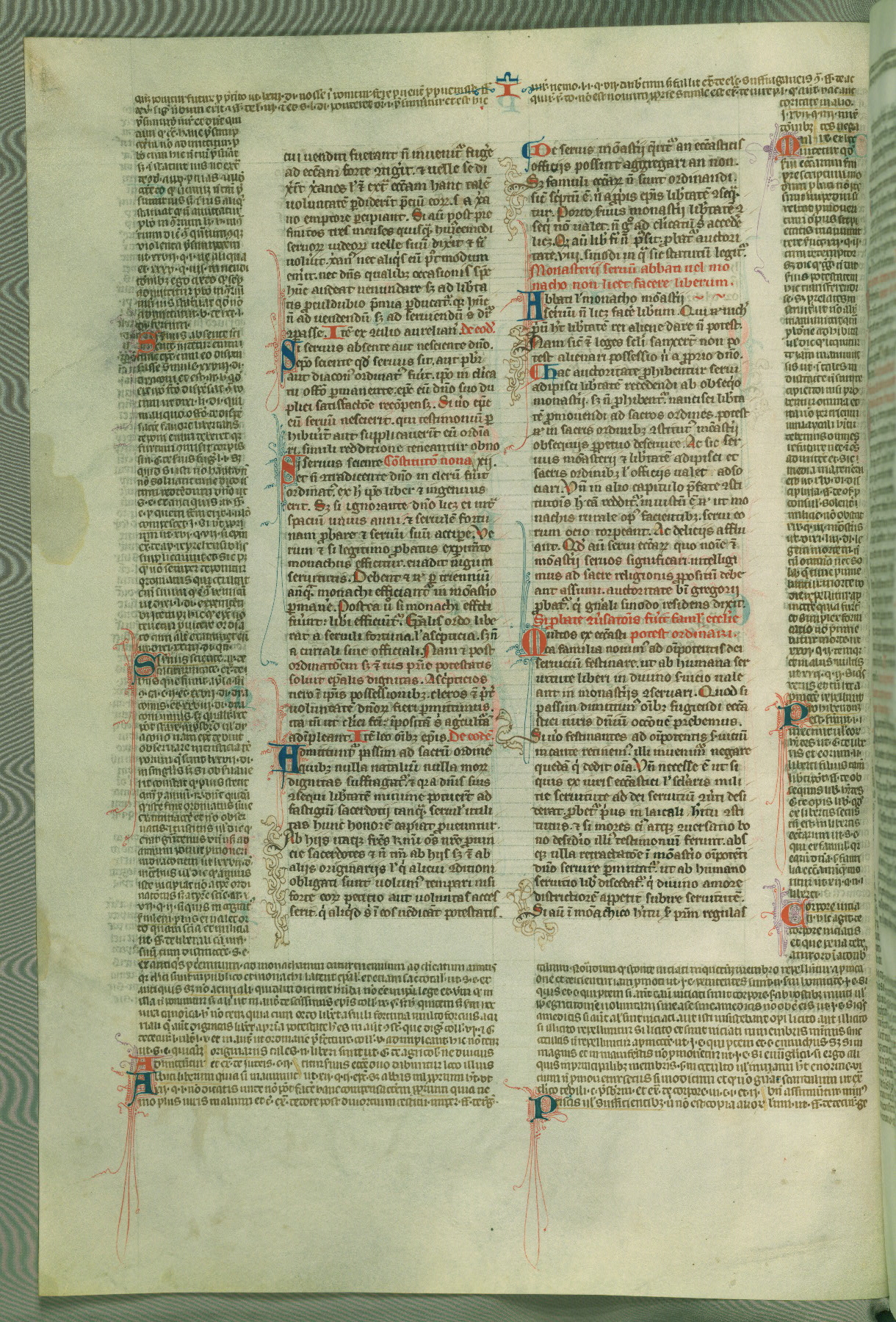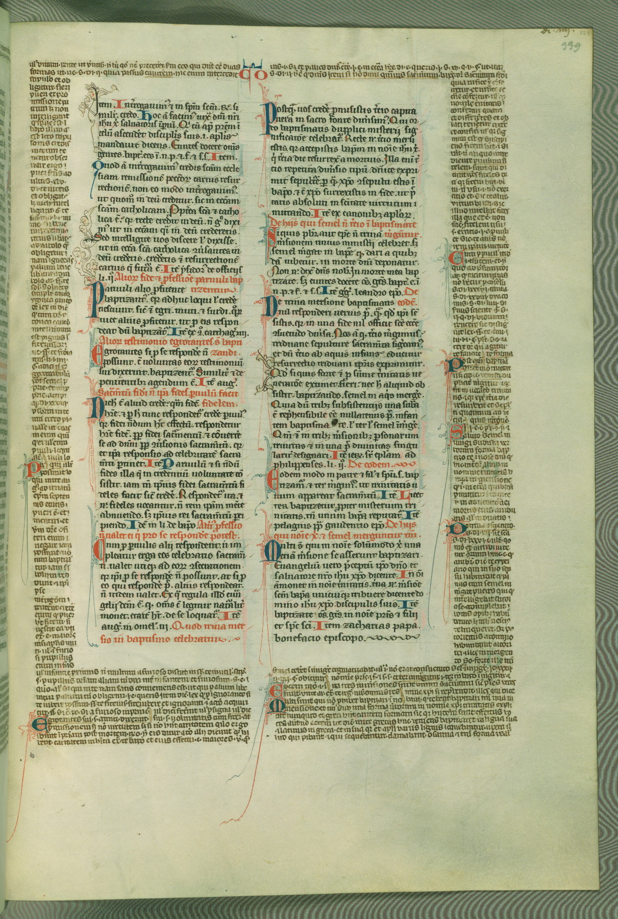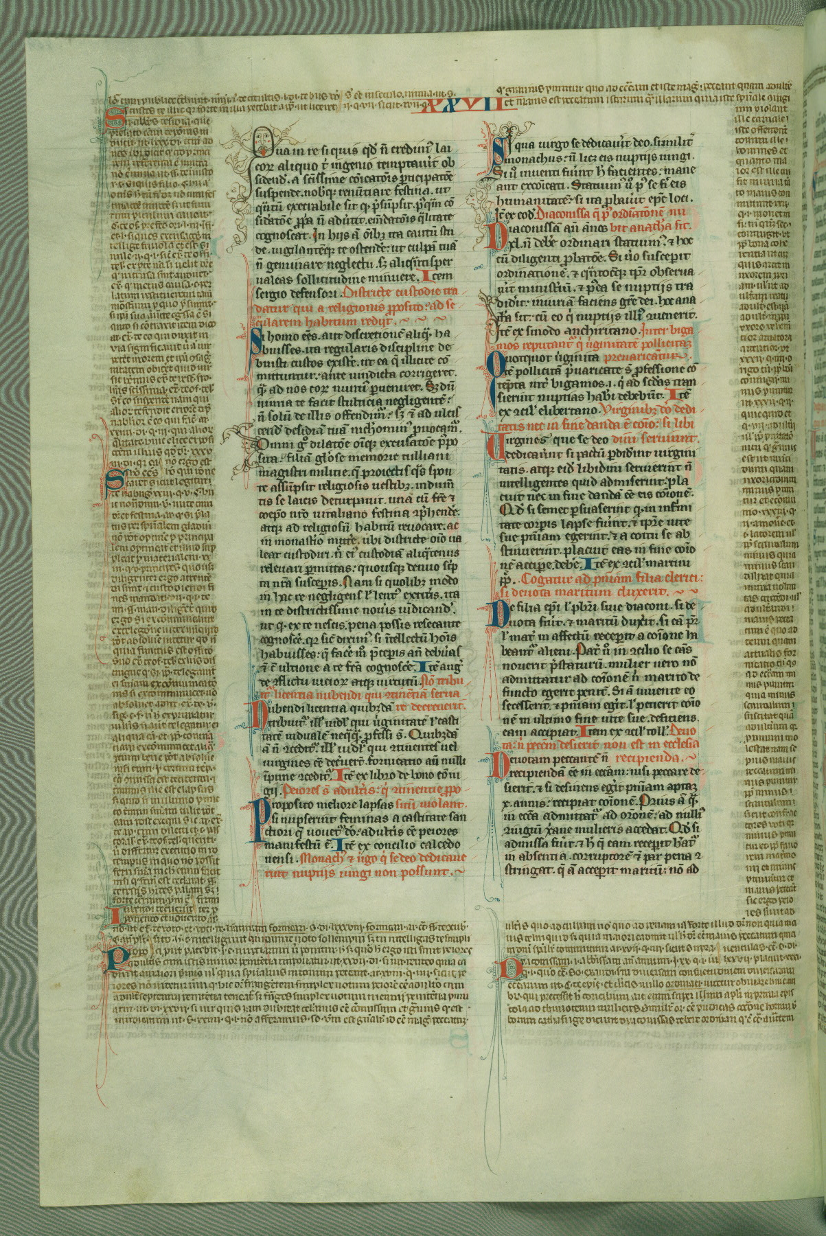 This deluxe version of Gratian's Decretum was created ca. 1280-90, most likely in Hainaut. The lively decoration of the manuscript indicates a marked taste for narrative, and there are thirty-seven historiated initials. The gloss work was completed by Bartholomew of Brescia. At first, Paris would seem to be the most likely place of origin, given that it was the leading center for the study of canon law. However, this particular manuscript exhibits scribal features that suggest its place of origin as being the Cistercian abbey of Cambron in Hainaut. Furthermore, Abbot Baudouin de Bousso, whose tenure at the abbey was from 1283 to 1293, was schooled in theology at the University of Paris, and he would eventually endorse the production of many fine manuscripts while at Cambron. In fact, the catalyst for this endeavor seems to have been the Beaupré Antiphonary (W.759-761), which was was created at Cambron during the 1280s. Stylistic features of W.133 seem to have connections with the Beaupré Antiphonary. For example, Cistercian monks are shown in three extant illuminations throughout three of the antiphonary volumes; these monks are pictured in brown habits similar to the type worn by clerics in W.133. The reliance upon Cistercian precedents for textual and design features associates W.133 with the Cistercian abbey at Cambron. However, more remains to be confirmed by further inspection of the output of the scriptorium at Cambron.