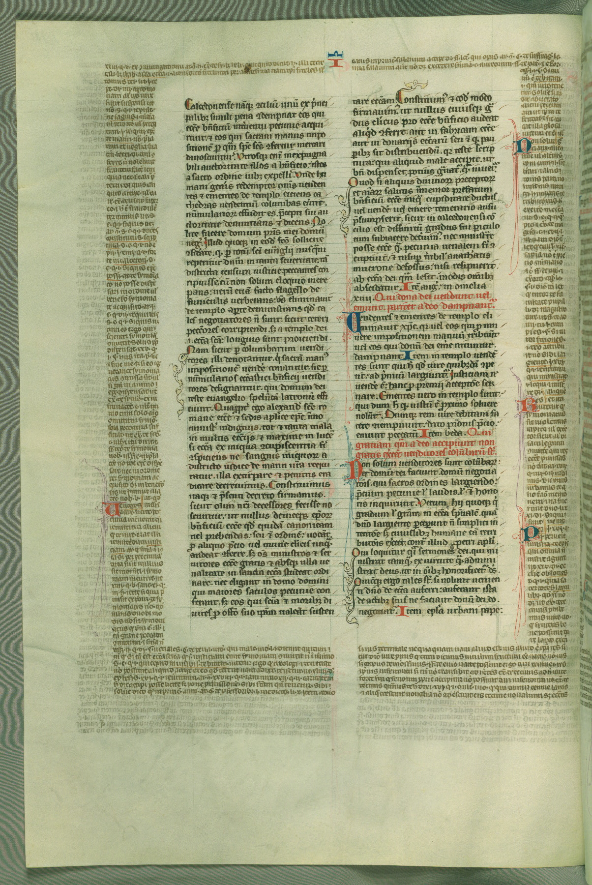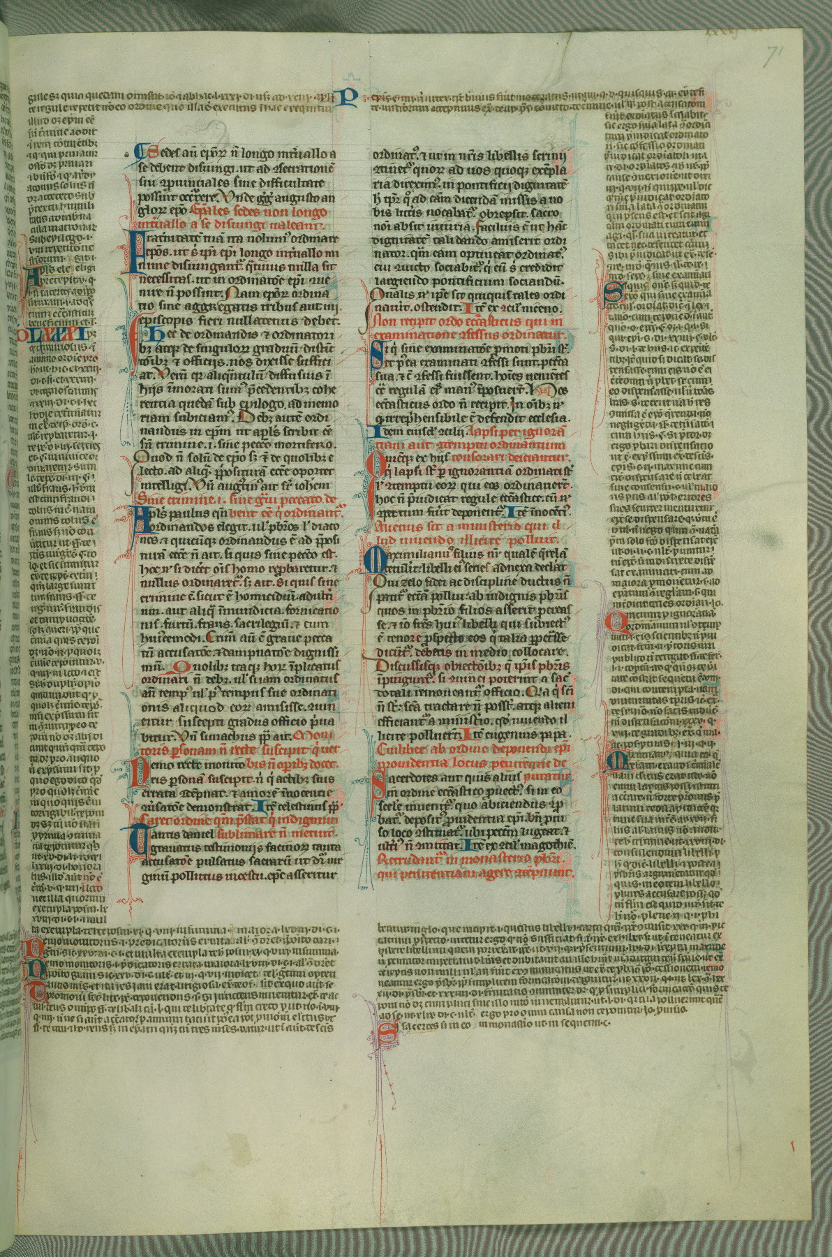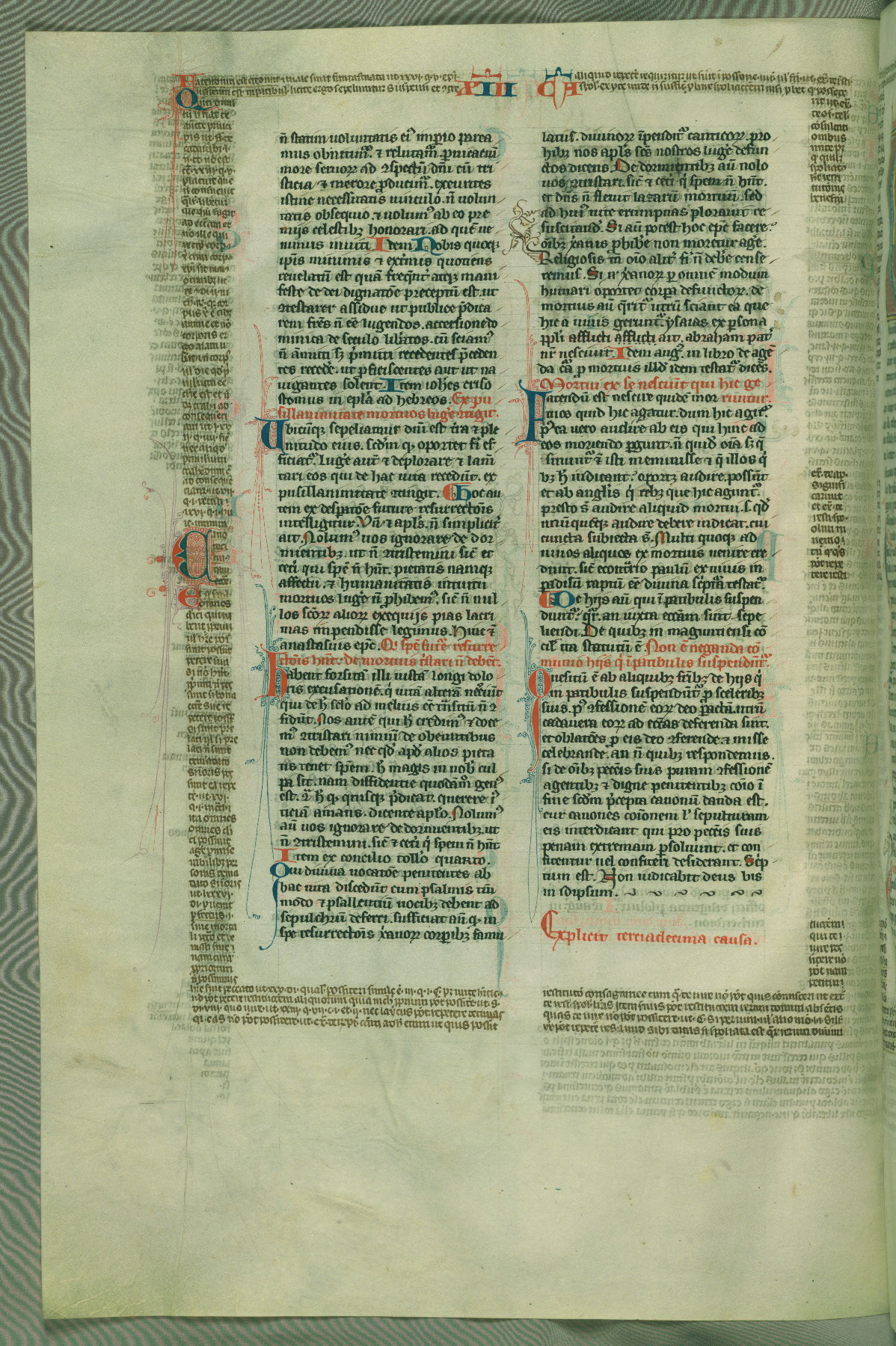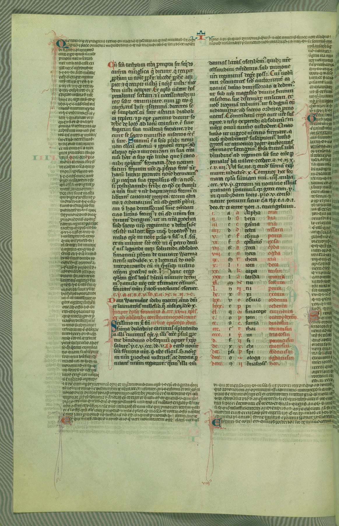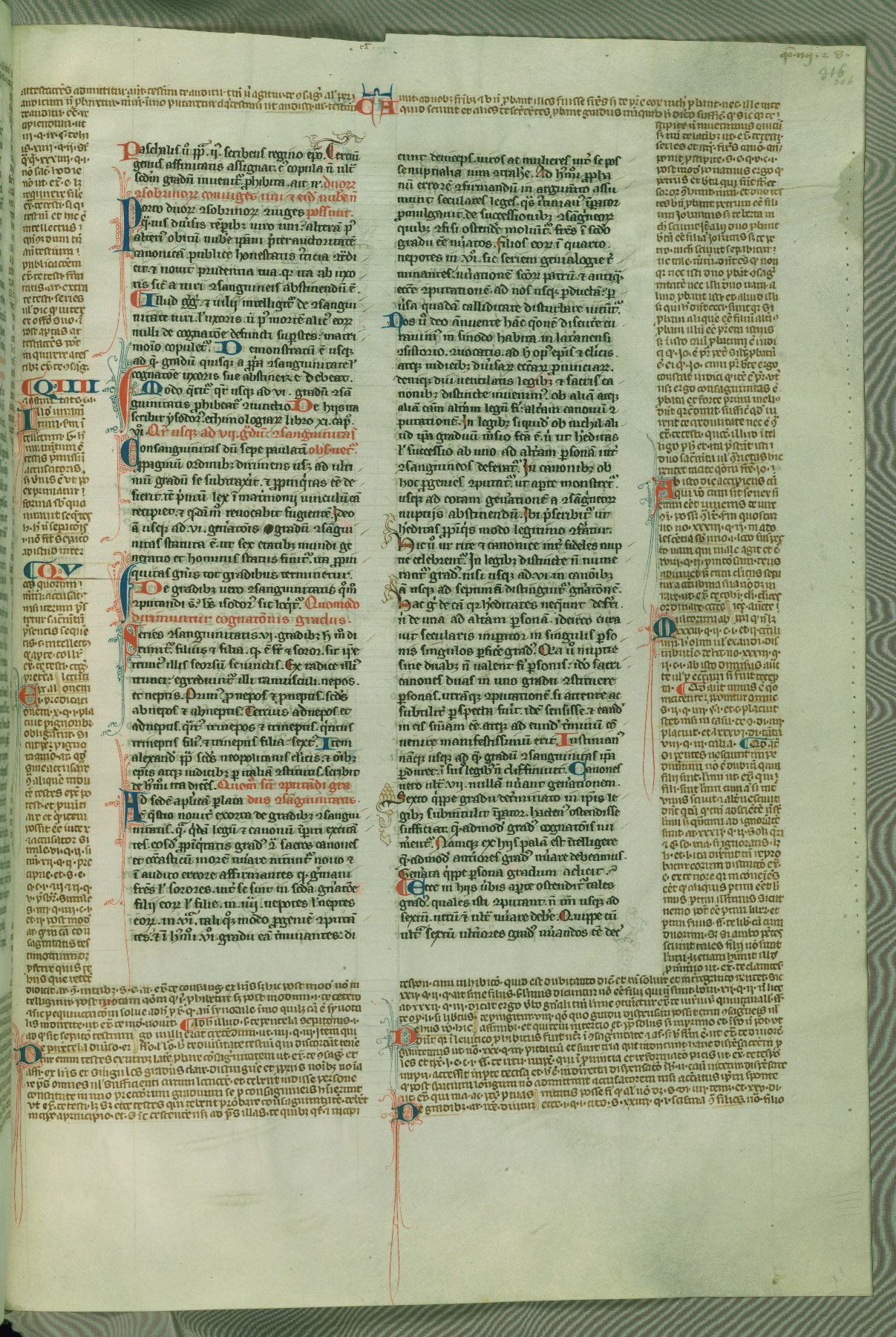 This deluxe version of Gratian's Decretum was created ca. 1280-90, most likely in Hainaut. The lively decoration of the manuscript indicates a marked taste for narrative, and there are thirty-seven historiated initials. The gloss work was completed by Bartholomew of Brescia. At first, Paris would seem to be the most likely place of origin, given that it was the leading center for the study of canon law. However, this particular manuscript exhibits scribal features that suggest its place of origin as being the Cistercian abbey of Cambron in Hainaut. Furthermore, Abbot Baudouin de Bousso, whose tenure at the abbey was from 1283 to 1293, was schooled in theology at the University of Paris, and he would eventually endorse the production of many fine manuscripts while at Cambron. In fact, the catalyst for this endeavor seems to have been the Beaupré Antiphonary (W.759-761), which was was created at Cambron during the 1280s. Stylistic features of W.133 seem to have connections with the Beaupré Antiphonary. For example, Cistercian monks are shown in three extant illuminations throughout three of the antiphonary volumes; these monks are pictured in brown habits similar to the type worn by clerics in W.133. The reliance upon Cistercian precedents for textual and design features associates W.133 with the Cistercian abbey at Cambron. However, more remains to be confirmed by further inspection of the output of the scriptorium at Cambron.