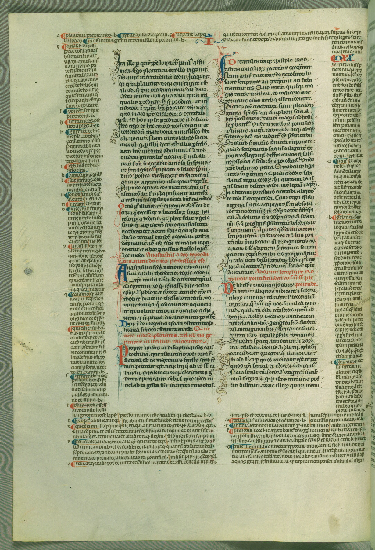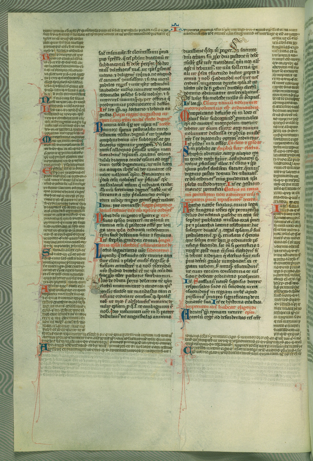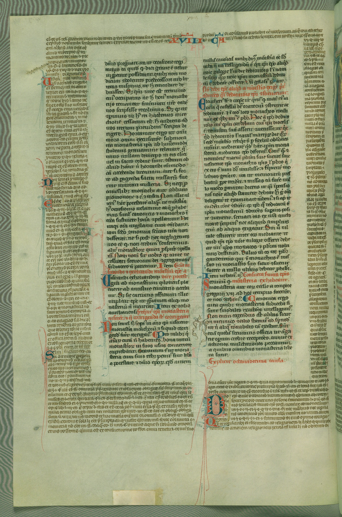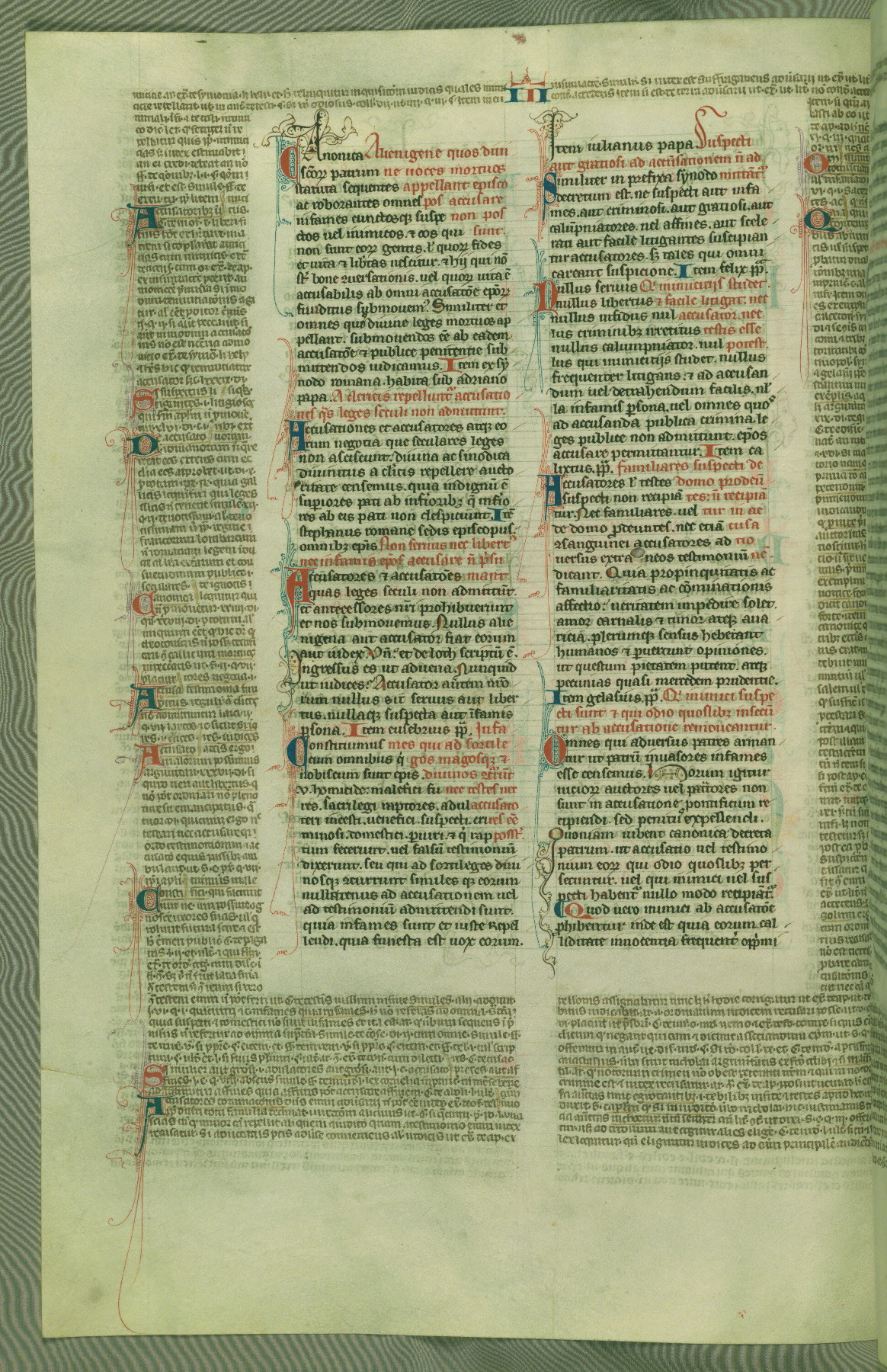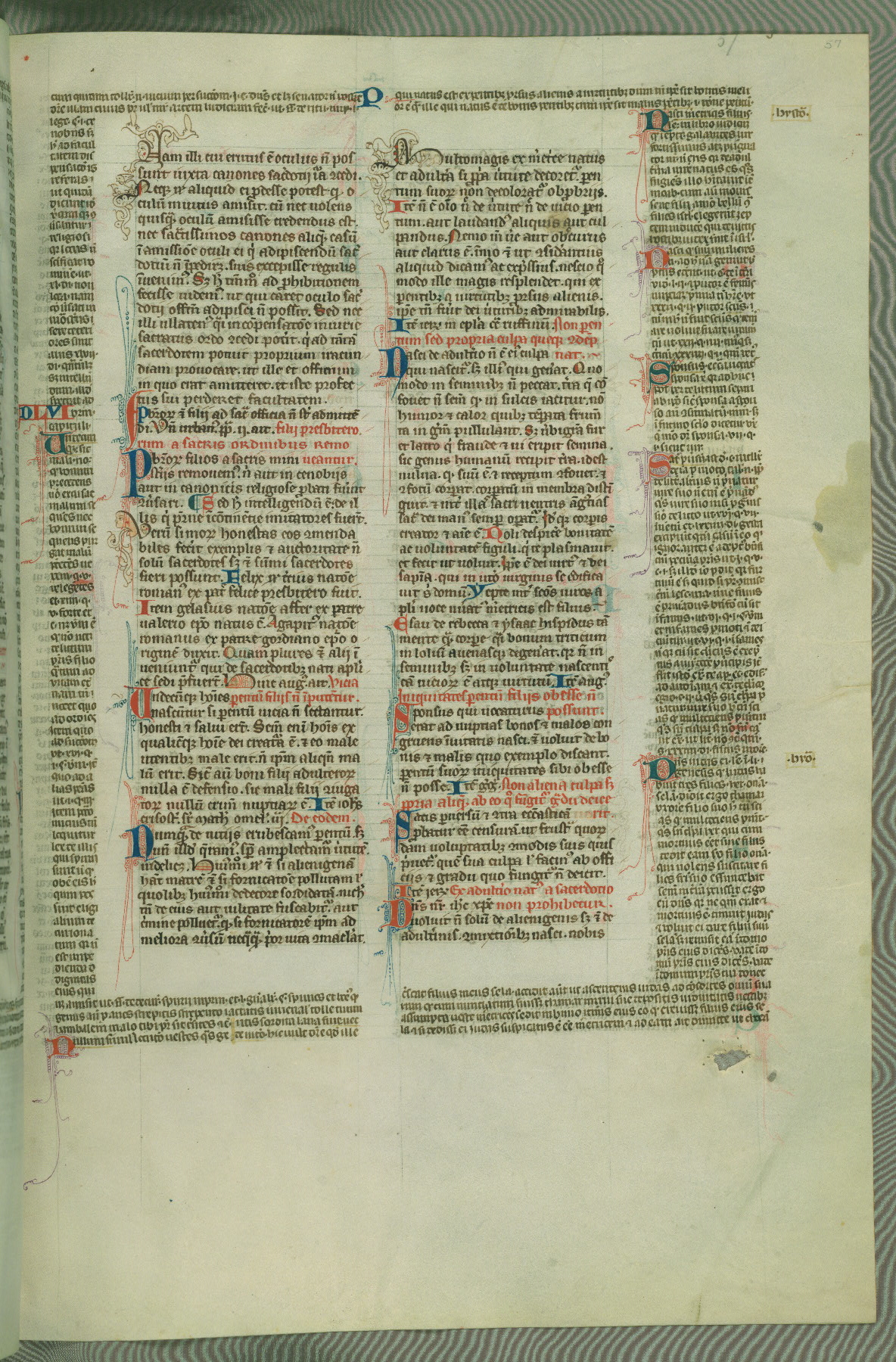 This deluxe version of Gratian's Decretum was created ca. 1280-90, most likely in Hainaut. The lively decoration of the manuscript indicates a marked taste for narrative, and there are thirty-seven historiated initials. The gloss work was completed by Bartholomew of Brescia. At first, Paris would seem to be the most likely place of origin, given that it was the leading center for the study of canon law. However, this particular manuscript exhibits scribal features that suggest its place of origin as being the Cistercian abbey of Cambron in Hainaut. Furthermore, Abbot Baudouin de Bousso, whose tenure at the abbey was from 1283 to 1293, was schooled in theology at the University of Paris, and he would eventually endorse the production of many fine manuscripts while at Cambron. In fact, the catalyst for this endeavor seems to have been the Beaupré Antiphonary (W.759-761), which was was created at Cambron during the 1280s. Stylistic features of W.133 seem to have connections with the Beaupré Antiphonary. For example, Cistercian monks are shown in three extant illuminations throughout three of the antiphonary volumes; these monks are pictured in brown habits similar to the type worn by clerics in W.133. The reliance upon Cistercian precedents for textual and design features associates W.133 with the Cistercian abbey at Cambron. However, more remains to be confirmed by further inspection of the output of the scriptorium at Cambron.