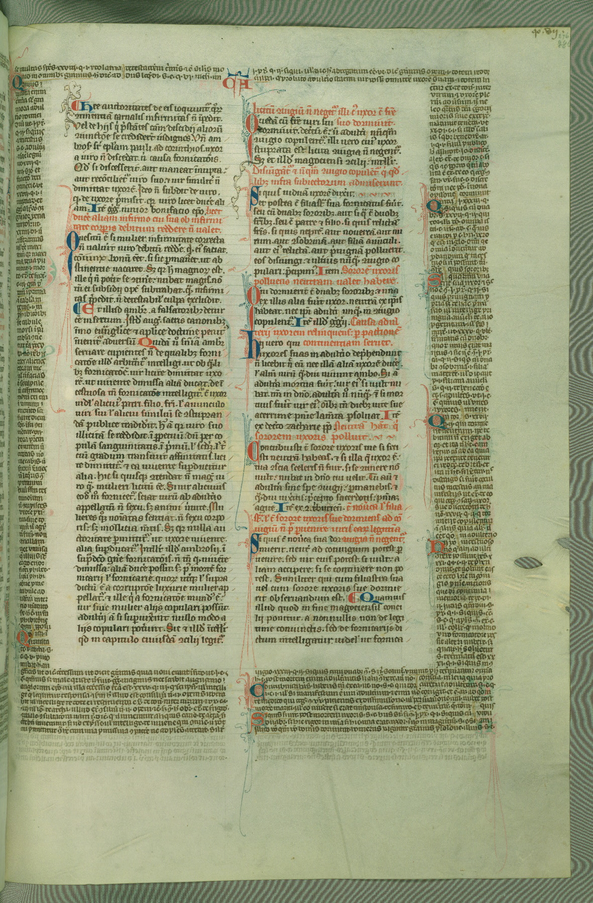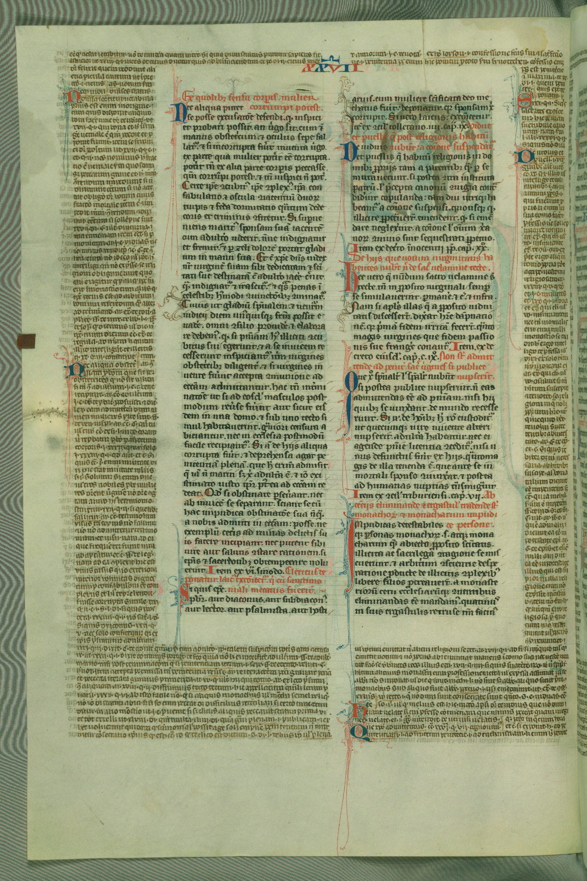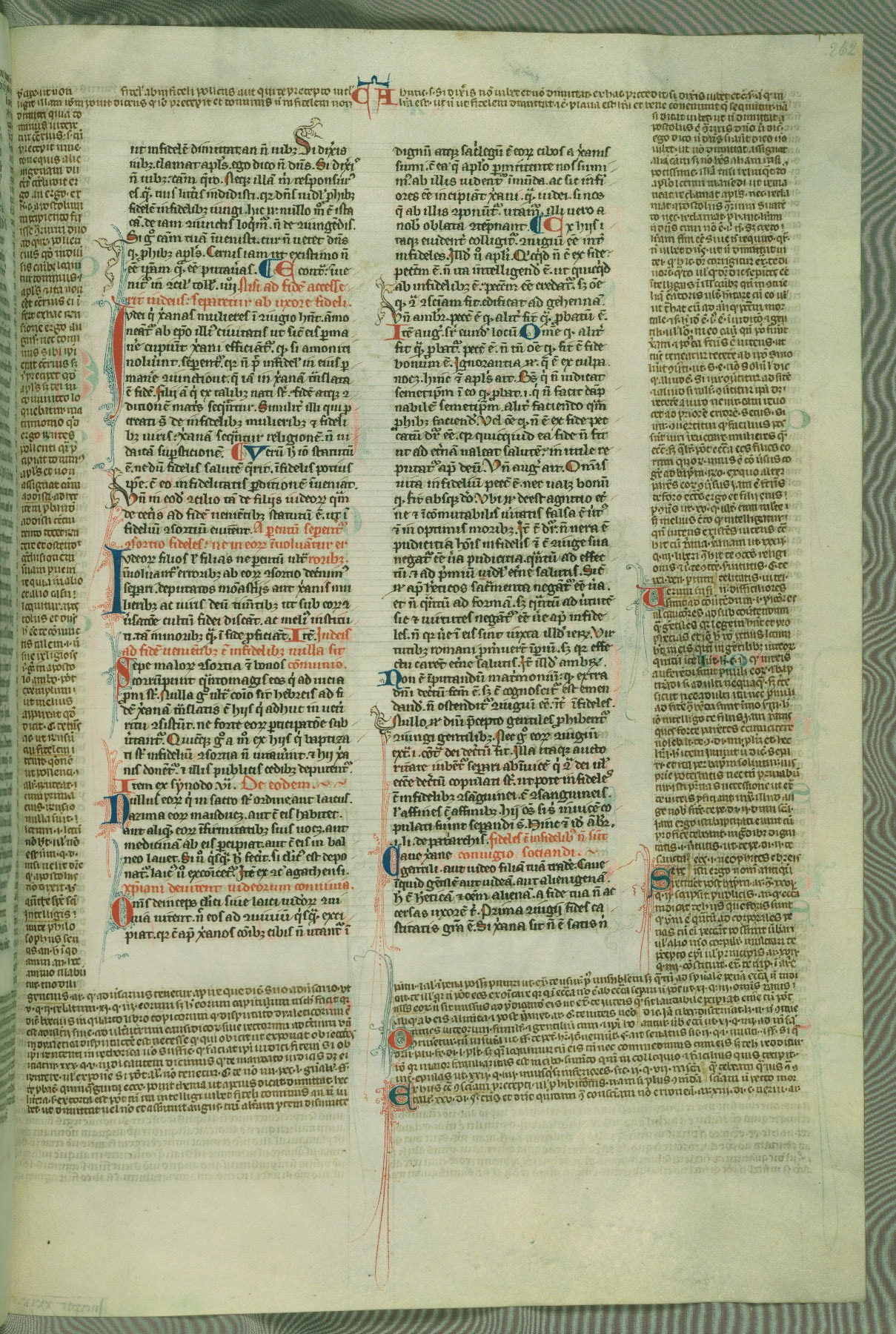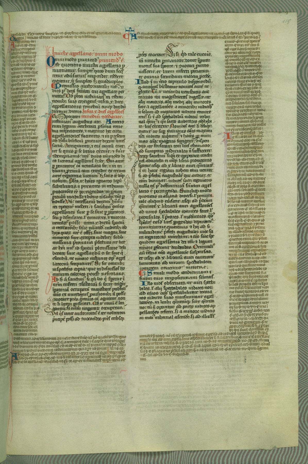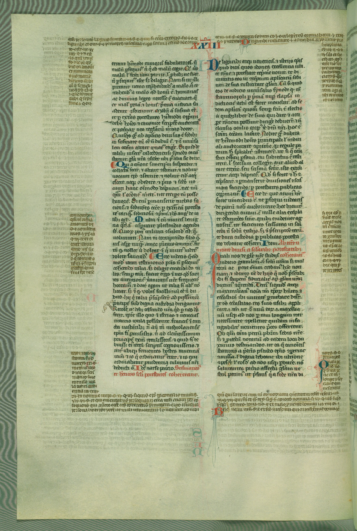 This deluxe version of Gratian's Decretum was created ca. 1280-90, most likely in Hainaut. The lively decoration of the manuscript indicates a marked taste for narrative, and there are thirty-seven historiated initials. The gloss work was completed by Bartholomew of Brescia. At first, Paris would seem to be the most likely place of origin, given that it was the leading center for the study of canon law. However, this particular manuscript exhibits scribal features that suggest its place of origin as being the Cistercian abbey of Cambron in Hainaut. Furthermore, Abbot Baudouin de Bousso, whose tenure at the abbey was from 1283 to 1293, was schooled in theology at the University of Paris, and he would eventually endorse the production of many fine manuscripts while at Cambron. In fact, the catalyst for this endeavor seems to have been the Beaupré Antiphonary (W.759-761), which was was created at Cambron during the 1280s. Stylistic features of W.133 seem to have connections with the Beaupré Antiphonary. For example, Cistercian monks are shown in three extant illuminations throughout three of the antiphonary volumes; these monks are pictured in brown habits similar to the type worn by clerics in W.133. The reliance upon Cistercian precedents for textual and design features associates W.133 with the Cistercian abbey at Cambron. However, more remains to be confirmed by further inspection of the output of the scriptorium at Cambron.