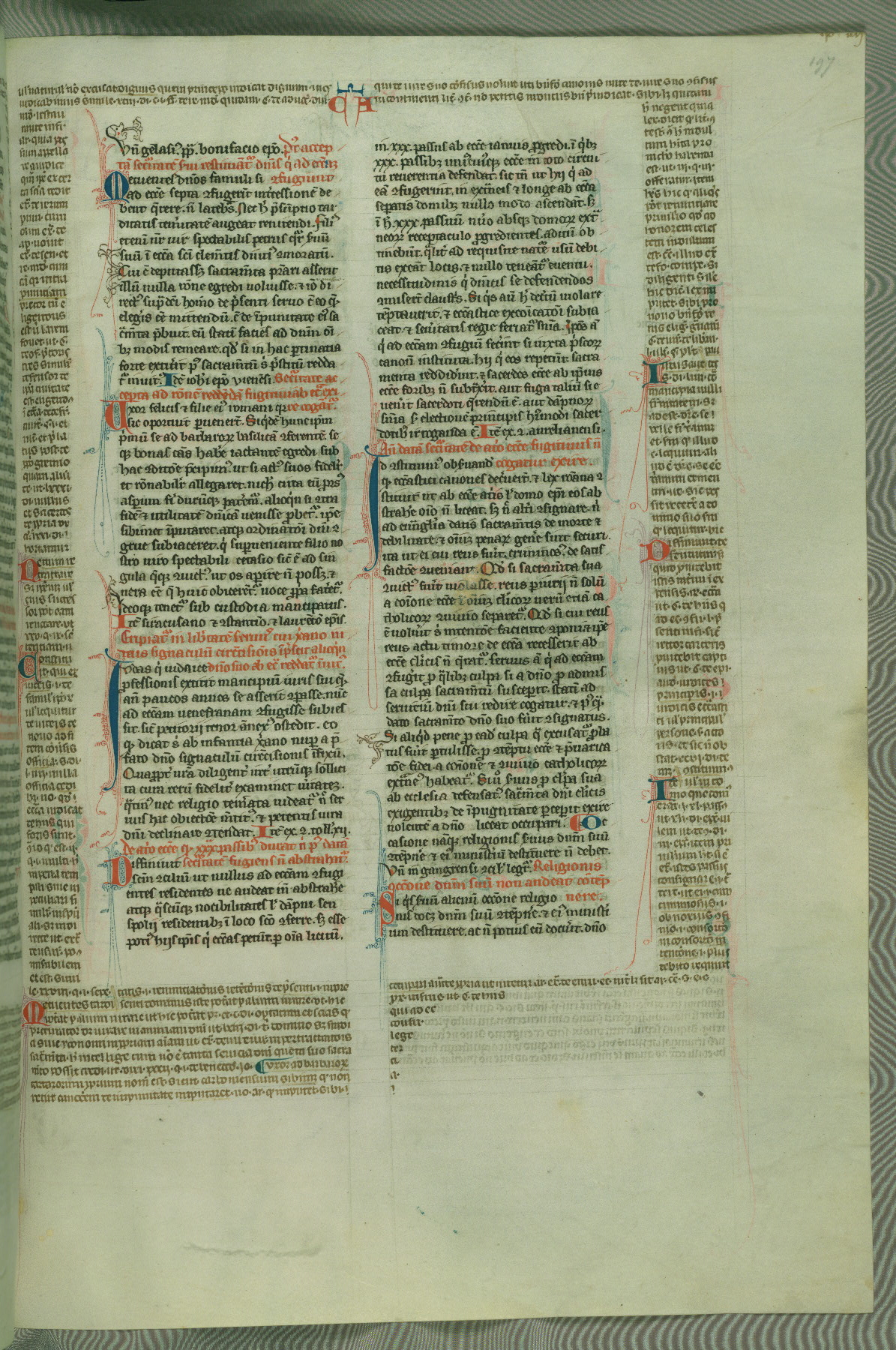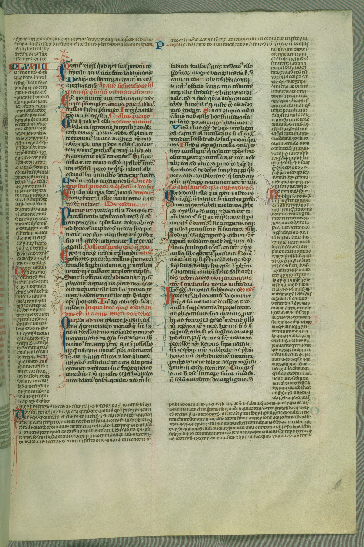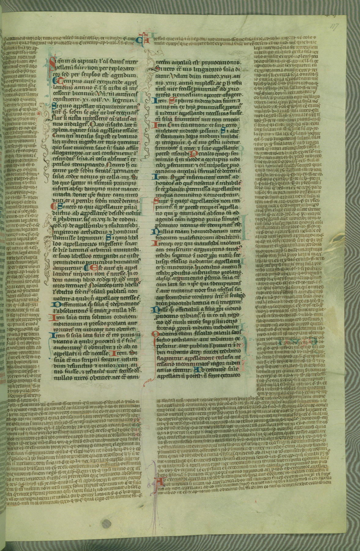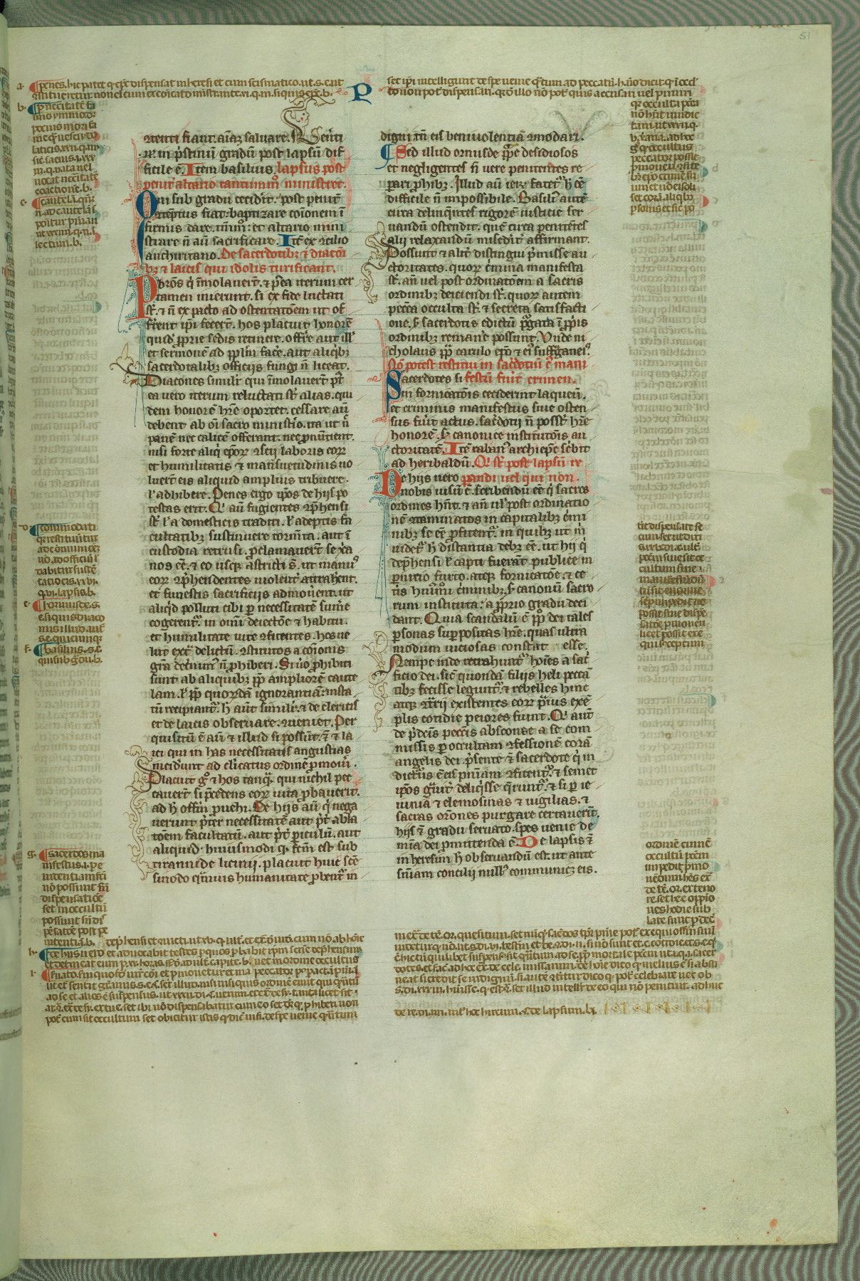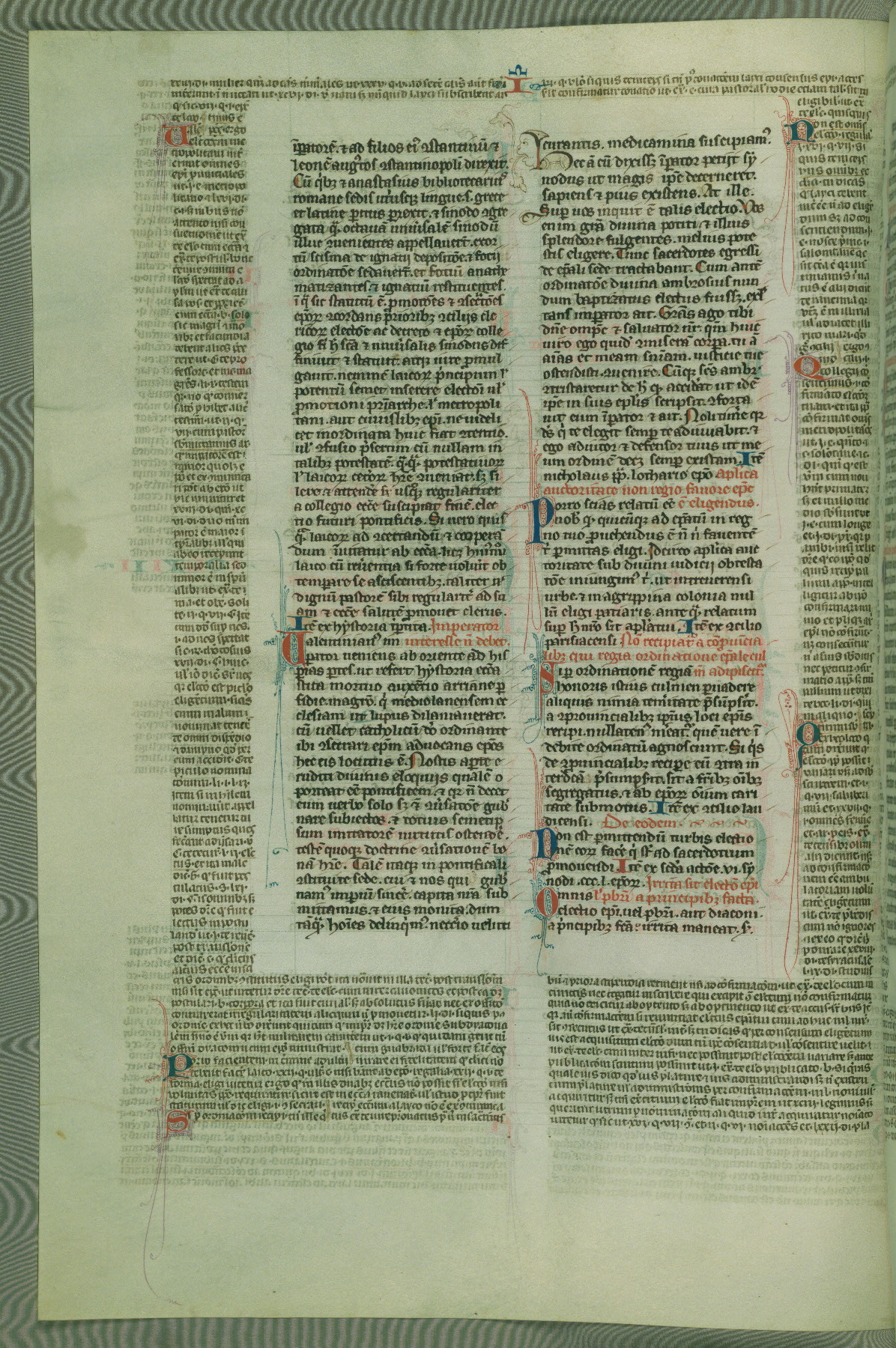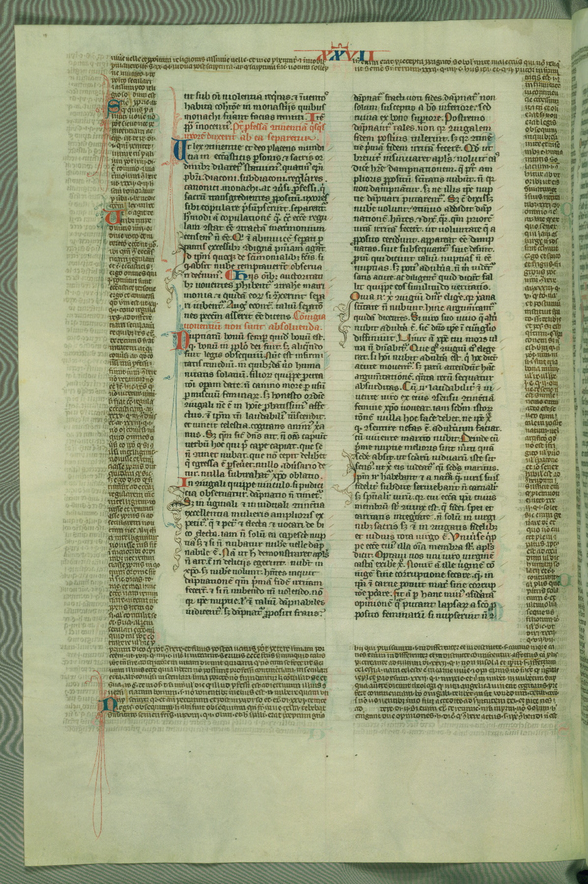 This deluxe version of Gratian's Decretum was created ca. 1280-90, most likely in Hainaut. The lively decoration of the manuscript indicates a marked taste for narrative, and there are thirty-seven historiated initials. The gloss work was completed by Bartholomew of Brescia. At first, Paris would seem to be the most likely place of origin, given that it was the leading center for the study of canon law. However, this particular manuscript exhibits scribal features that suggest its place of origin as being the Cistercian abbey of Cambron in Hainaut. Furthermore, Abbot Baudouin de Bousso, whose tenure at the abbey was from 1283 to 1293, was schooled in theology at the University of Paris, and he would eventually endorse the production of many fine manuscripts while at Cambron. In fact, the catalyst for this endeavor seems to have been the Beaupré Antiphonary (W.759-761), which was was created at Cambron during the 1280s. Stylistic features of W.133 seem to have connections with the Beaupré Antiphonary. For example, Cistercian monks are shown in three extant illuminations throughout three of the antiphonary volumes; these monks are pictured in brown habits similar to the type worn by clerics in W.133. The reliance upon Cistercian precedents for textual and design features associates W.133 with the Cistercian abbey at Cambron. However, more remains to be confirmed by further inspection of the output of the scriptorium at Cambron.