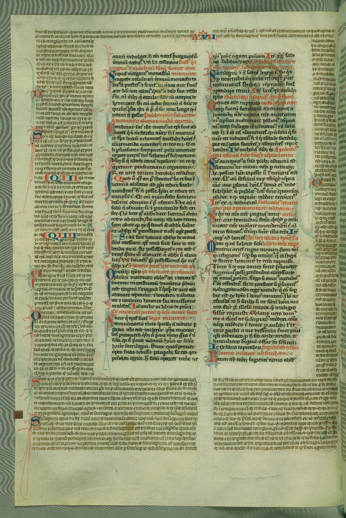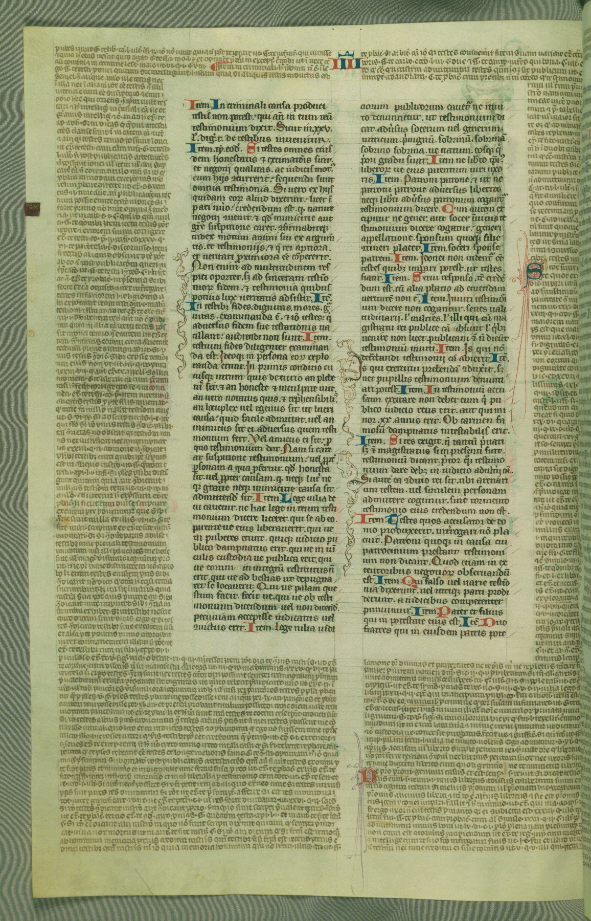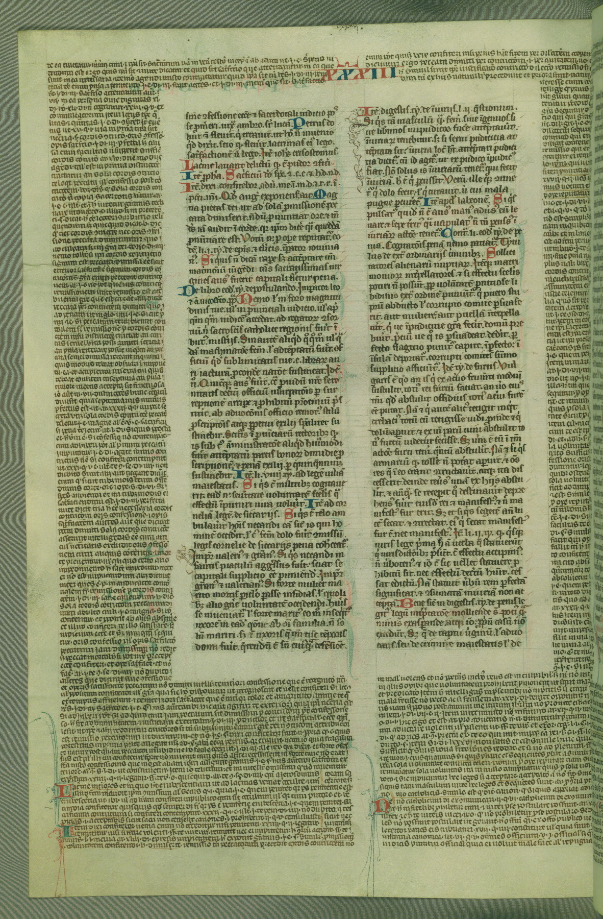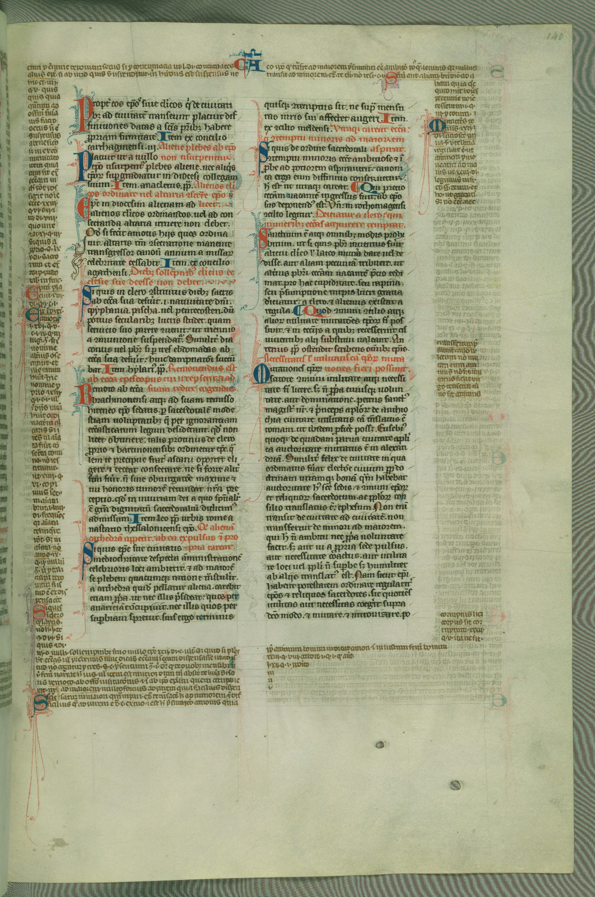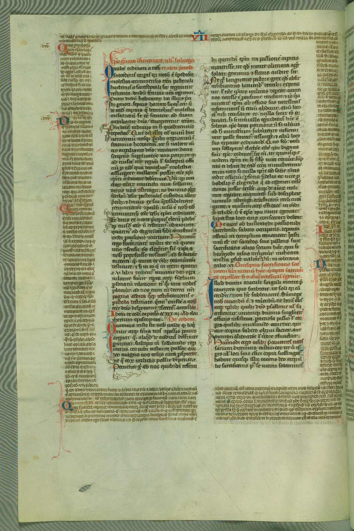 This deluxe version of Gratian's Decretum was created ca. 1280-90, most likely in Hainaut. The lively decoration of the manuscript indicates a marked taste for narrative, and there are thirty-seven historiated initials. The gloss work was completed by Bartholomew of Brescia. At first, Paris would seem to be the most likely place of origin, given that it was the leading center for the study of canon law. However, this particular manuscript exhibits scribal features that suggest its place of origin as being the Cistercian abbey of Cambron in Hainaut. Furthermore, Abbot Baudouin de Bousso, whose tenure at the abbey was from 1283 to 1293, was schooled in theology at the University of Paris, and he would eventually endorse the production of many fine manuscripts while at Cambron. In fact, the catalyst for this endeavor seems to have been the Beaupré Antiphonary (W.759-761), which was was created at Cambron during the 1280s. Stylistic features of W.133 seem to have connections with the Beaupré Antiphonary. For example, Cistercian monks are shown in three extant illuminations throughout three of the antiphonary volumes; these monks are pictured in brown habits similar to the type worn by clerics in W.133. The reliance upon Cistercian precedents for textual and design features associates W.133 with the Cistercian abbey at Cambron. However, more remains to be confirmed by further inspection of the output of the scriptorium at Cambron.