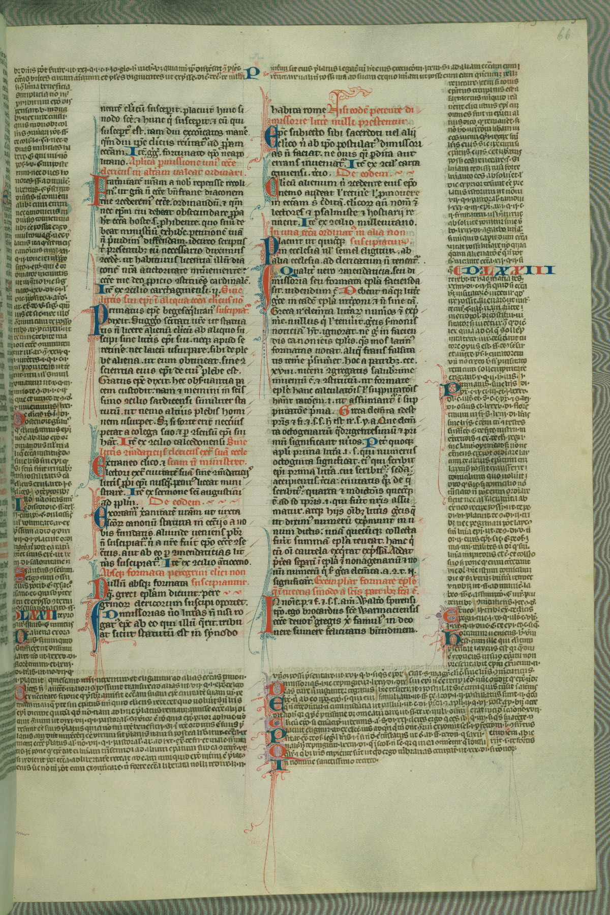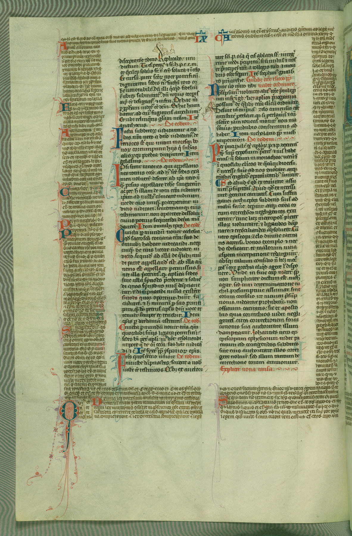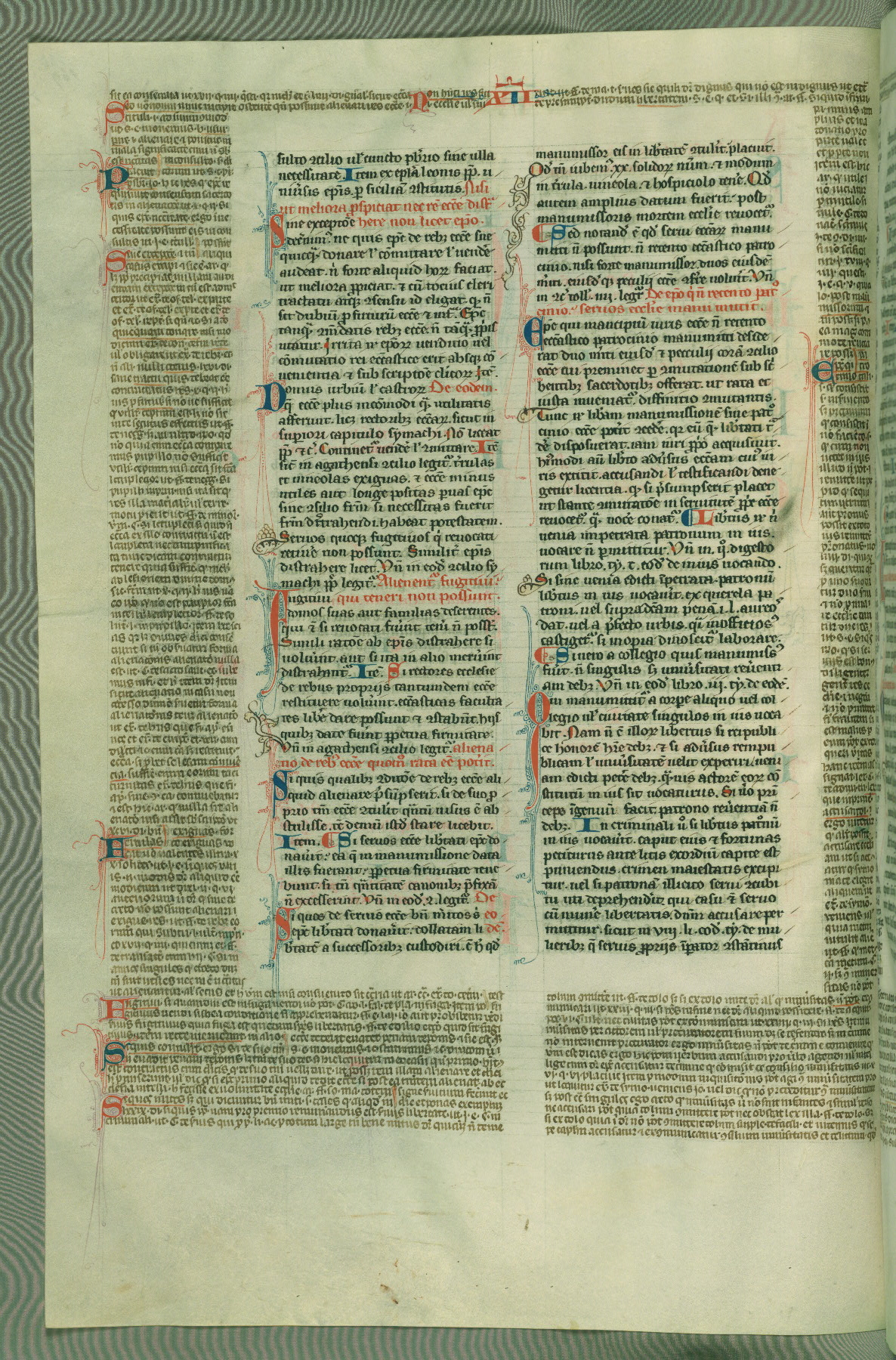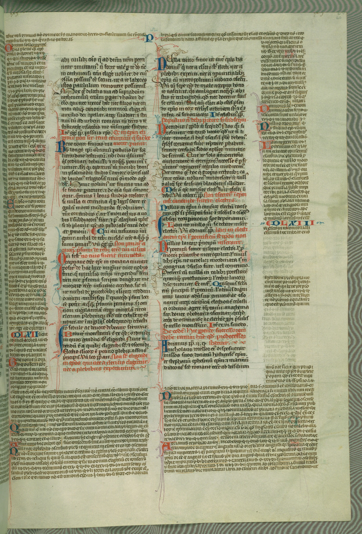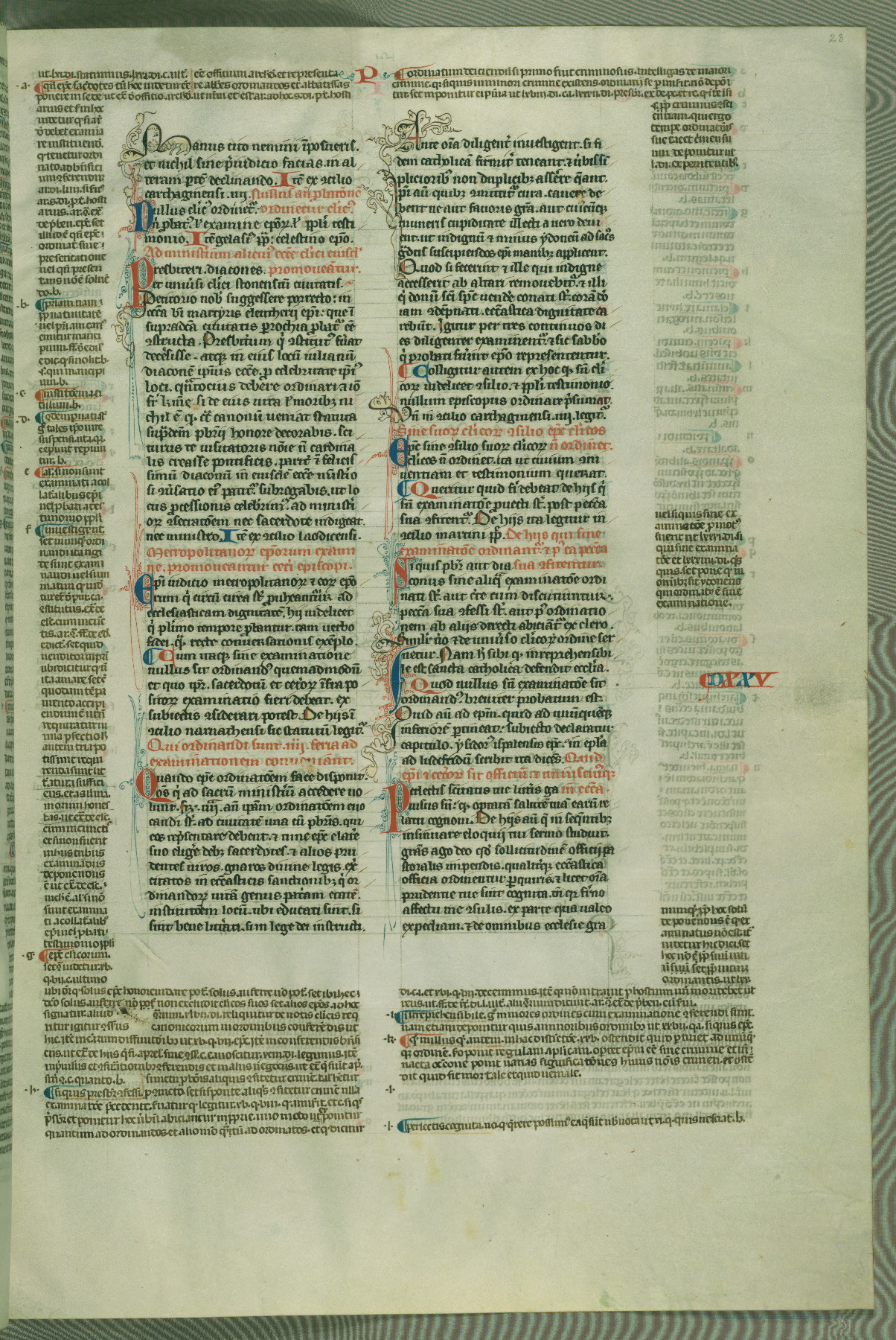 This deluxe version of Gratian's Decretum was created ca. 1280-90, most likely in Hainaut. The lively decoration of the manuscript indicates a marked taste for narrative, and there are thirty-seven historiated initials. The gloss work was completed by Bartholomew of Brescia. At first, Paris would seem to be the most likely place of origin, given that it was the leading center for the study of canon law. However, this particular manuscript exhibits scribal features that suggest its place of origin as being the Cistercian abbey of Cambron in Hainaut. Furthermore, Abbot Baudouin de Bousso, whose tenure at the abbey was from 1283 to 1293, was schooled in theology at the University of Paris, and he would eventually endorse the production of many fine manuscripts while at Cambron. In fact, the catalyst for this endeavor seems to have been the Beaupré Antiphonary (W.759-761), which was was created at Cambron during the 1280s. Stylistic features of W.133 seem to have connections with the Beaupré Antiphonary. For example, Cistercian monks are shown in three extant illuminations throughout three of the antiphonary volumes; these monks are pictured in brown habits similar to the type worn by clerics in W.133. The reliance upon Cistercian precedents for textual and design features associates W.133 with the Cistercian abbey at Cambron. However, more remains to be confirmed by further inspection of the output of the scriptorium at Cambron.