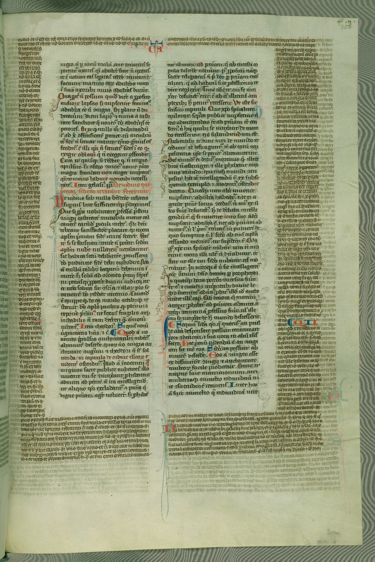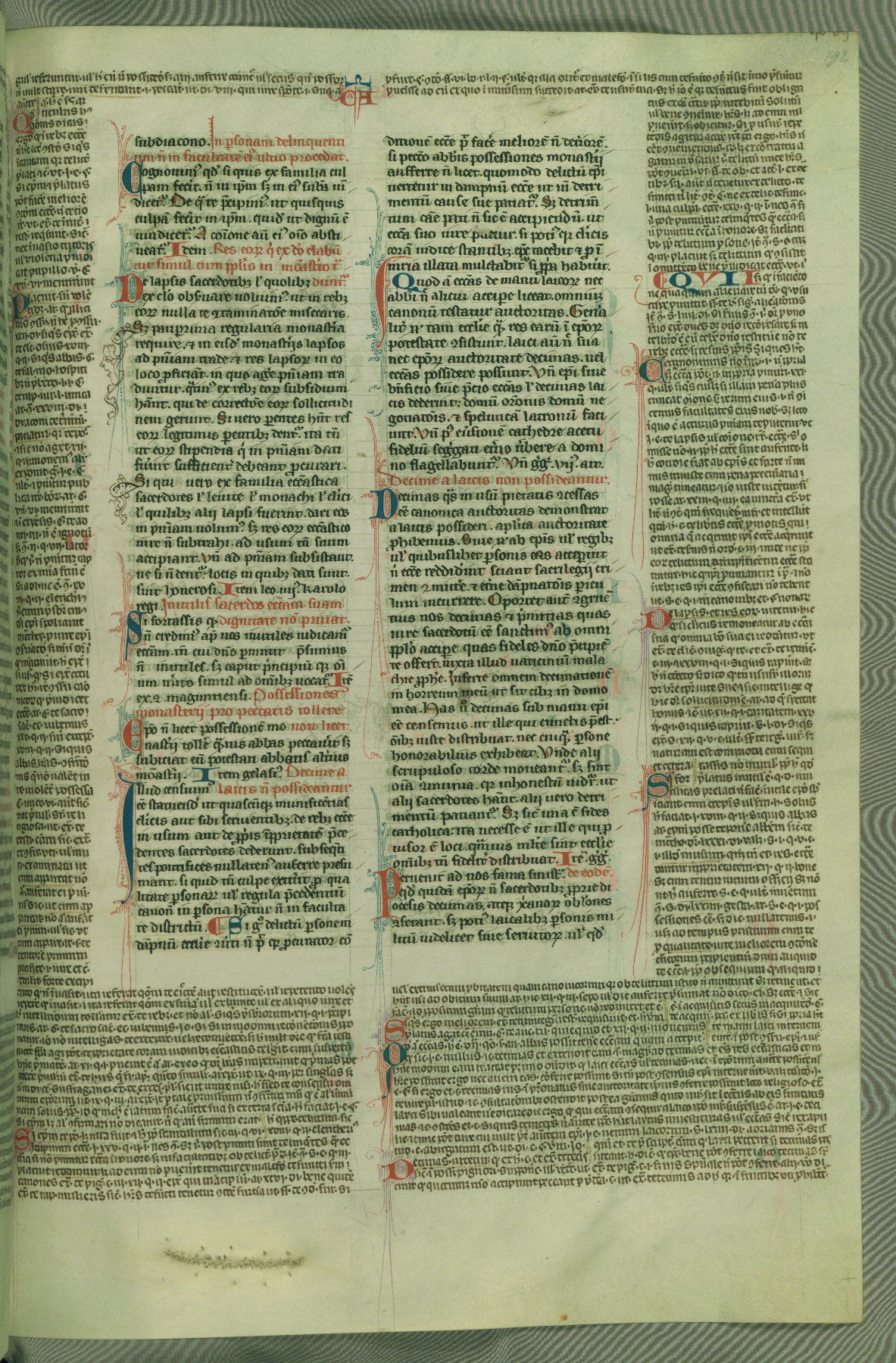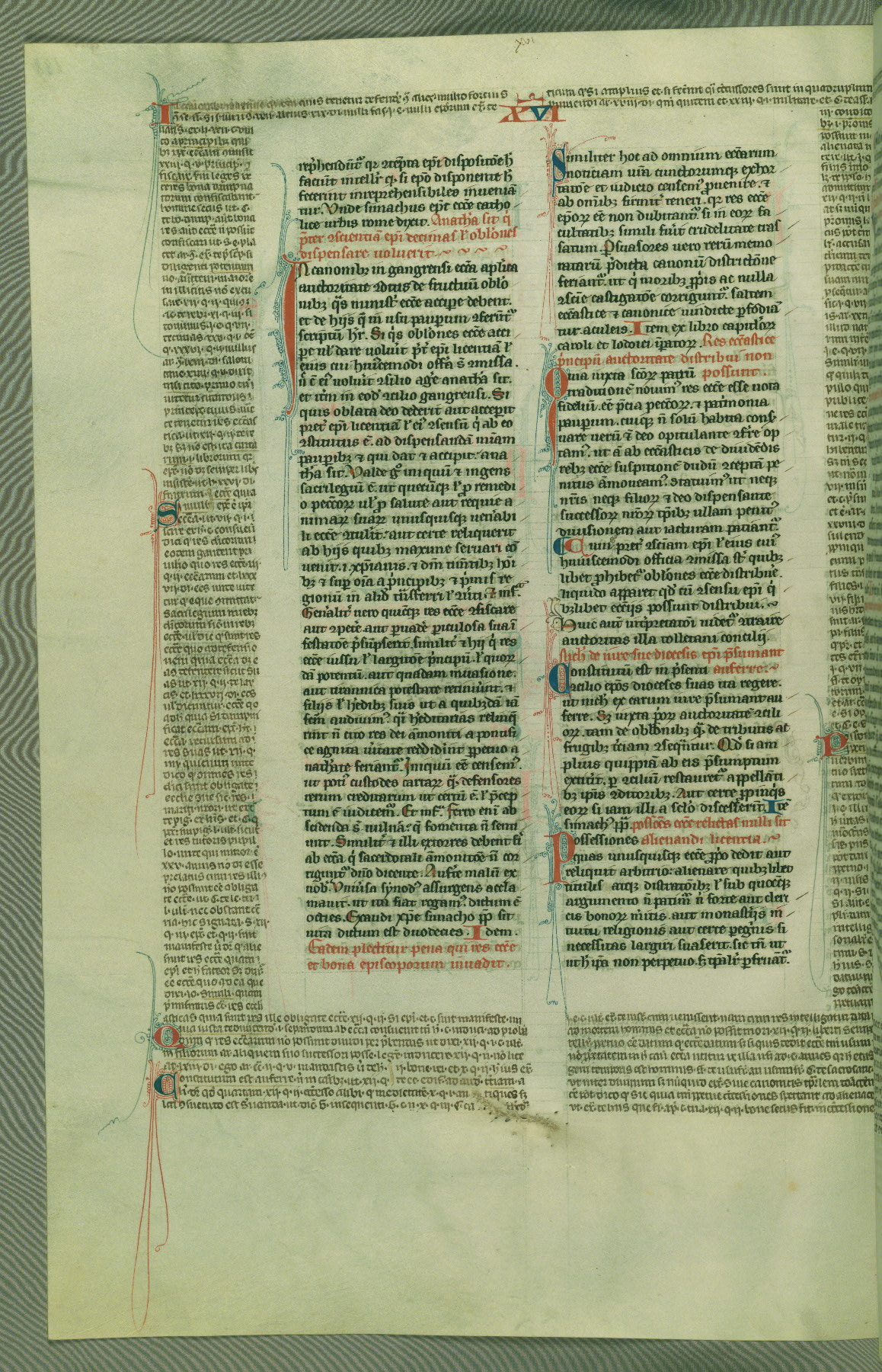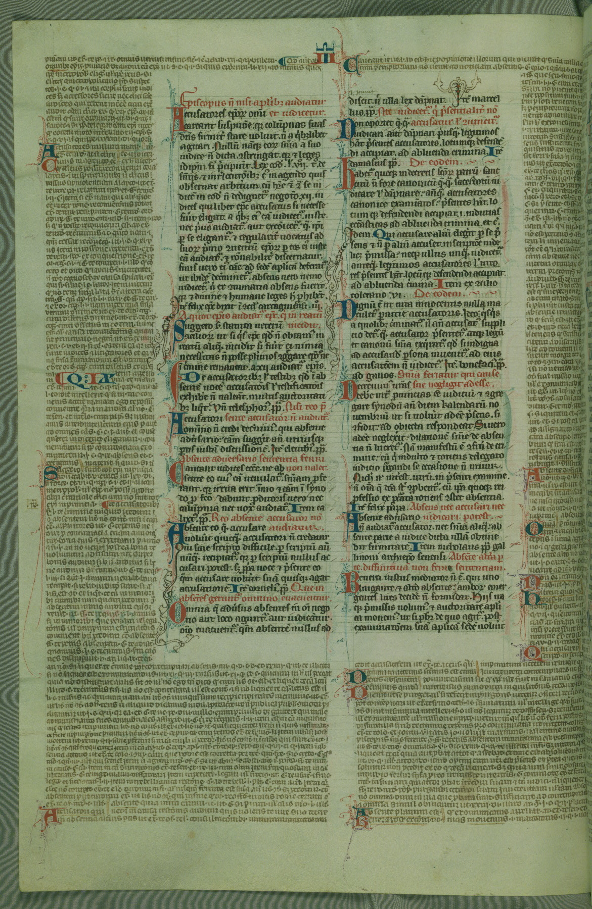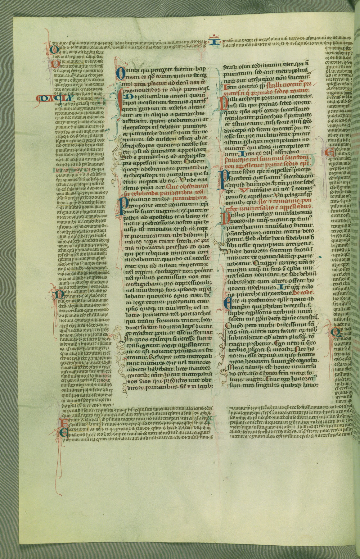This deluxe version of Gratian's Decretum was created ca. 1280-90, most likely in Hainaut. The lively decoration of the manuscript indicates a marked taste for narrative, and there are thirty-seven historiated initials. The gloss work was completed by Bartholomew of Brescia. At first, Paris would seem to be the most likely place of origin, given that it was the leading center for the study of canon law. However, this particular manuscript exhibits scribal features that suggest its place of origin as being the Cistercian abbey of Cambron in Hainaut. Furthermore, Abbot Baudouin de Bousso, whose tenure at the abbey was from 1283 to 1293, was schooled in theology at the University of Paris, and he would eventually endorse the production of many fine manuscripts while at Cambron. In fact, the catalyst for this endeavor seems to have been the Beaupré Antiphonary (W.759-761), which was was created at Cambron during the 1280s. Stylistic features of W.133 seem to have connections with the Beaupré Antiphonary. For example, Cistercian monks are shown in three extant illuminations throughout three of the antiphonary volumes; these monks are pictured in brown habits similar to the type worn by clerics in W.133. The reliance upon Cistercian precedents for textual and design features associates W.133 with the Cistercian abbey at Cambron. However, more remains to be confirmed by further inspection of the output of the scriptorium at Cambron.