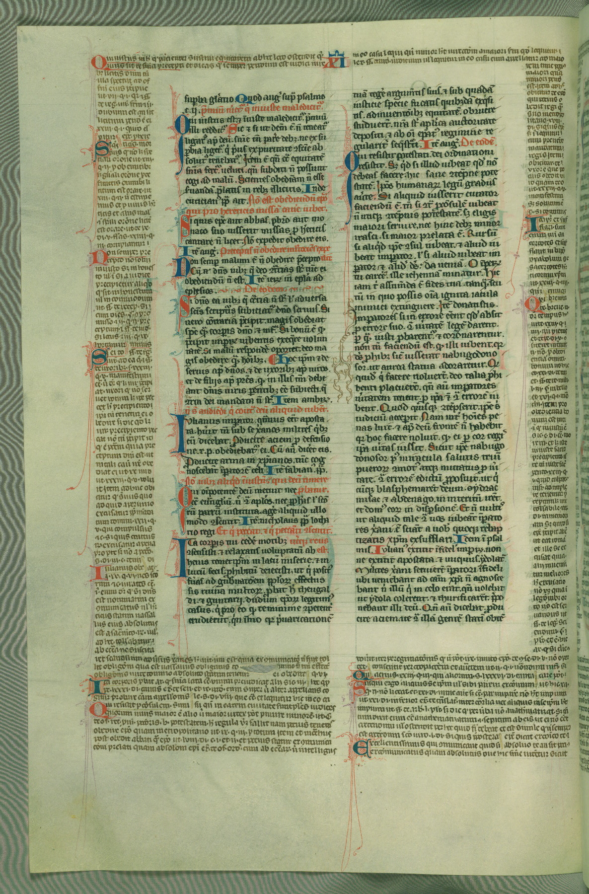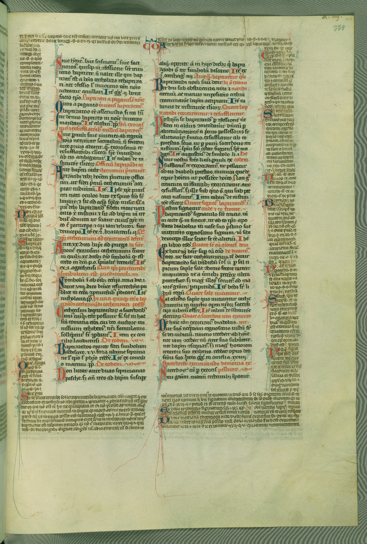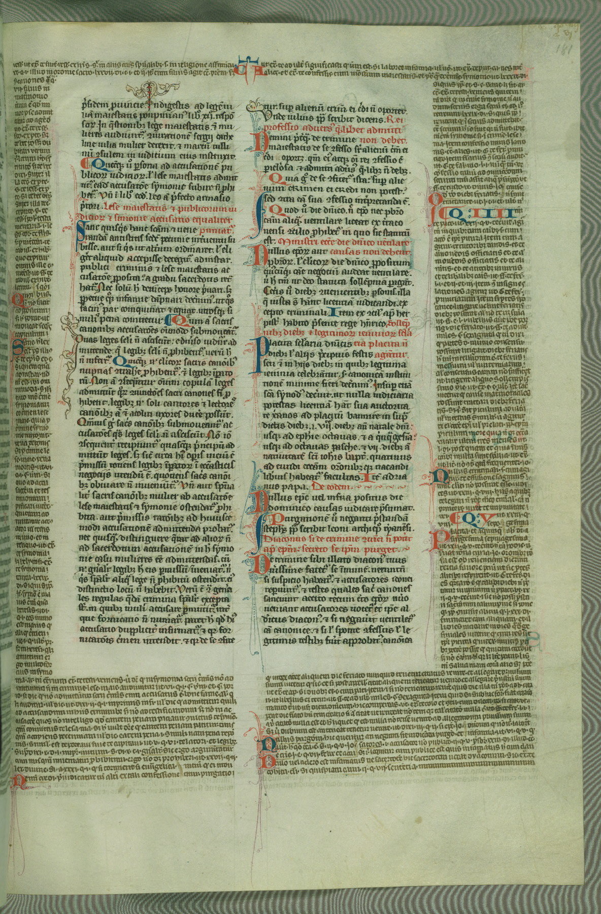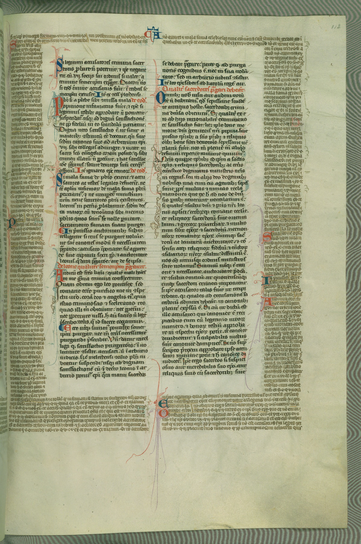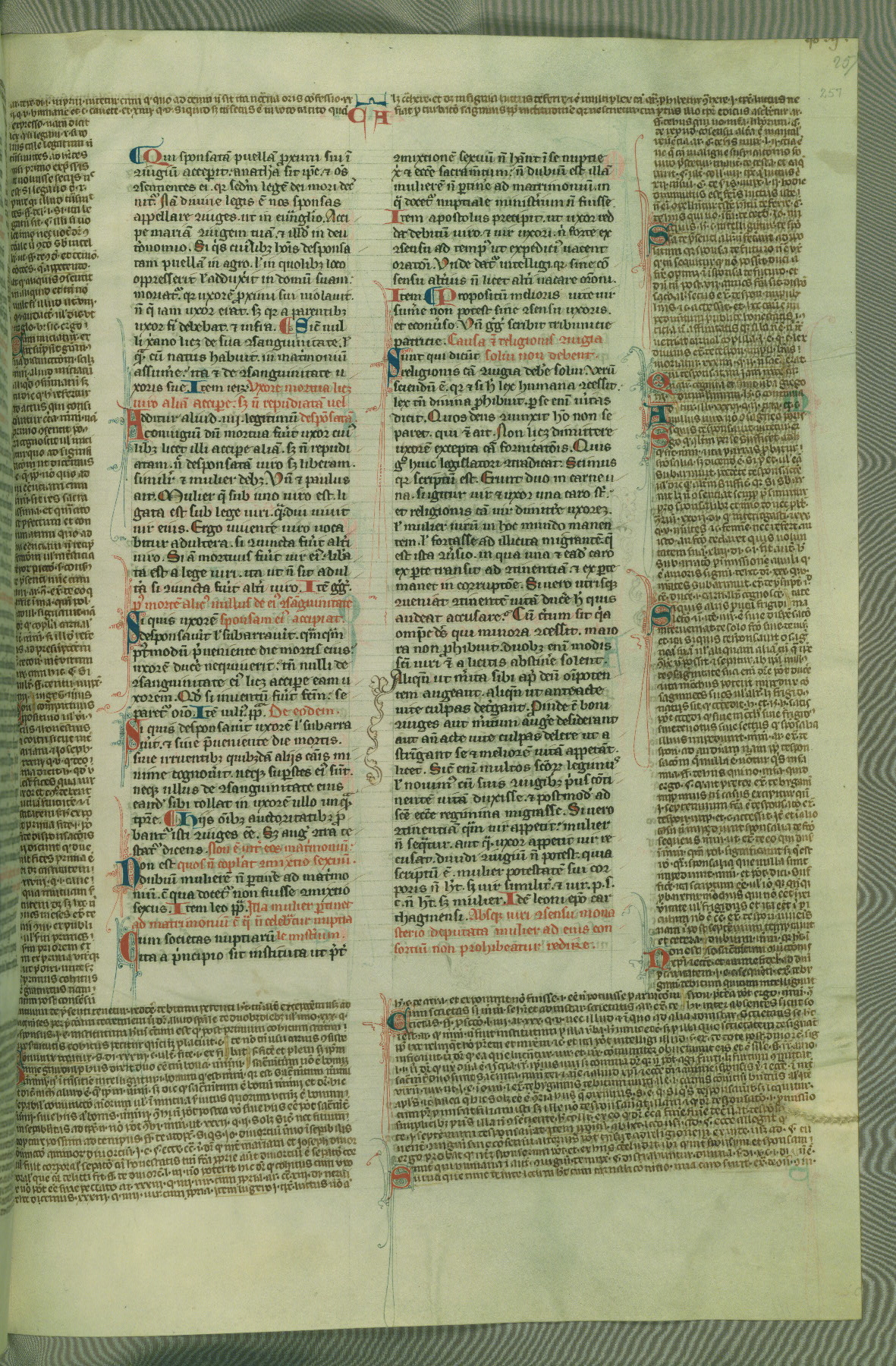 This deluxe version of Gratian's Decretum was created ca. 1280-90, most likely in Hainaut. The lively decoration of the manuscript indicates a marked taste for narrative, and there are thirty-seven historiated initials. The gloss work was completed by Bartholomew of Brescia. At first, Paris would seem to be the most likely place of origin, given that it was the leading center for the study of canon law. However, this particular manuscript exhibits scribal features that suggest its place of origin as being the Cistercian abbey of Cambron in Hainaut. Furthermore, Abbot Baudouin de Bousso, whose tenure at the abbey was from 1283 to 1293, was schooled in theology at the University of Paris, and he would eventually endorse the production of many fine manuscripts while at Cambron. In fact, the catalyst for this endeavor seems to have been the Beaupré Antiphonary (W.759-761), which was was created at Cambron during the 1280s. Stylistic features of W.133 seem to have connections with the Beaupré Antiphonary. For example, Cistercian monks are shown in three extant illuminations throughout three of the antiphonary volumes; these monks are pictured in brown habits similar to the type worn by clerics in W.133. The reliance upon Cistercian precedents for textual and design features associates W.133 with the Cistercian abbey at Cambron. However, more remains to be confirmed by further inspection of the output of the scriptorium at Cambron.