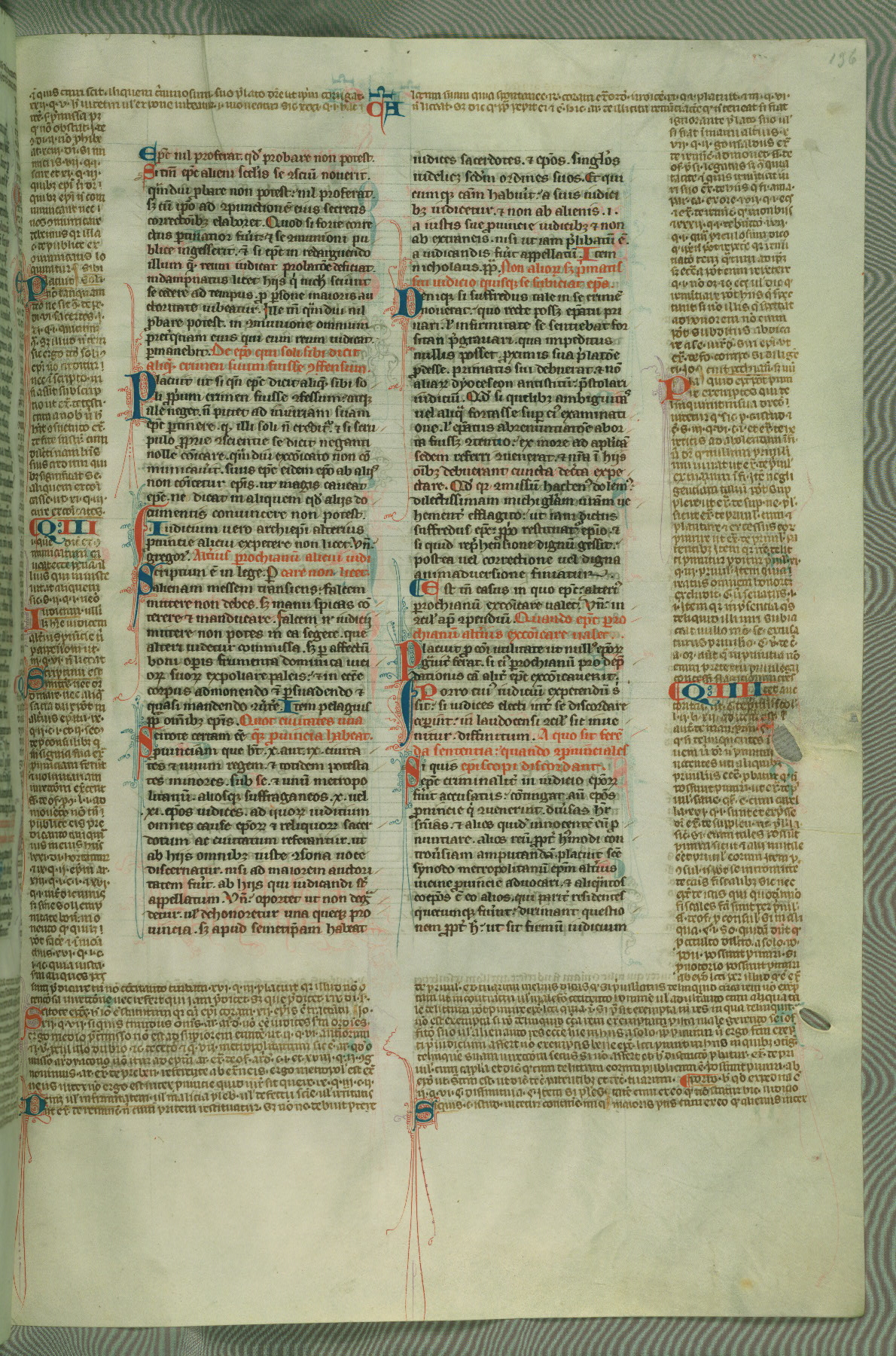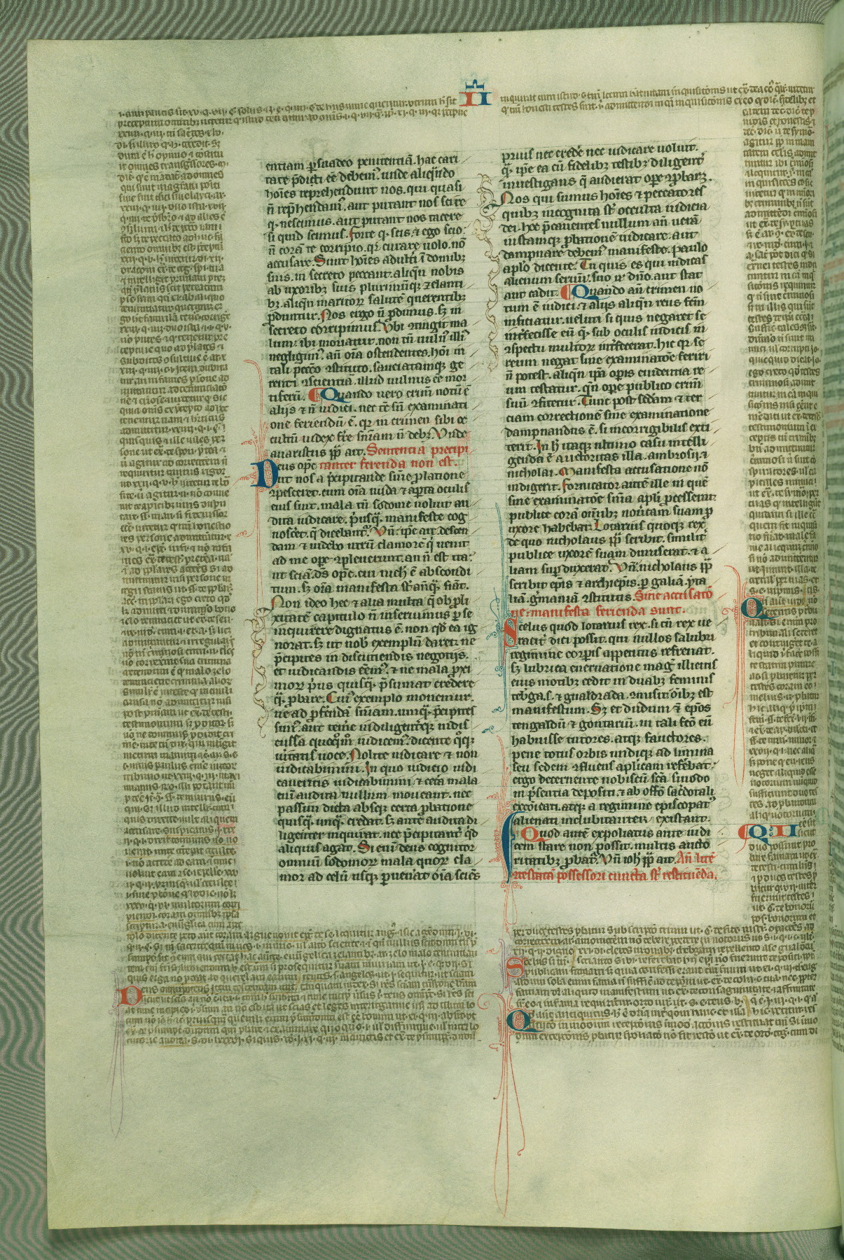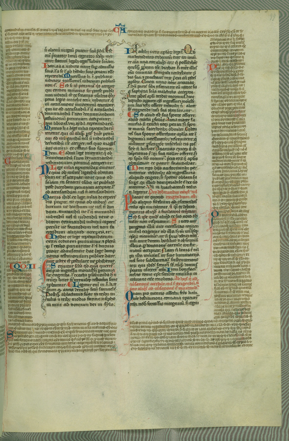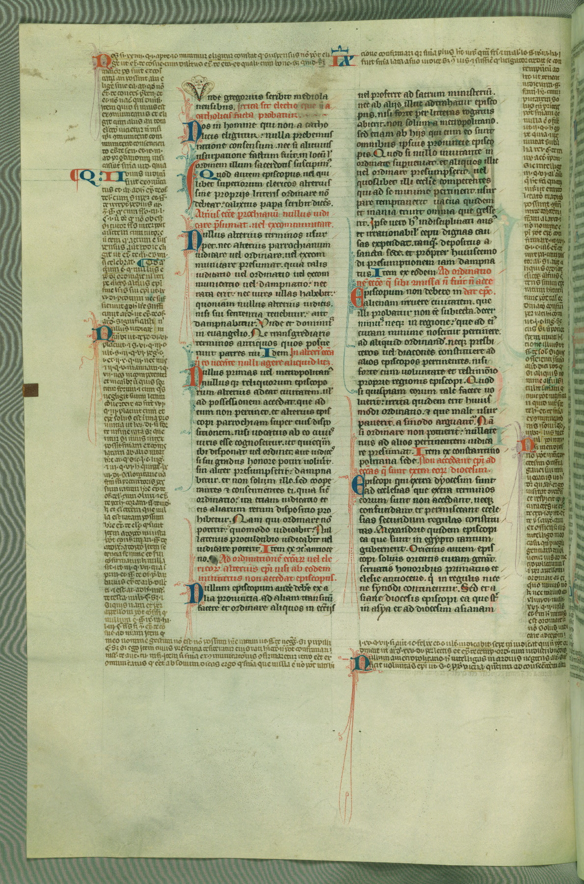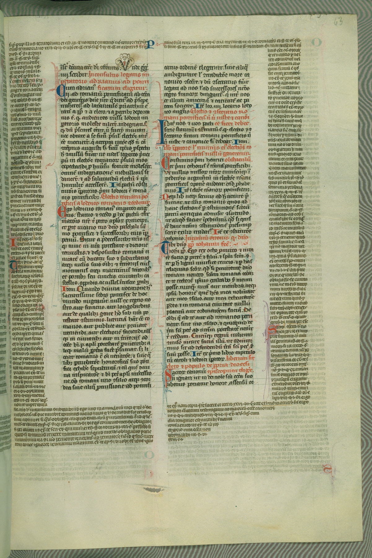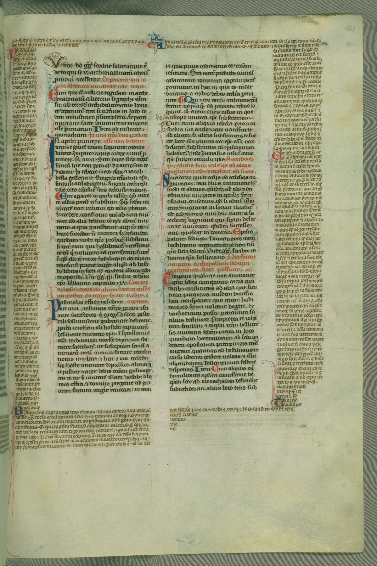 This deluxe version of Gratian's Decretum was created ca. 1280-90, most likely in Hainaut. The lively decoration of the manuscript indicates a marked taste for narrative, and there are thirty-seven historiated initials. The gloss work was completed by Bartholomew of Brescia. At first, Paris would seem to be the most likely place of origin, given that it was the leading center for the study of canon law. However, this particular manuscript exhibits scribal features that suggest its place of origin as being the Cistercian abbey of Cambron in Hainaut. Furthermore, Abbot Baudouin de Bousso, whose tenure at the abbey was from 1283 to 1293, was schooled in theology at the University of Paris, and he would eventually endorse the production of many fine manuscripts while at Cambron. In fact, the catalyst for this endeavor seems to have been the Beaupré Antiphonary (W.759-761), which was was created at Cambron during the 1280s. Stylistic features of W.133 seem to have connections with the Beaupré Antiphonary. For example, Cistercian monks are shown in three extant illuminations throughout three of the antiphonary volumes; these monks are pictured in brown habits similar to the type worn by clerics in W.133. The reliance upon Cistercian precedents for textual and design features associates W.133 with the Cistercian abbey at Cambron. However, more remains to be confirmed by further inspection of the output of the scriptorium at Cambron.