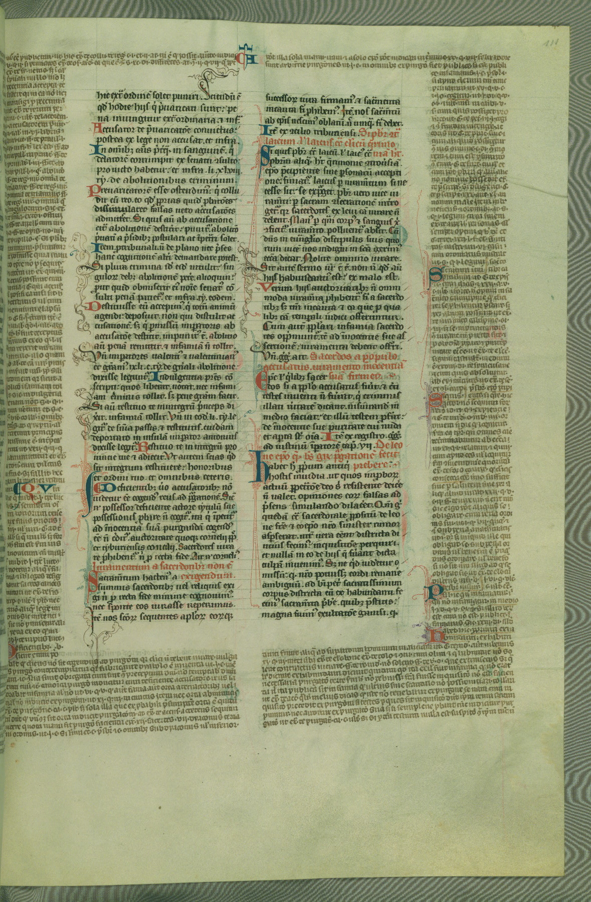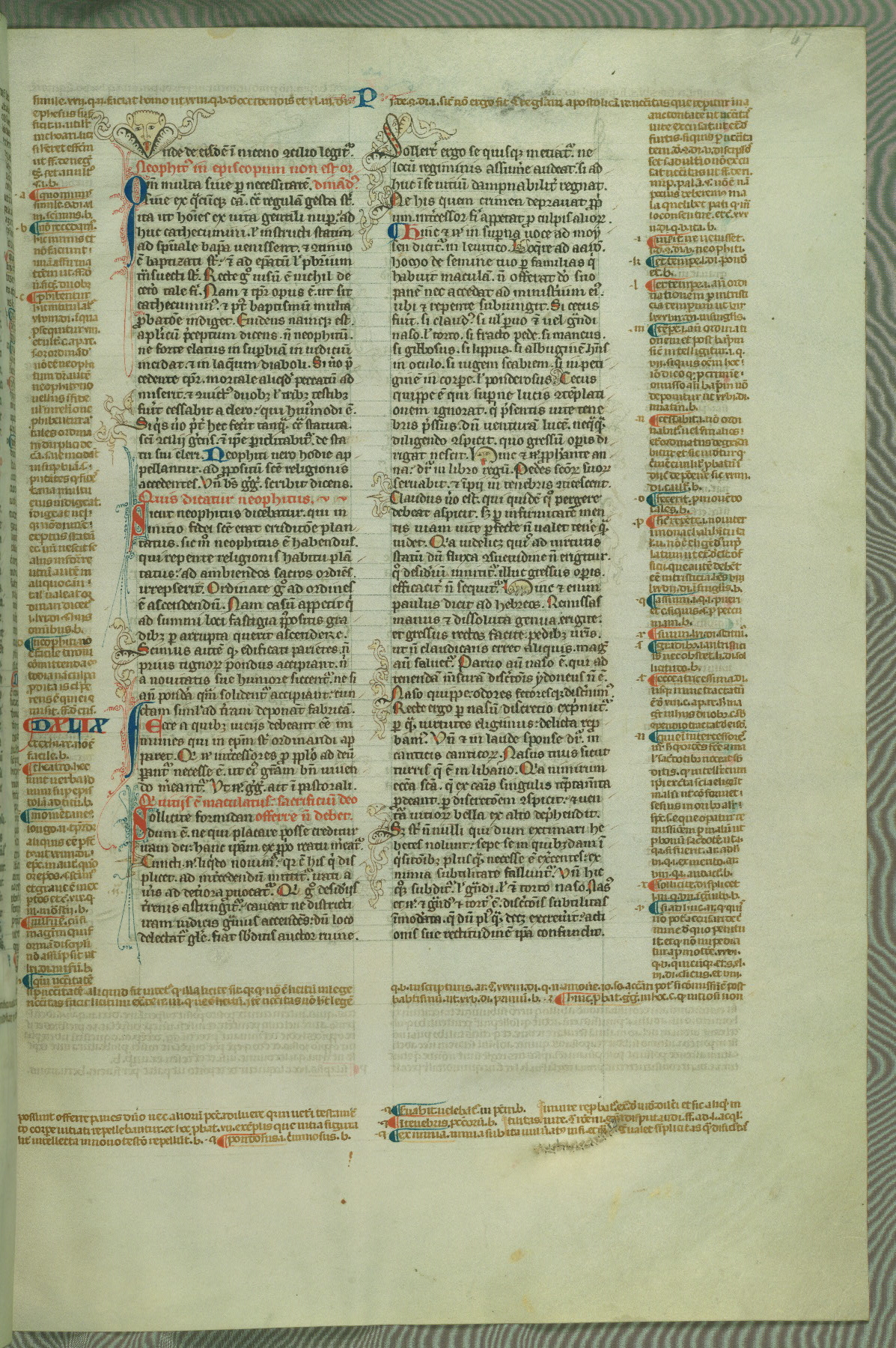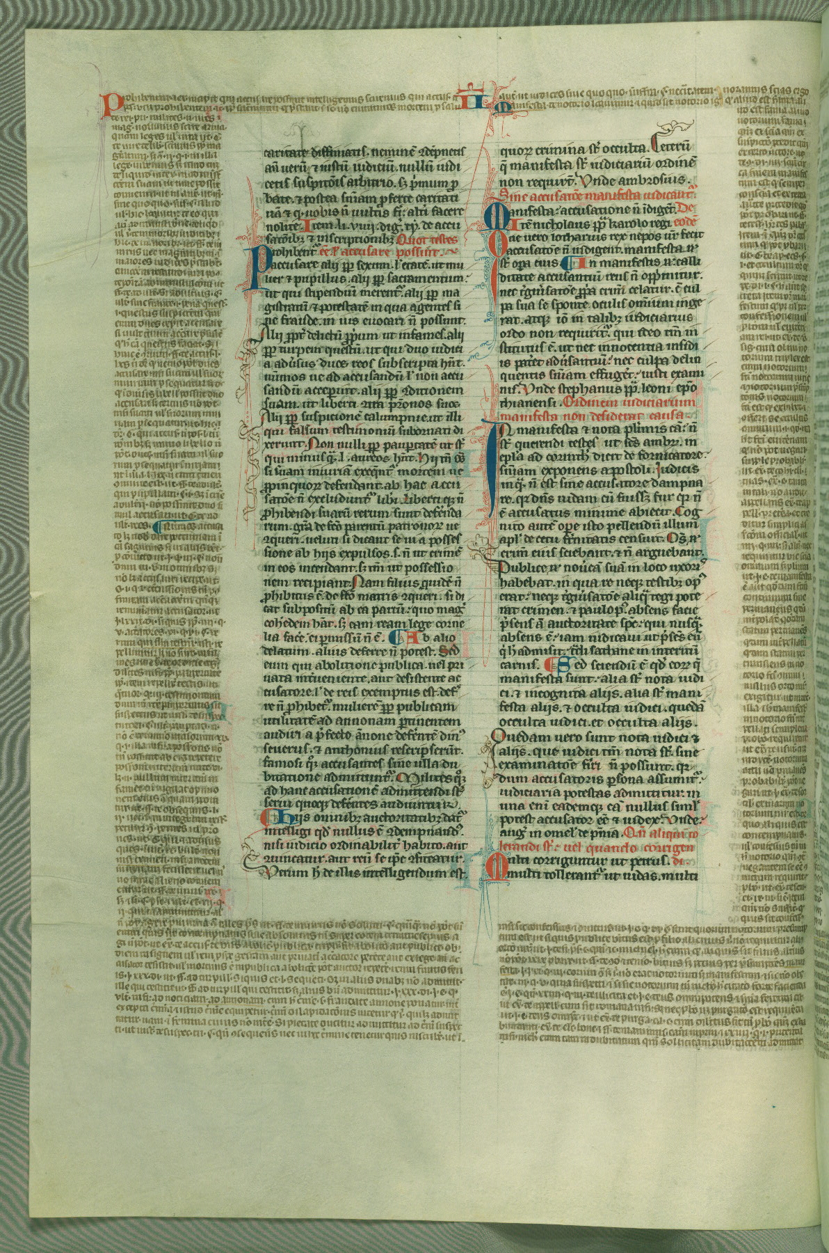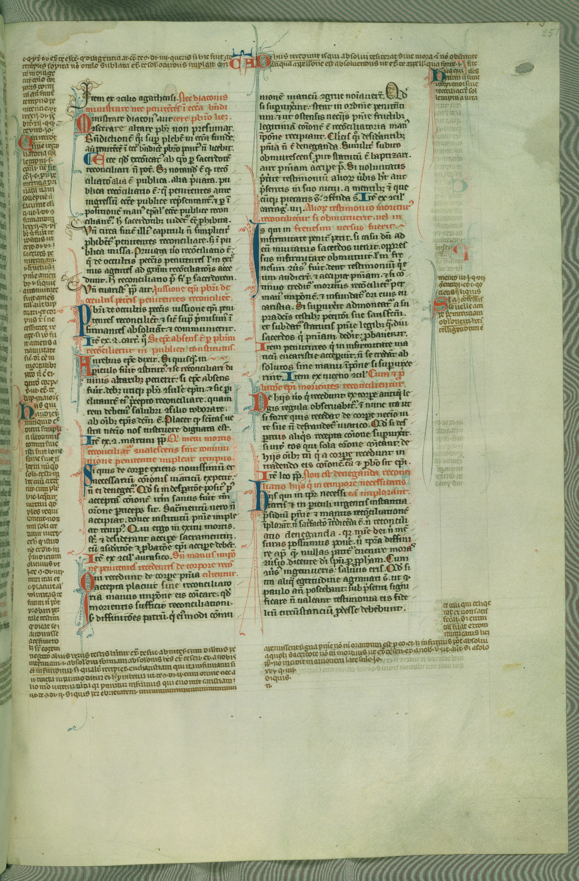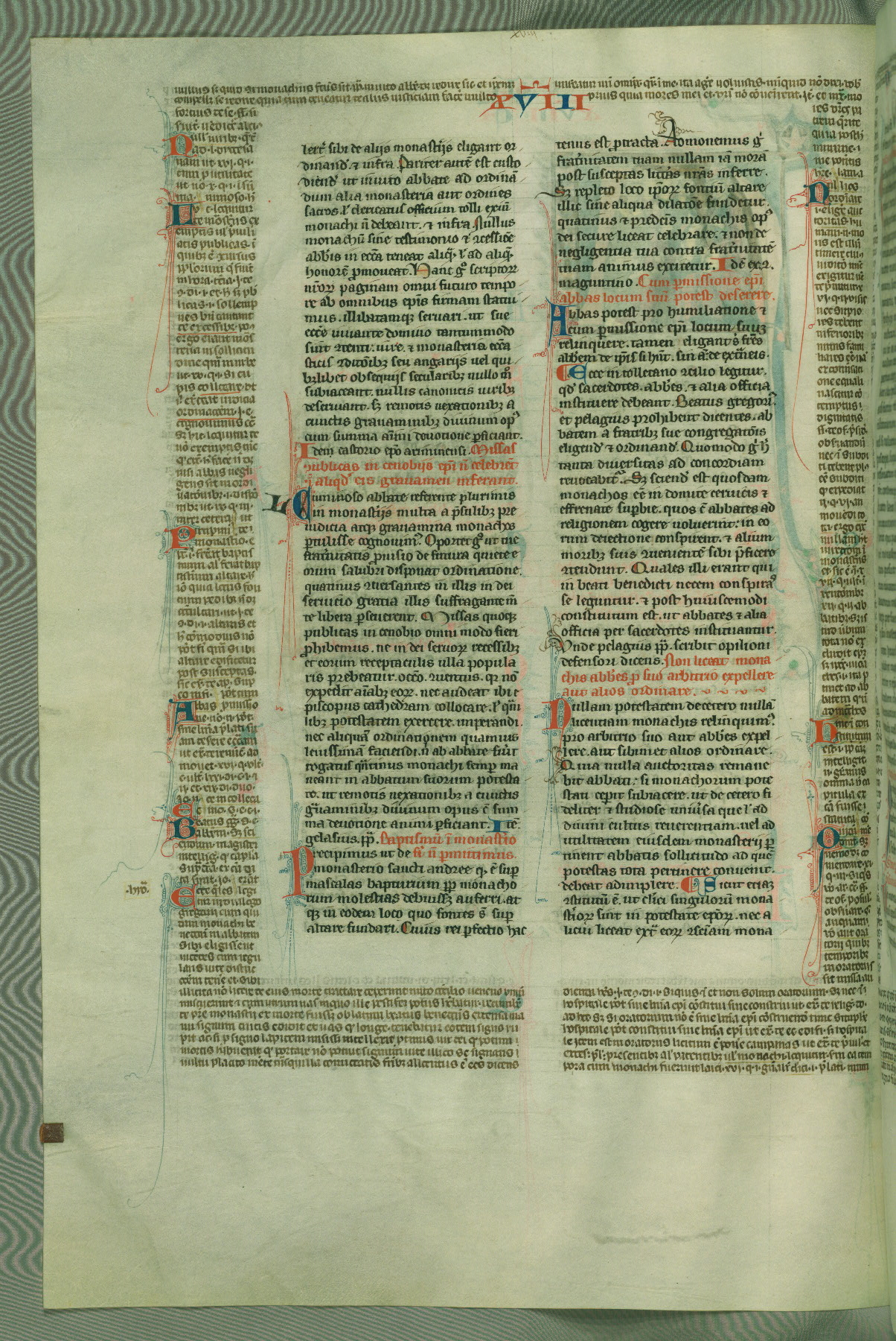 This deluxe version of Gratian's Decretum was created ca. 1280-90, most likely in Hainaut. The lively decoration of the manuscript indicates a marked taste for narrative, and there are thirty-seven historiated initials. The gloss work was completed by Bartholomew of Brescia. At first, Paris would seem to be the most likely place of origin, given that it was the leading center for the study of canon law. However, this particular manuscript exhibits scribal features that suggest its place of origin as being the Cistercian abbey of Cambron in Hainaut. Furthermore, Abbot Baudouin de Bousso, whose tenure at the abbey was from 1283 to 1293, was schooled in theology at the University of Paris, and he would eventually endorse the production of many fine manuscripts while at Cambron. In fact, the catalyst for this endeavor seems to have been the Beaupré Antiphonary (W.759-761), which was was created at Cambron during the 1280s. Stylistic features of W.133 seem to have connections with the Beaupré Antiphonary. For example, Cistercian monks are shown in three extant illuminations throughout three of the antiphonary volumes; these monks are pictured in brown habits similar to the type worn by clerics in W.133. The reliance upon Cistercian precedents for textual and design features associates W.133 with the Cistercian abbey at Cambron. However, more remains to be confirmed by further inspection of the output of the scriptorium at Cambron.