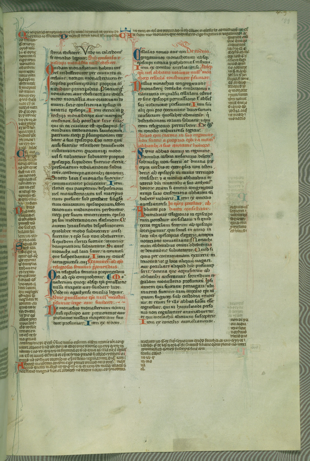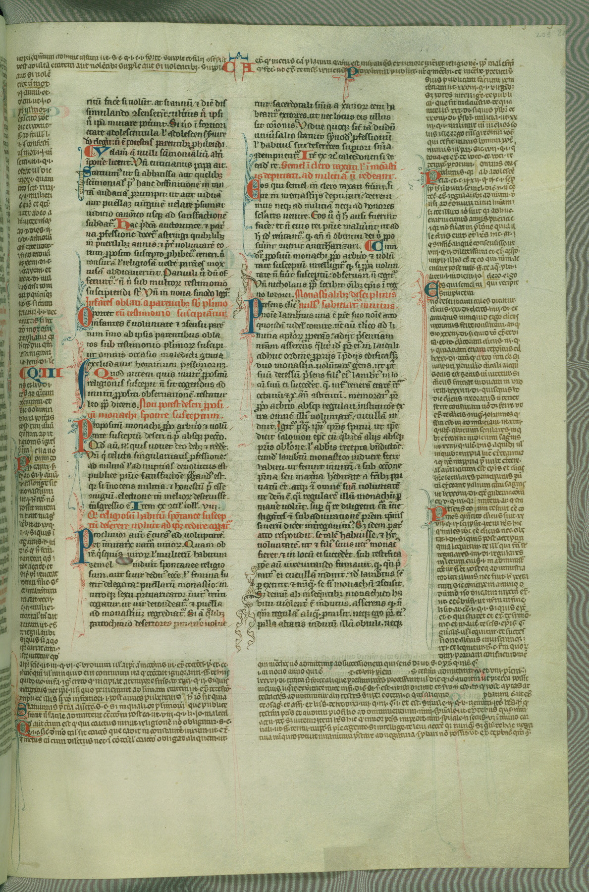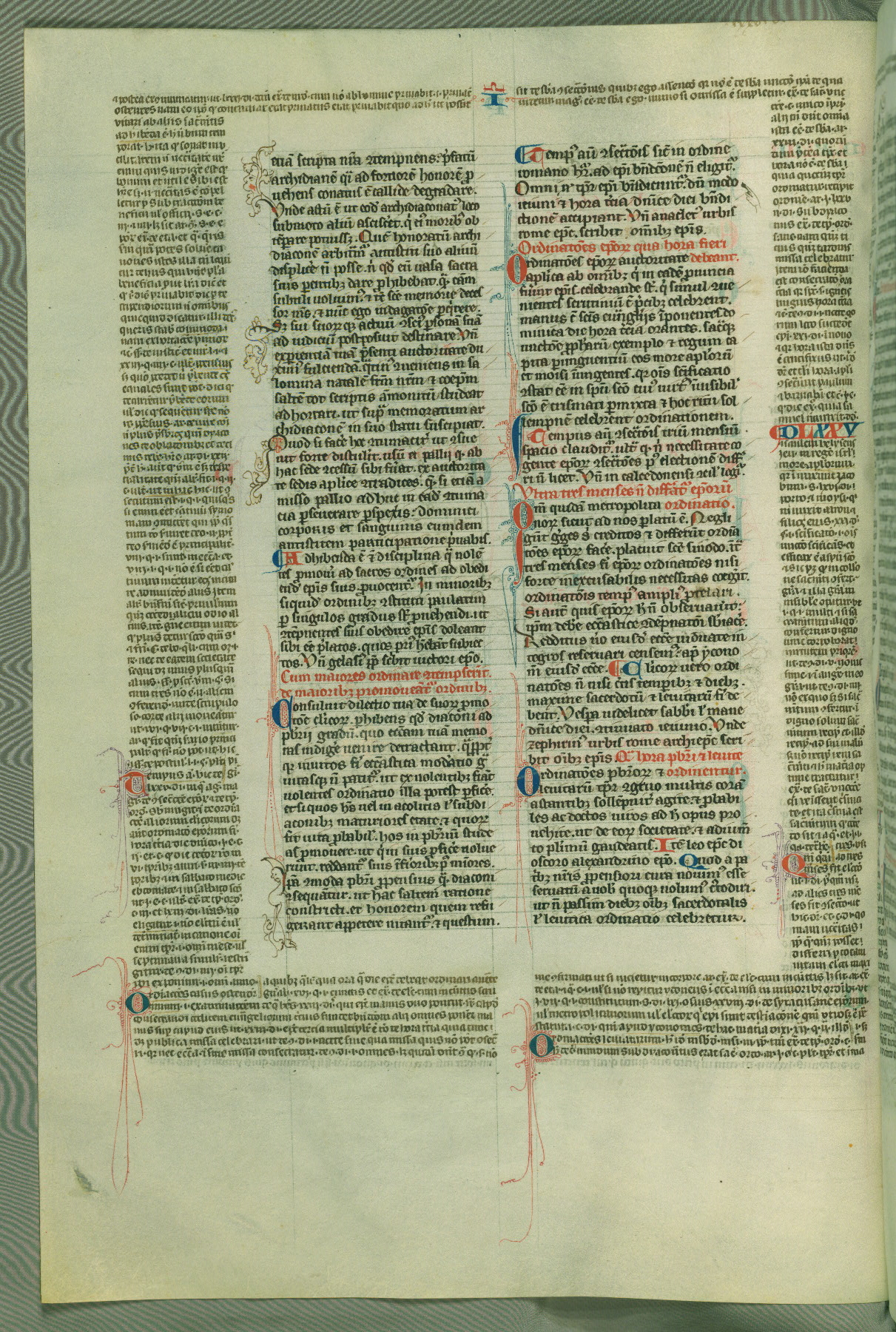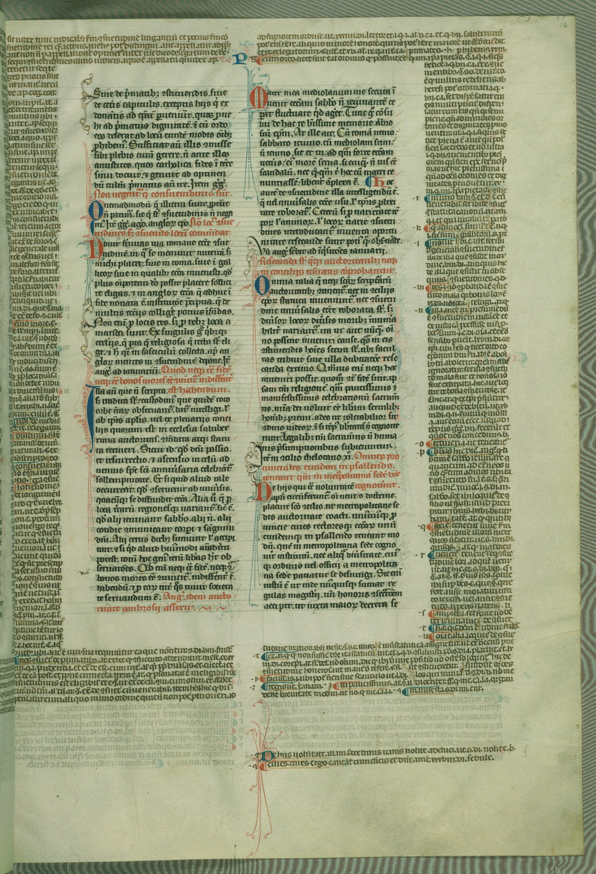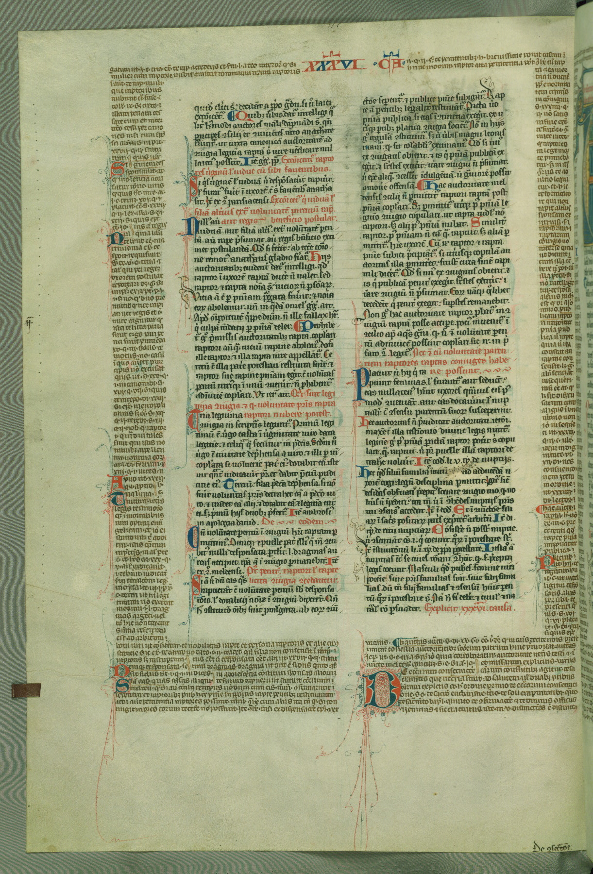 This deluxe version of Gratian's Decretum was created ca. 1280-90, most likely in Hainaut. The lively decoration of the manuscript indicates a marked taste for narrative, and there are thirty-seven historiated initials. The gloss work was completed by Bartholomew of Brescia. At first, Paris would seem to be the most likely place of origin, given that it was the leading center for the study of canon law. However, this particular manuscript exhibits scribal features that suggest its place of origin as being the Cistercian abbey of Cambron in Hainaut. Furthermore, Abbot Baudouin de Bousso, whose tenure at the abbey was from 1283 to 1293, was schooled in theology at the University of Paris, and he would eventually endorse the production of many fine manuscripts while at Cambron. In fact, the catalyst for this endeavor seems to have been the Beaupré Antiphonary (W.759-761), which was was created at Cambron during the 1280s. Stylistic features of W.133 seem to have connections with the Beaupré Antiphonary. For example, Cistercian monks are shown in three extant illuminations throughout three of the antiphonary volumes; these monks are pictured in brown habits similar to the type worn by clerics in W.133. The reliance upon Cistercian precedents for textual and design features associates W.133 with the Cistercian abbey at Cambron. However, more remains to be confirmed by further inspection of the output of the scriptorium at Cambron.