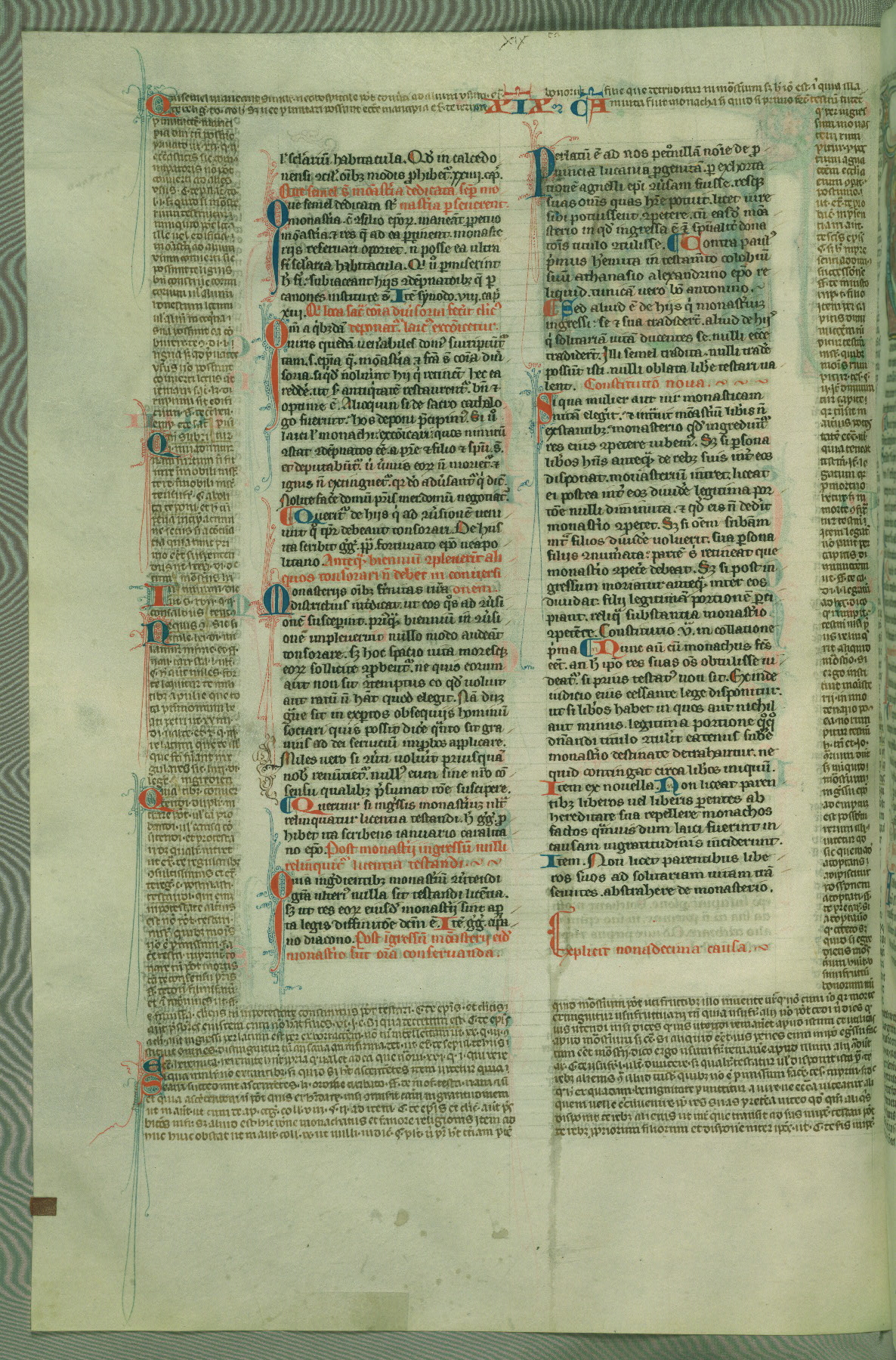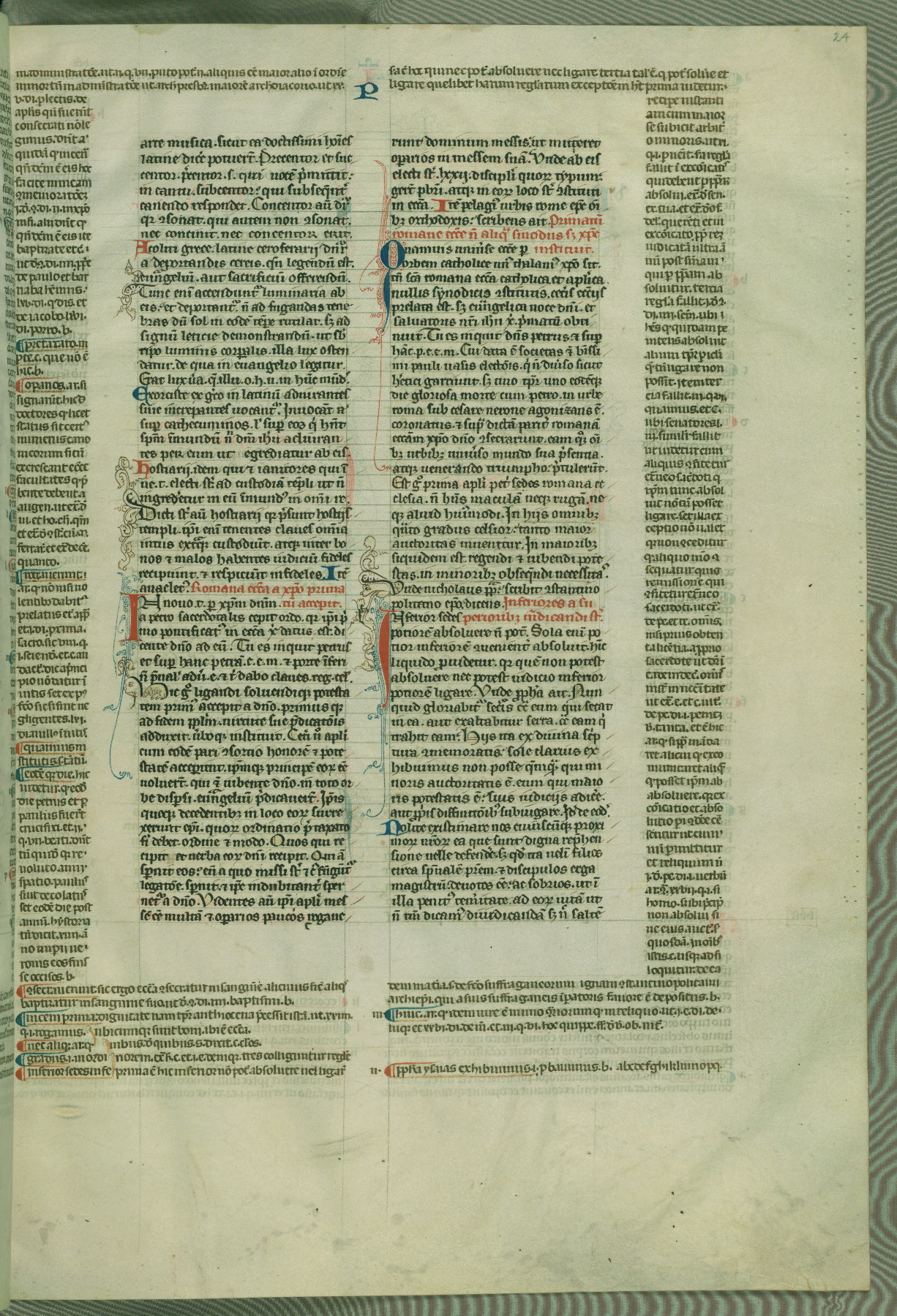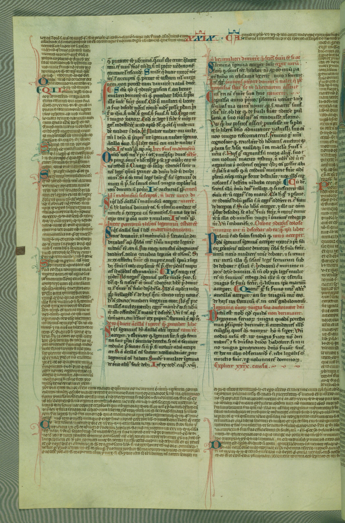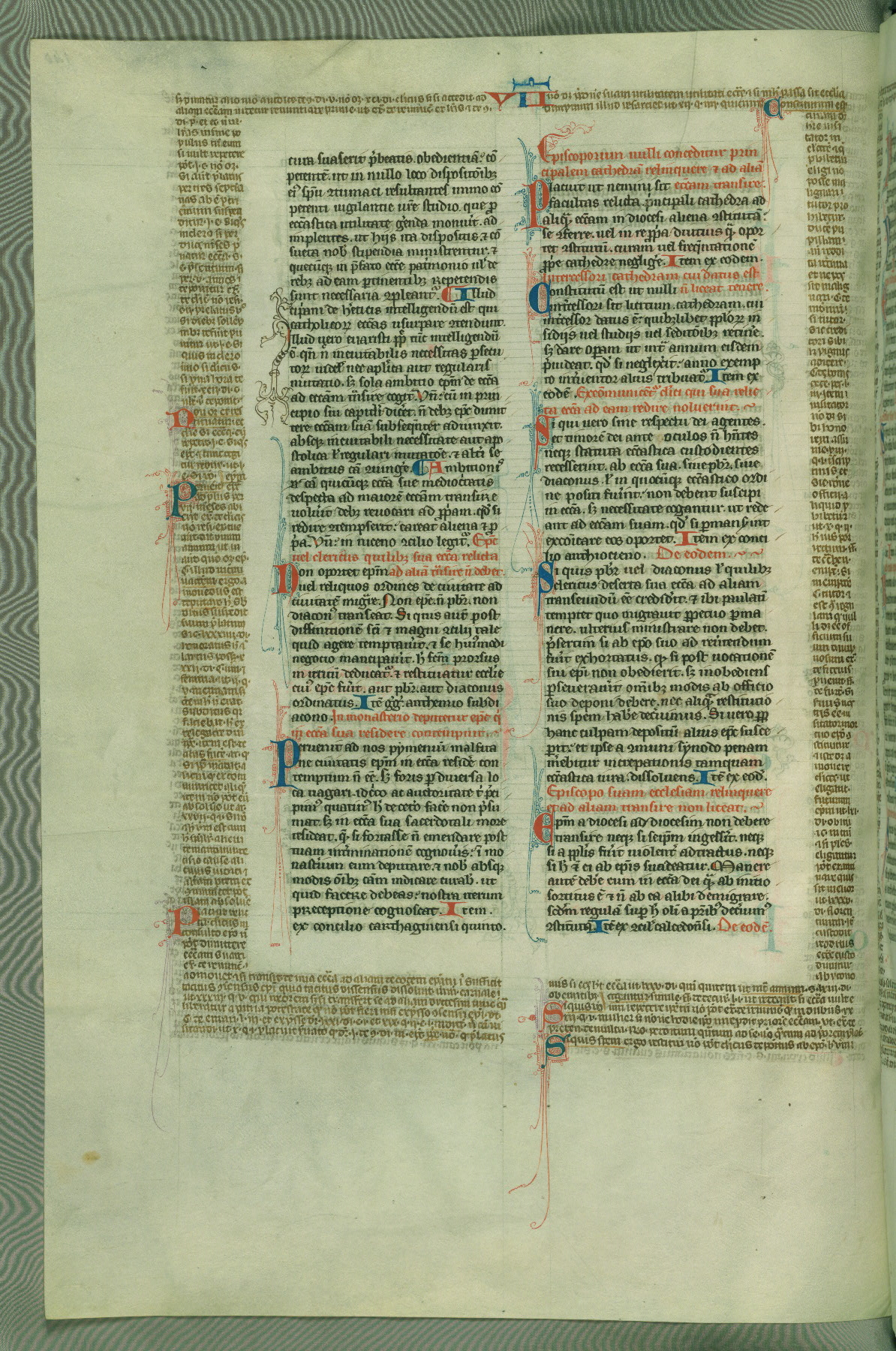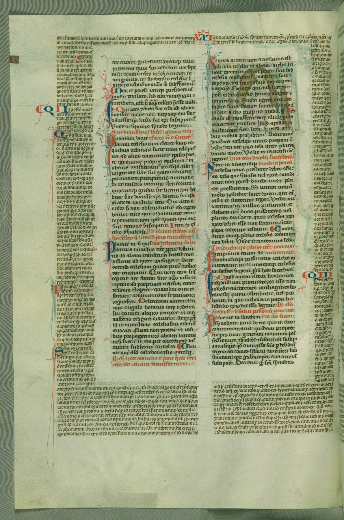 This deluxe version of Gratian's Decretum was created ca. 1280-90, most likely in Hainaut. The lively decoration of the manuscript indicates a marked taste for narrative, and there are thirty-seven historiated initials. The gloss work was completed by Bartholomew of Brescia. At first, Paris would seem to be the most likely place of origin, given that it was the leading center for the study of canon law. However, this particular manuscript exhibits scribal features that suggest its place of origin as being the Cistercian abbey of Cambron in Hainaut. Furthermore, Abbot Baudouin de Bousso, whose tenure at the abbey was from 1283 to 1293, was schooled in theology at the University of Paris, and he would eventually endorse the production of many fine manuscripts while at Cambron. In fact, the catalyst for this endeavor seems to have been the Beaupré Antiphonary (W.759-761), which was was created at Cambron during the 1280s. Stylistic features of W.133 seem to have connections with the Beaupré Antiphonary. For example, Cistercian monks are shown in three extant illuminations throughout three of the antiphonary volumes; these monks are pictured in brown habits similar to the type worn by clerics in W.133. The reliance upon Cistercian precedents for textual and design features associates W.133 with the Cistercian abbey at Cambron. However, more remains to be confirmed by further inspection of the output of the scriptorium at Cambron.
