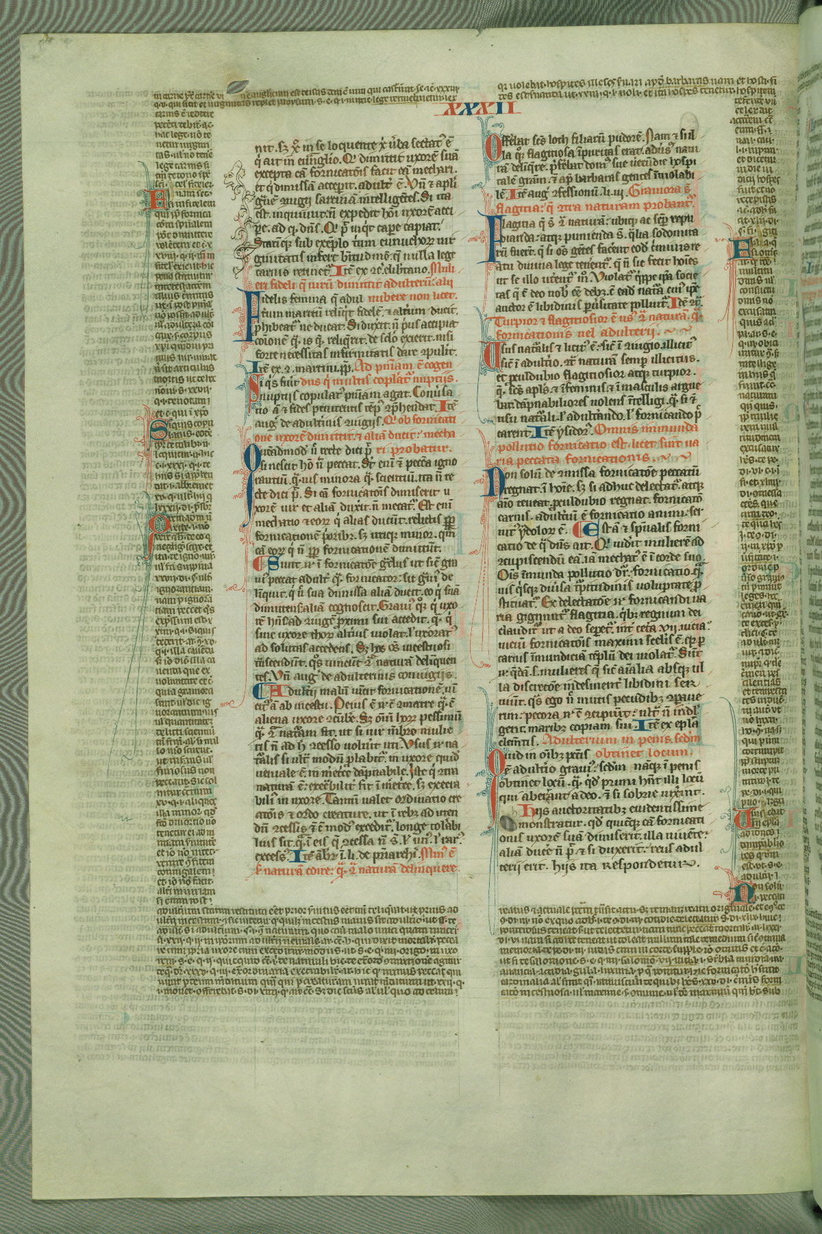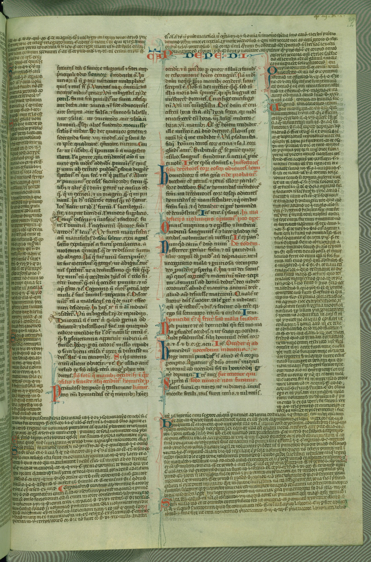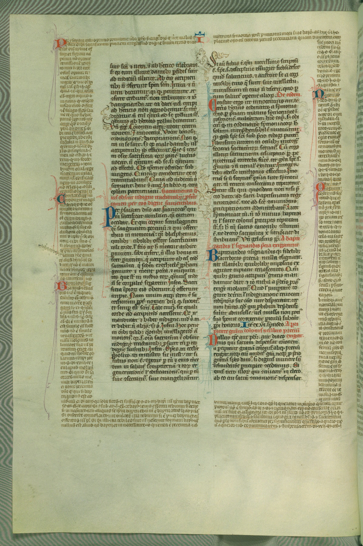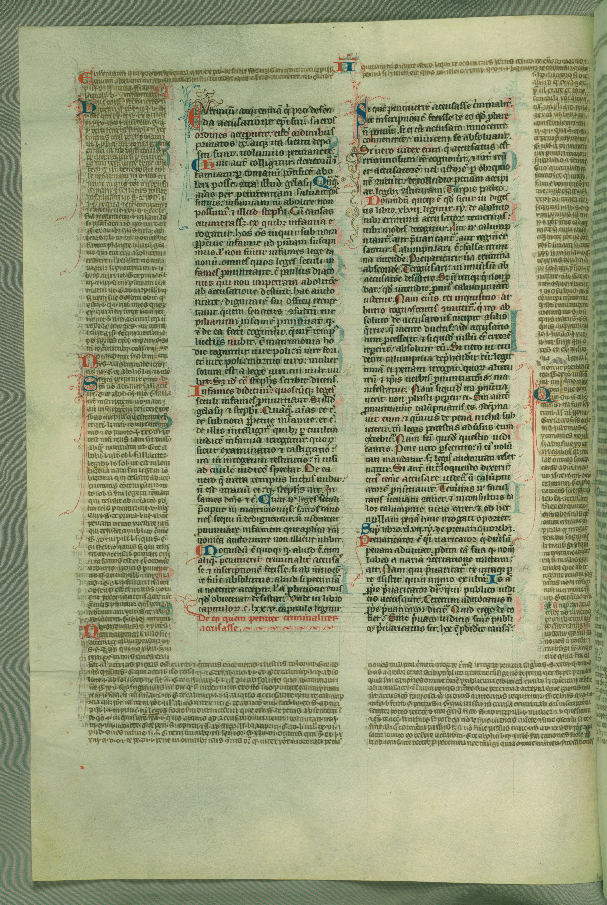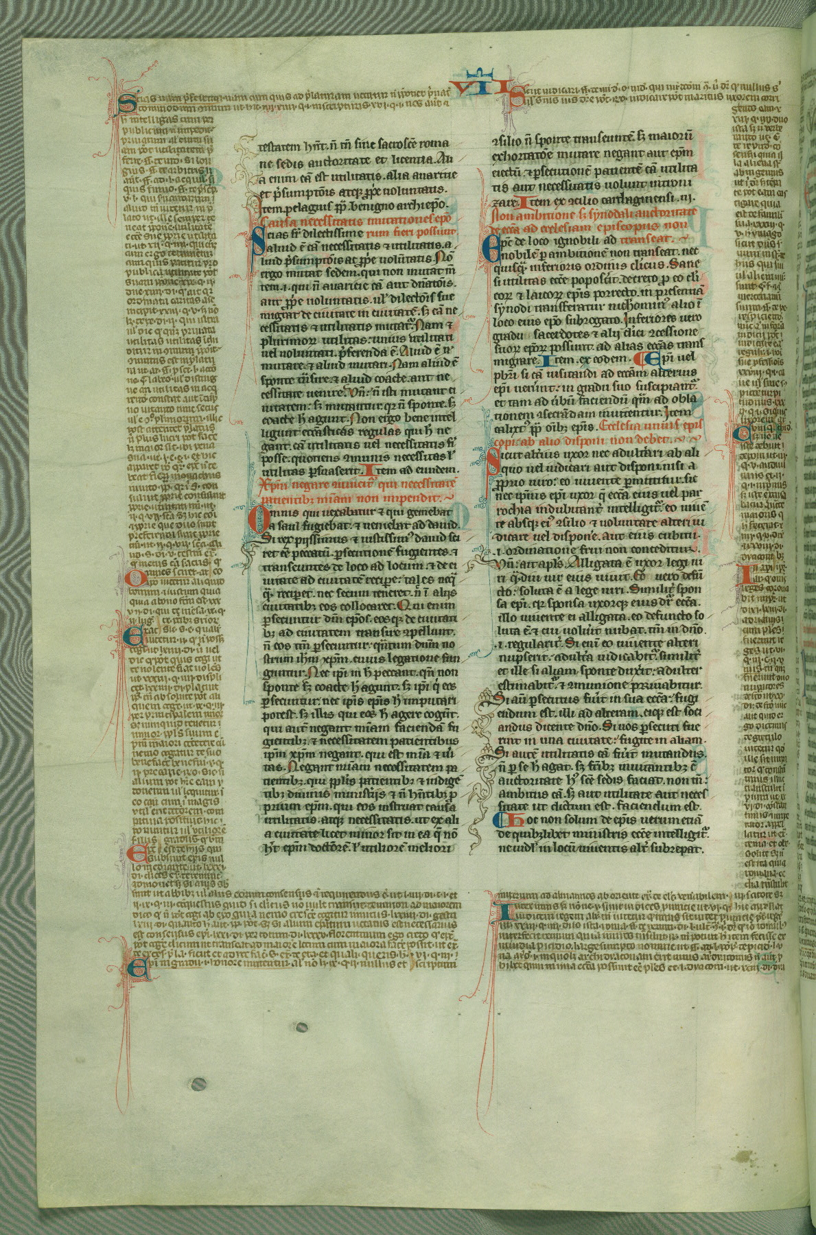 This deluxe version of Gratian's Decretum was created ca. 1280-90, most likely in Hainaut. The lively decoration of the manuscript indicates a marked taste for narrative, and there are thirty-seven historiated initials. The gloss work was completed by Bartholomew of Brescia. At first, Paris would seem to be the most likely place of origin, given that it was the leading center for the study of canon law. However, this particular manuscript exhibits scribal features that suggest its place of origin as being the Cistercian abbey of Cambron in Hainaut. Furthermore, Abbot Baudouin de Bousso, whose tenure at the abbey was from 1283 to 1293, was schooled in theology at the University of Paris, and he would eventually endorse the production of many fine manuscripts while at Cambron. In fact, the catalyst for this endeavor seems to have been the Beaupré Antiphonary (W.759-761), which was was created at Cambron during the 1280s. Stylistic features of W.133 seem to have connections with the Beaupré Antiphonary. For example, Cistercian monks are shown in three extant illuminations throughout three of the antiphonary volumes; these monks are pictured in brown habits similar to the type worn by clerics in W.133. The reliance upon Cistercian precedents for textual and design features associates W.133 with the Cistercian abbey at Cambron. However, more remains to be confirmed by further inspection of the output of the scriptorium at Cambron.