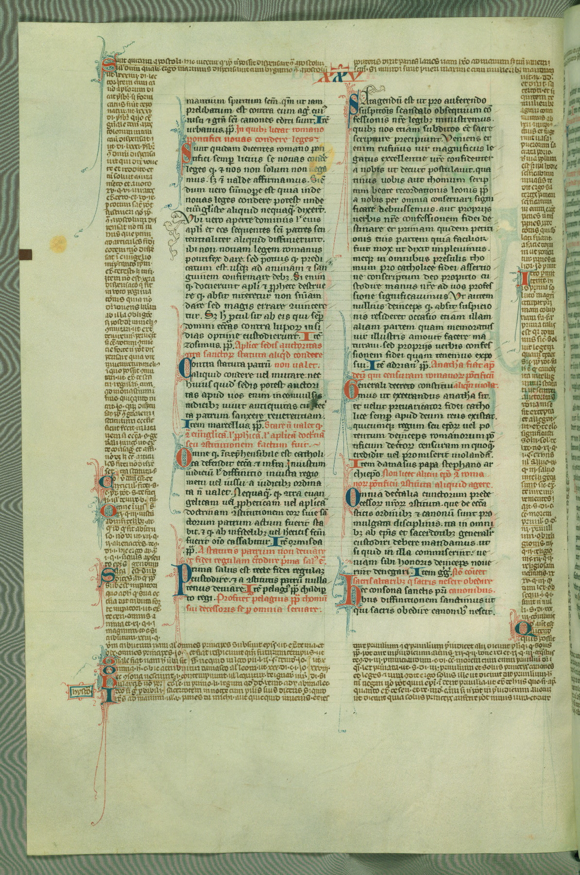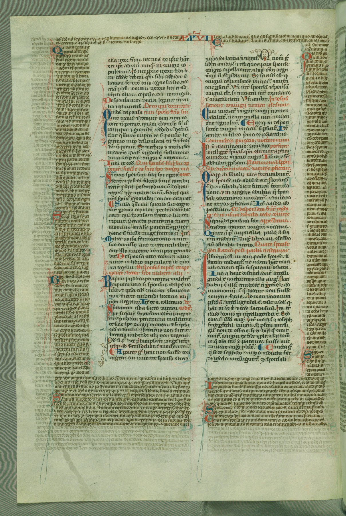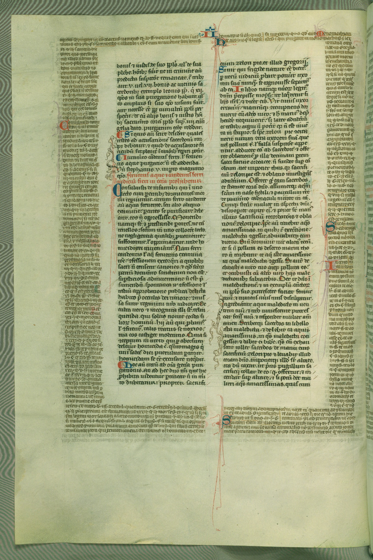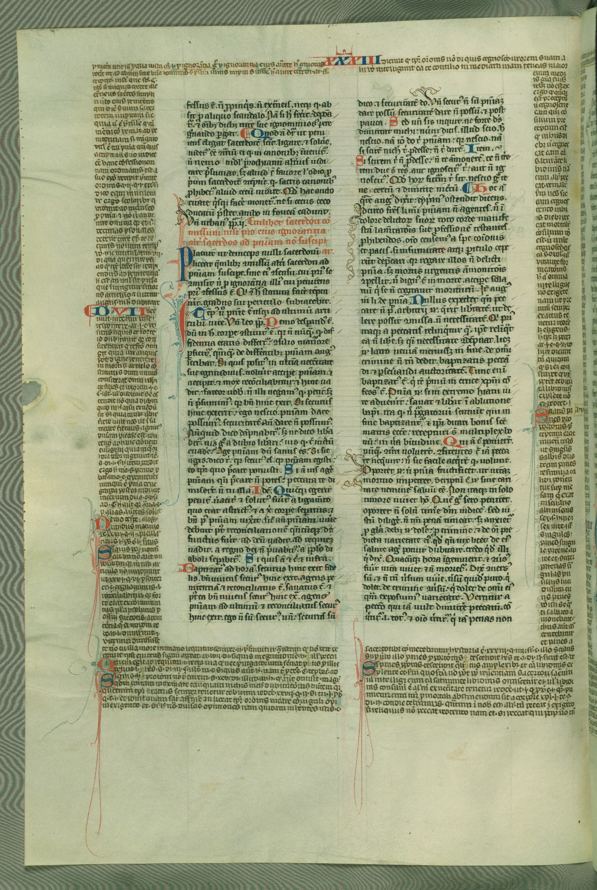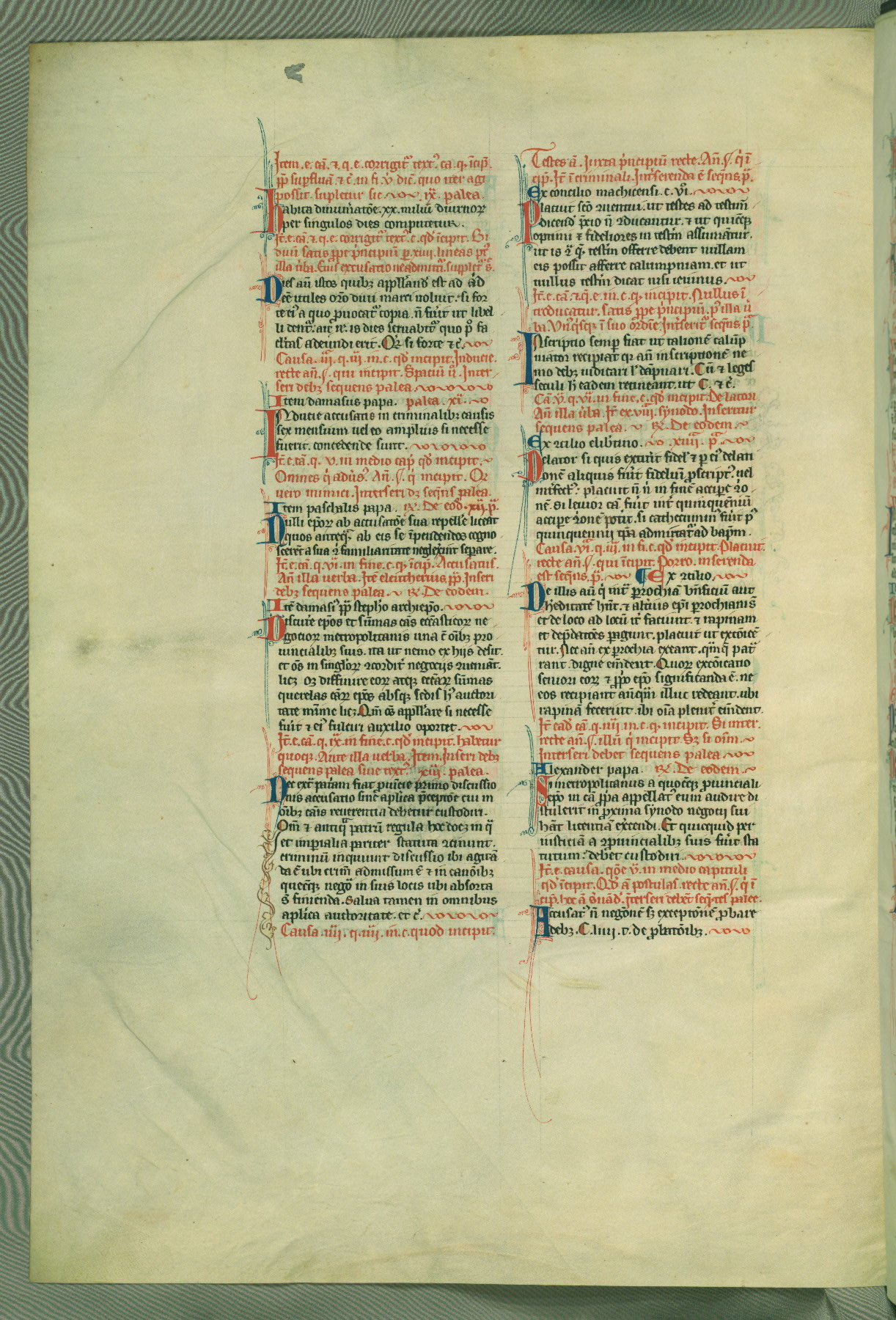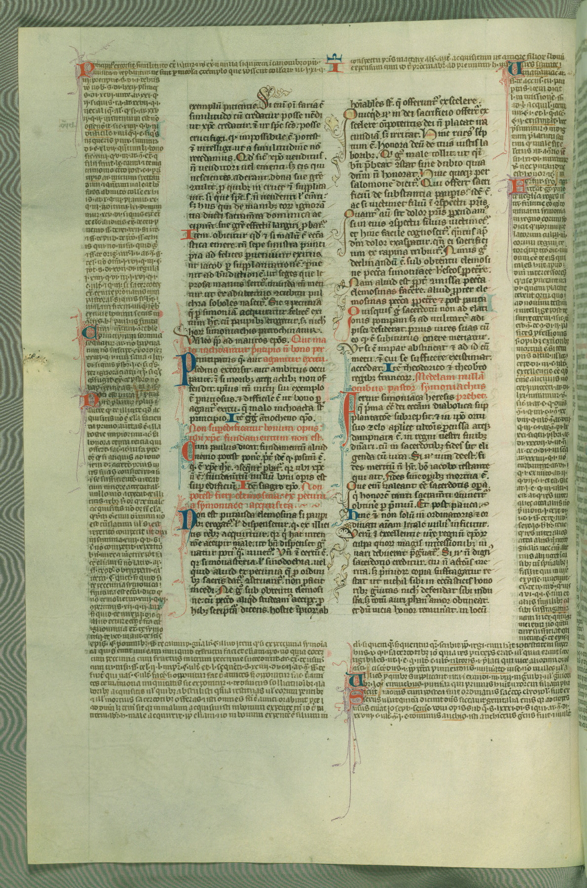 This deluxe version of Gratian's Decretum was created ca. 1280-90, most likely in Hainaut. The lively decoration of the manuscript indicates a marked taste for narrative, and there are thirty-seven historiated initials. The gloss work was completed by Bartholomew of Brescia. At first, Paris would seem to be the most likely place of origin, given that it was the leading center for the study of canon law. However, this particular manuscript exhibits scribal features that suggest its place of origin as being the Cistercian abbey of Cambron in Hainaut. Furthermore, Abbot Baudouin de Bousso, whose tenure at the abbey was from 1283 to 1293, was schooled in theology at the University of Paris, and he would eventually endorse the production of many fine manuscripts while at Cambron. In fact, the catalyst for this endeavor seems to have been the Beaupré Antiphonary (W.759-761), which was was created at Cambron during the 1280s. Stylistic features of W.133 seem to have connections with the Beaupré Antiphonary. For example, Cistercian monks are shown in three extant illuminations throughout three of the antiphonary volumes; these monks are pictured in brown habits similar to the type worn by clerics in W.133. The reliance upon Cistercian precedents for textual and design features associates W.133 with the Cistercian abbey at Cambron. However, more remains to be confirmed by further inspection of the output of the scriptorium at Cambron.