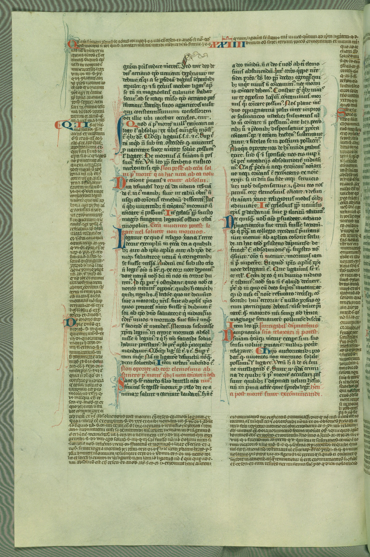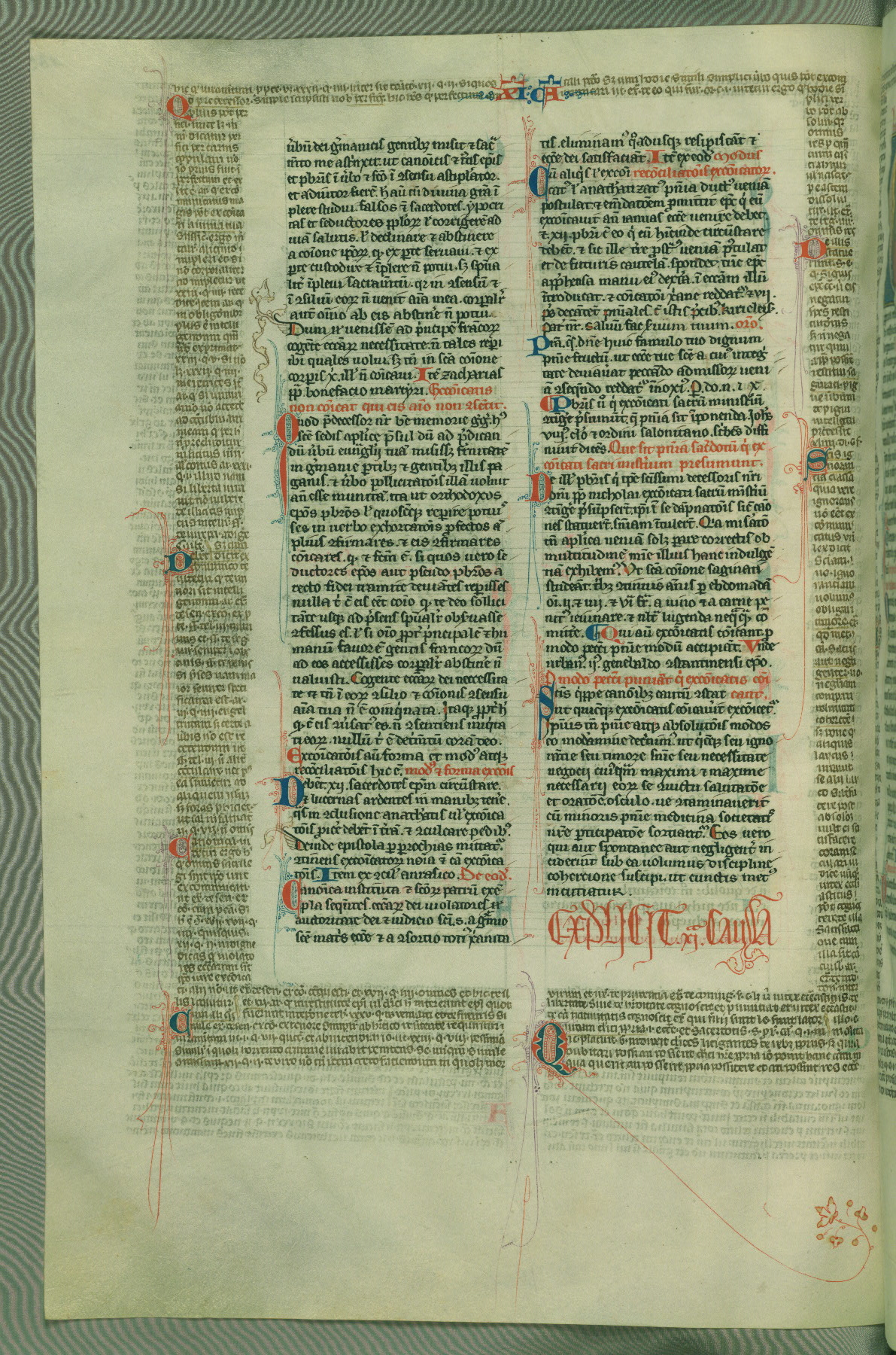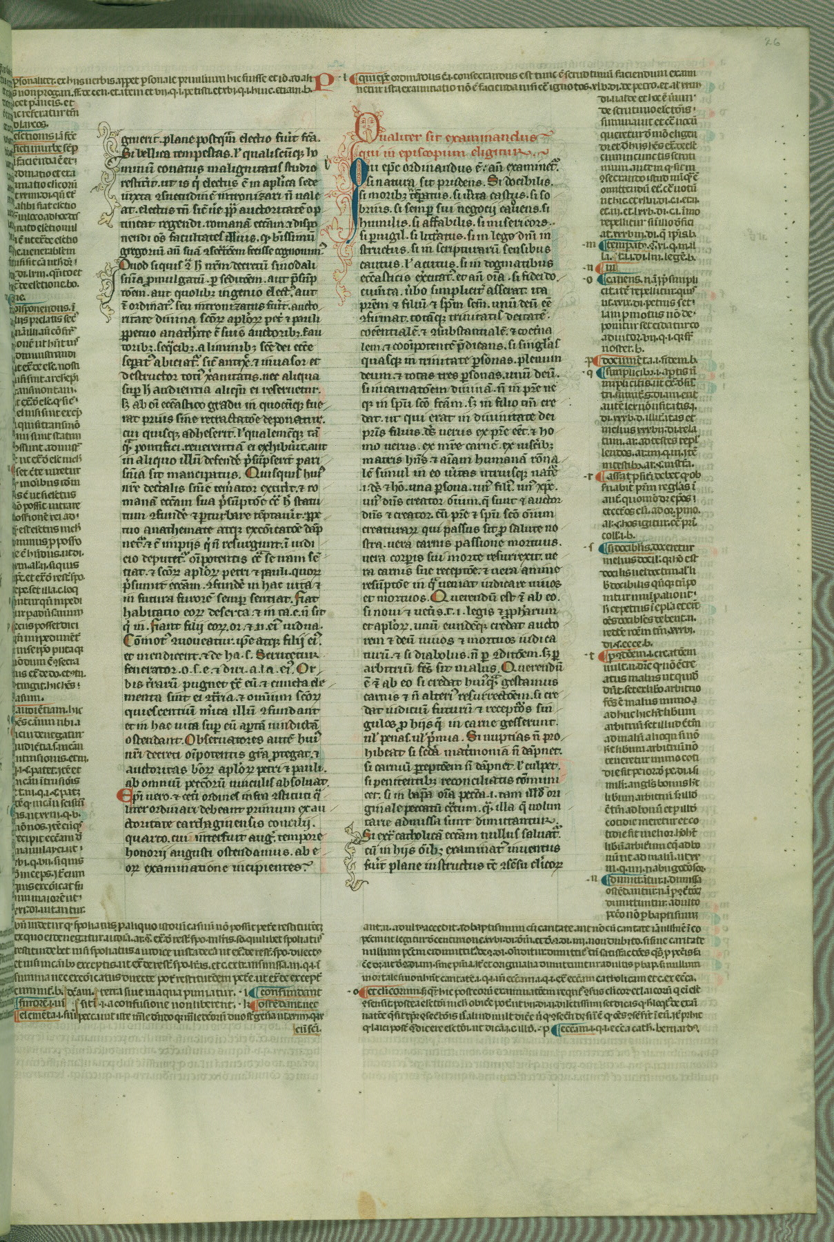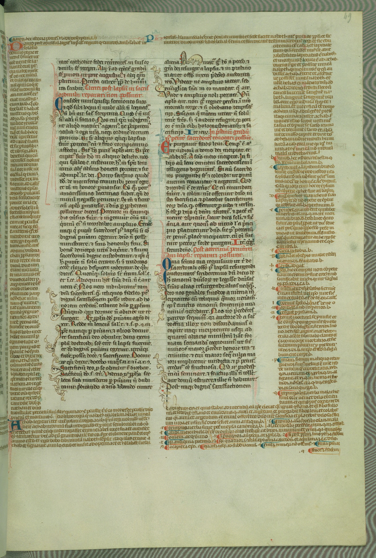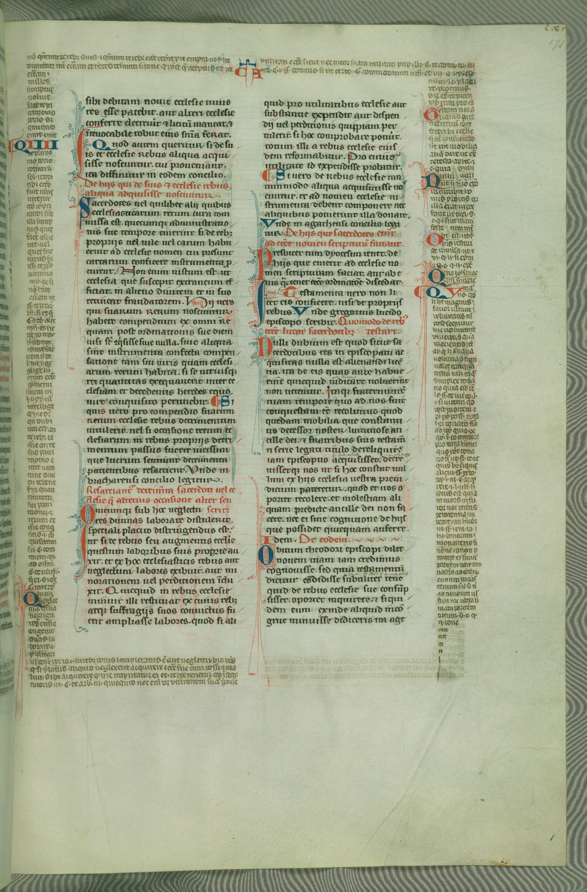 This deluxe version of Gratian's Decretum was created ca. 1280-90, most likely in Hainaut. The lively decoration of the manuscript indicates a marked taste for narrative, and there are thirty-seven historiated initials. The gloss work was completed by Bartholomew of Brescia. At first, Paris would seem to be the most likely place of origin, given that it was the leading center for the study of canon law. However, this particular manuscript exhibits scribal features that suggest its place of origin as being the Cistercian abbey of Cambron in Hainaut. Furthermore, Abbot Baudouin de Bousso, whose tenure at the abbey was from 1283 to 1293, was schooled in theology at the University of Paris, and he would eventually endorse the production of many fine manuscripts while at Cambron. In fact, the catalyst for this endeavor seems to have been the Beaupré Antiphonary (W.759-761), which was was created at Cambron during the 1280s. Stylistic features of W.133 seem to have connections with the Beaupré Antiphonary. For example, Cistercian monks are shown in three extant illuminations throughout three of the antiphonary volumes; these monks are pictured in brown habits similar to the type worn by clerics in W.133. The reliance upon Cistercian precedents for textual and design features associates W.133 with the Cistercian abbey at Cambron. However, more remains to be confirmed by further inspection of the output of the scriptorium at Cambron.