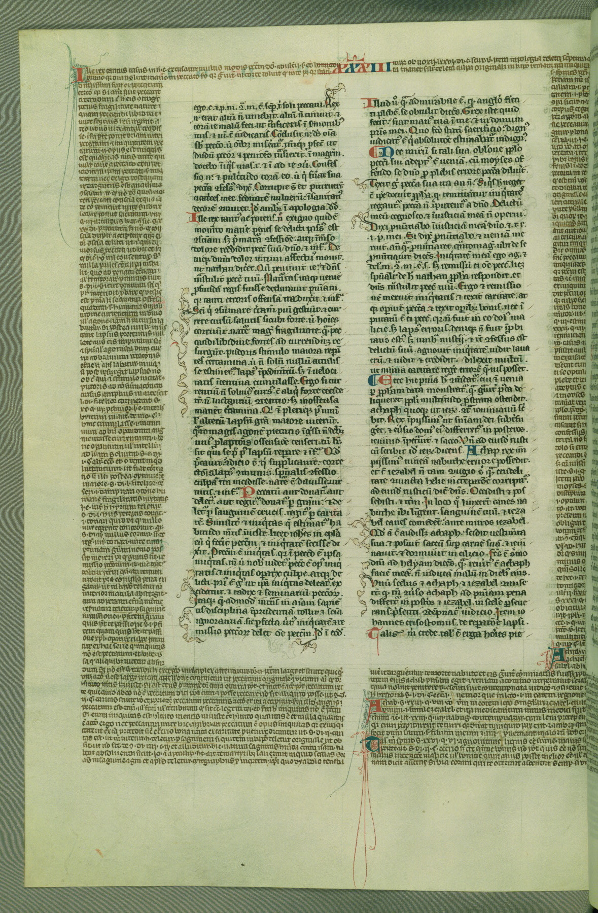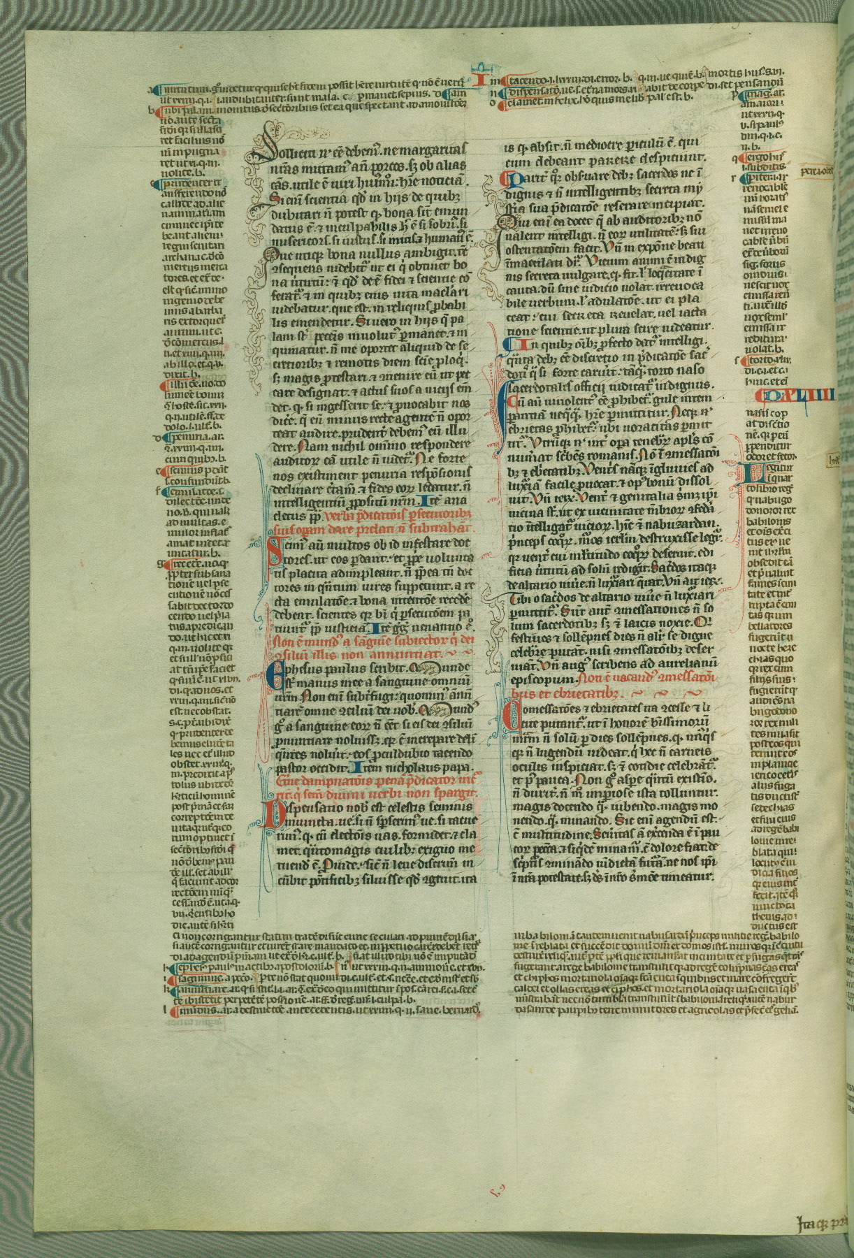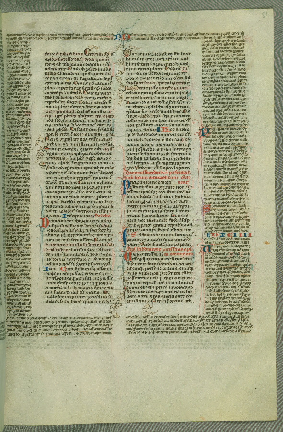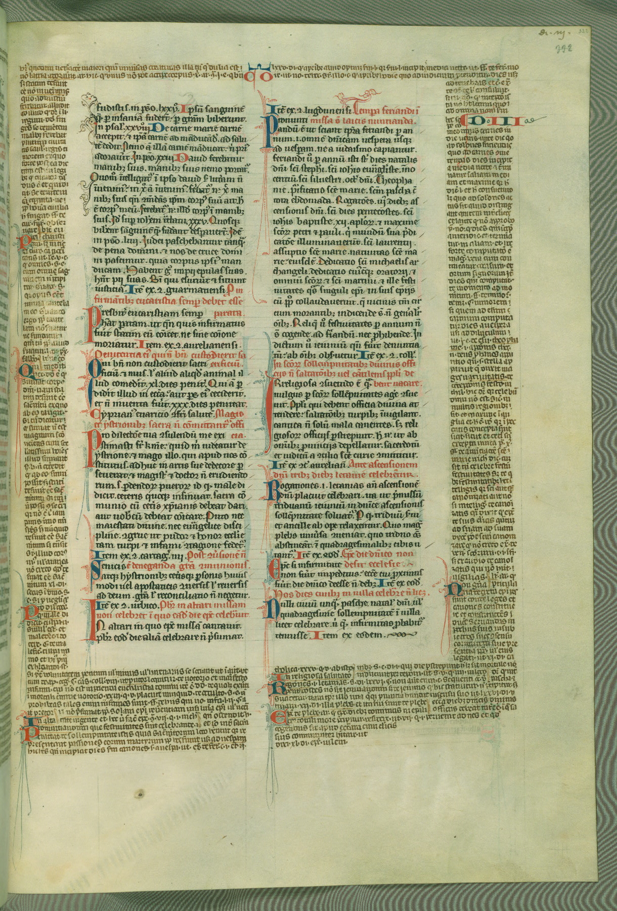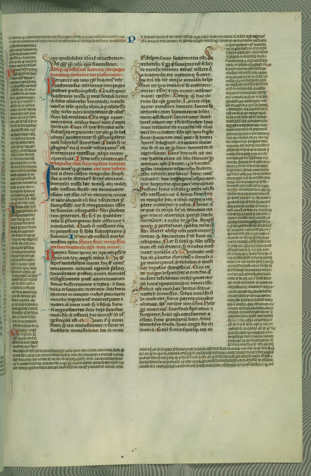 This deluxe version of Gratian's Decretum was created ca. 1280-90, most likely in Hainaut. The lively decoration of the manuscript indicates a marked taste for narrative, and there are thirty-seven historiated initials. The gloss work was completed by Bartholomew of Brescia. At first, Paris would seem to be the most likely place of origin, given that it was the leading center for the study of canon law. However, this particular manuscript exhibits scribal features that suggest its place of origin as being the Cistercian abbey of Cambron in Hainaut. Furthermore, Abbot Baudouin de Bousso, whose tenure at the abbey was from 1283 to 1293, was schooled in theology at the University of Paris, and he would eventually endorse the production of many fine manuscripts while at Cambron. In fact, the catalyst for this endeavor seems to have been the Beaupré Antiphonary (W.759-761), which was was created at Cambron during the 1280s. Stylistic features of W.133 seem to have connections with the Beaupré Antiphonary. For example, Cistercian monks are shown in three extant illuminations throughout three of the antiphonary volumes; these monks are pictured in brown habits similar to the type worn by clerics in W.133. The reliance upon Cistercian precedents for textual and design features associates W.133 with the Cistercian abbey at Cambron. However, more remains to be confirmed by further inspection of the output of the scriptorium at Cambron.