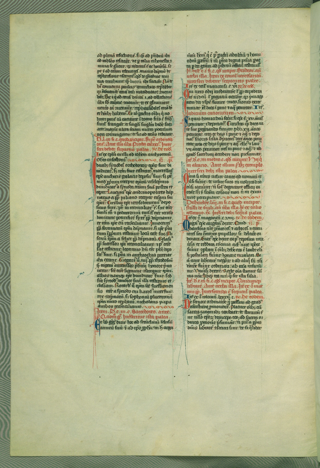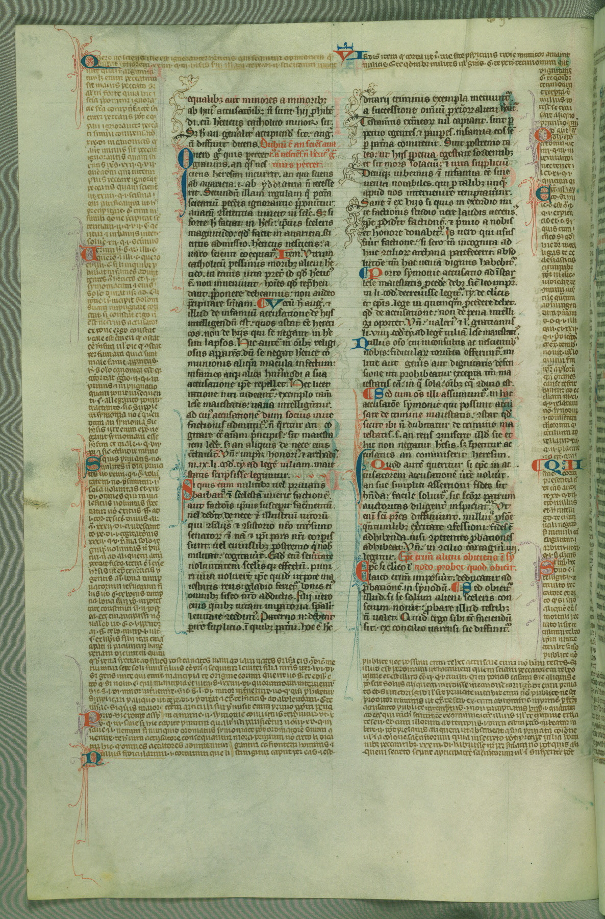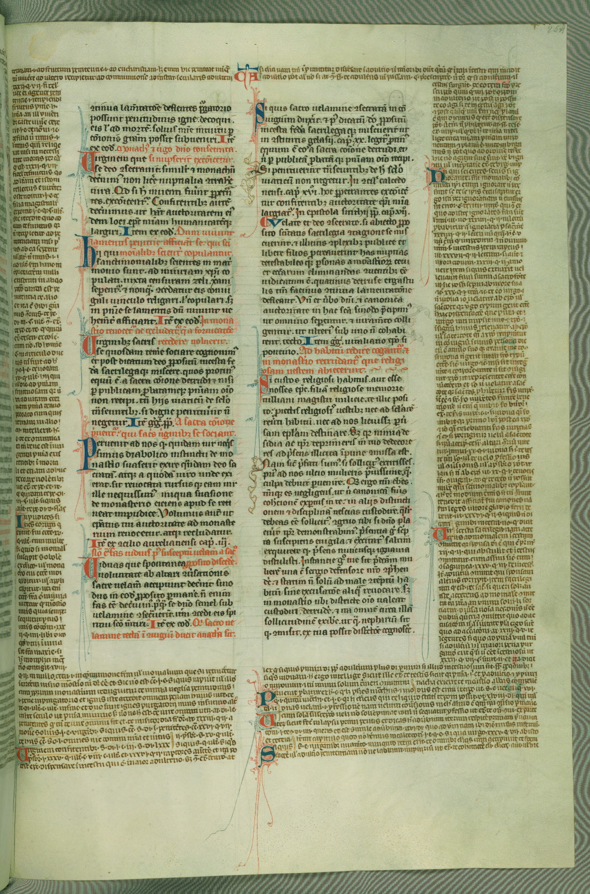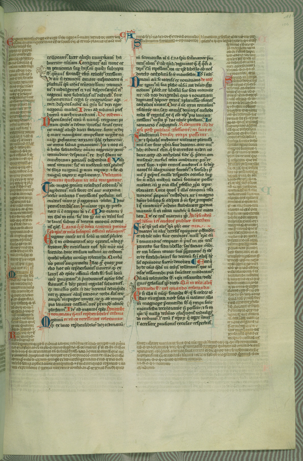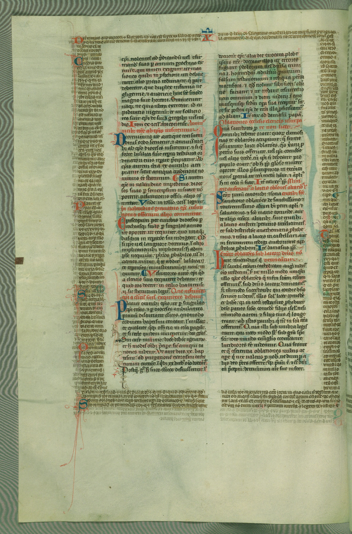 This deluxe version of Gratian's Decretum was created ca. 1280-90, most likely in Hainaut. The lively decoration of the manuscript indicates a marked taste for narrative, and there are thirty-seven historiated initials. The gloss work was completed by Bartholomew of Brescia. At first, Paris would seem to be the most likely place of origin, given that it was the leading center for the study of canon law. However, this particular manuscript exhibits scribal features that suggest its place of origin as being the Cistercian abbey of Cambron in Hainaut. Furthermore, Abbot Baudouin de Bousso, whose tenure at the abbey was from 1283 to 1293, was schooled in theology at the University of Paris, and he would eventually endorse the production of many fine manuscripts while at Cambron. In fact, the catalyst for this endeavor seems to have been the Beaupré Antiphonary (W.759-761), which was was created at Cambron during the 1280s. Stylistic features of W.133 seem to have connections with the Beaupré Antiphonary. For example, Cistercian monks are shown in three extant illuminations throughout three of the antiphonary volumes; these monks are pictured in brown habits similar to the type worn by clerics in W.133. The reliance upon Cistercian precedents for textual and design features associates W.133 with the Cistercian abbey at Cambron. However, more remains to be confirmed by further inspection of the output of the scriptorium at Cambron.
